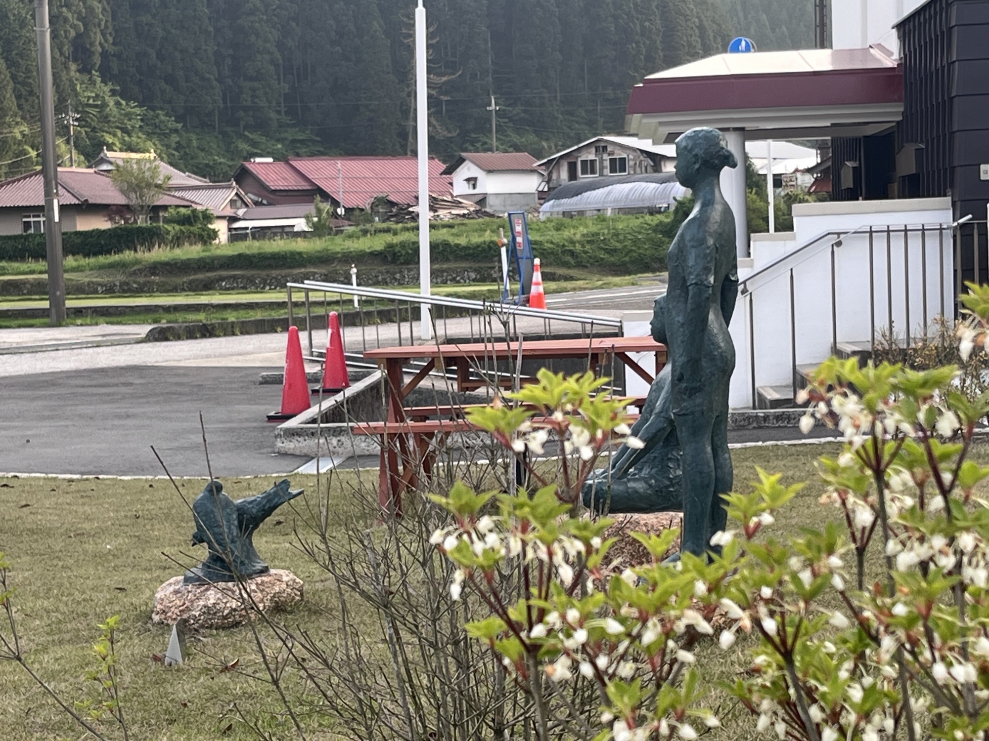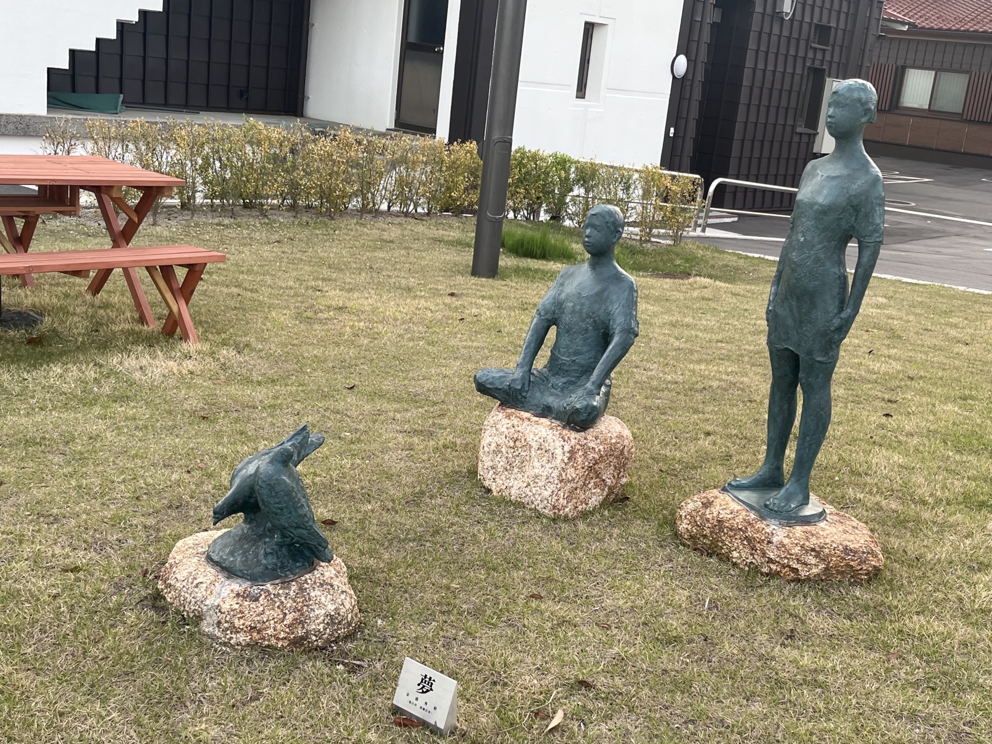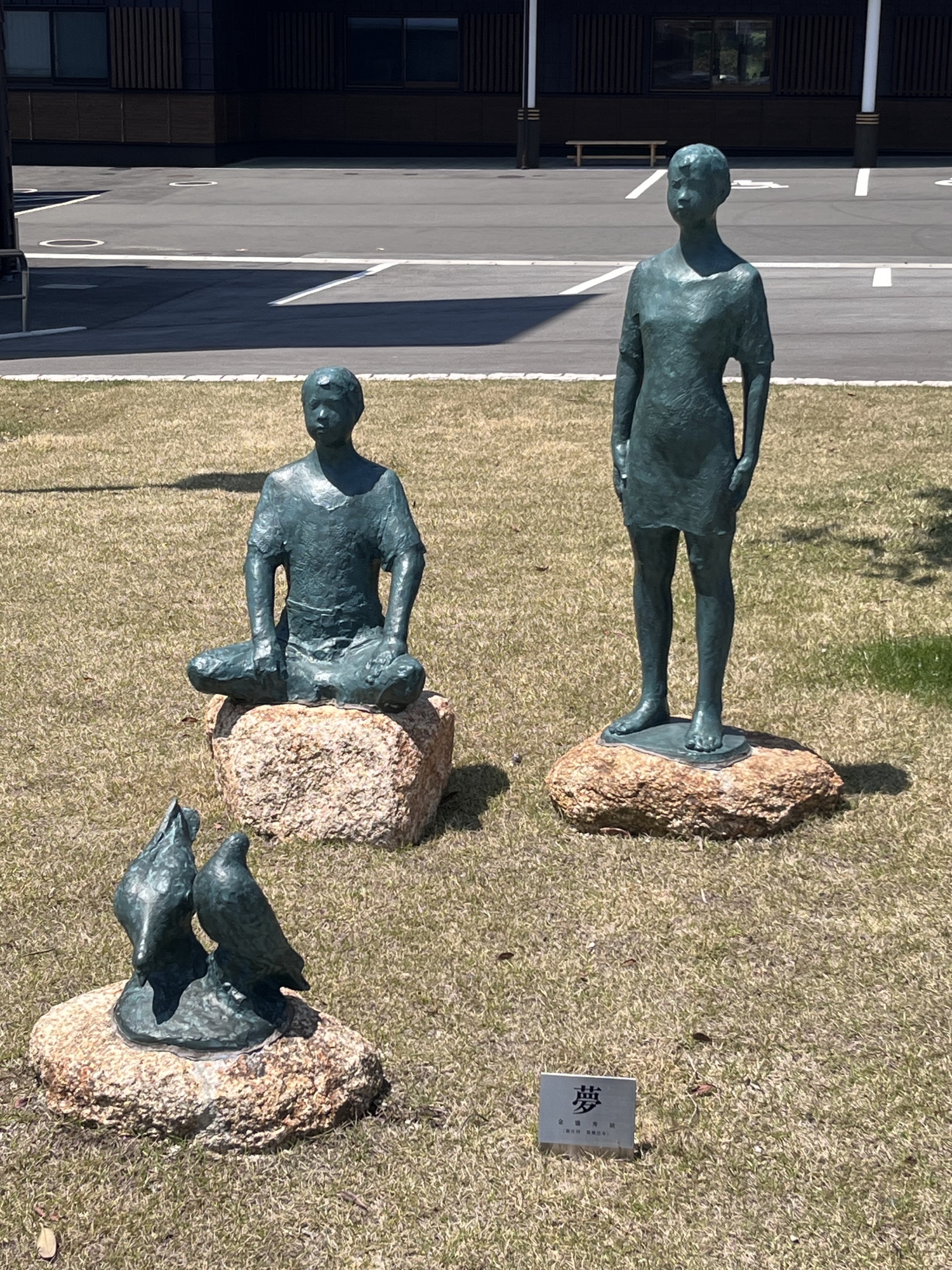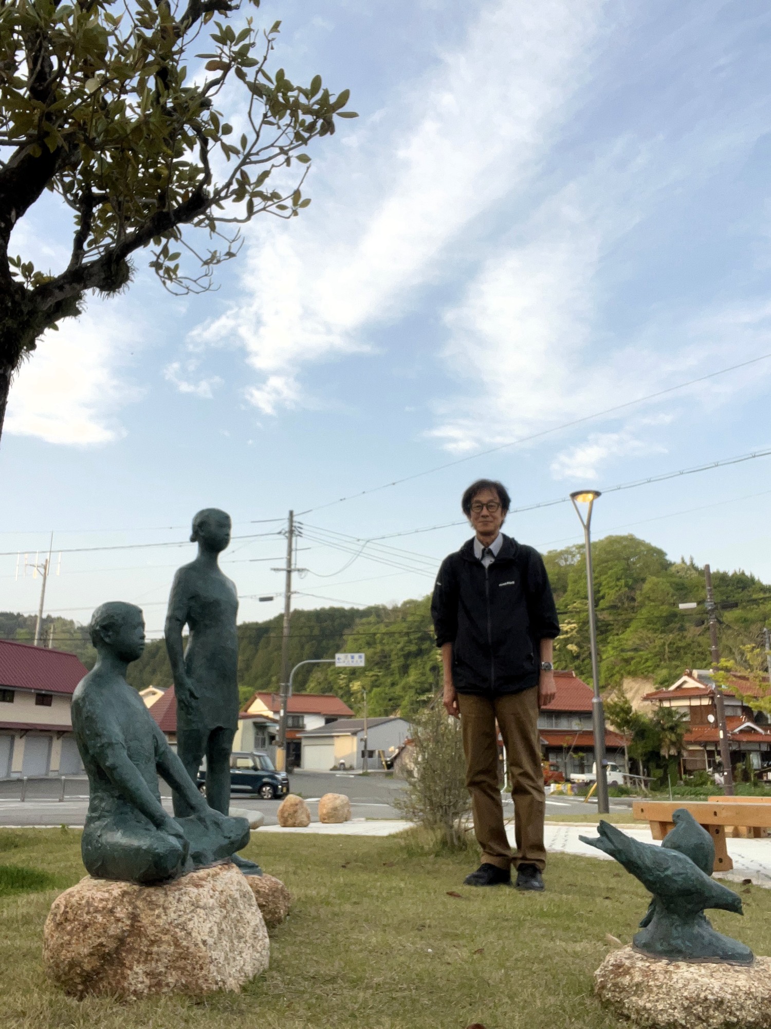 さて、役場前の金盛秀偵先生の彫刻~明日、鴨方のギャラリーに行く予定.