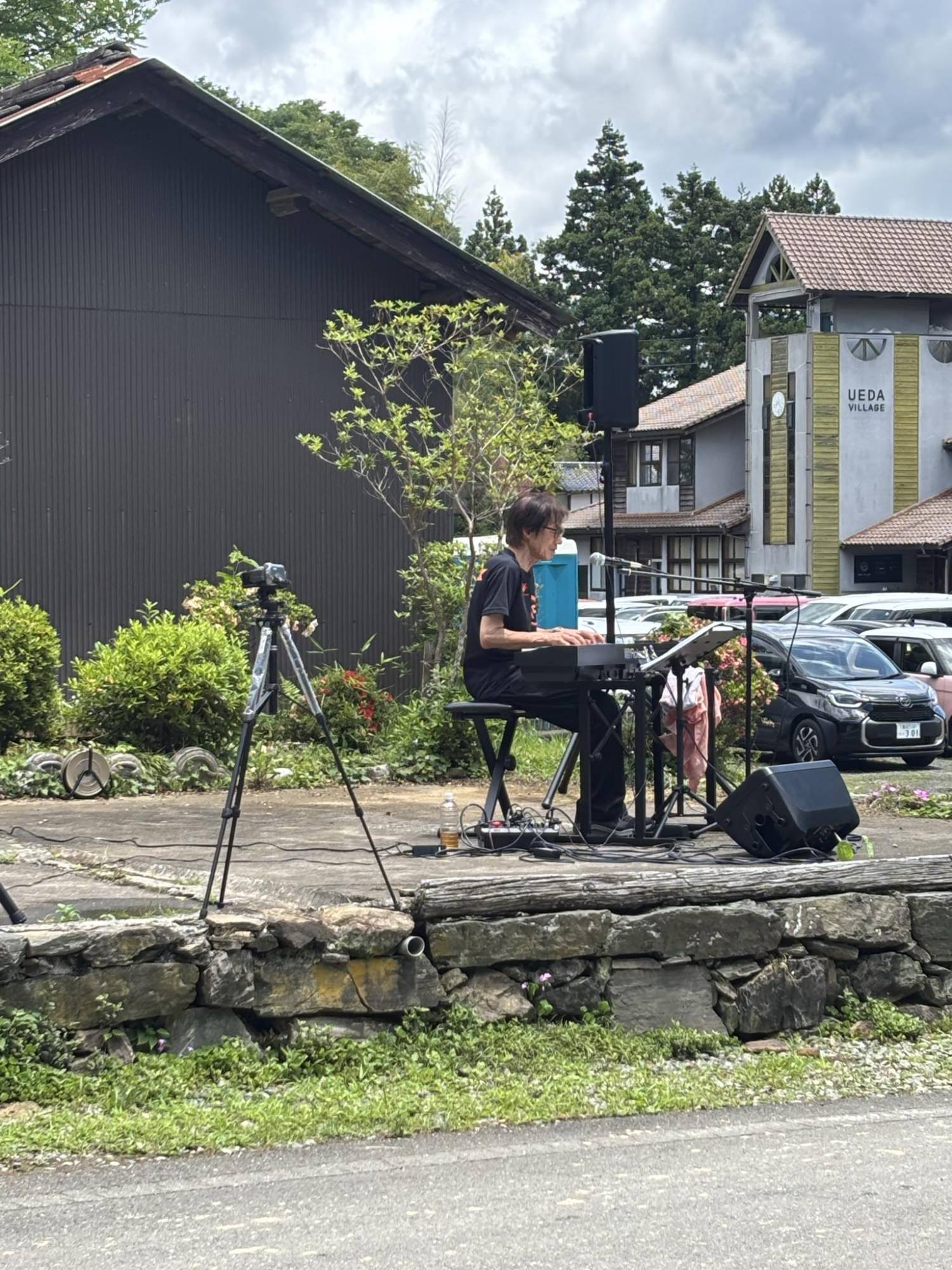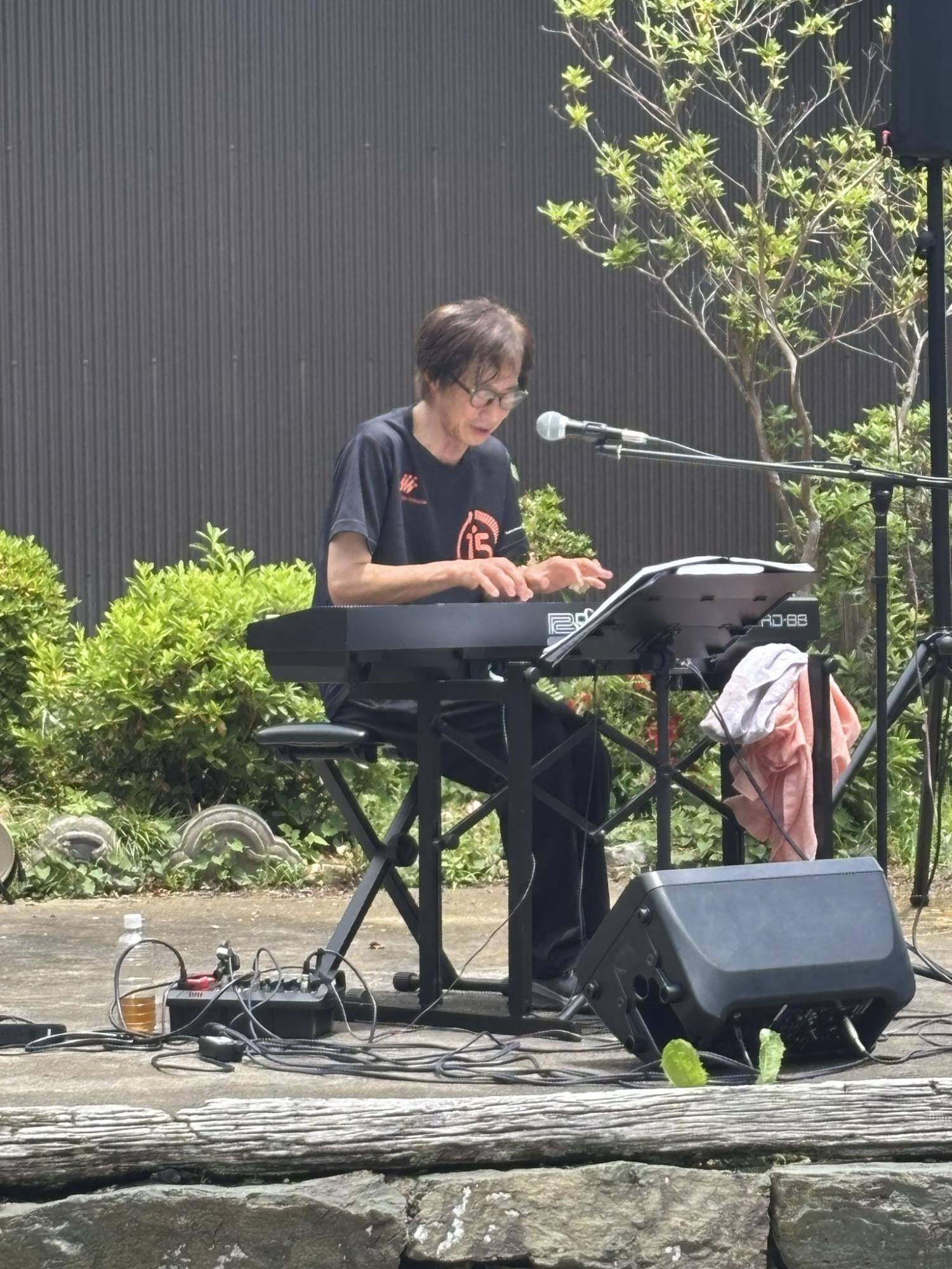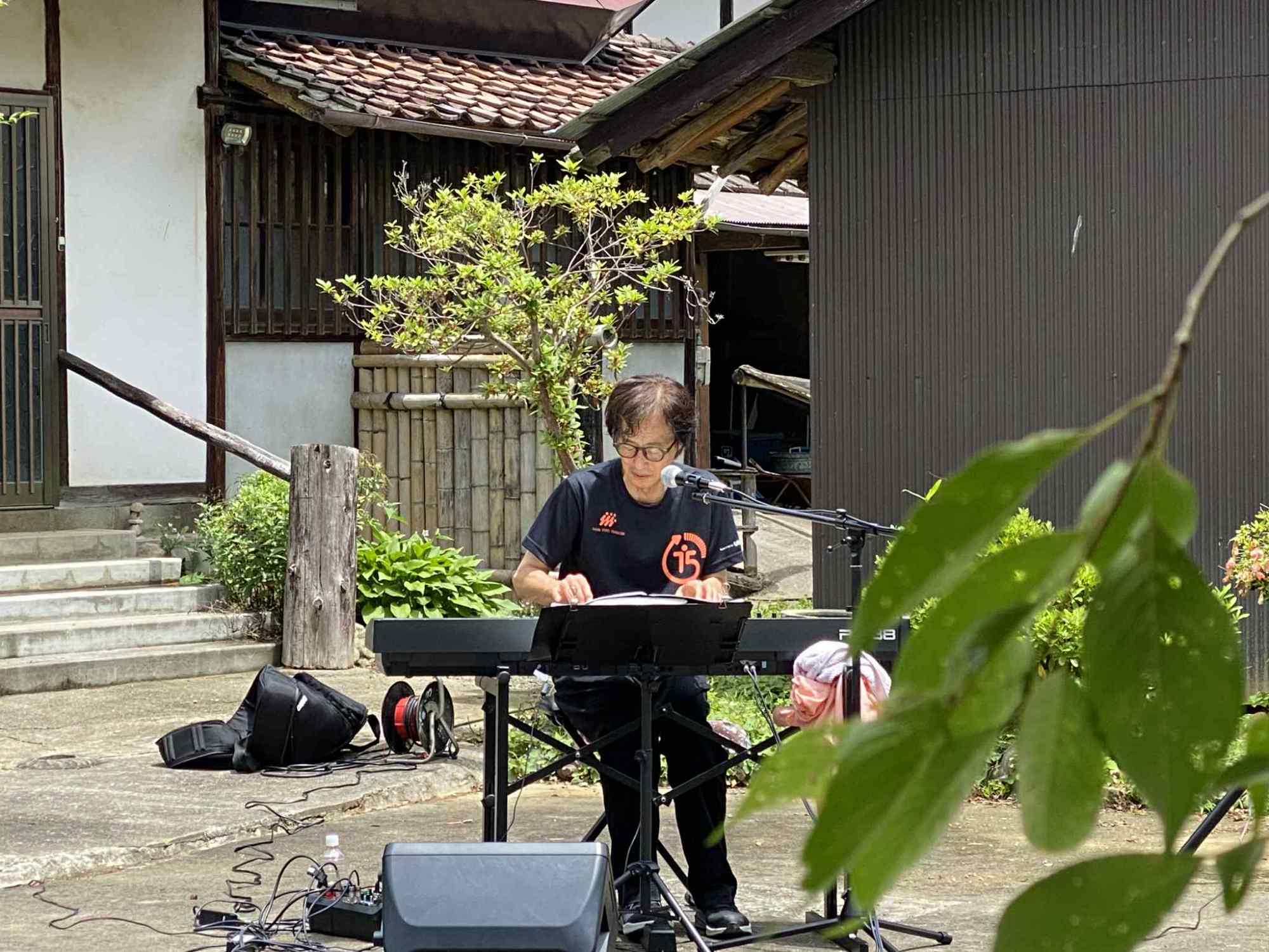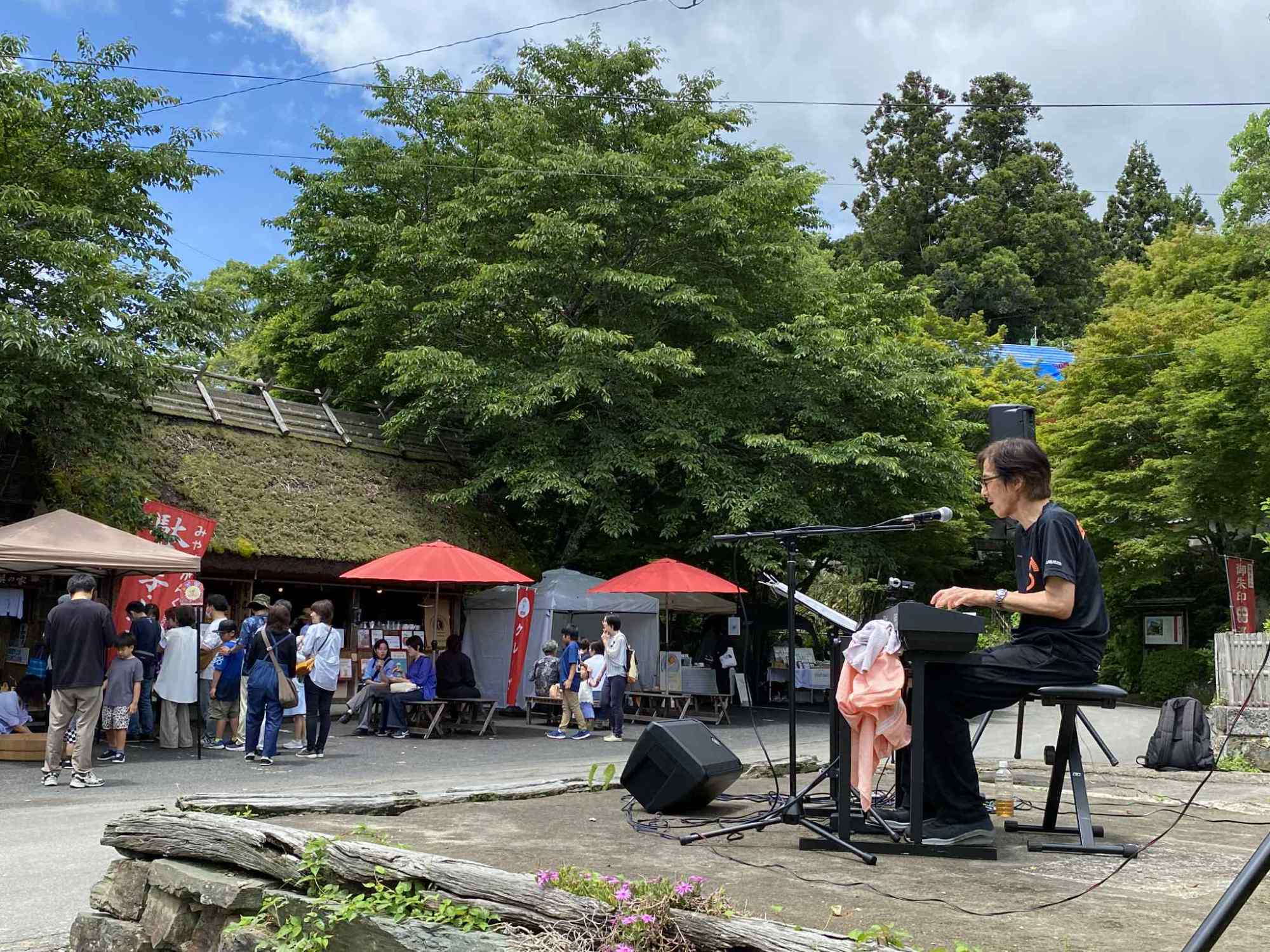 当初は、30-40分くらいかなって思っていましたら、結局、企画のお寺さんからも、自由にやって下さいと.さらに、お寺でのアクティビティー(レンタル浴衣や、御朱印(←もちろん手書き)受け渡しや、その他諸々、加えて、ステージの向かいのお茶屋さんなどなどでも、待っていらっしゃる間に、音楽が聴こえているのが良いですって云って下さいましたので、まずは、1時間、務めました.でも、昼休みに、企画のHさんから、午後もお願いします的に云って頂いて、嬉しくなって、午後も1時間、務めました.ご当地ということで「山寺の和尚さん」は午前も午後も歌いました.午前は「あじさい祭り」として雨や六月といったテーマに沿って選曲しましたが、午後はオリジナル中心になりました.