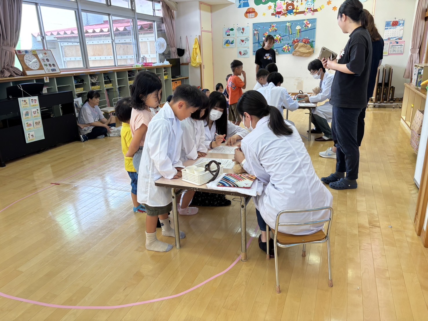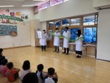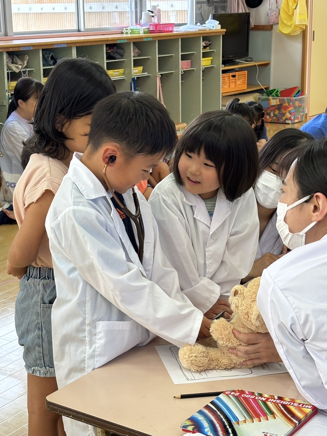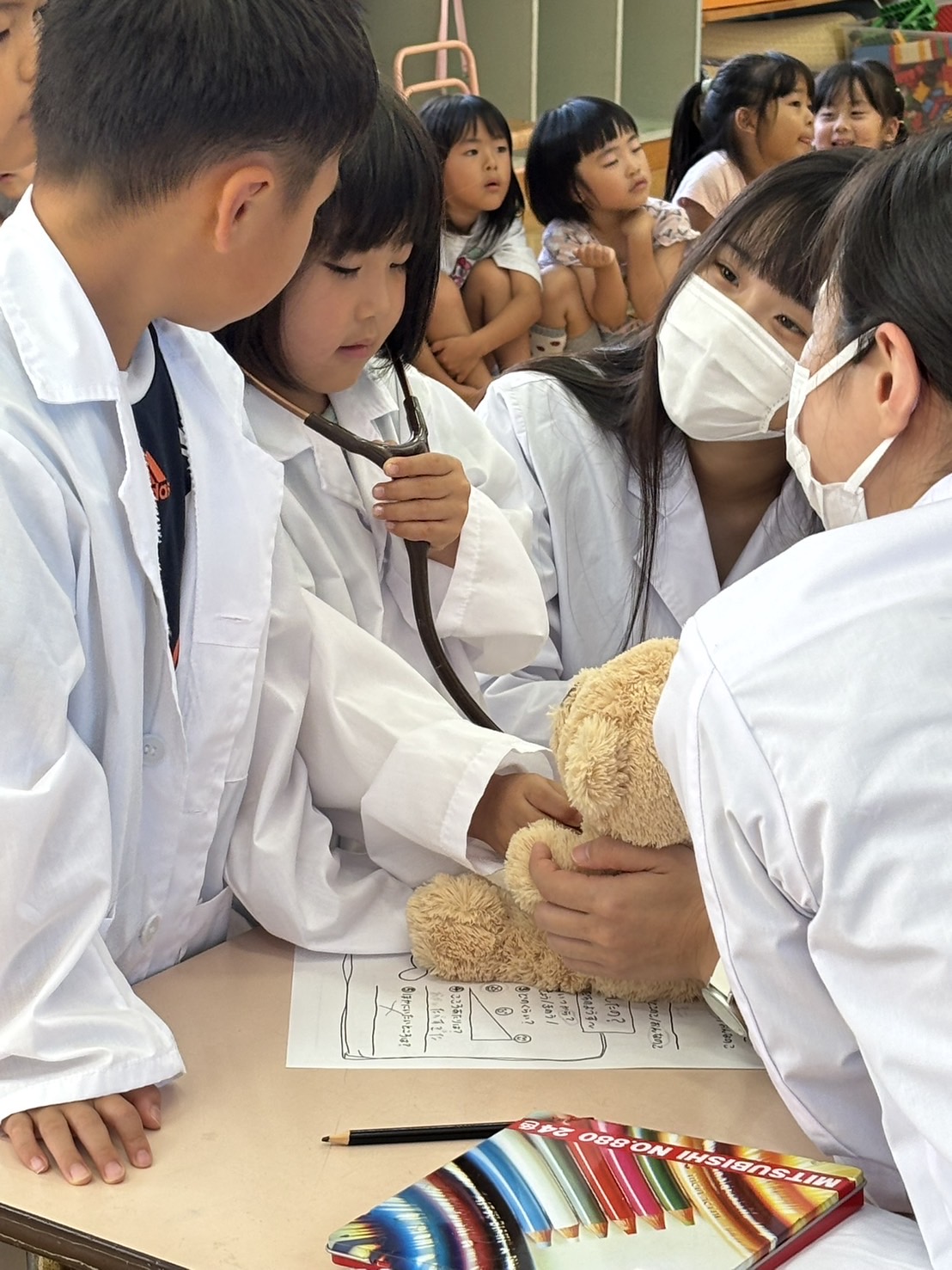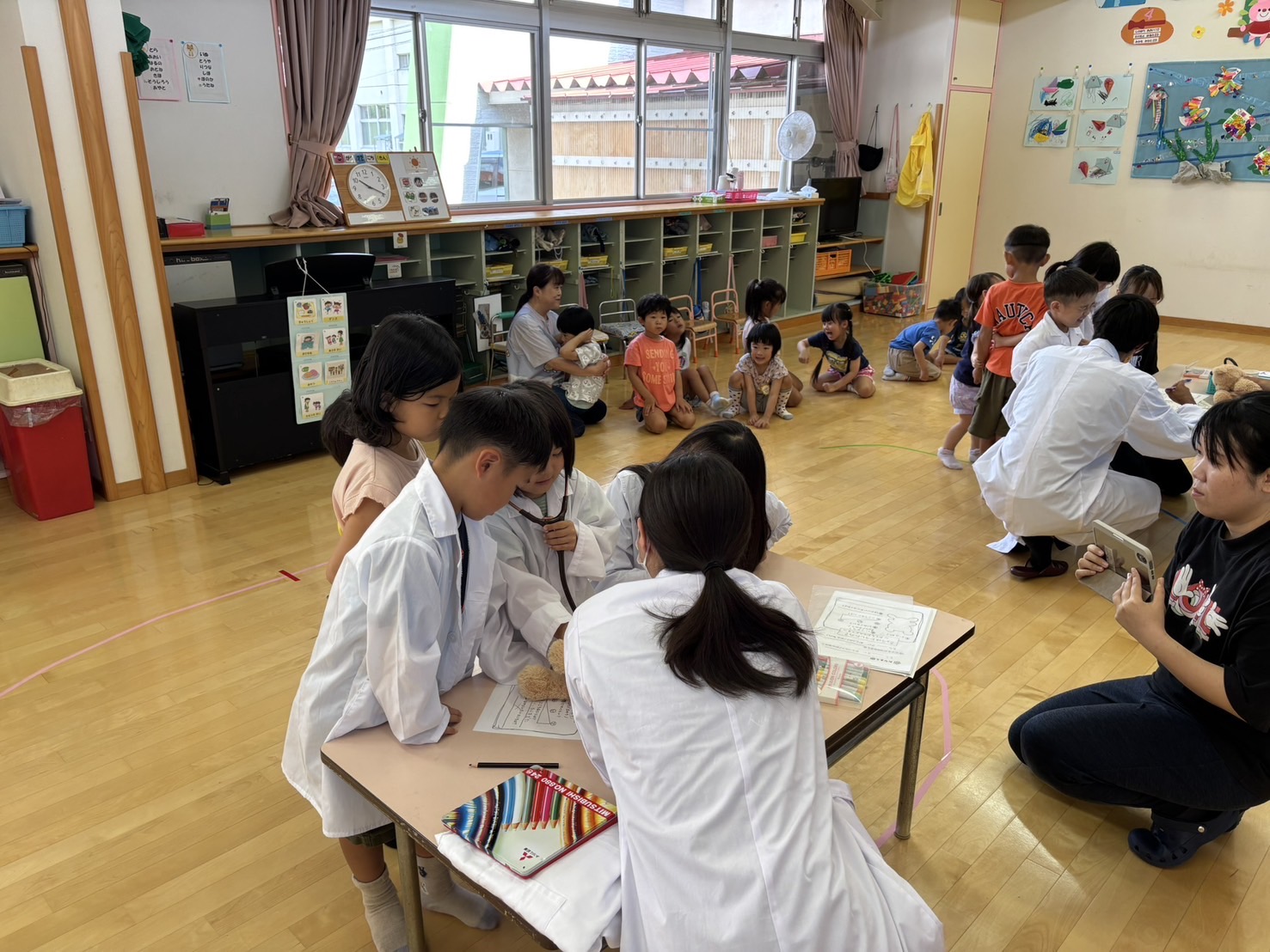【こんにちは。ぬいぐるみ病院部部長のSです。本日は、新庄村保育所で活動させていただき、ありがとうございました。活動を通して、園児たちと仲良くなることができ、消化器や医師について知ってもらうことができ、大変貴重な経験となりました。また、顔を出していただきありがとうございました。しっかり挨拶することができず申し訳ありませんでした。いただいた差し入れは部員で美味しくいただきました。また機会があれば、ぜひ活動させてもらいたいです。】