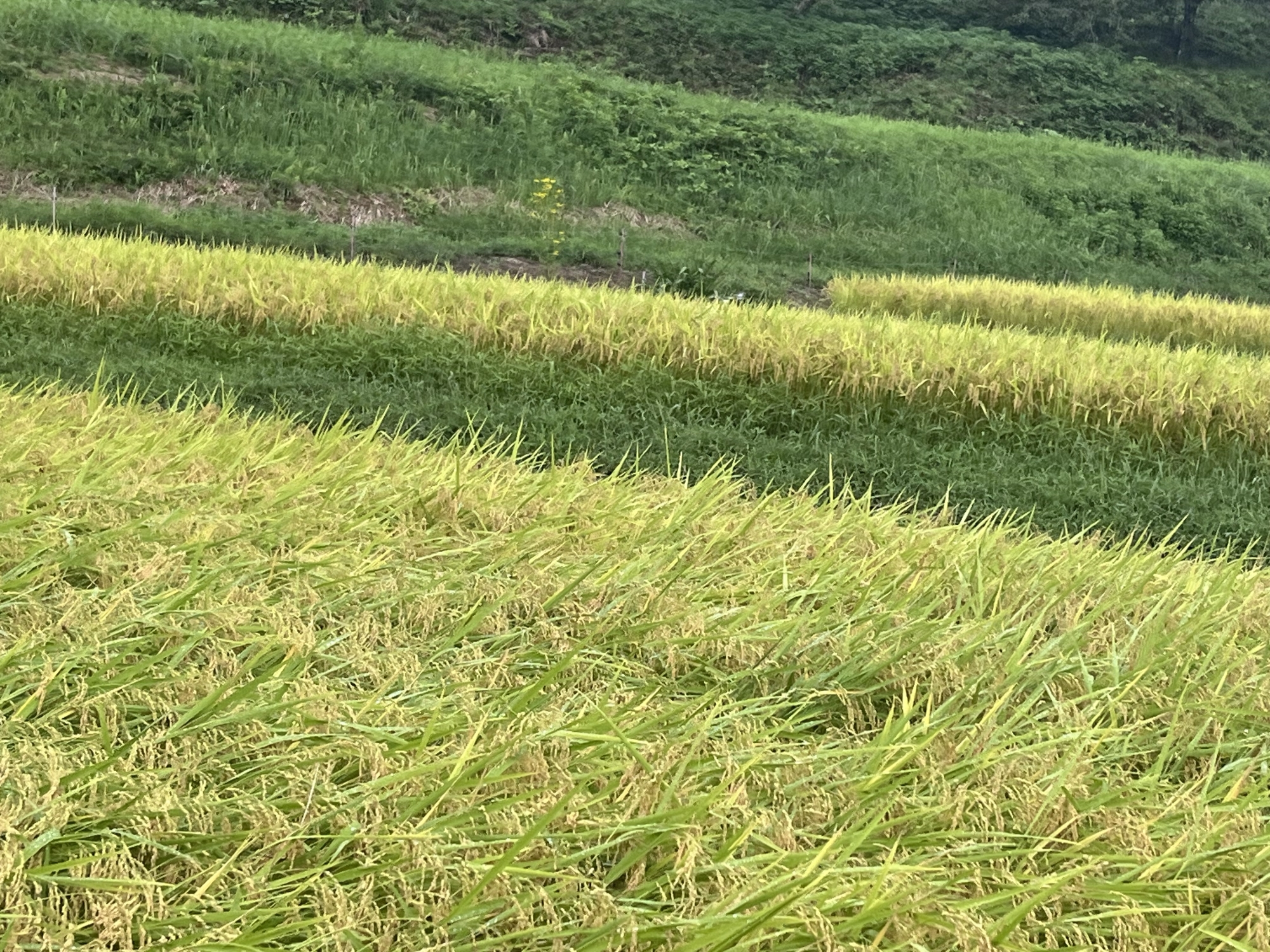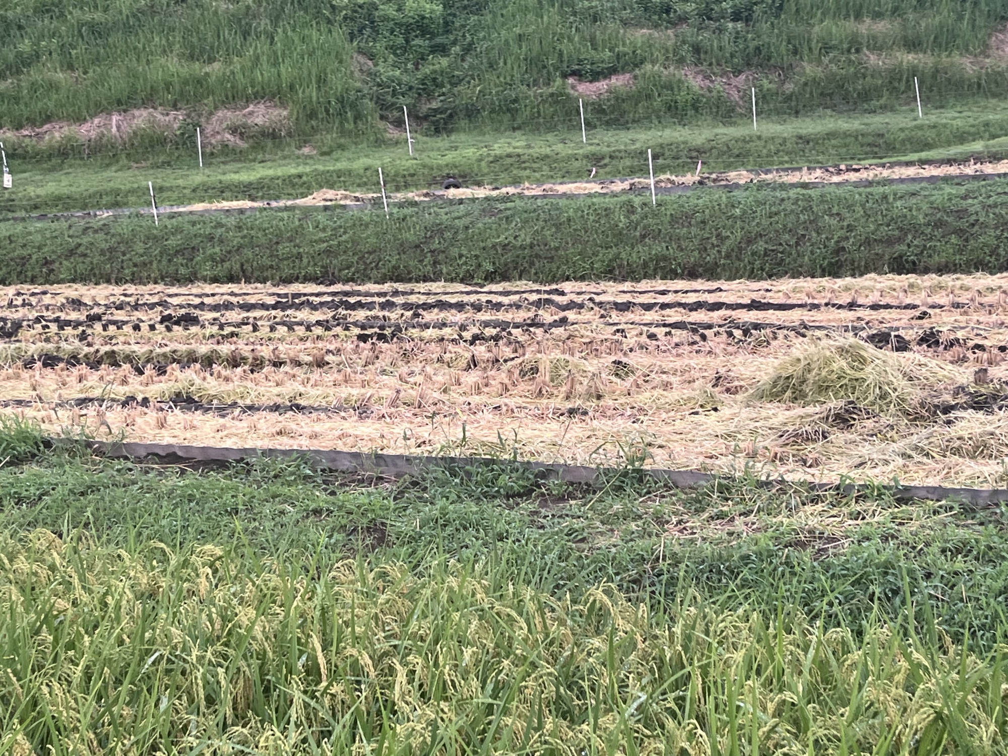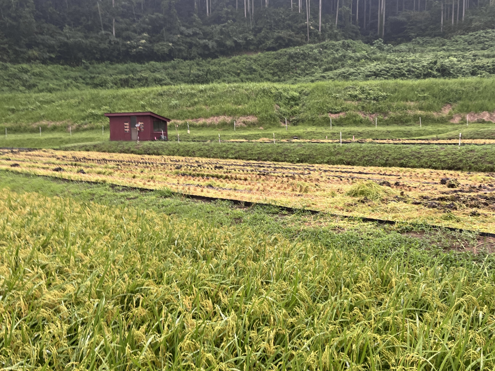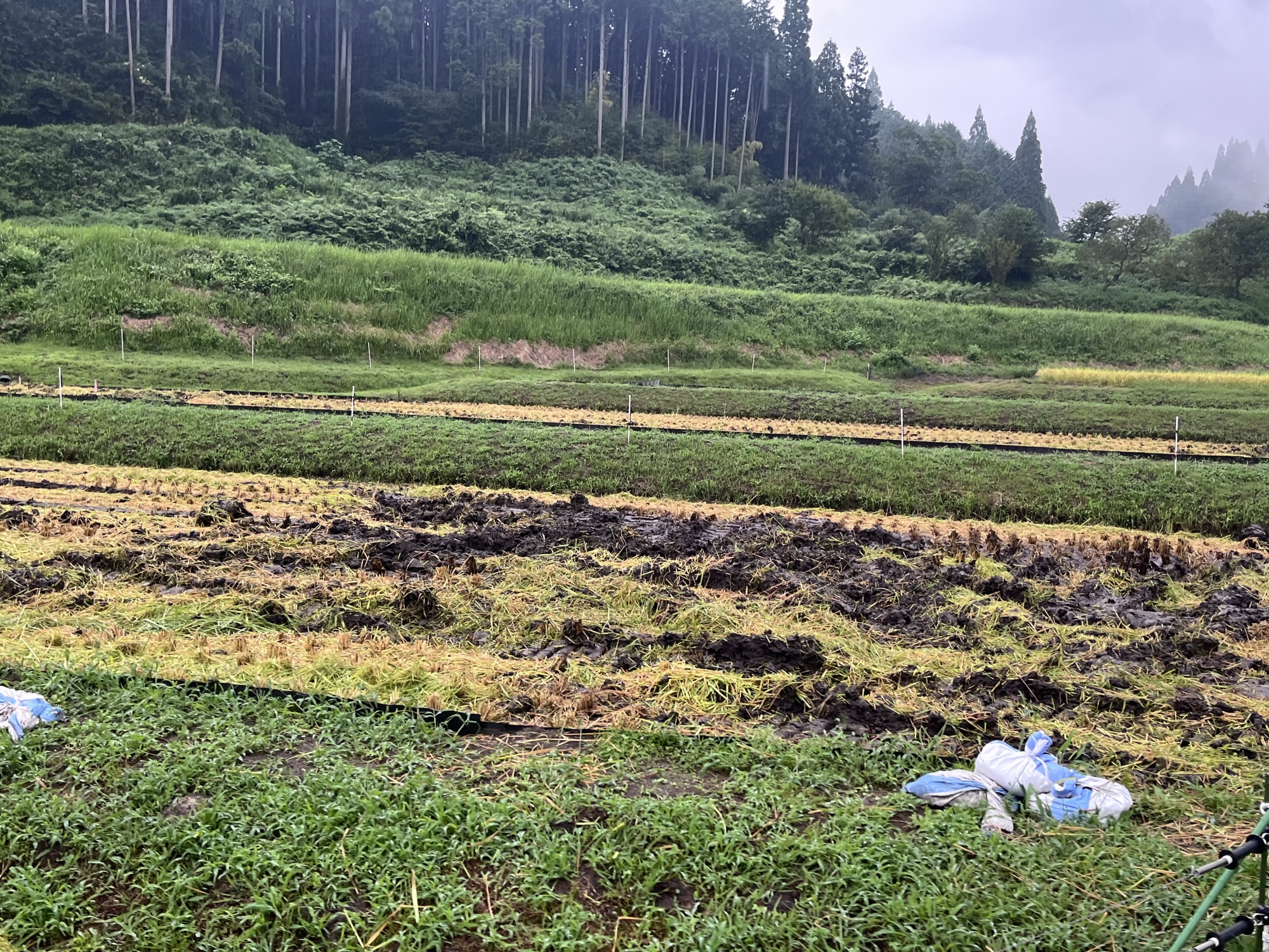 おや、稲刈り終わっていますね.~雨で倒れている稲も.