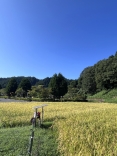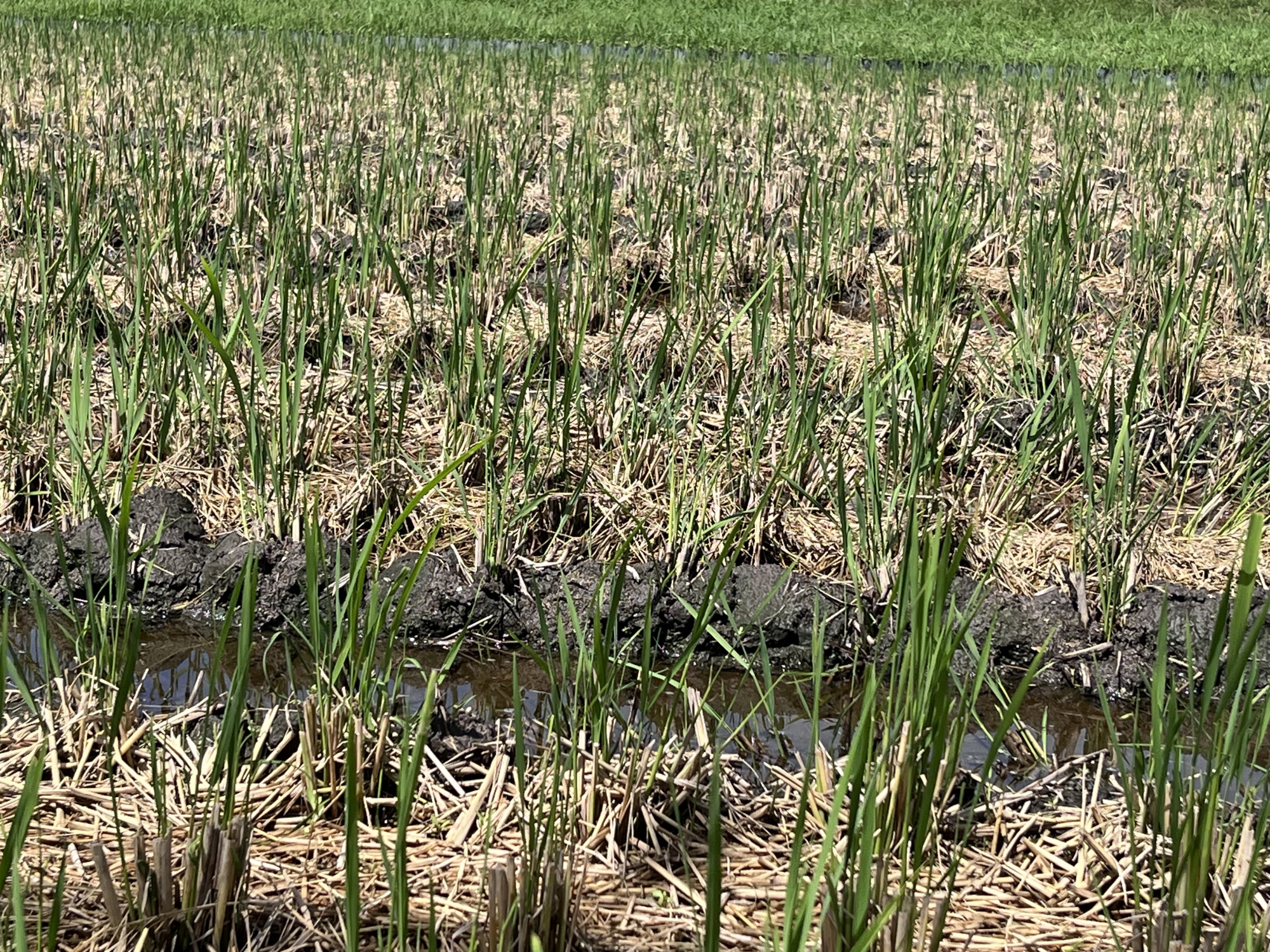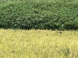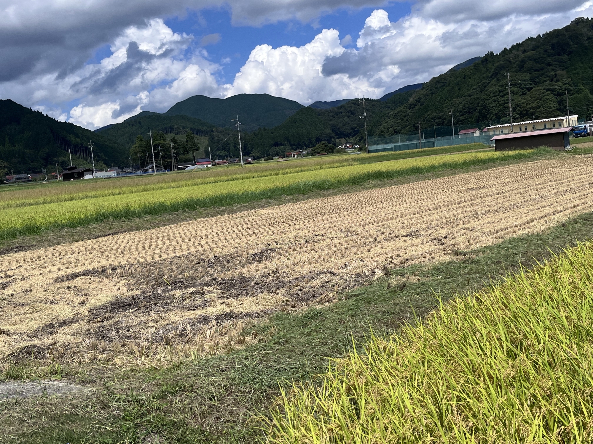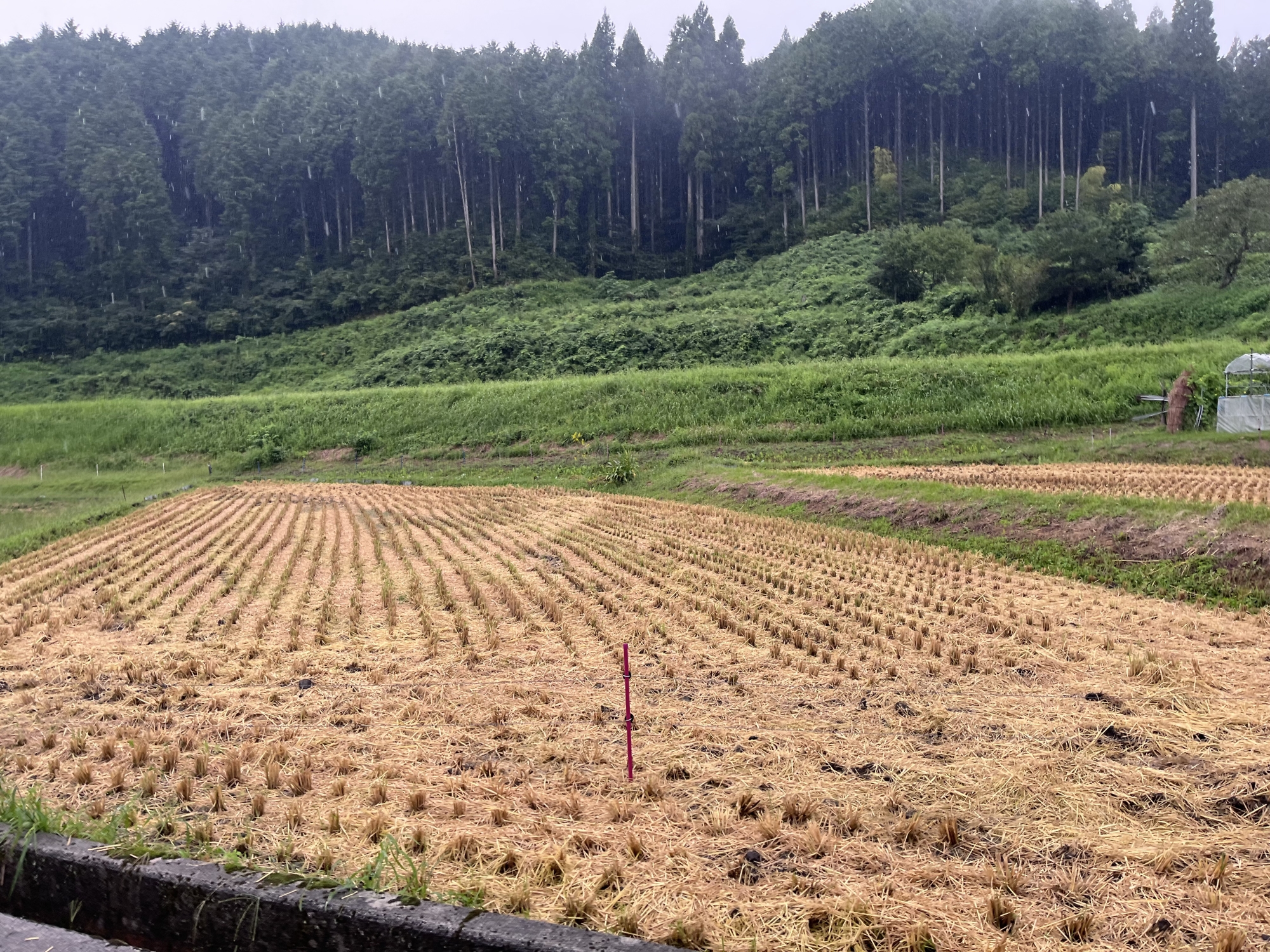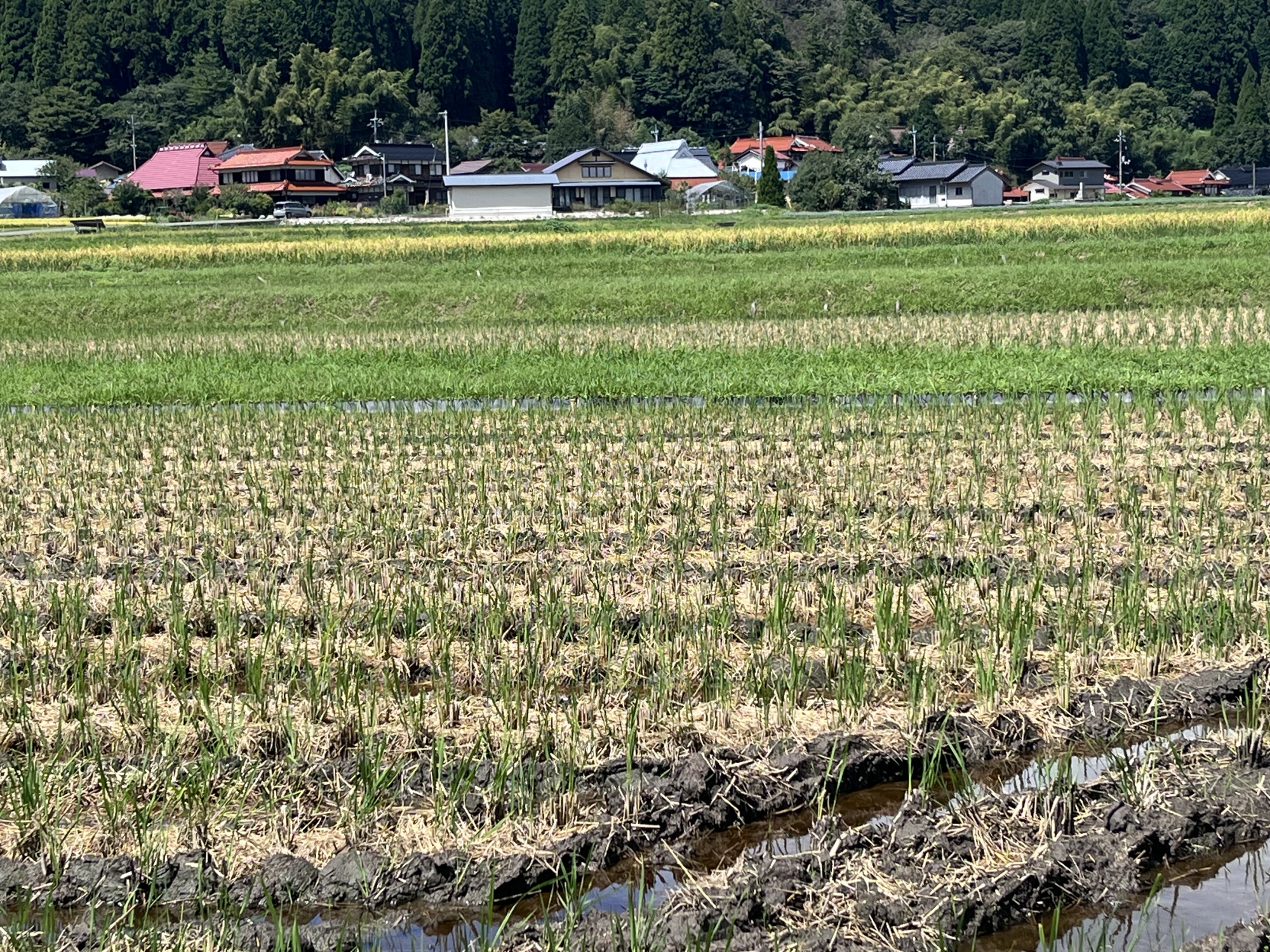 あれ、午前中に稲刈りだったのかな? そして、この緑の葉は、豆???