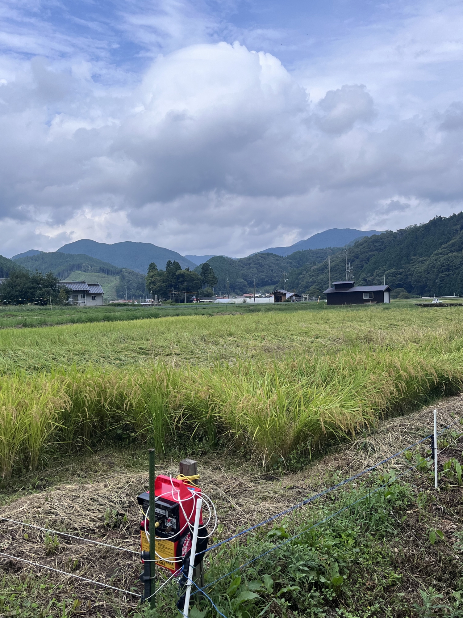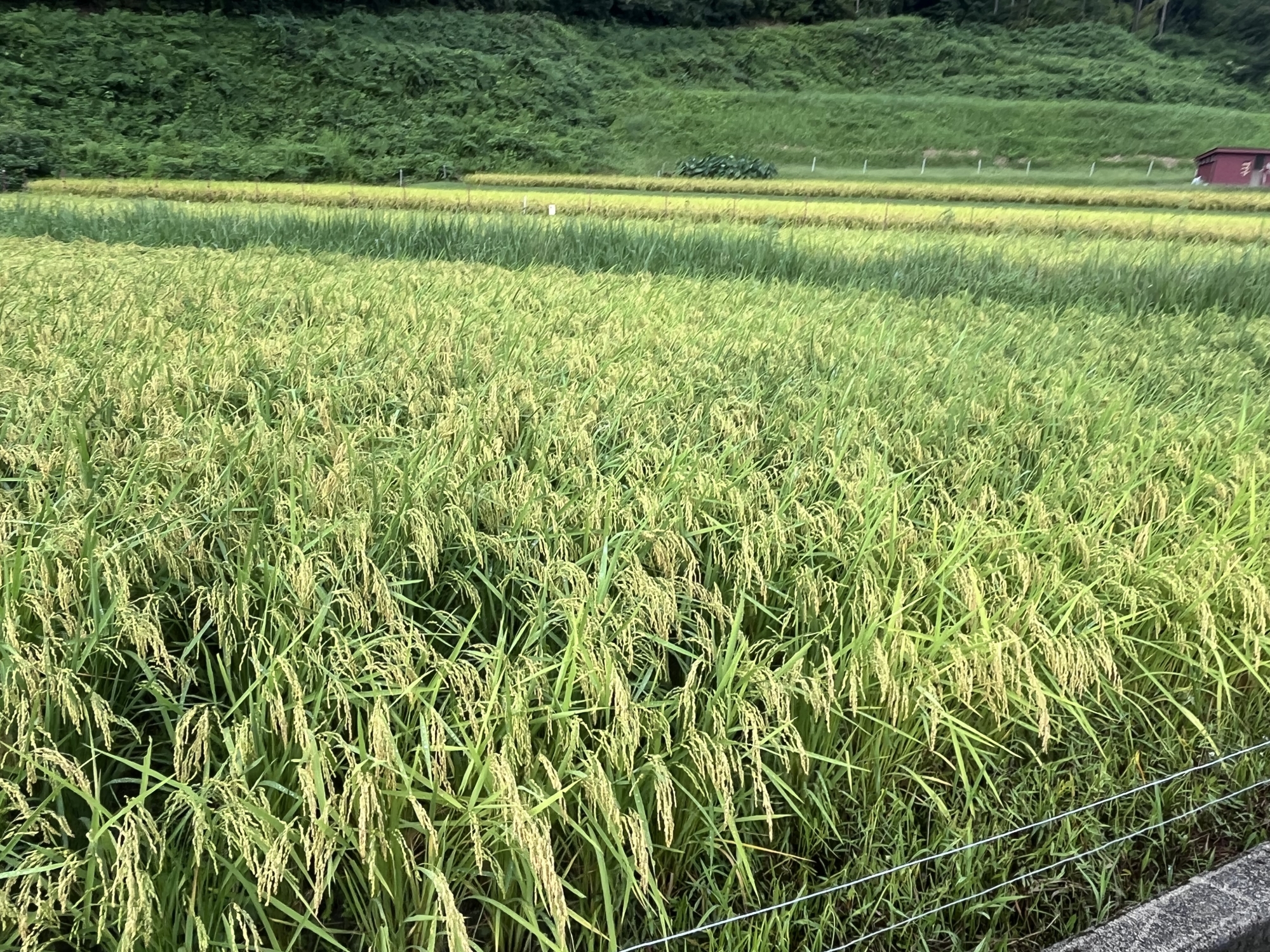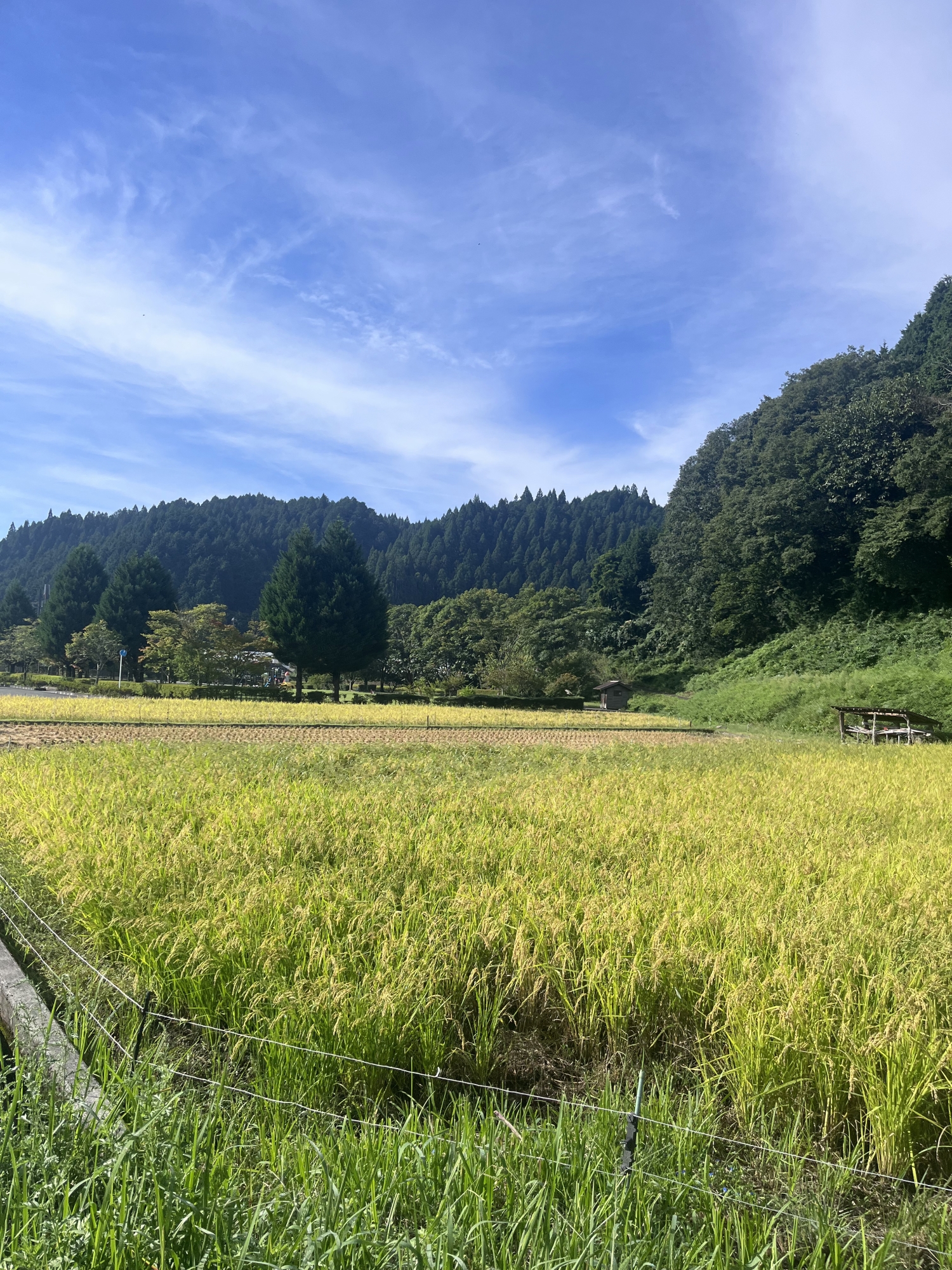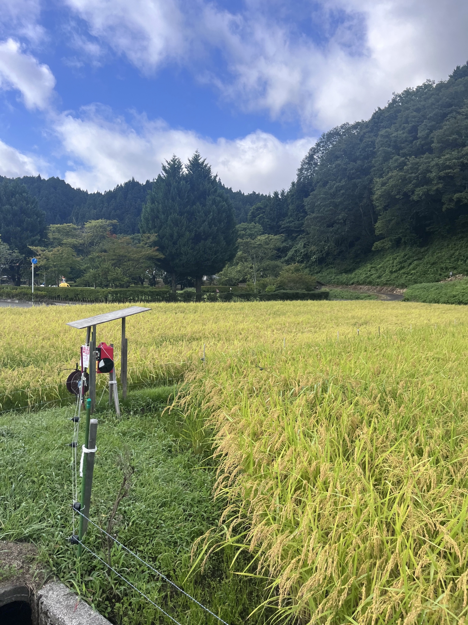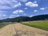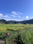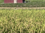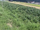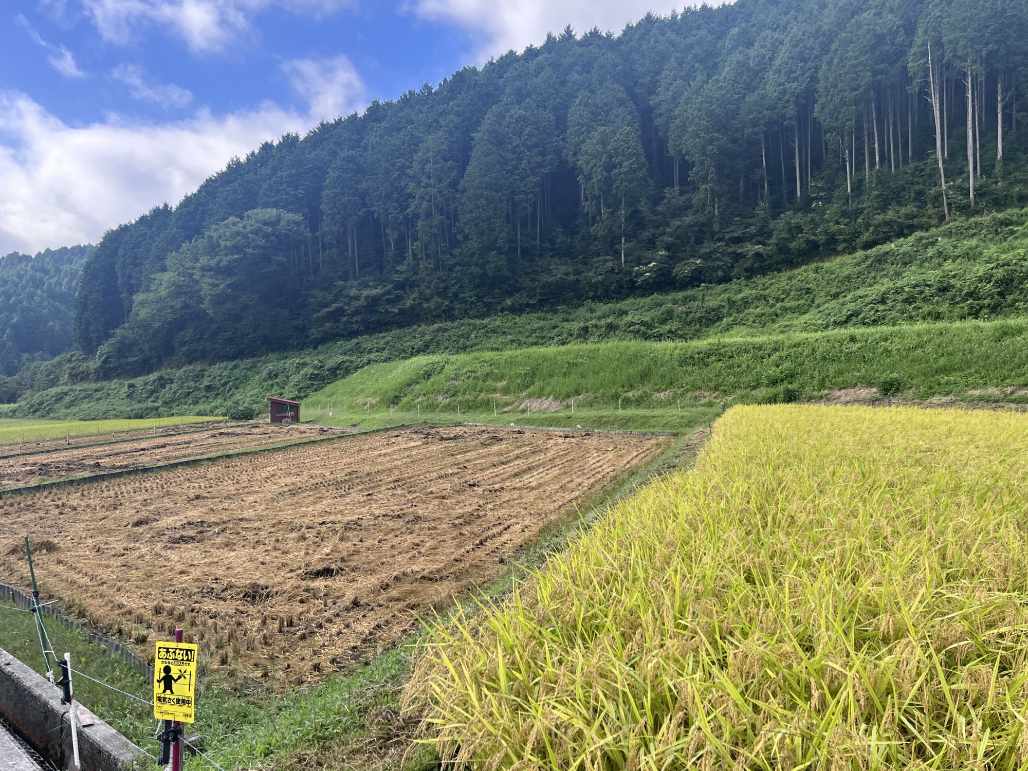 あれ、午前中に稲刈りだったのかな? そして、この緑の葉は、豆???