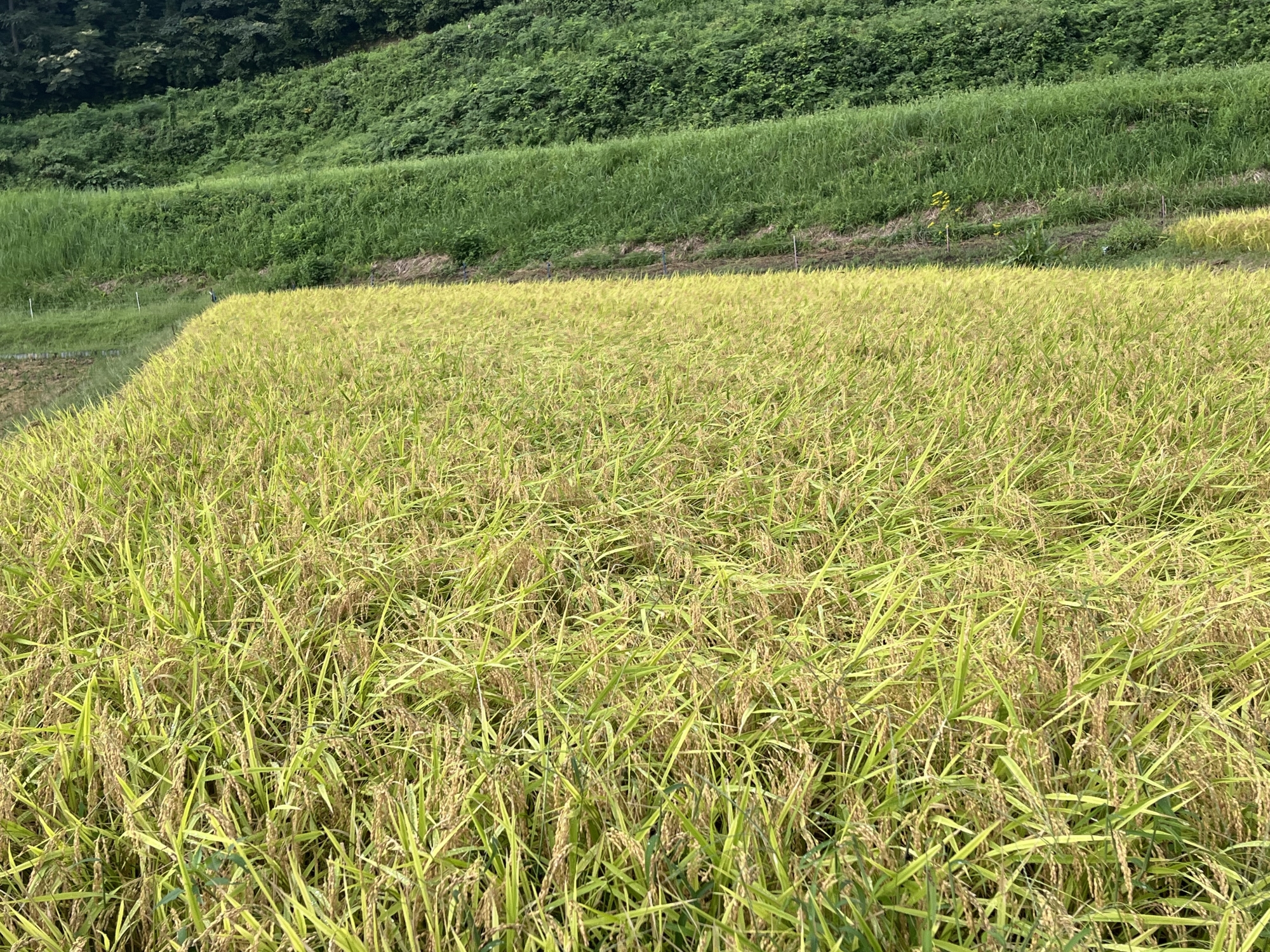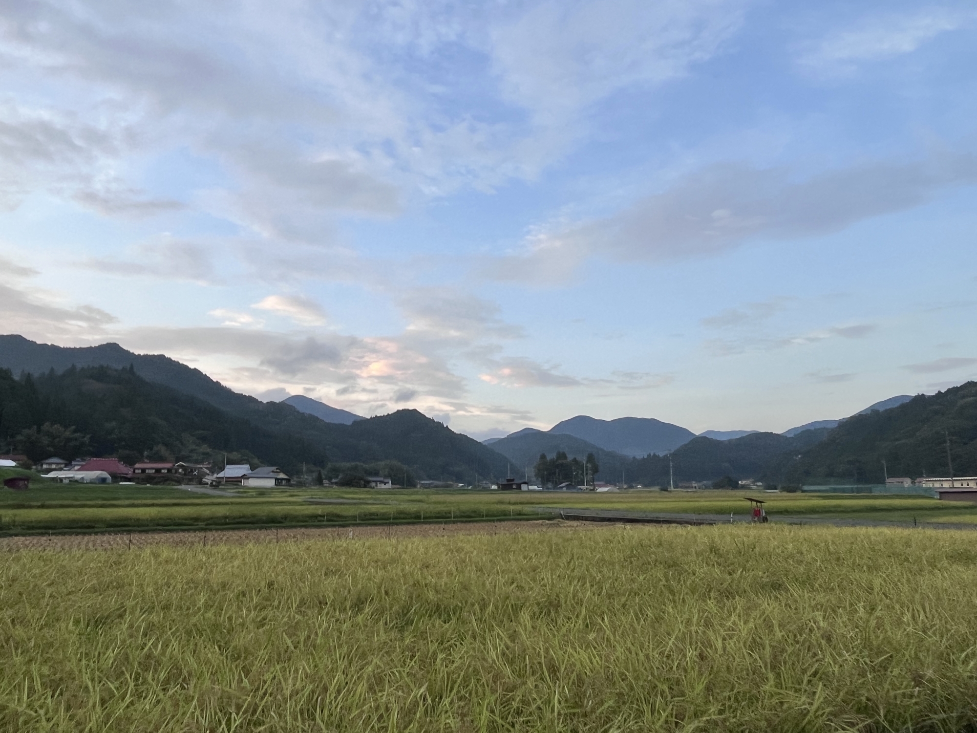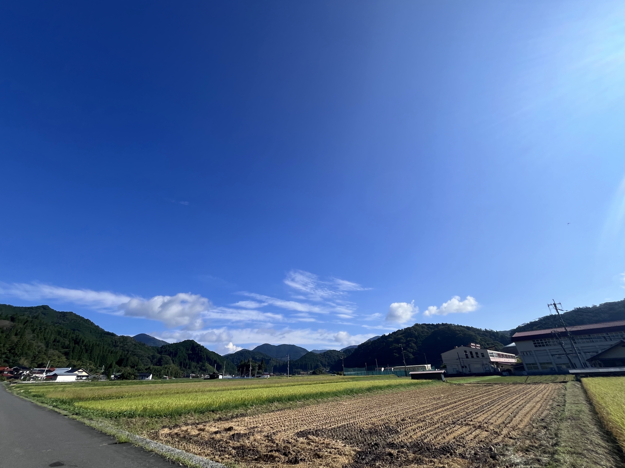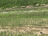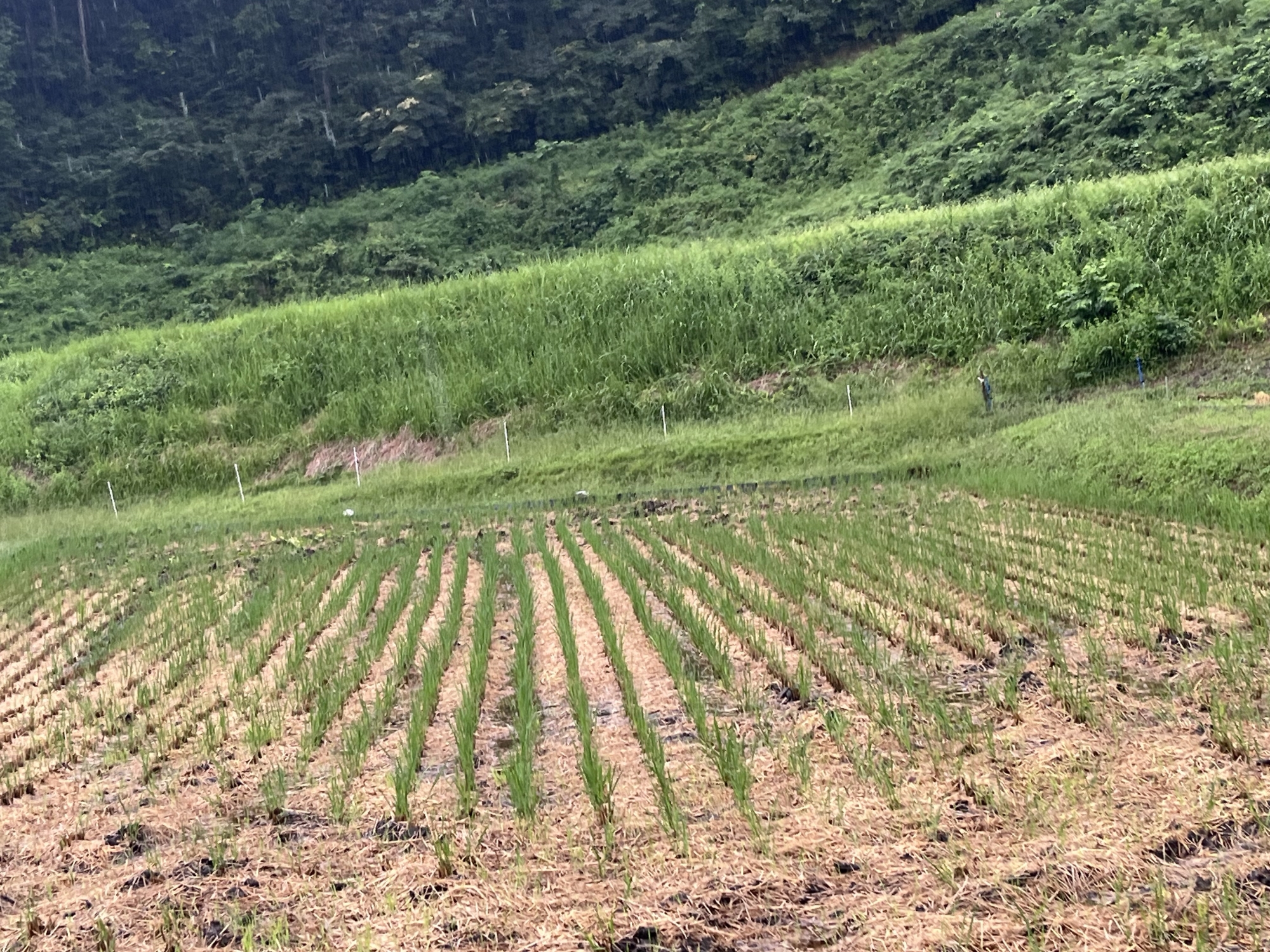 あれ、午前中に稲刈りだったのかな? そして、この緑の葉は、豆???