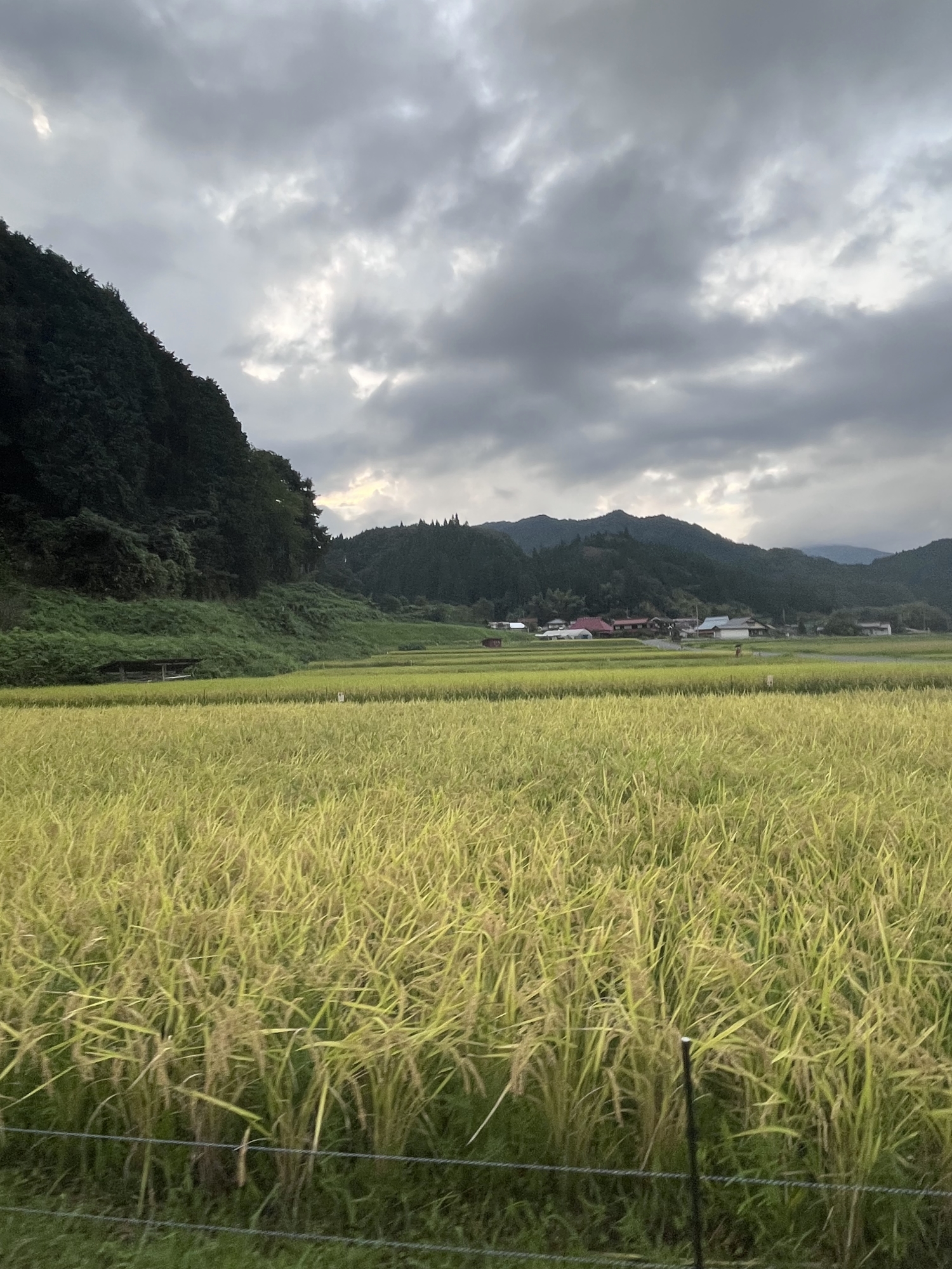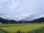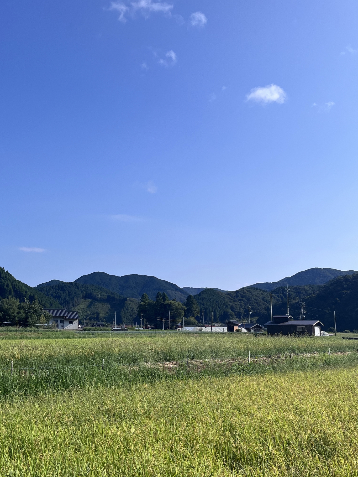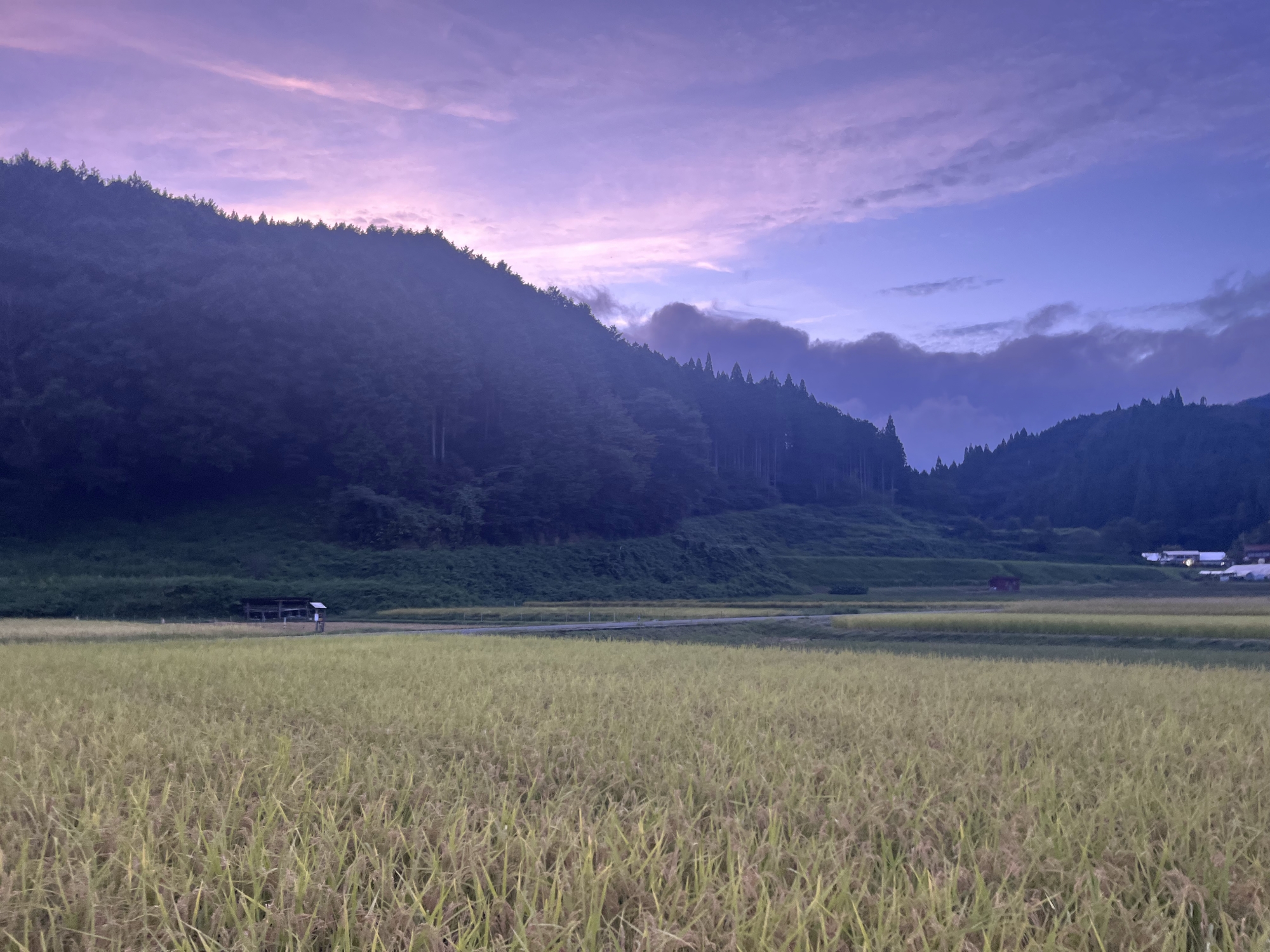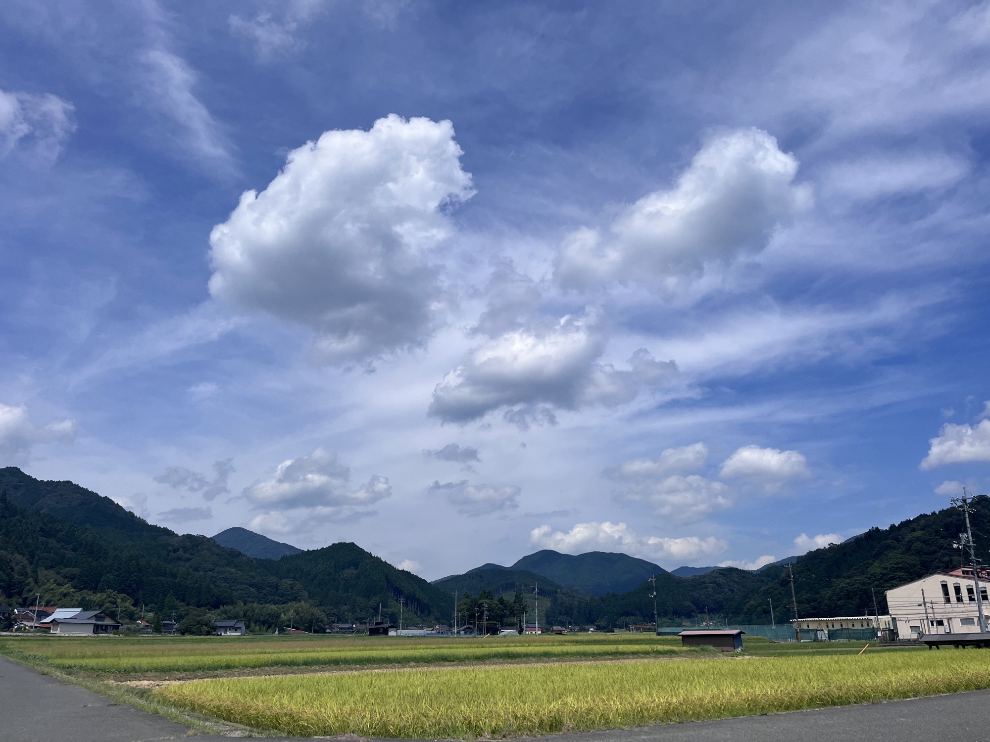 あれ、午前中に稲刈りだったのかな? そして、この緑の葉は、豆???