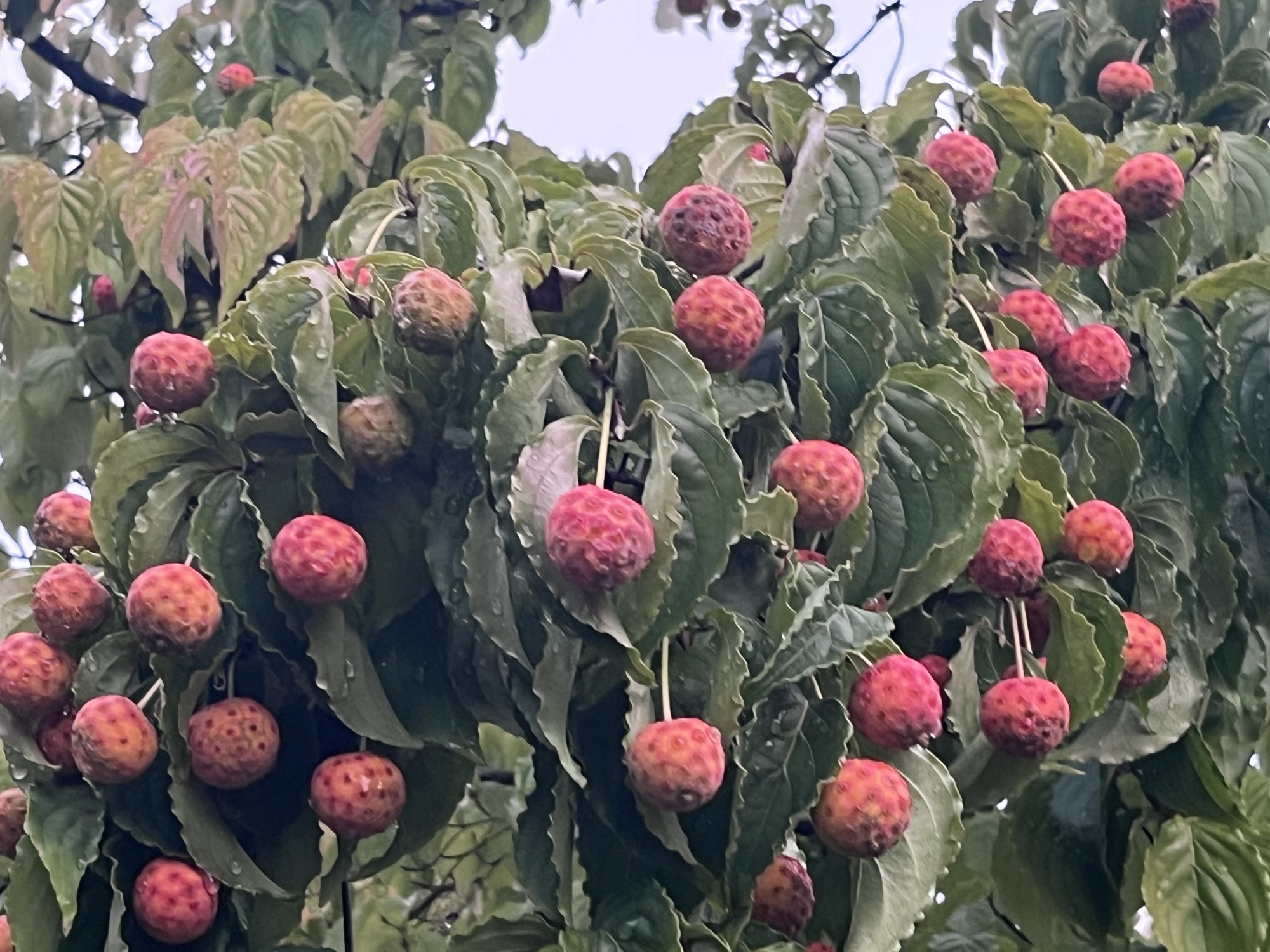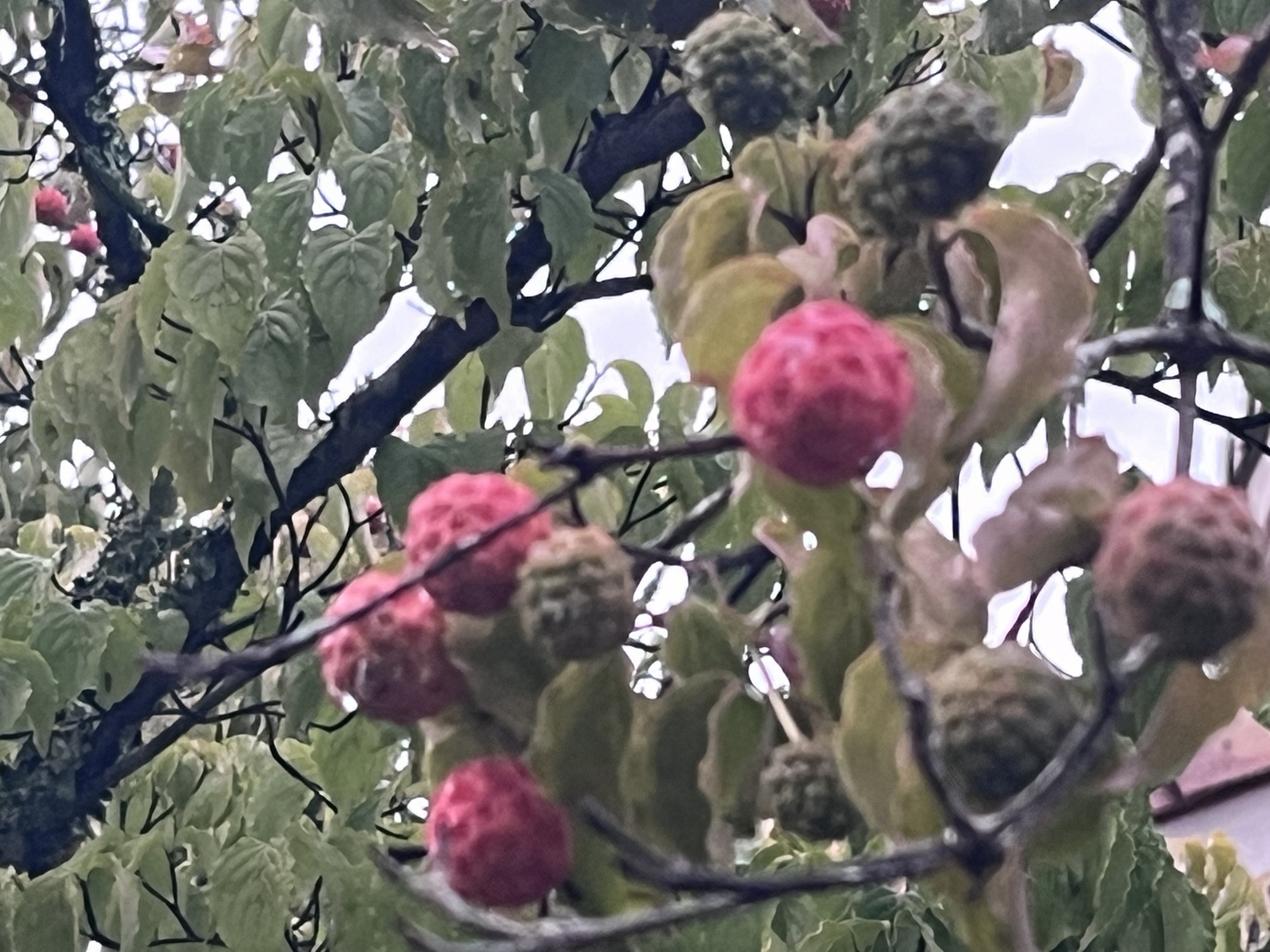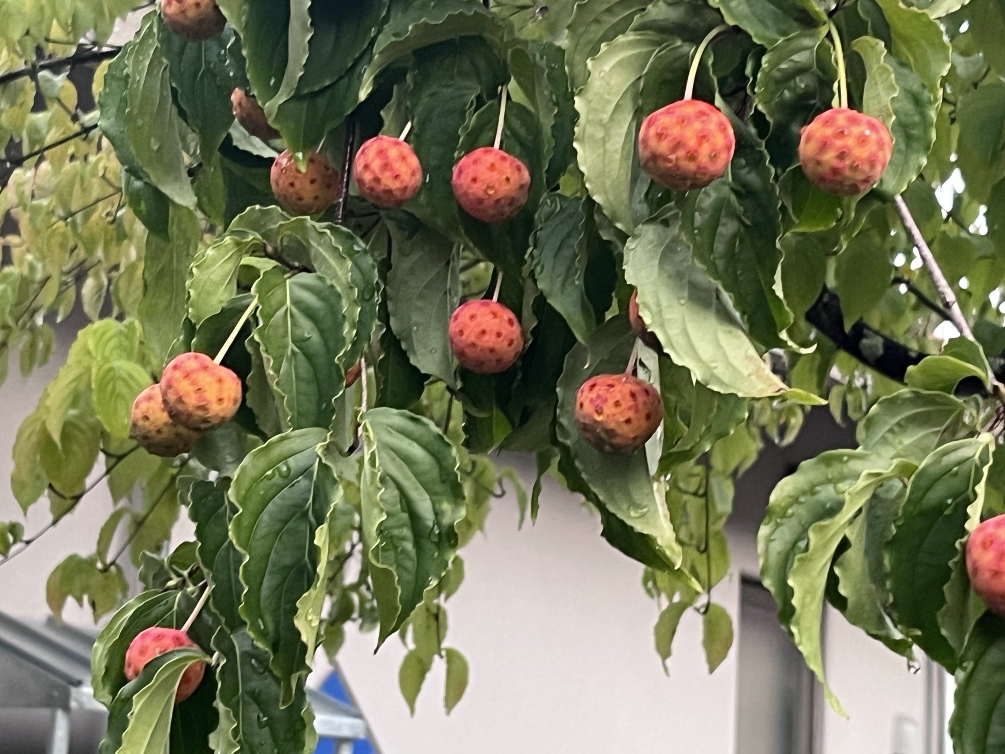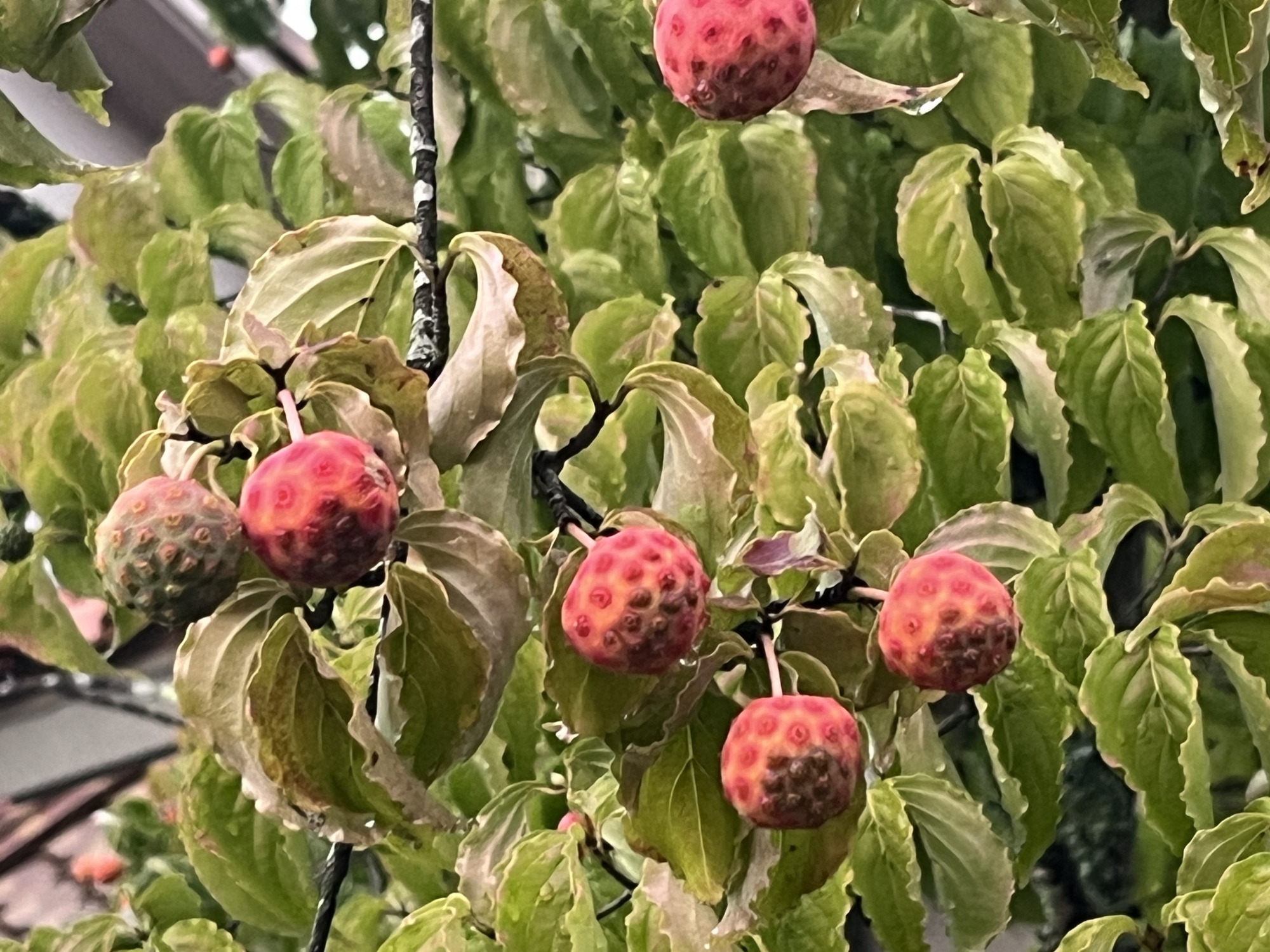院長室の向こうヤマボウシが一番早く朱くなってきています.