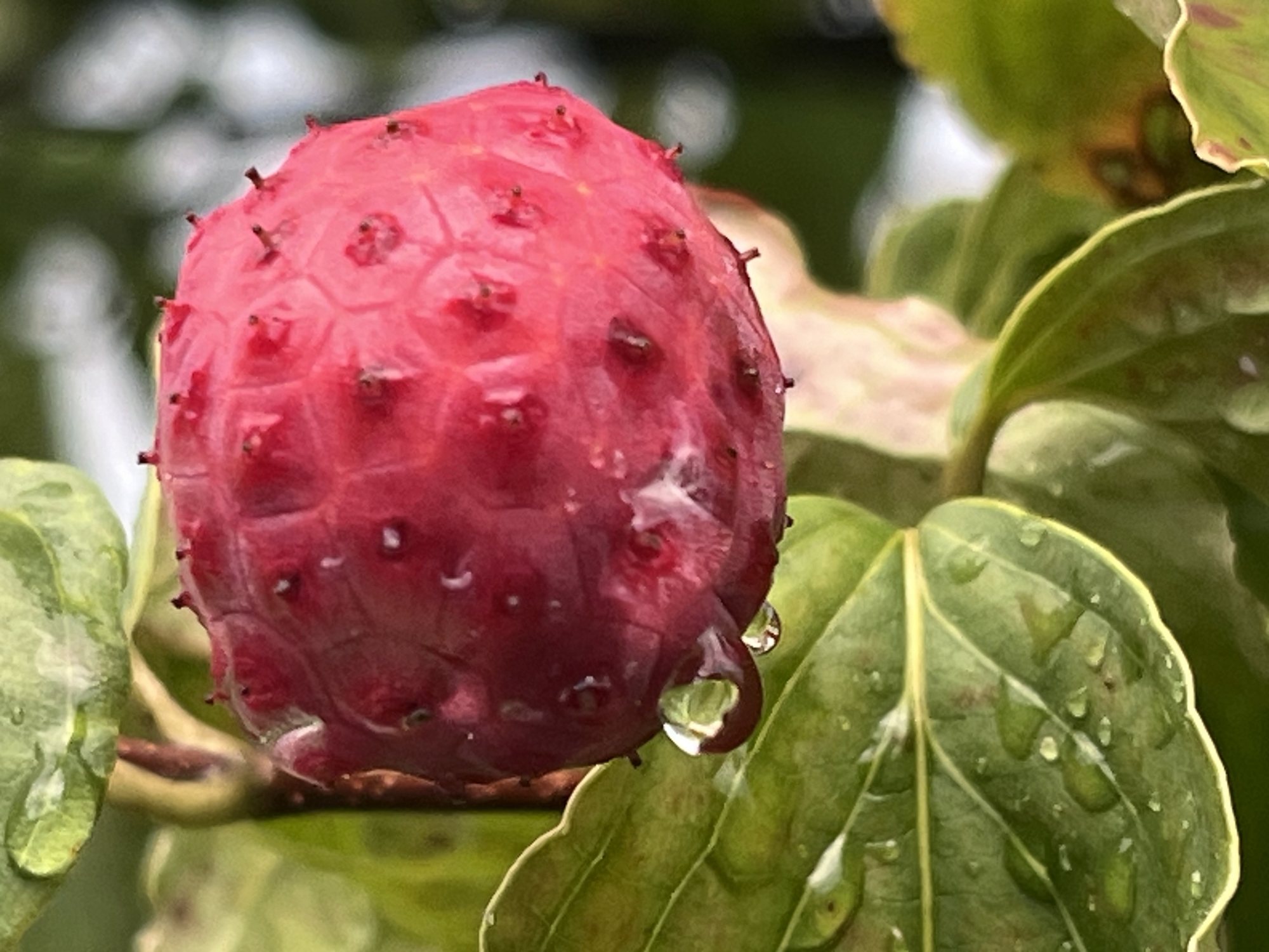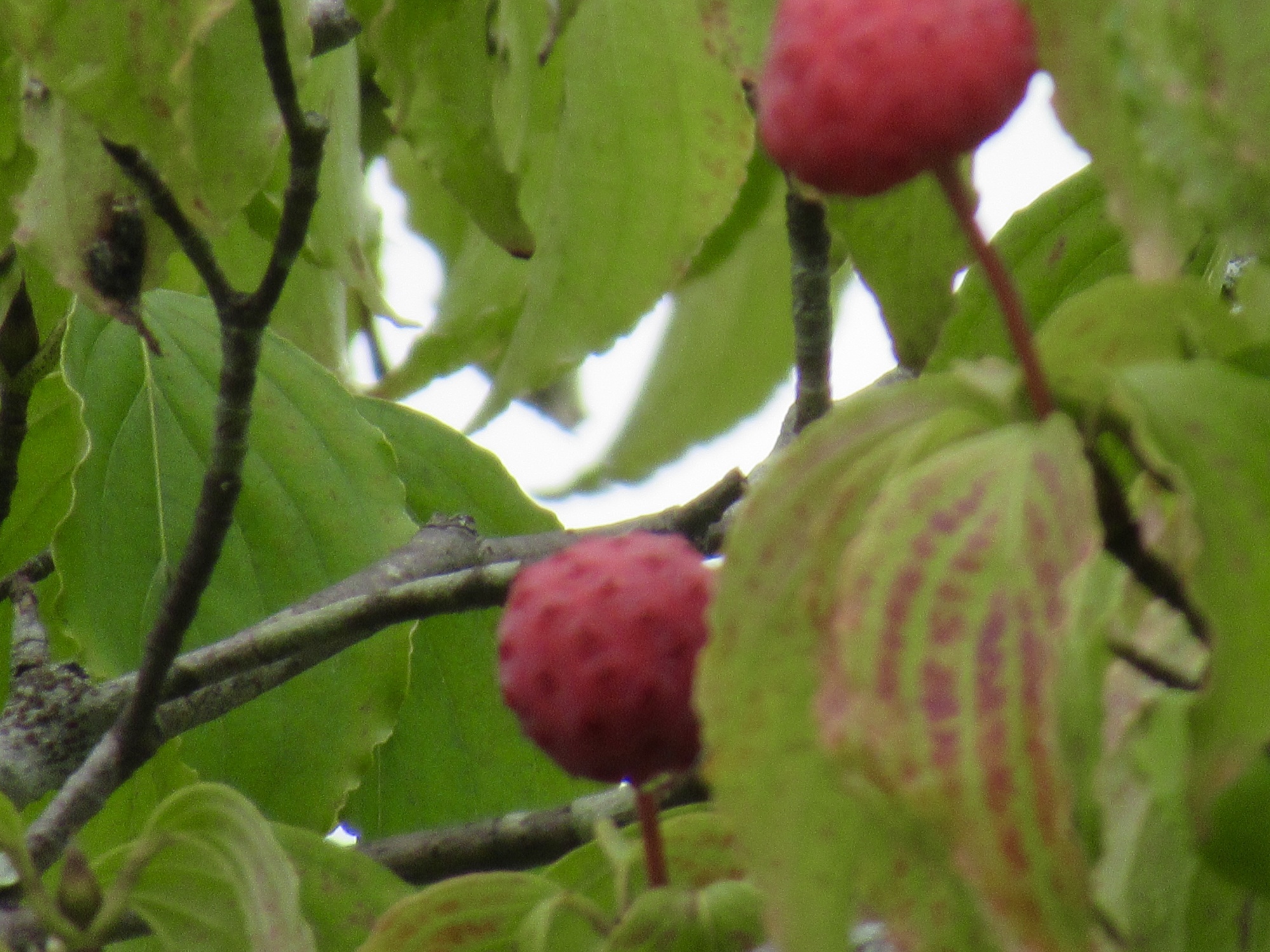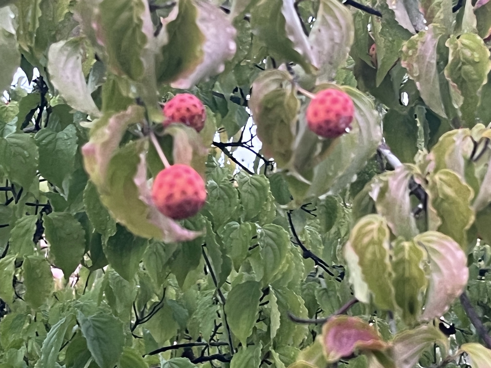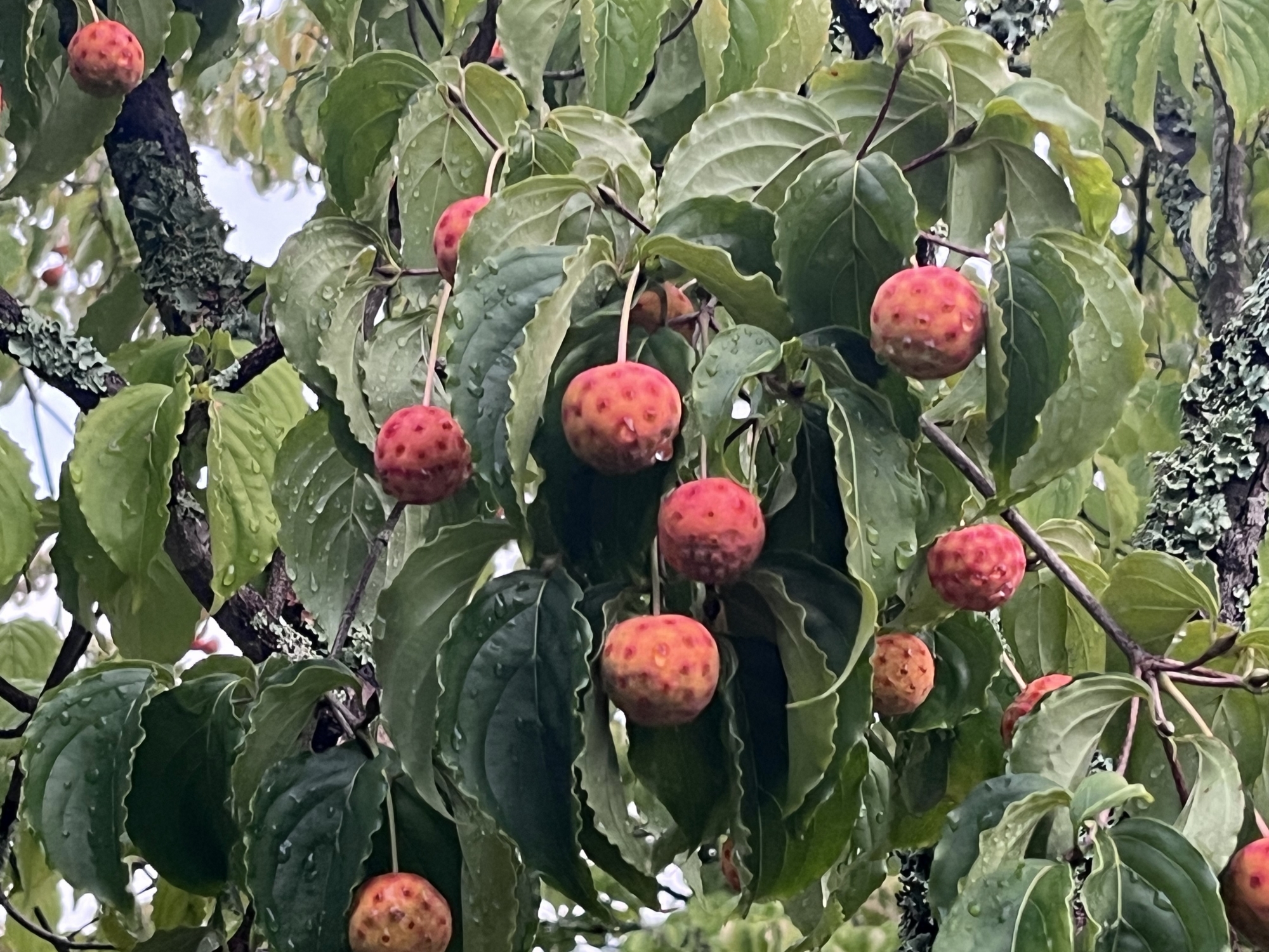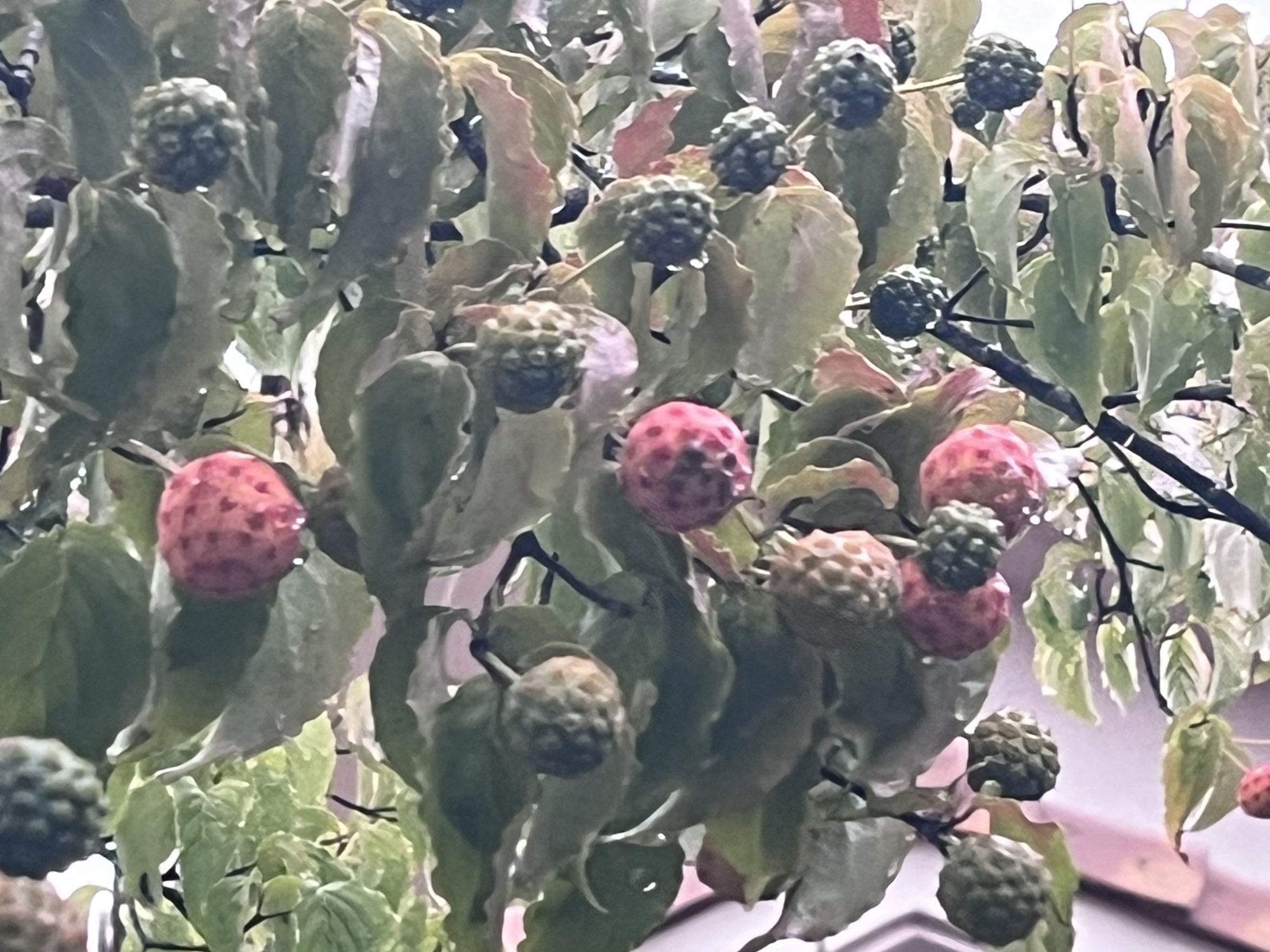 院長室の向こうヤマボウシが一番早く朱くなってきています.