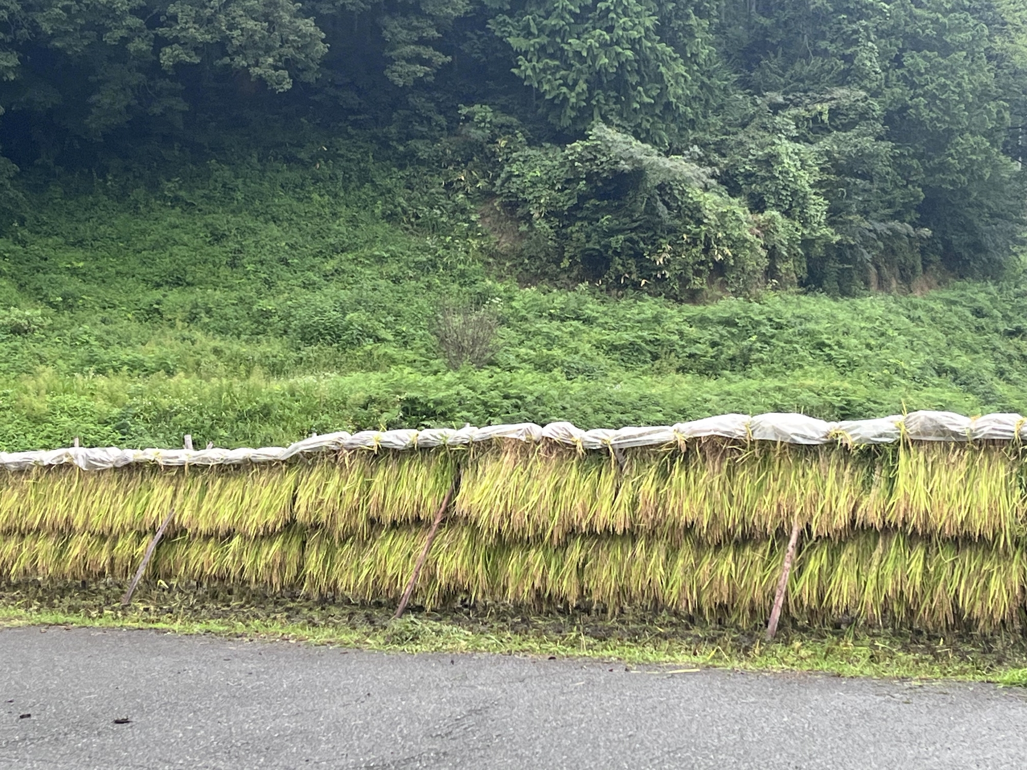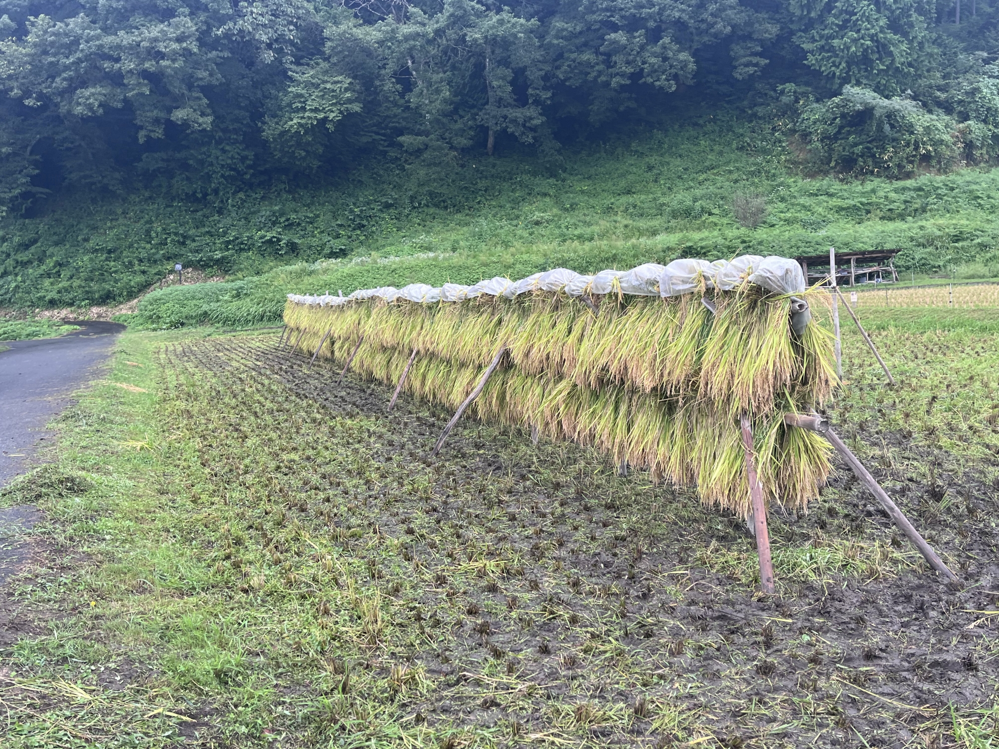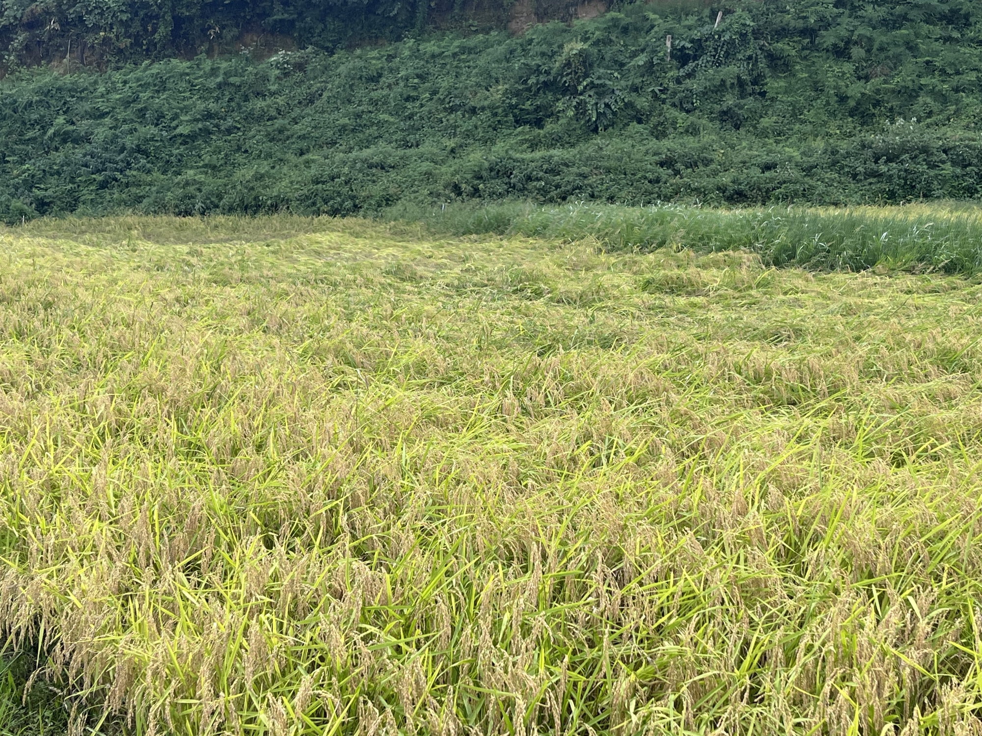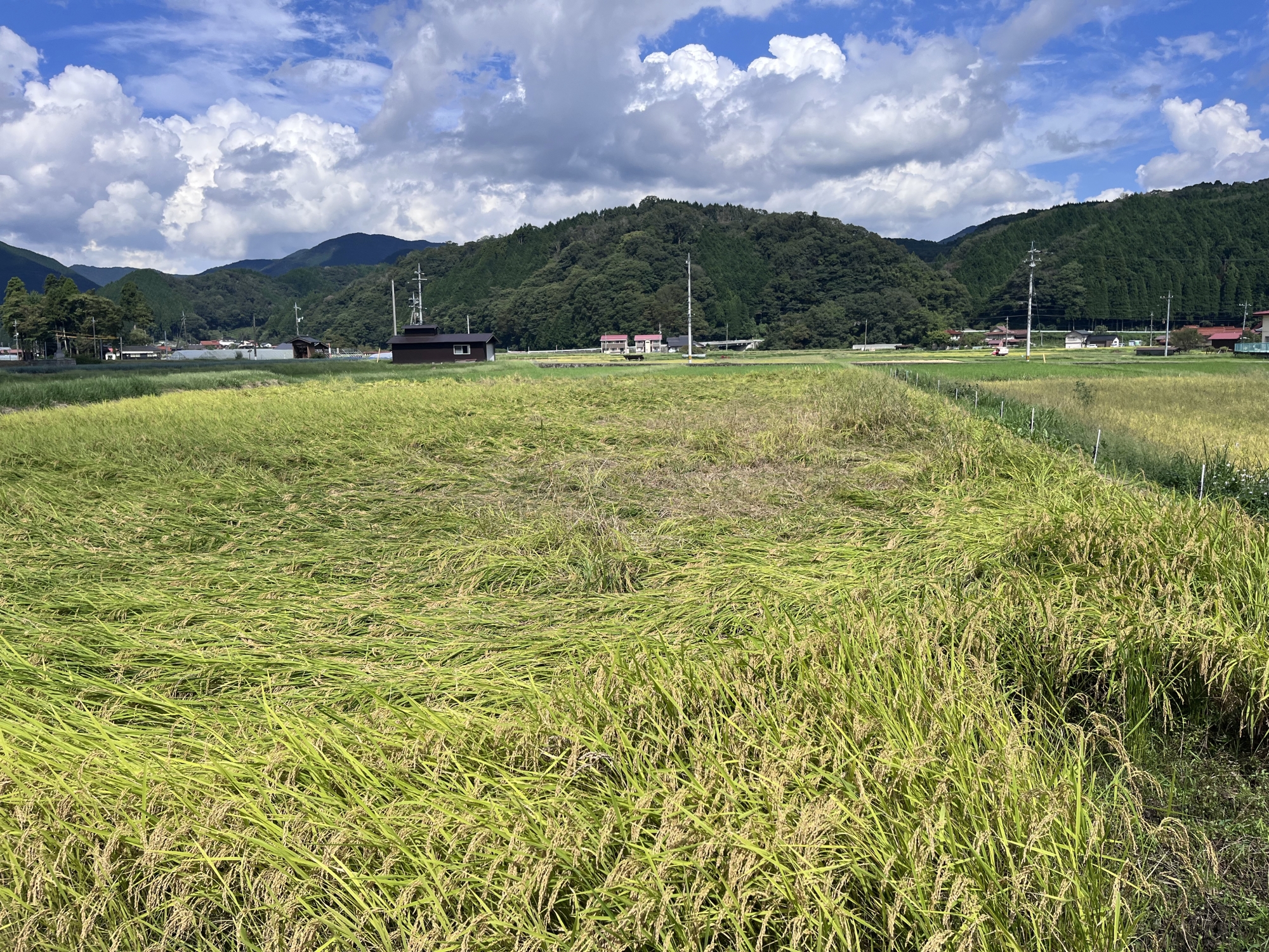 そして、雨などに倒れた稲の田圃も多いです.