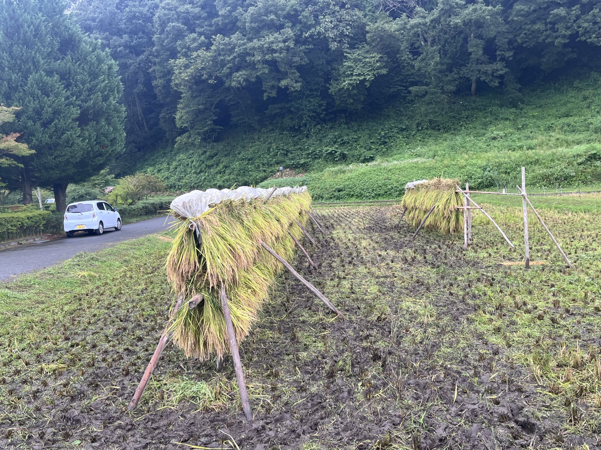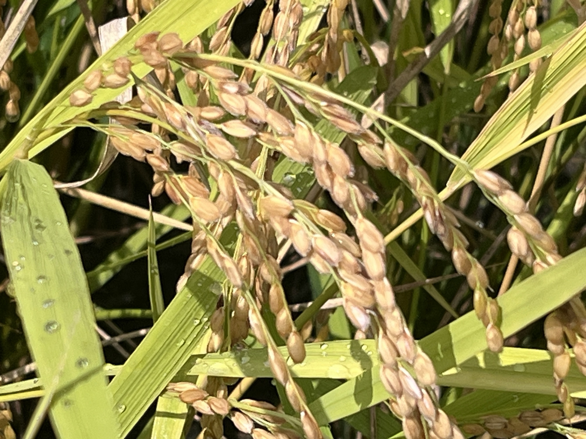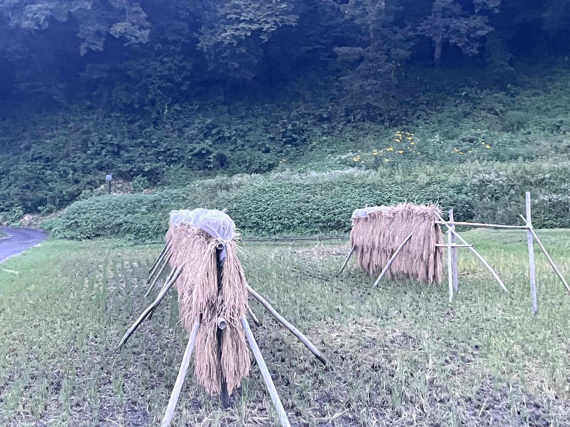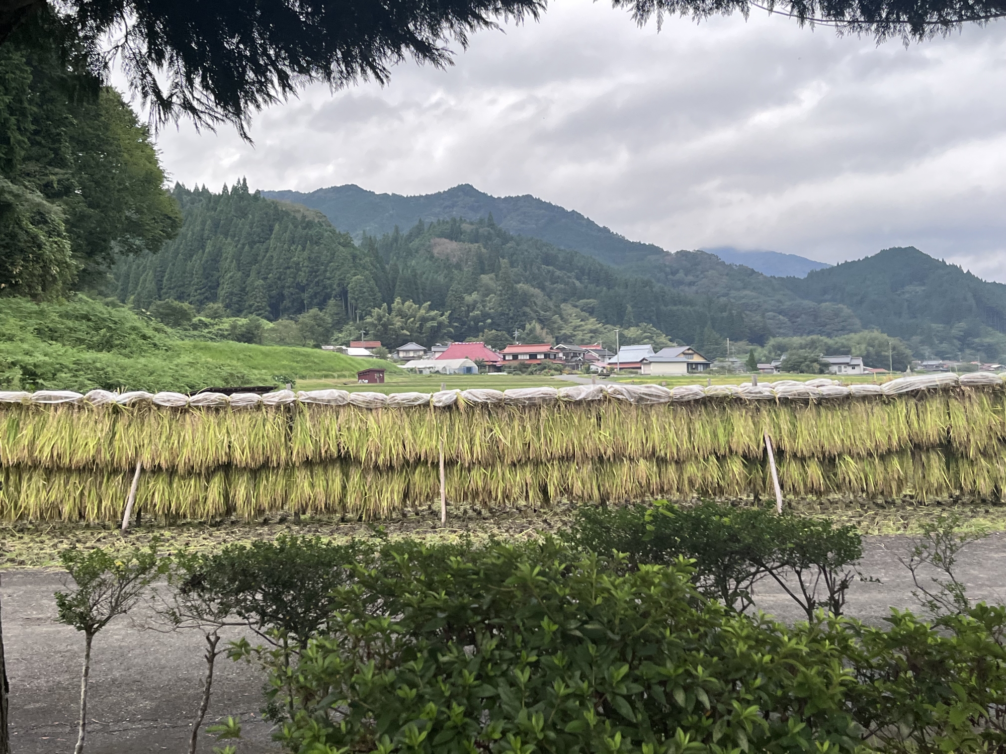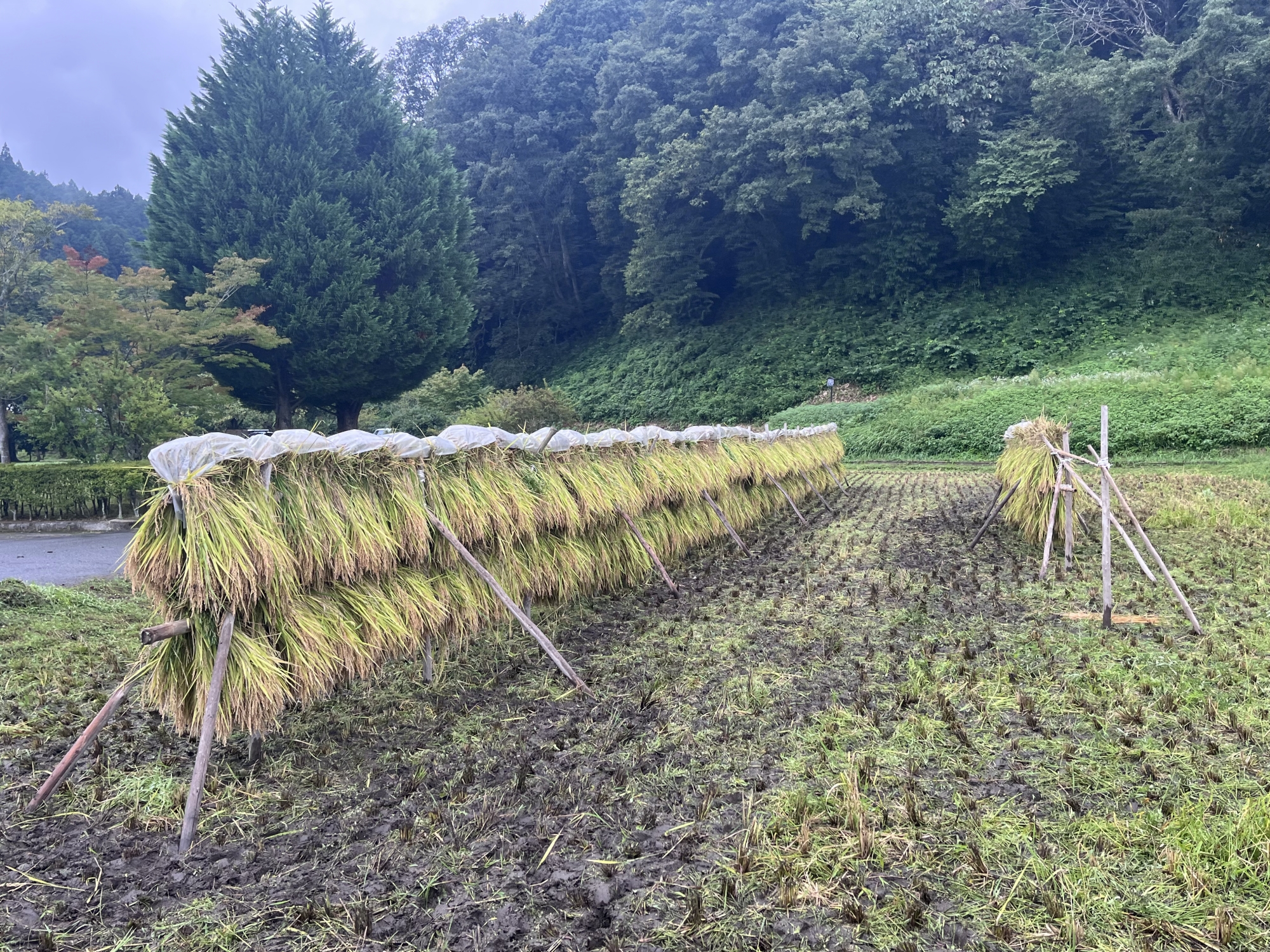 そして、雨などに倒れた稲の田圃も多いです.