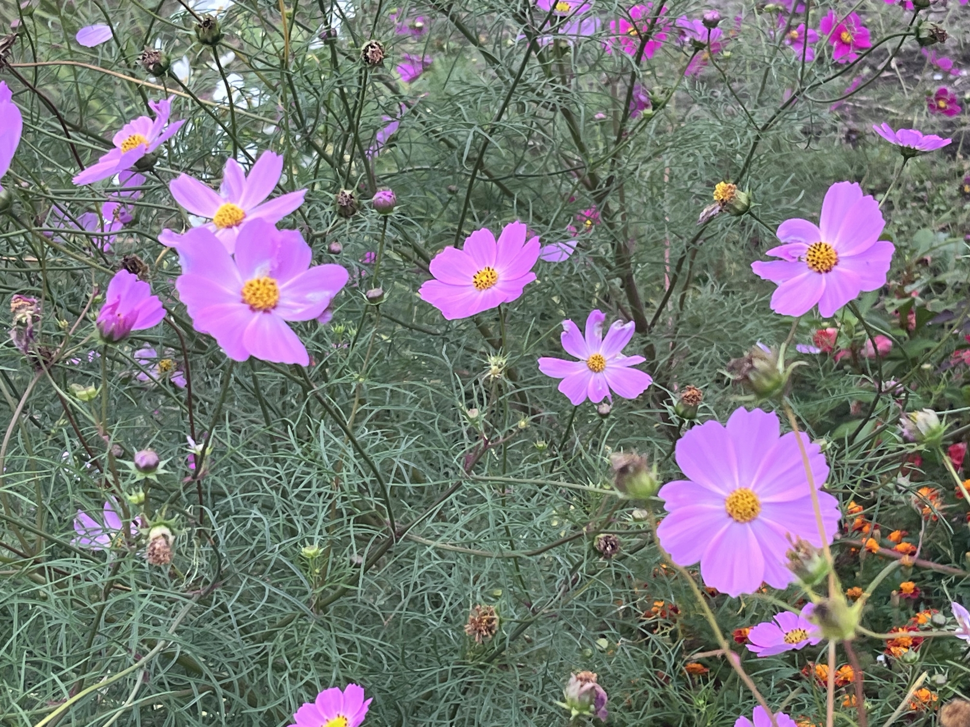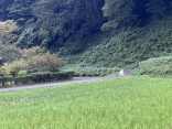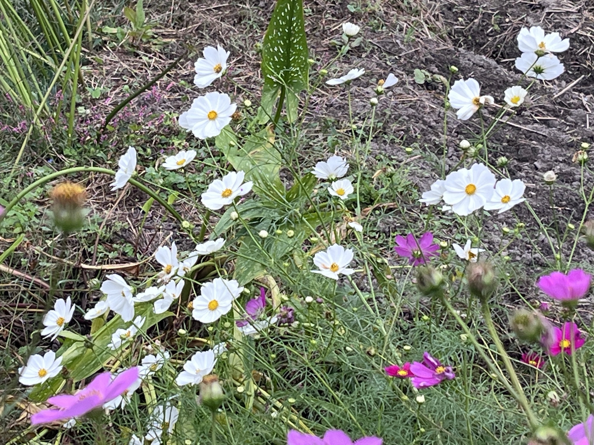 道路向こうの秋桜や穭の稲穂.