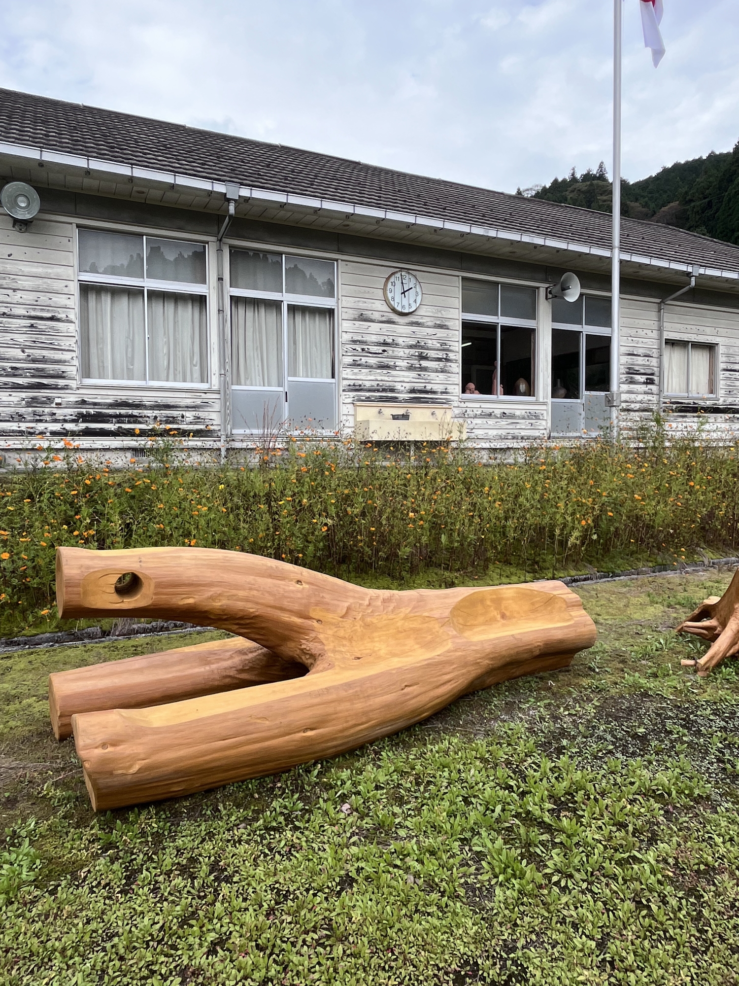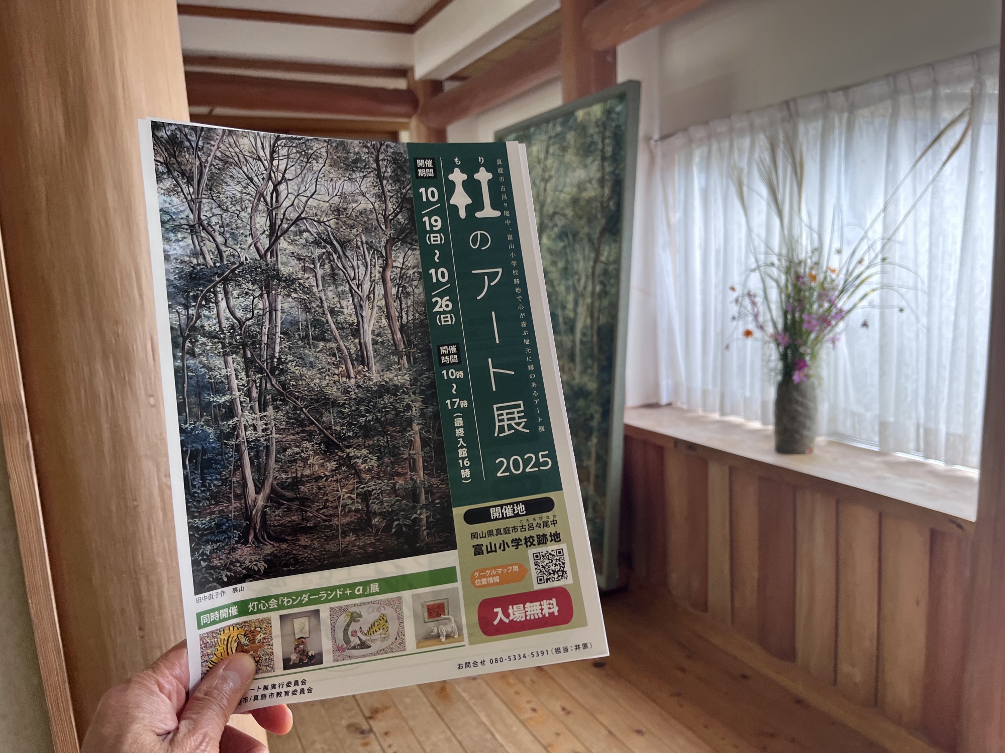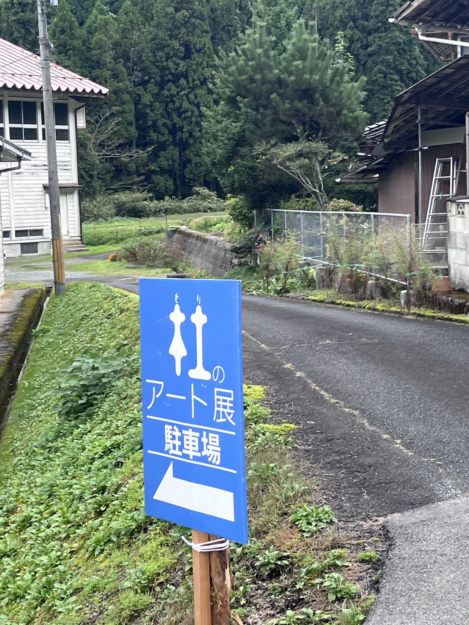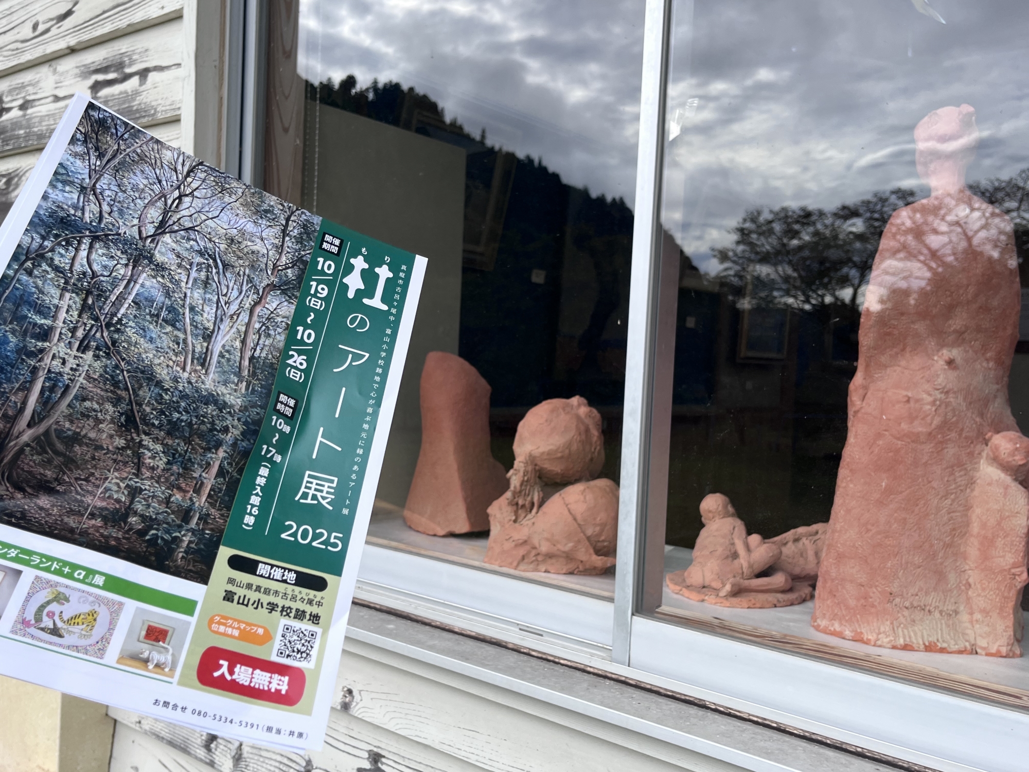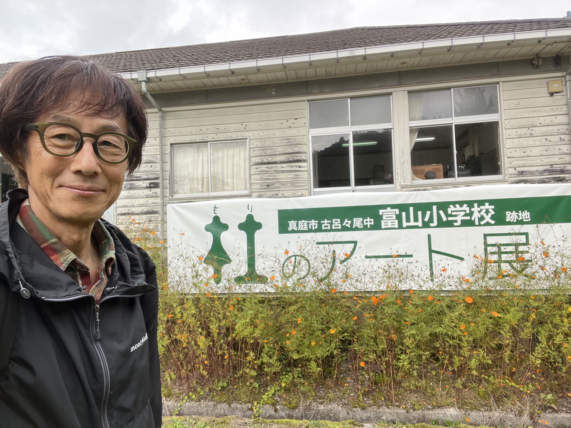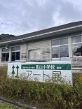 当初予定は、N美術館からカフェAのつもりだったのですが、そういえば、杜のアート展が、古呂々尾中の富山小学校跡でやってたよなぁって、あっ、今日からっていうので、行先変更!!