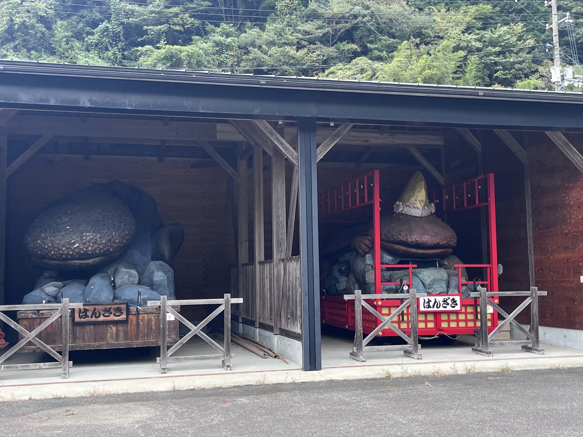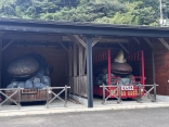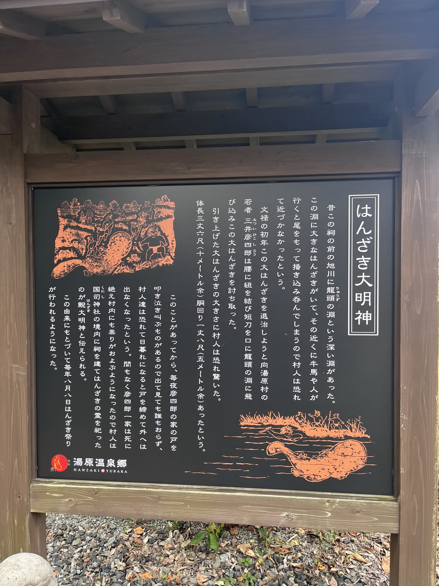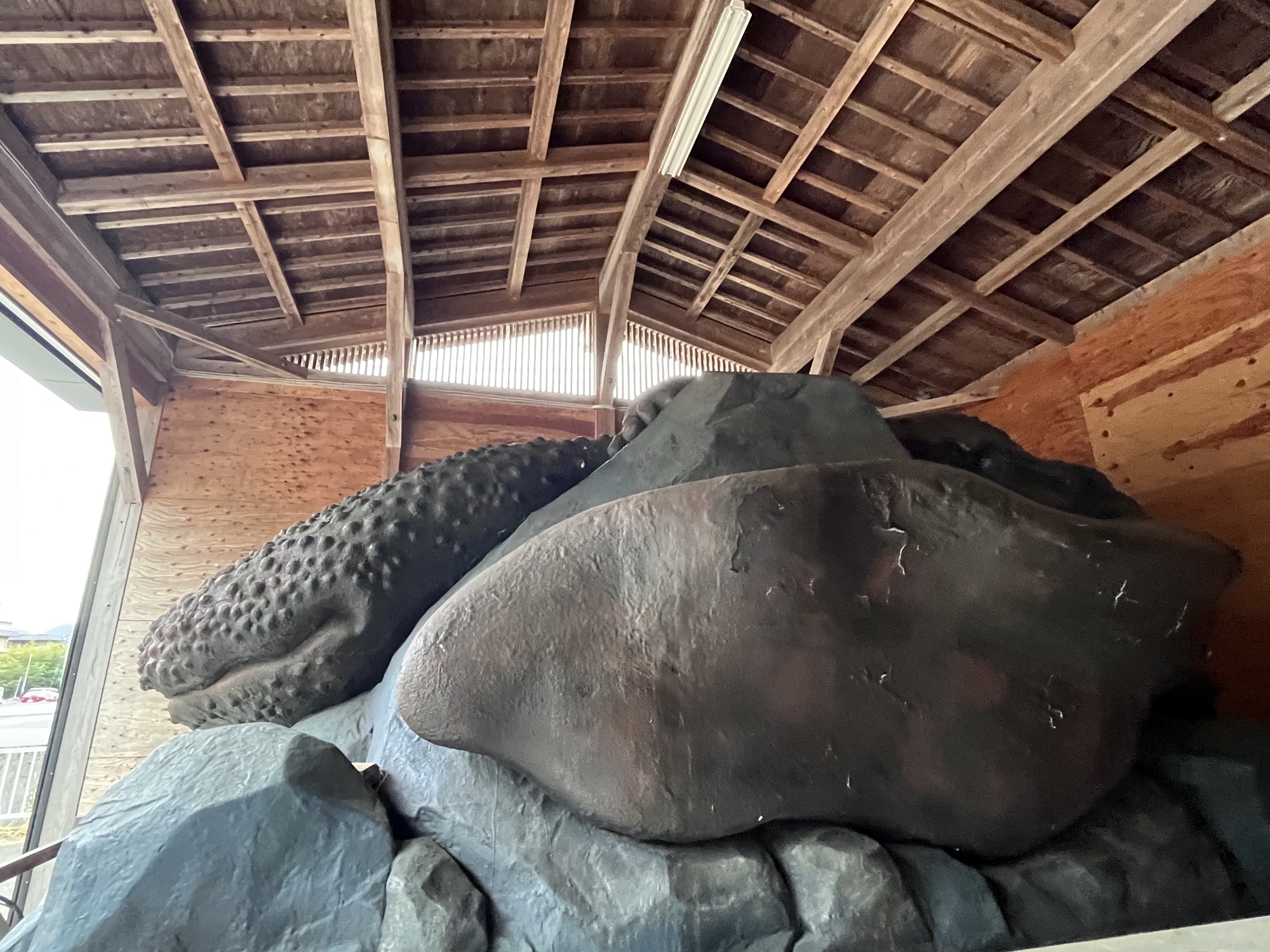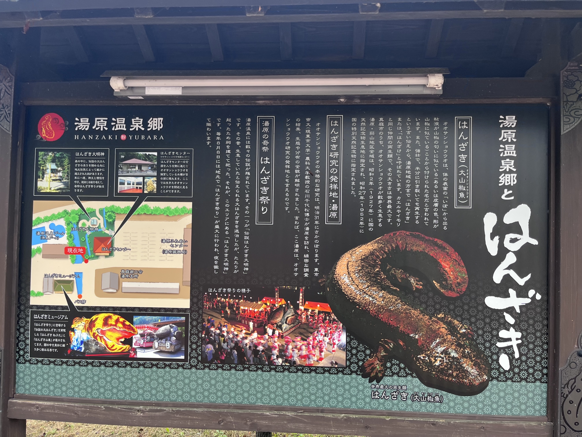 津山から戻って湯原図書館へ.向かいは鯢(ハンザキ=オオサンショウウオ)大明神.