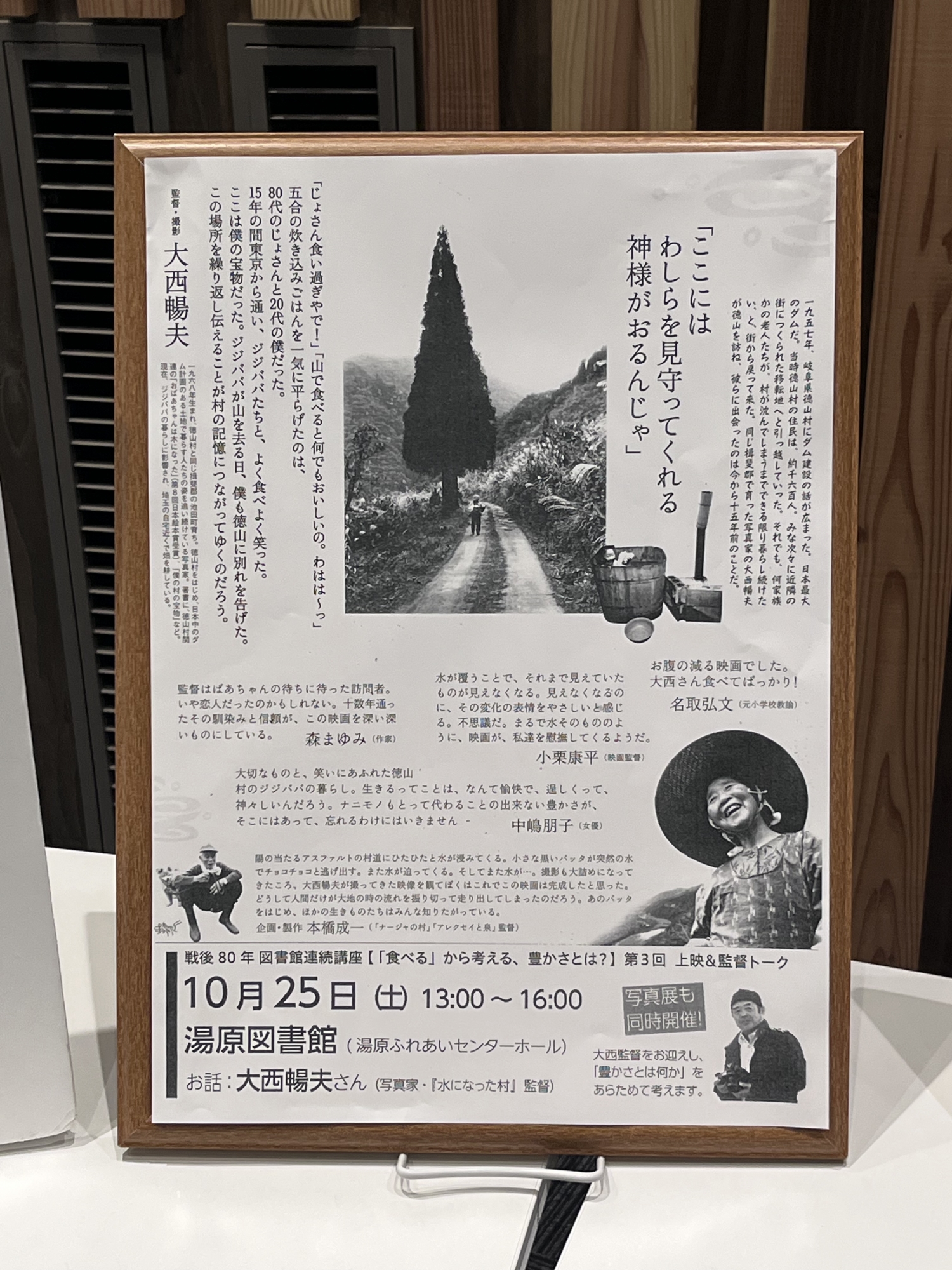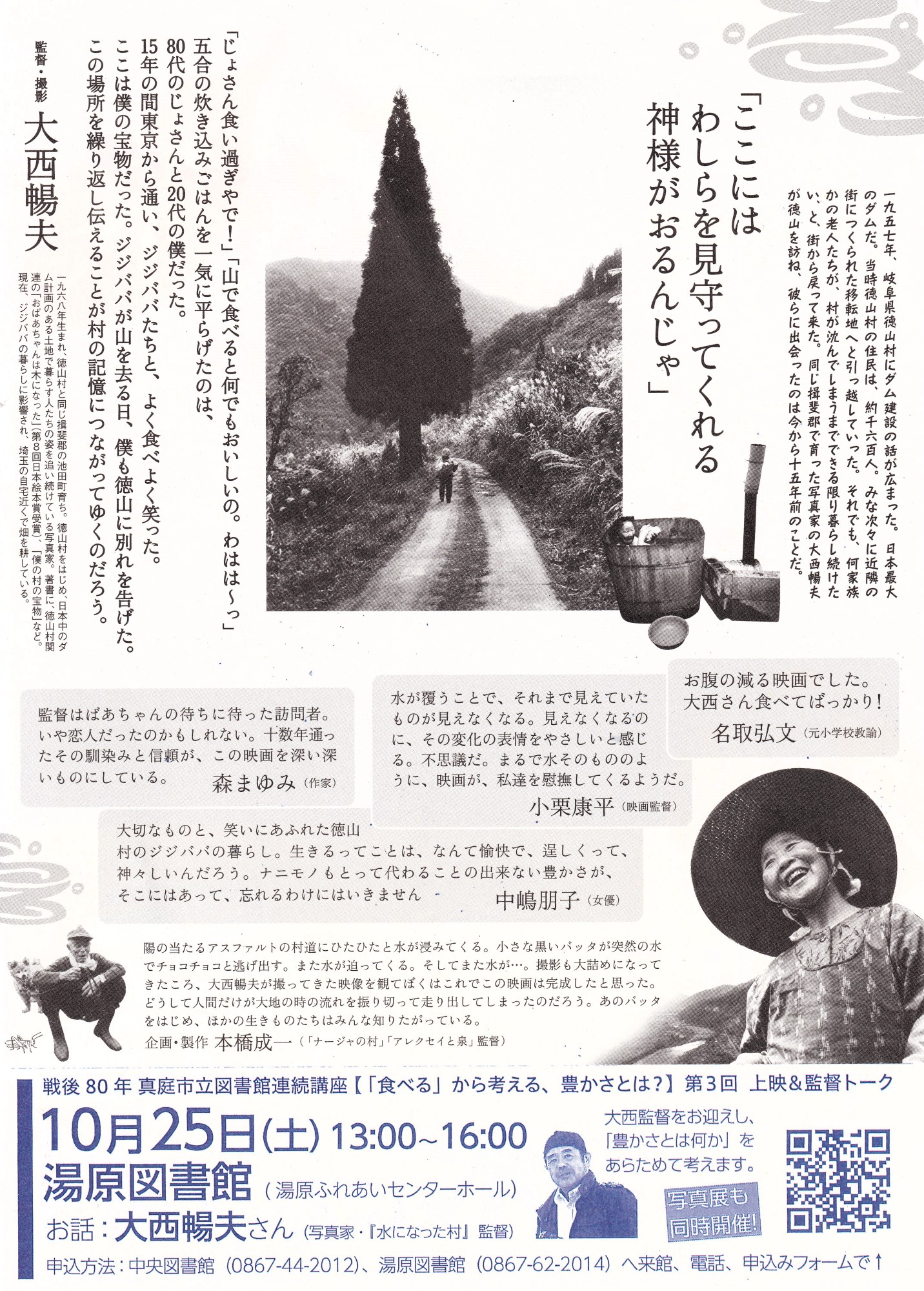 大西暢夫監督作品「水になった村」の上映会と共に、大西監督のトークショー.真庭市図書館連続講座【「食べる」から考える、豊かさとは?】の第3回/最終回.岐阜県徳山村が建設計画が始まって以来50年でダムが完成したとの事で、しかし、最後まで村て生活し続けた数人の「ジジババ」たちの生き様、食べ様を描いた作品で、昔と現代でもなく、素朴と華美でもなく、脱ダムという問題でもなく、こういう生き方の記録として。それでも、失いたくない心かも知れません.