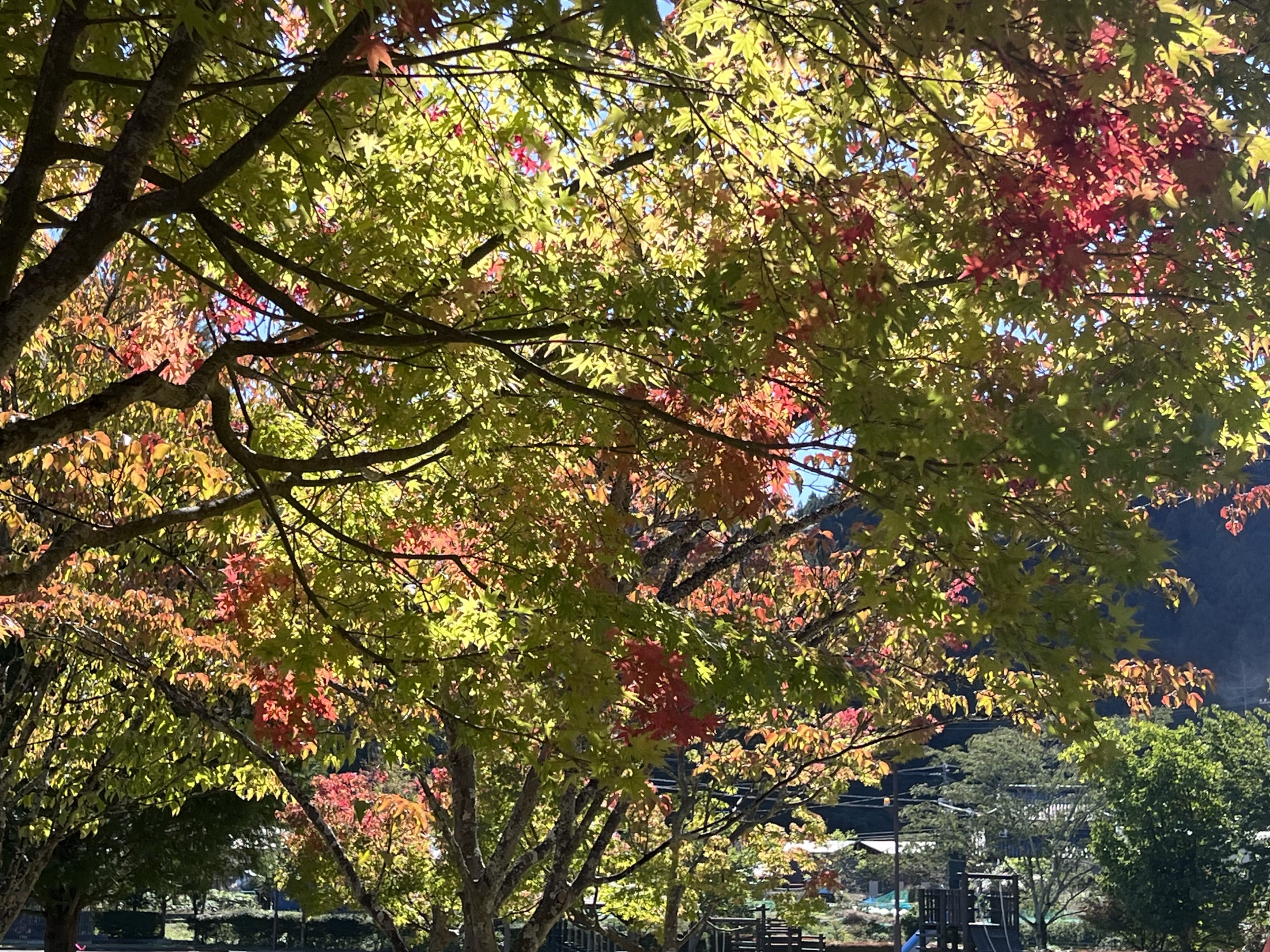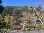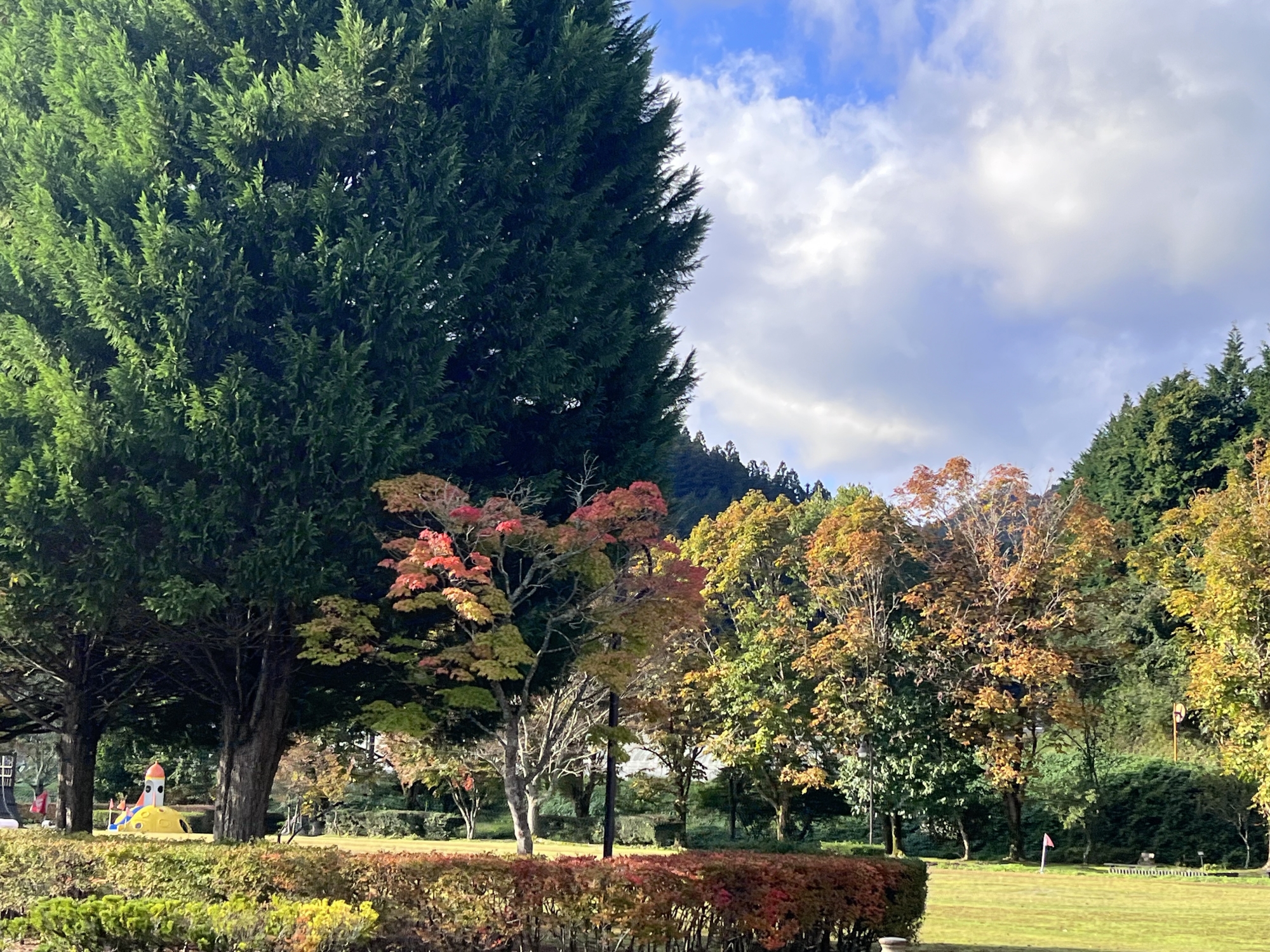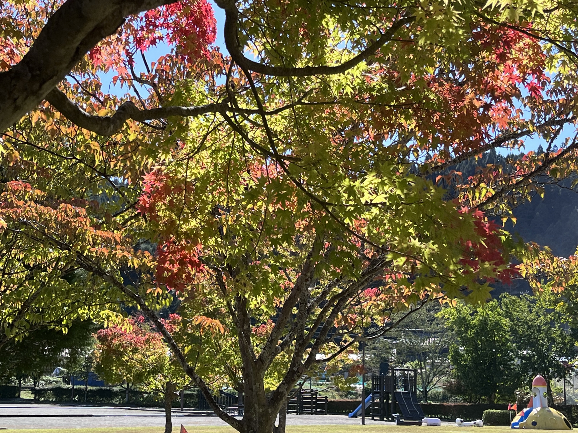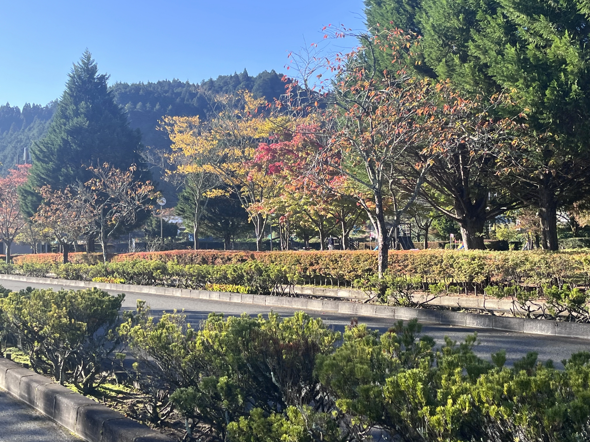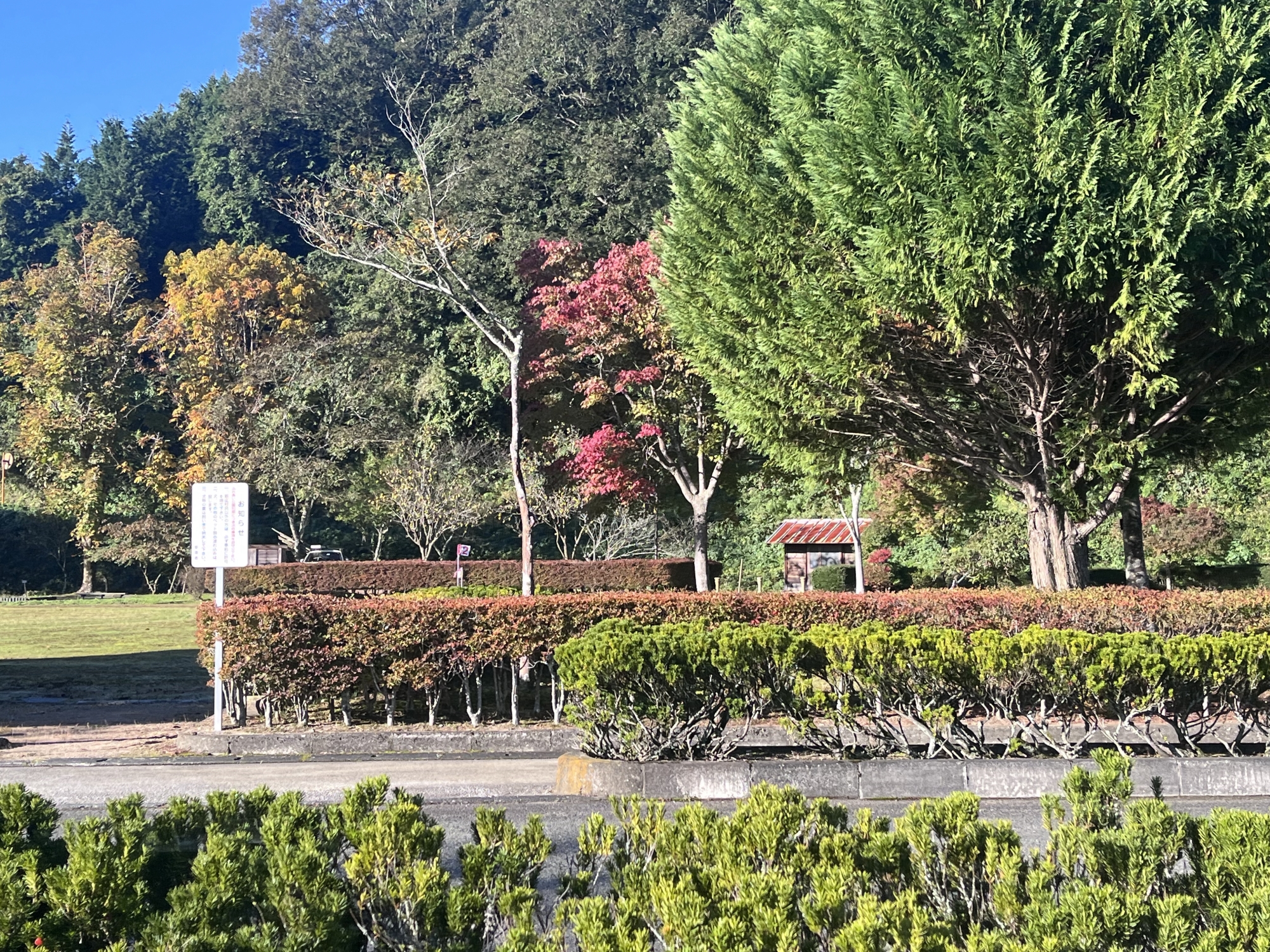 朝は青空……ふれあい公園も紅葉のコントラストが良い感じ.