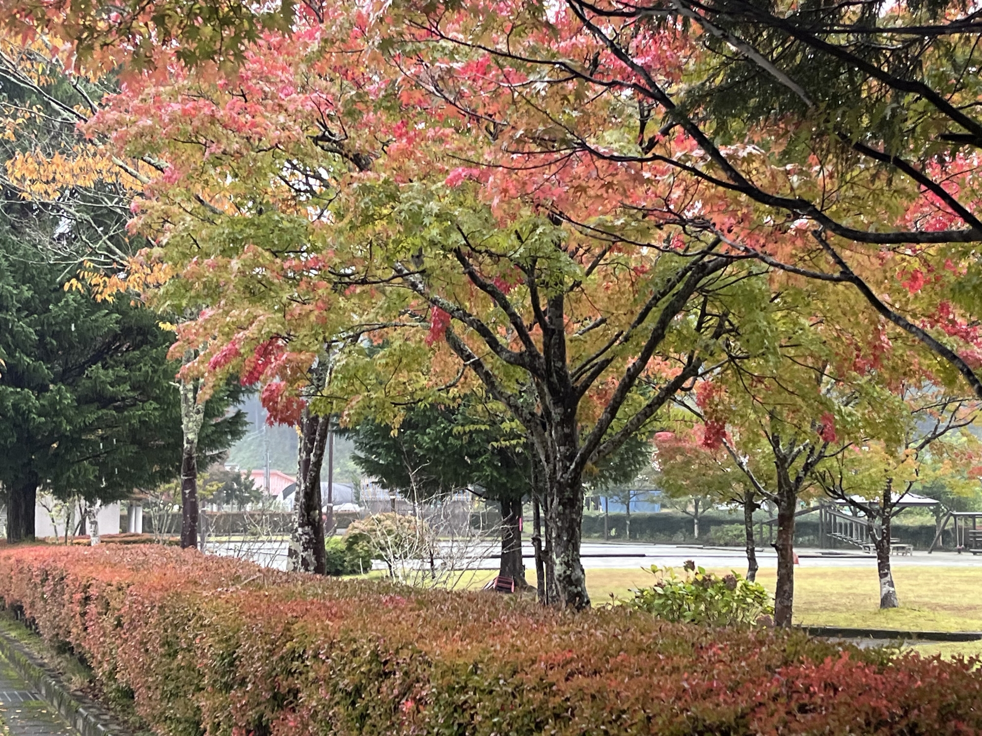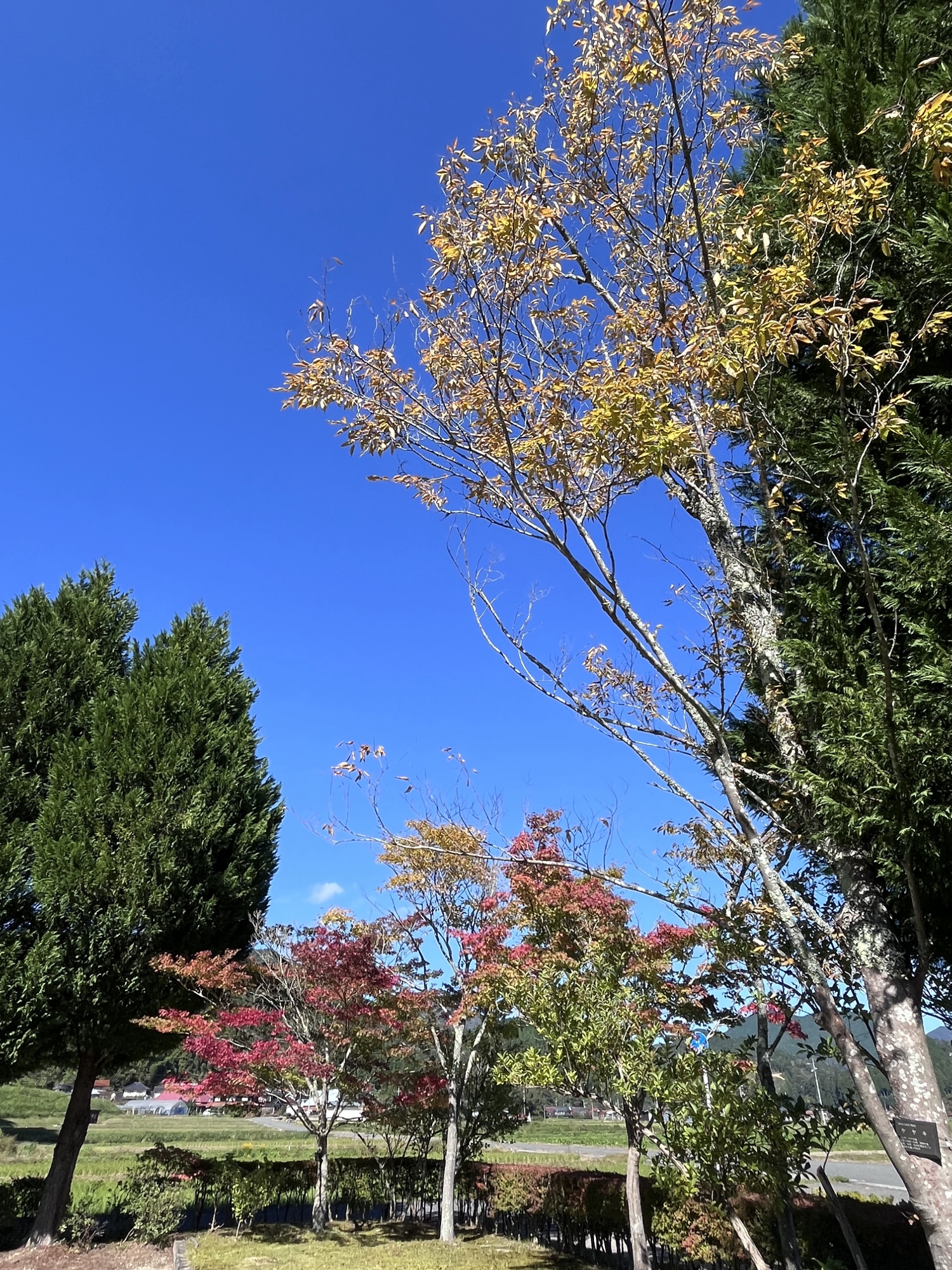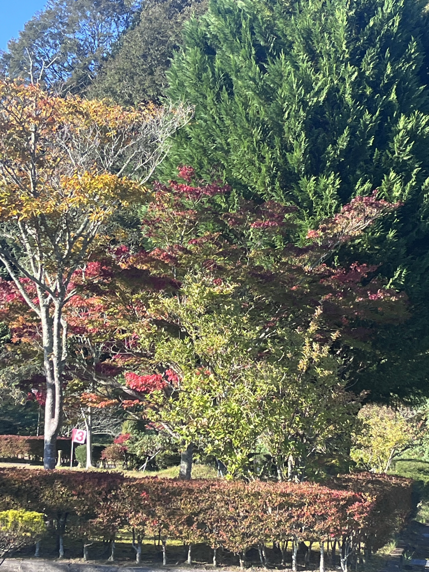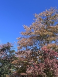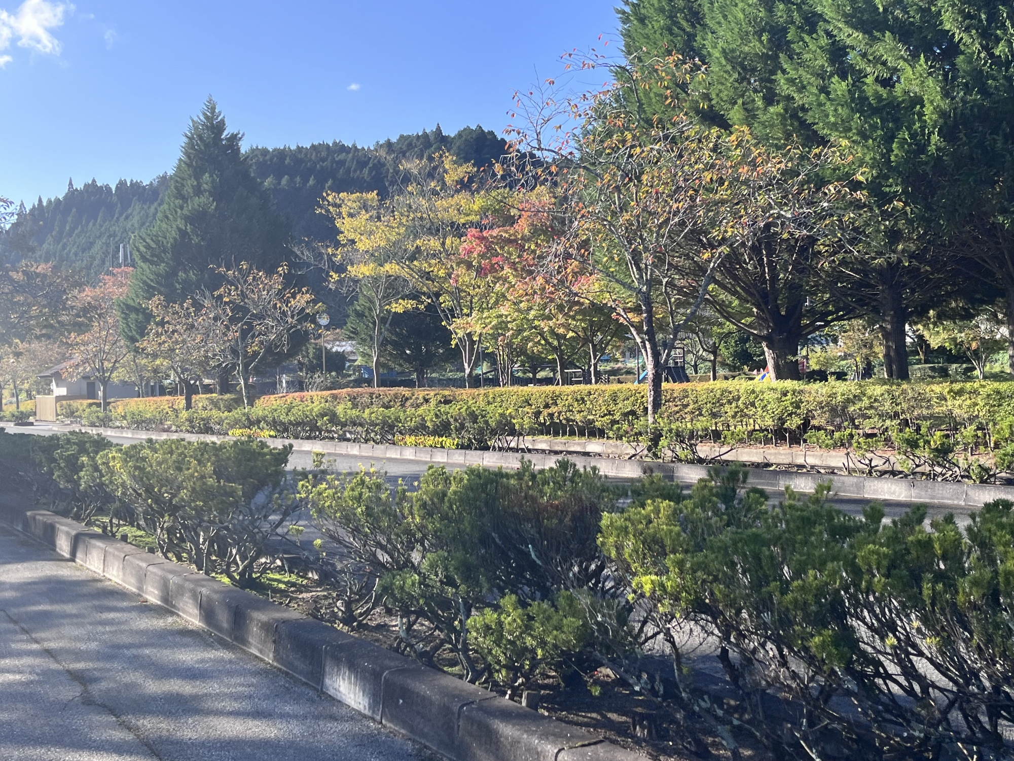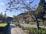 朝は青空……ふれあい公園も紅葉のコントラストが良い感じ.