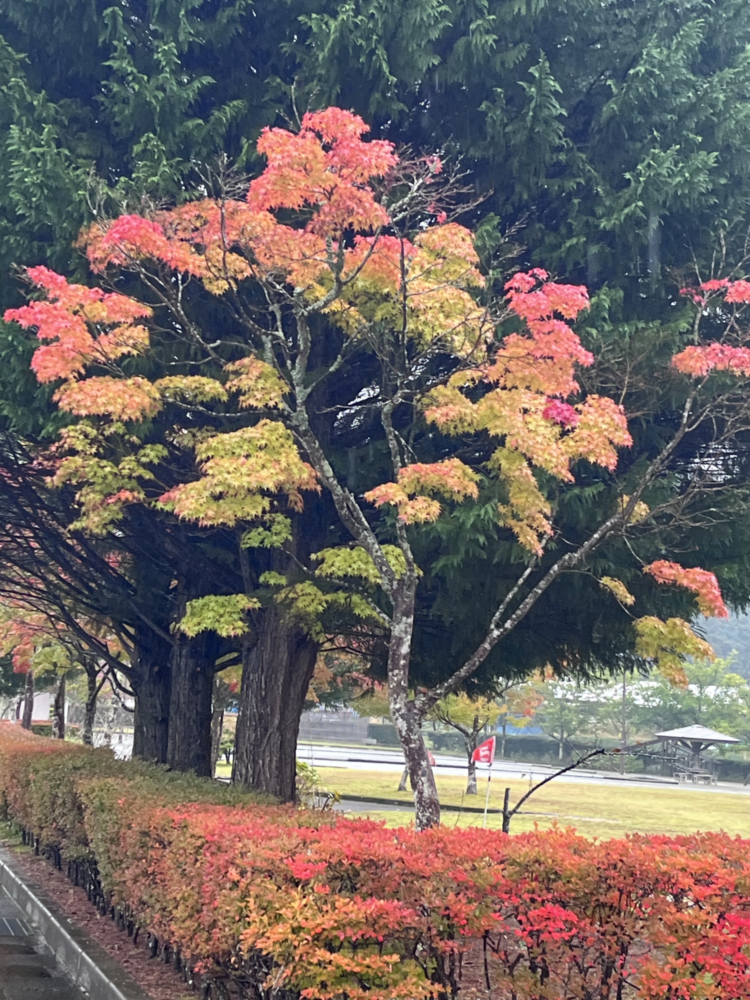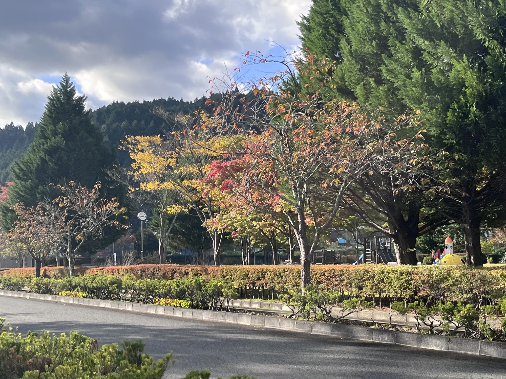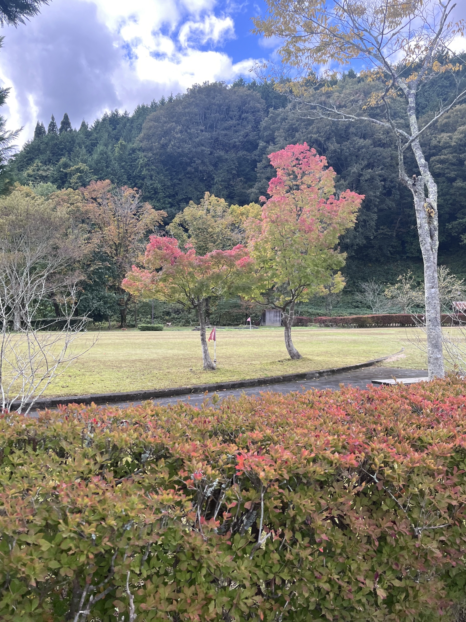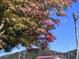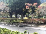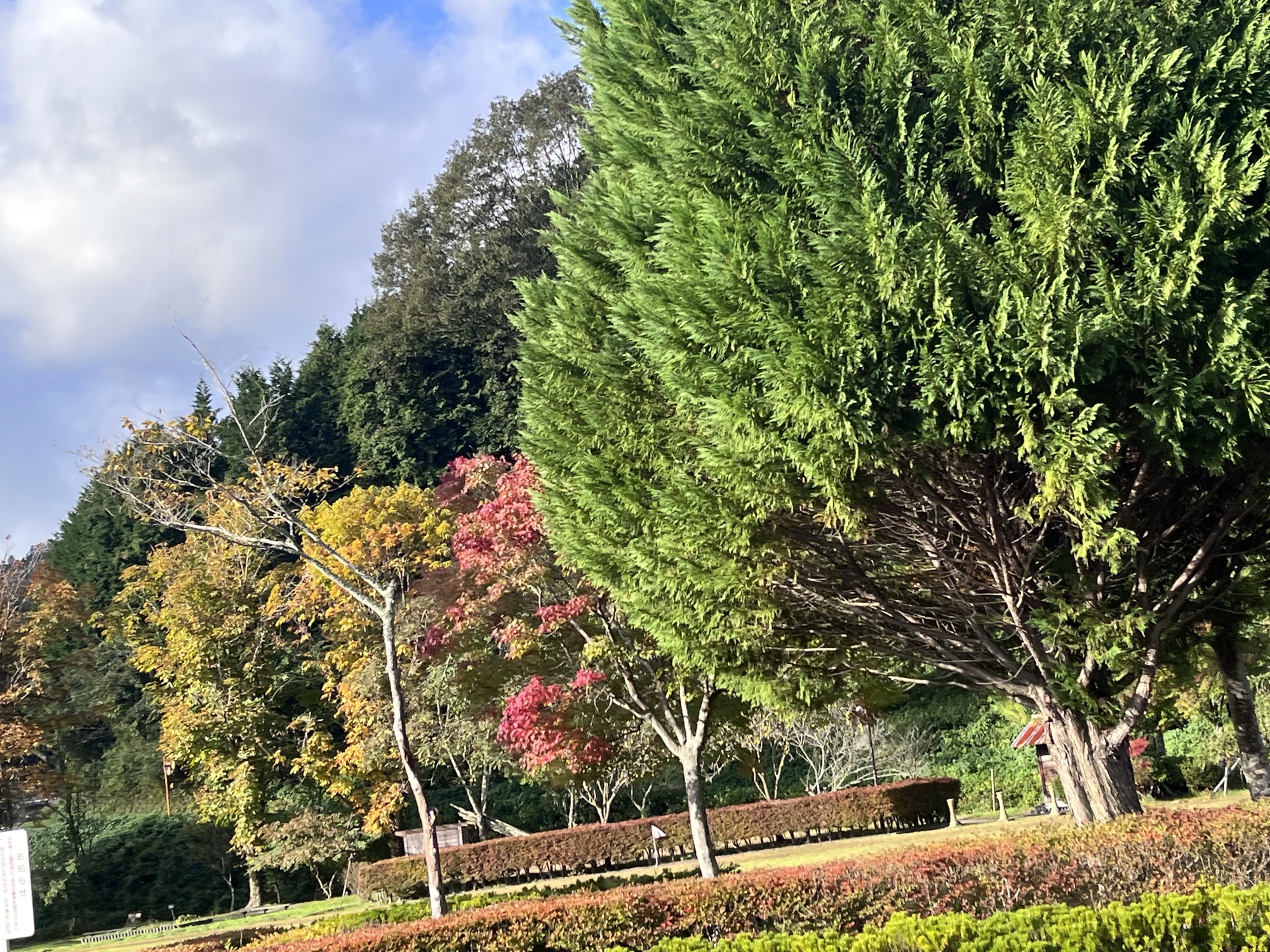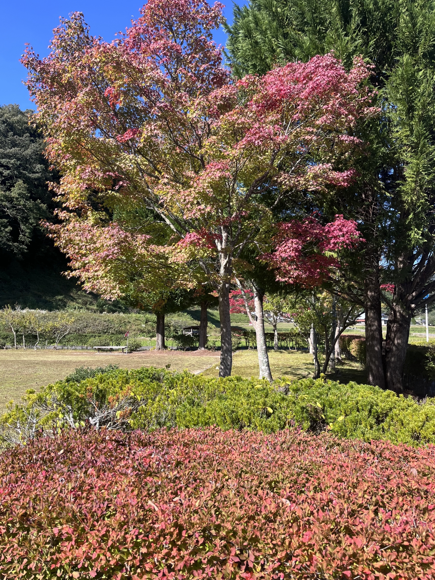 朝は青空……ふれあい公園も紅葉のコントラストが良い感じ.