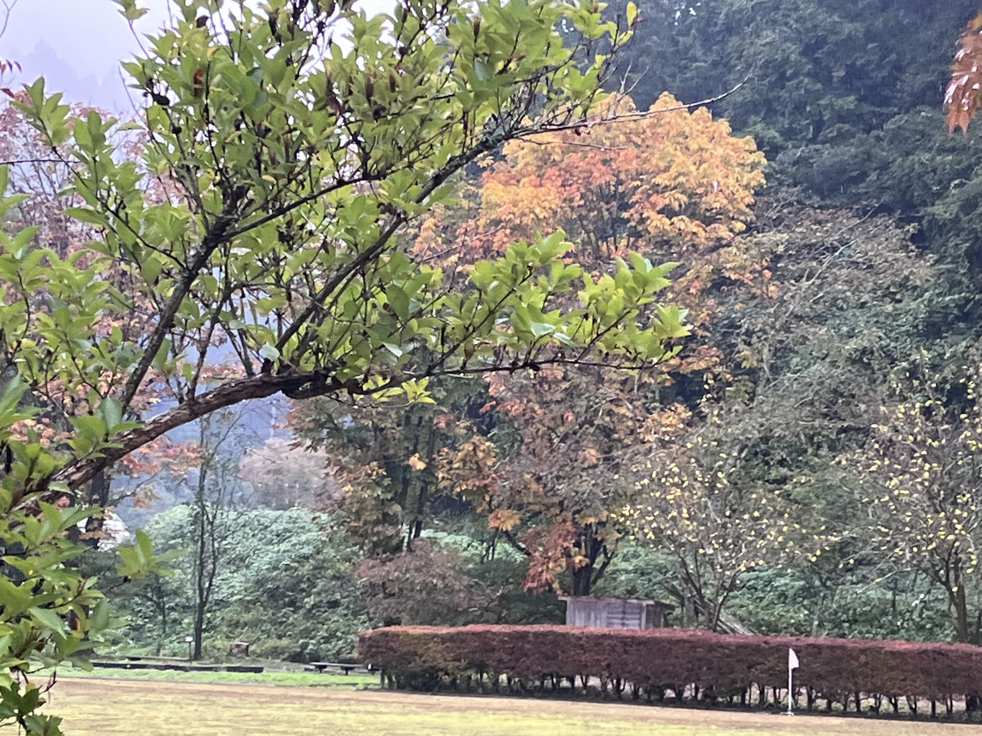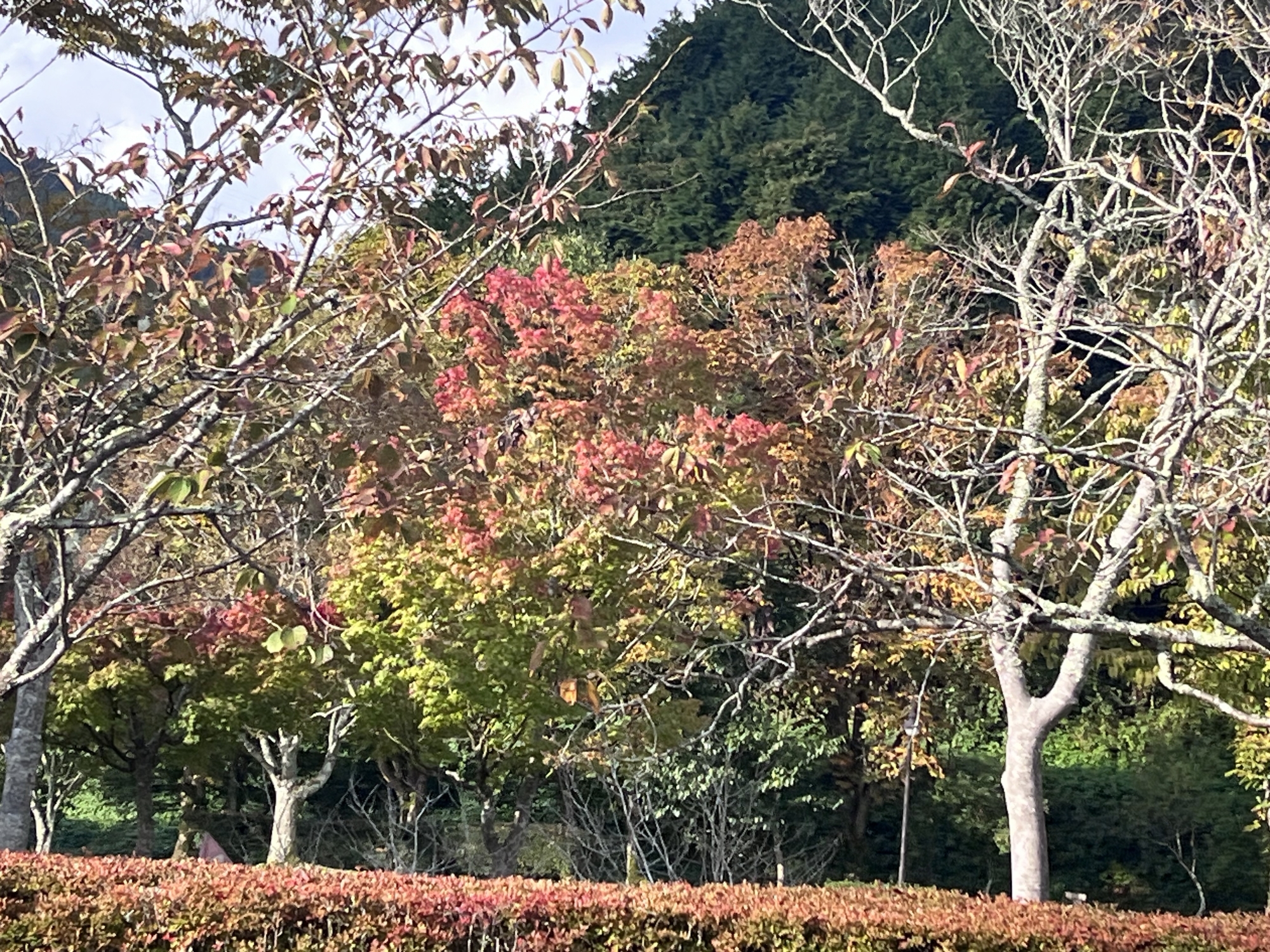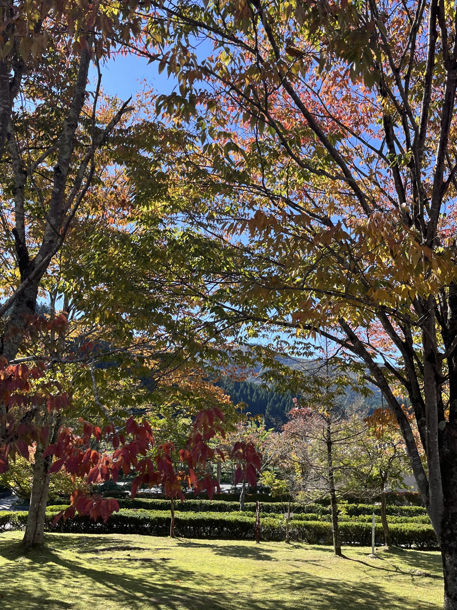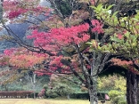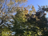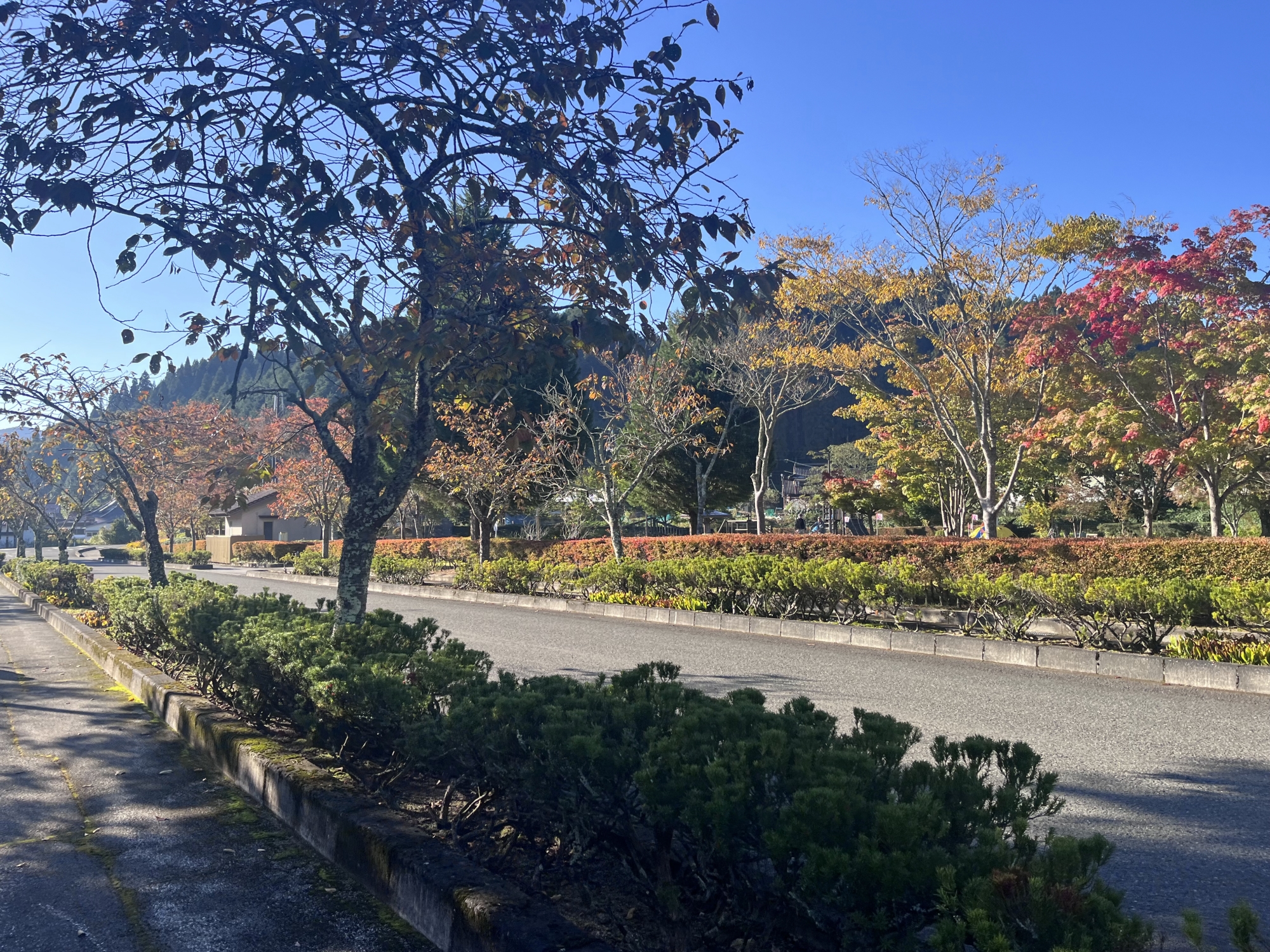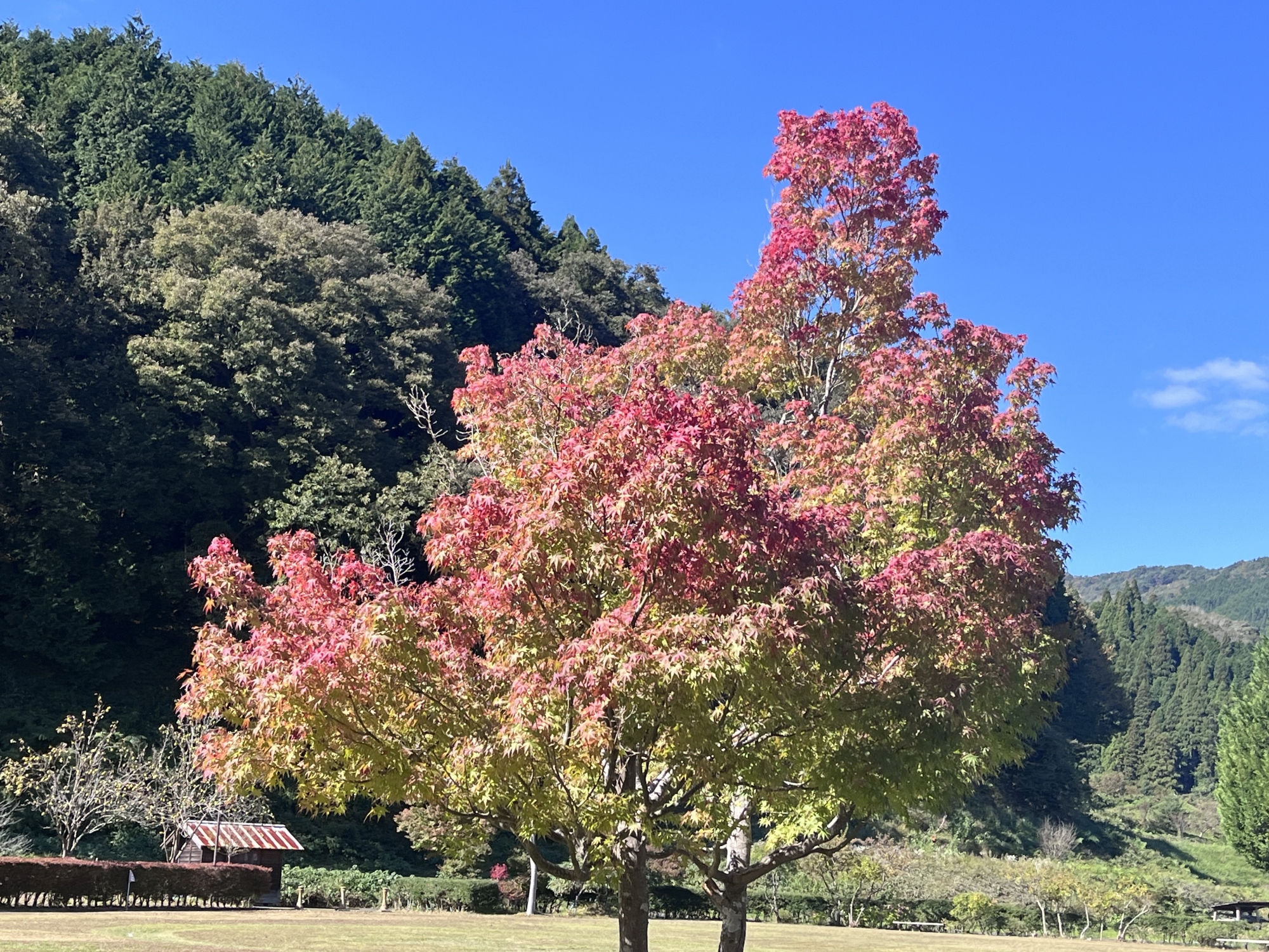 朝は青空……ふれあい公園も紅葉のコントラストが良い感じ.
