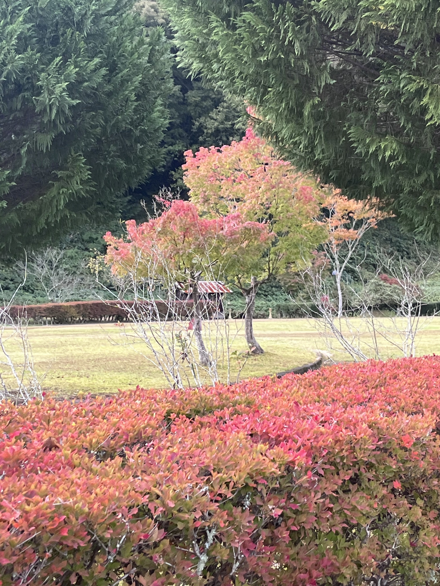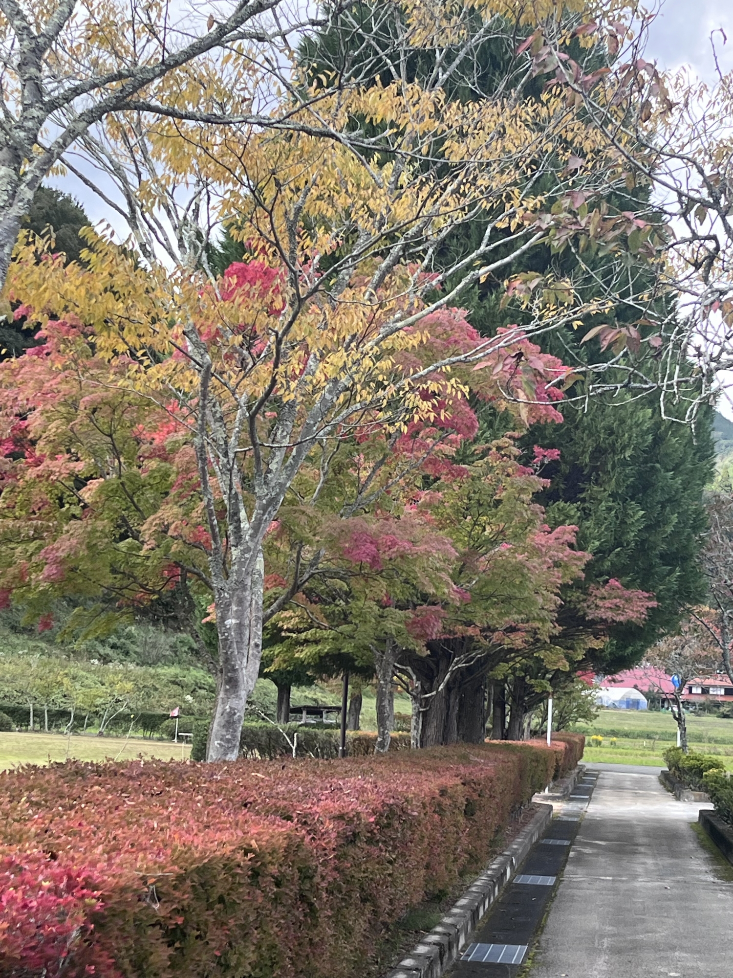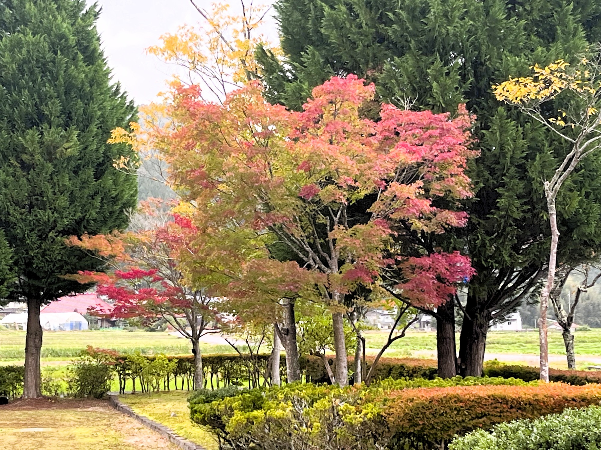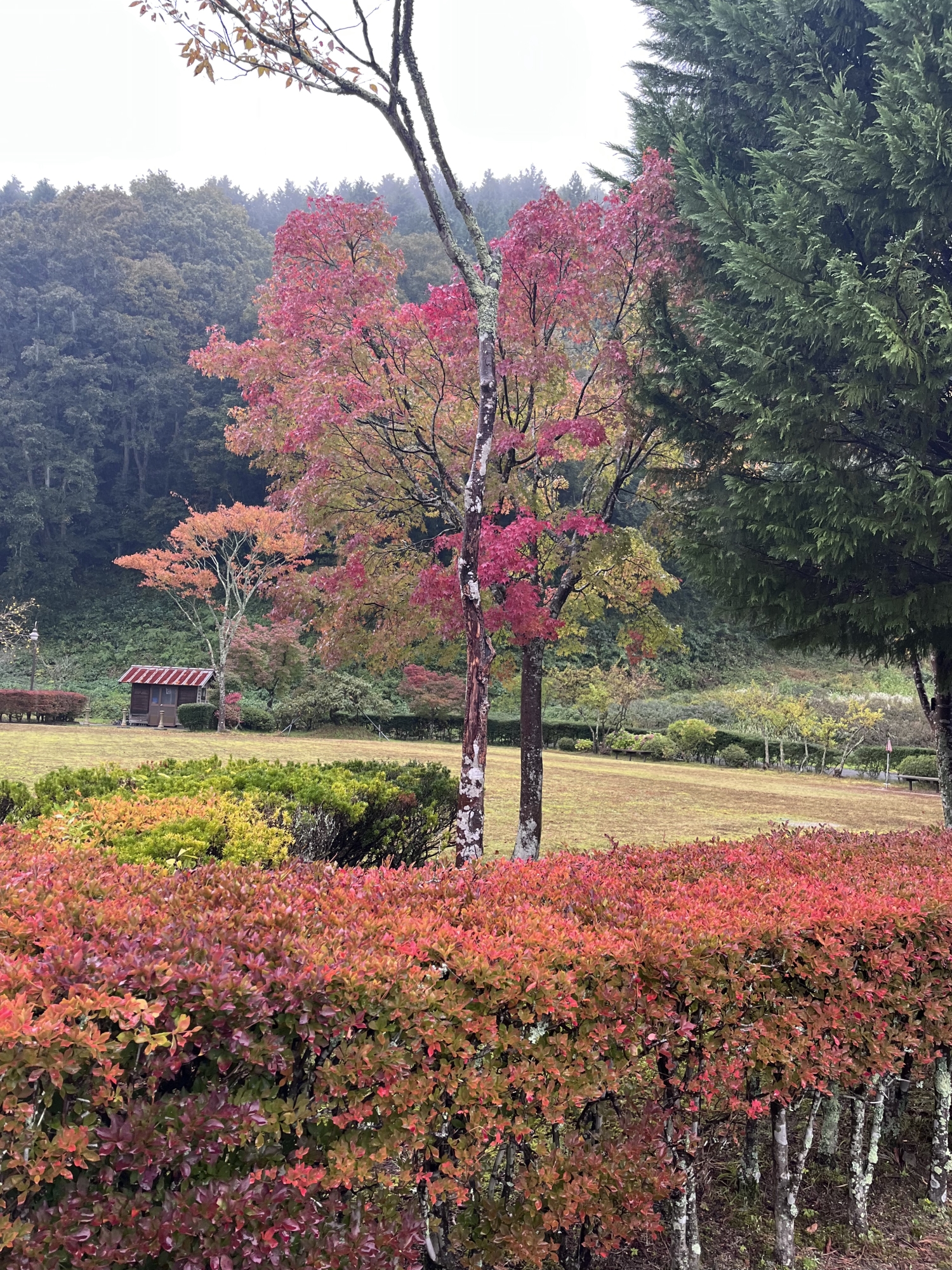 朝は青空……ふれあい公園も紅葉のコントラストが良い感じ.