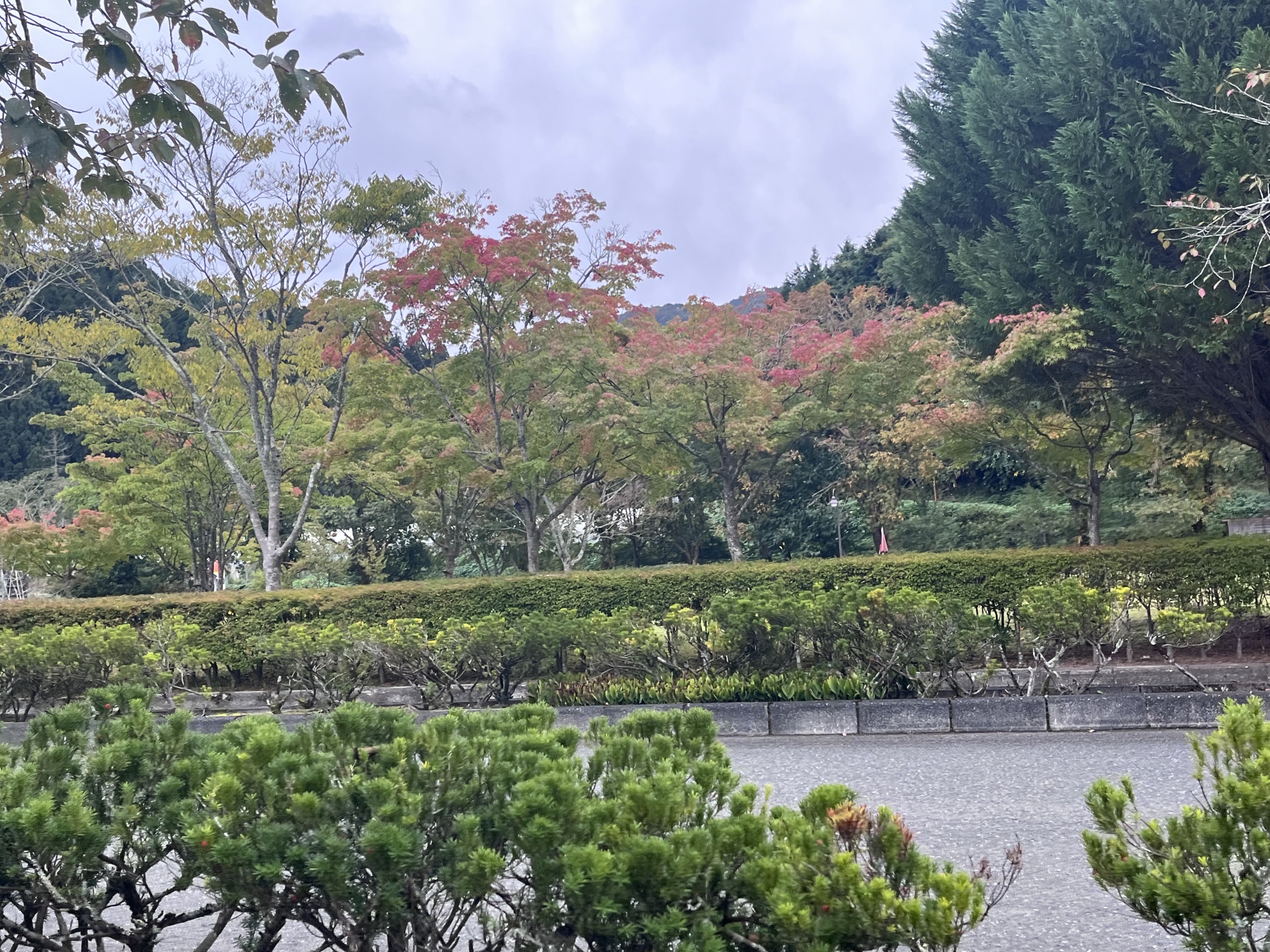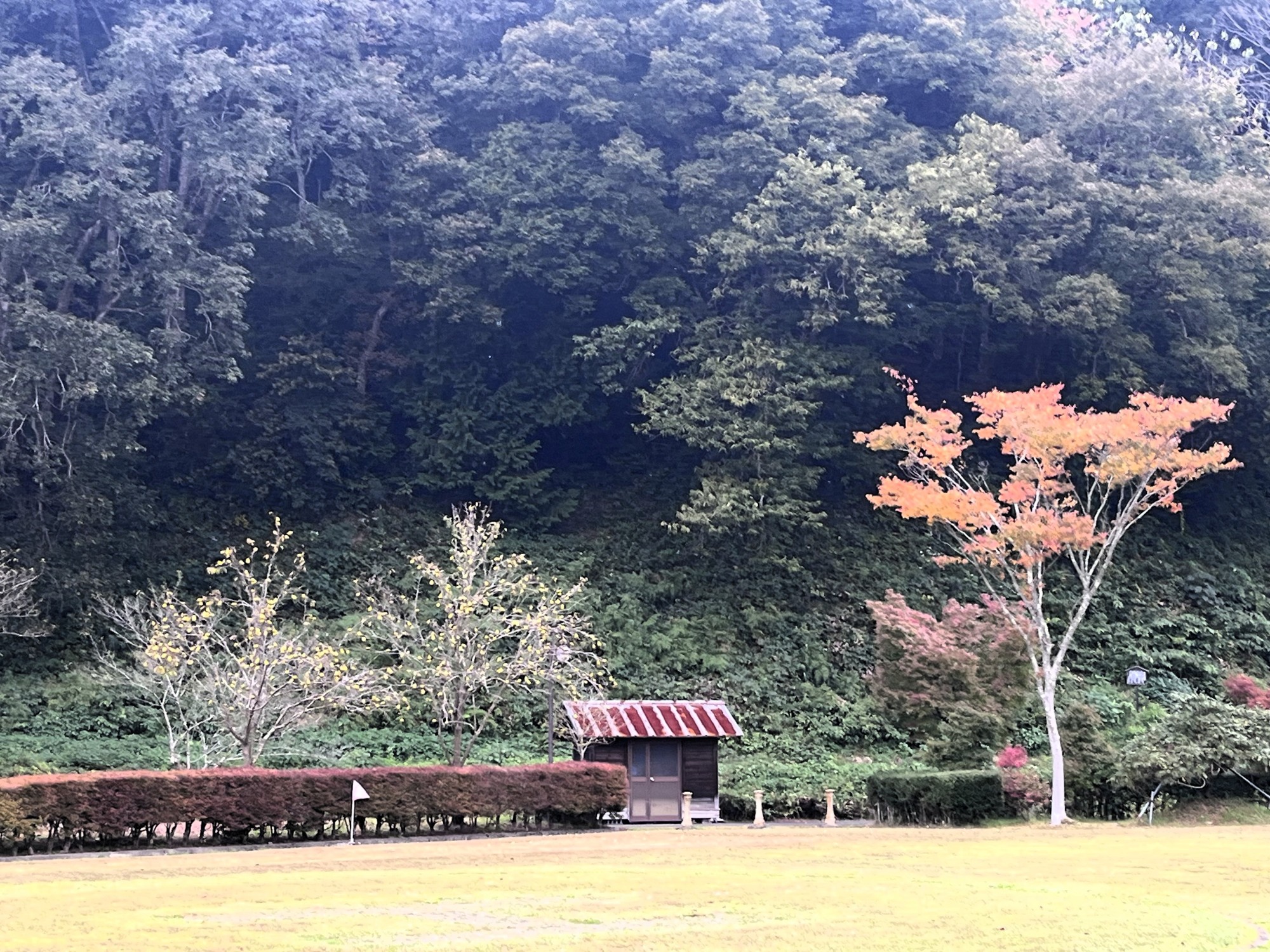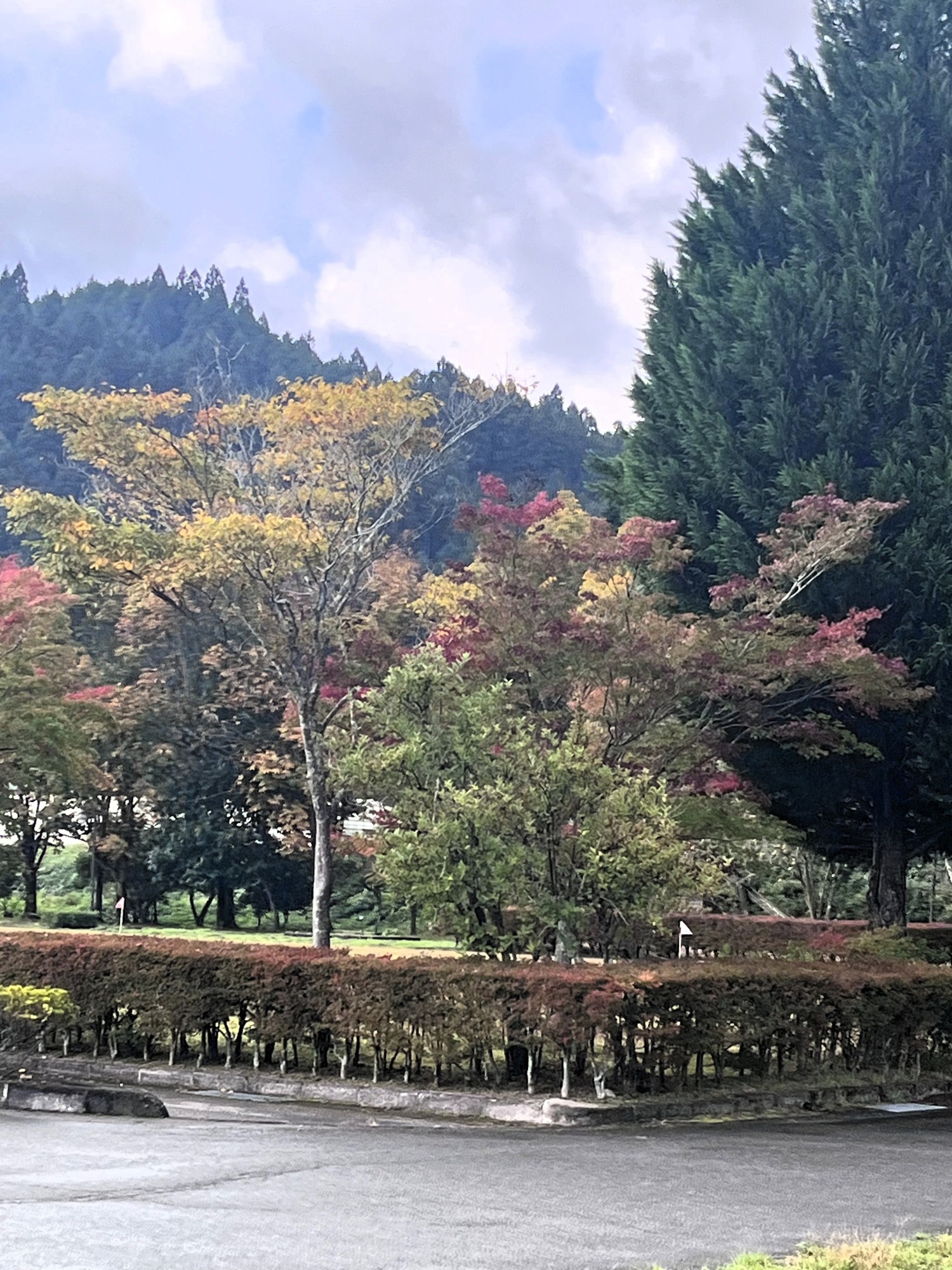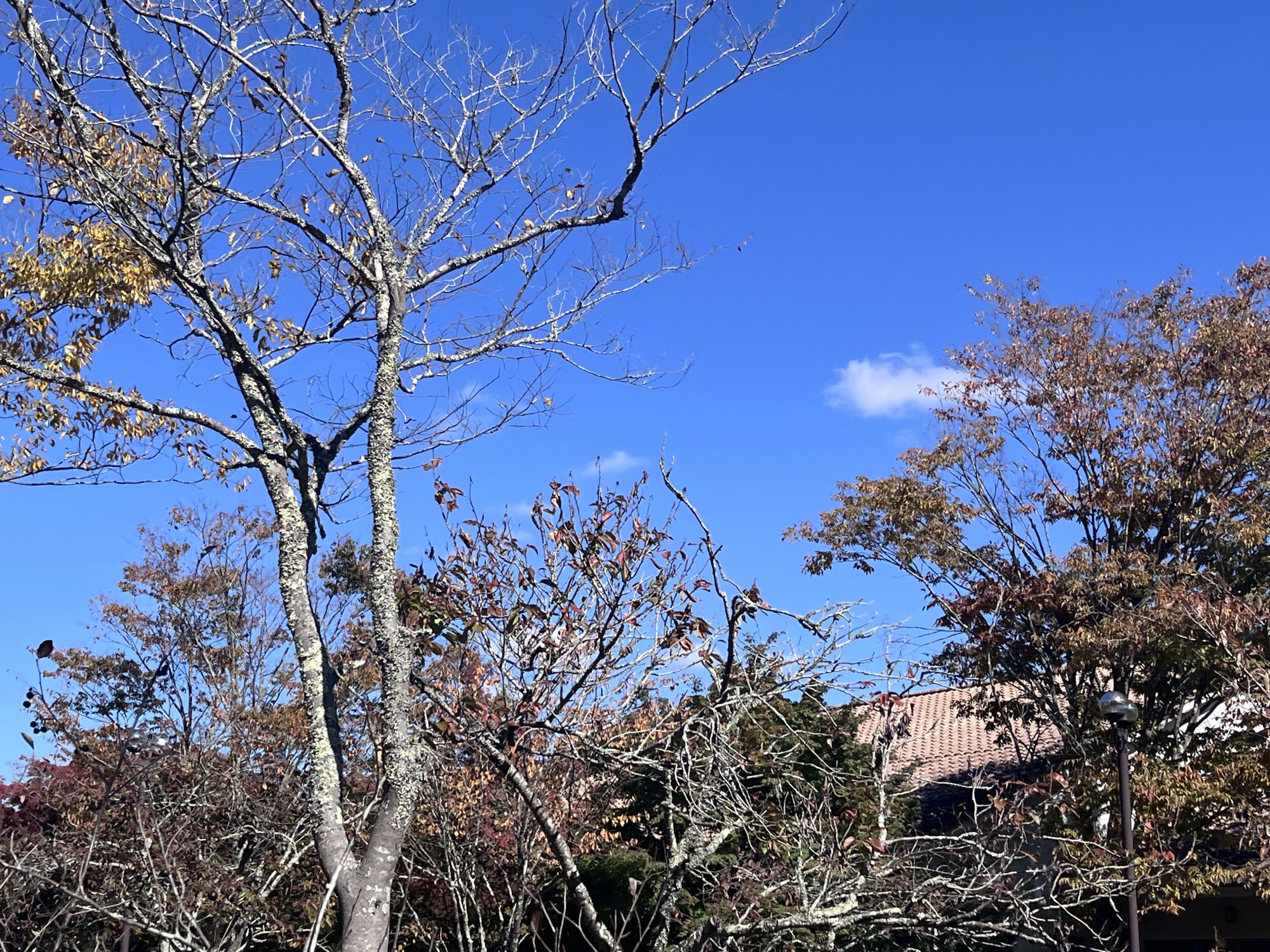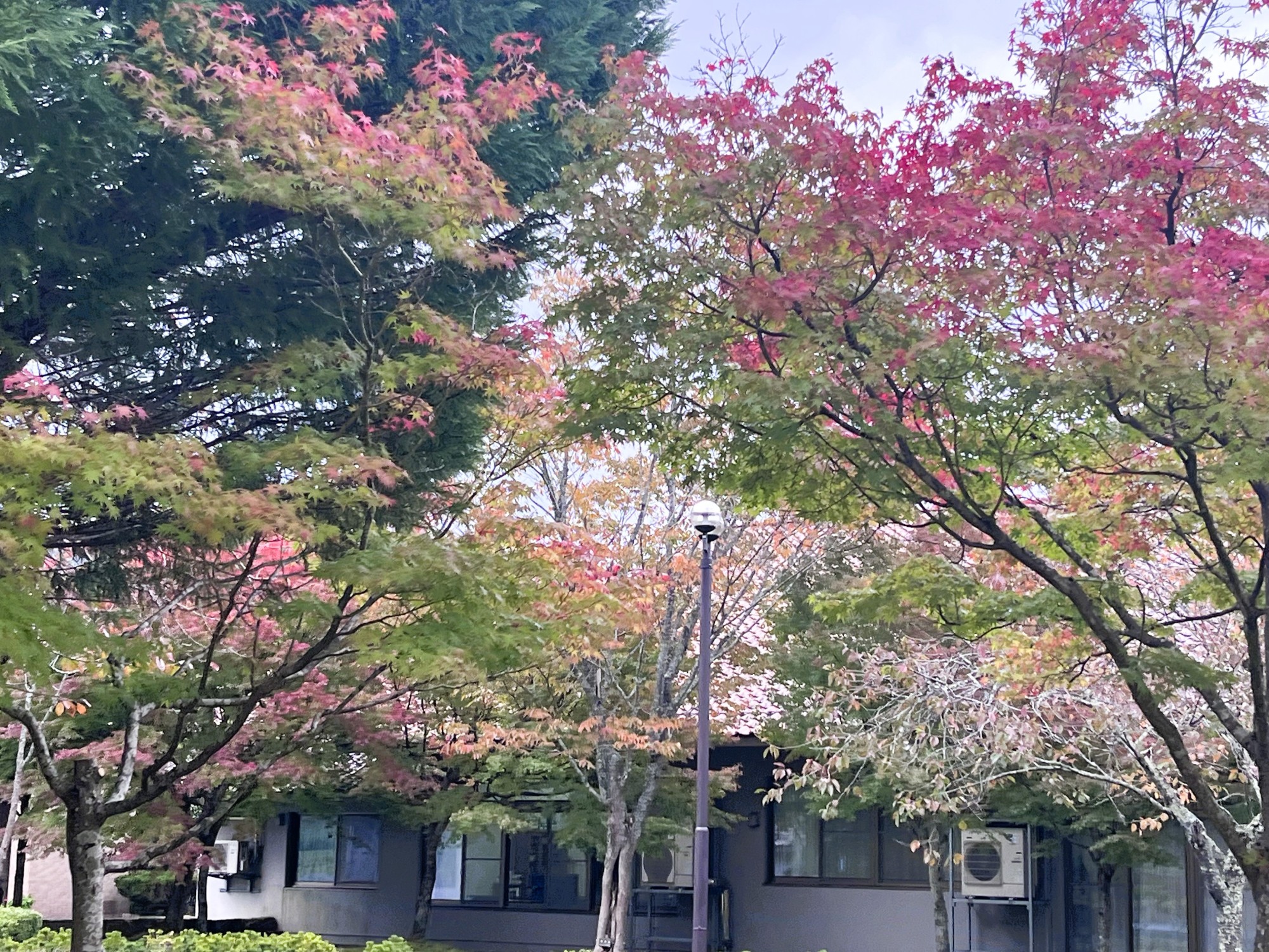 朝は青空……ふれあい公園も紅葉のコントラストが良い感じ.