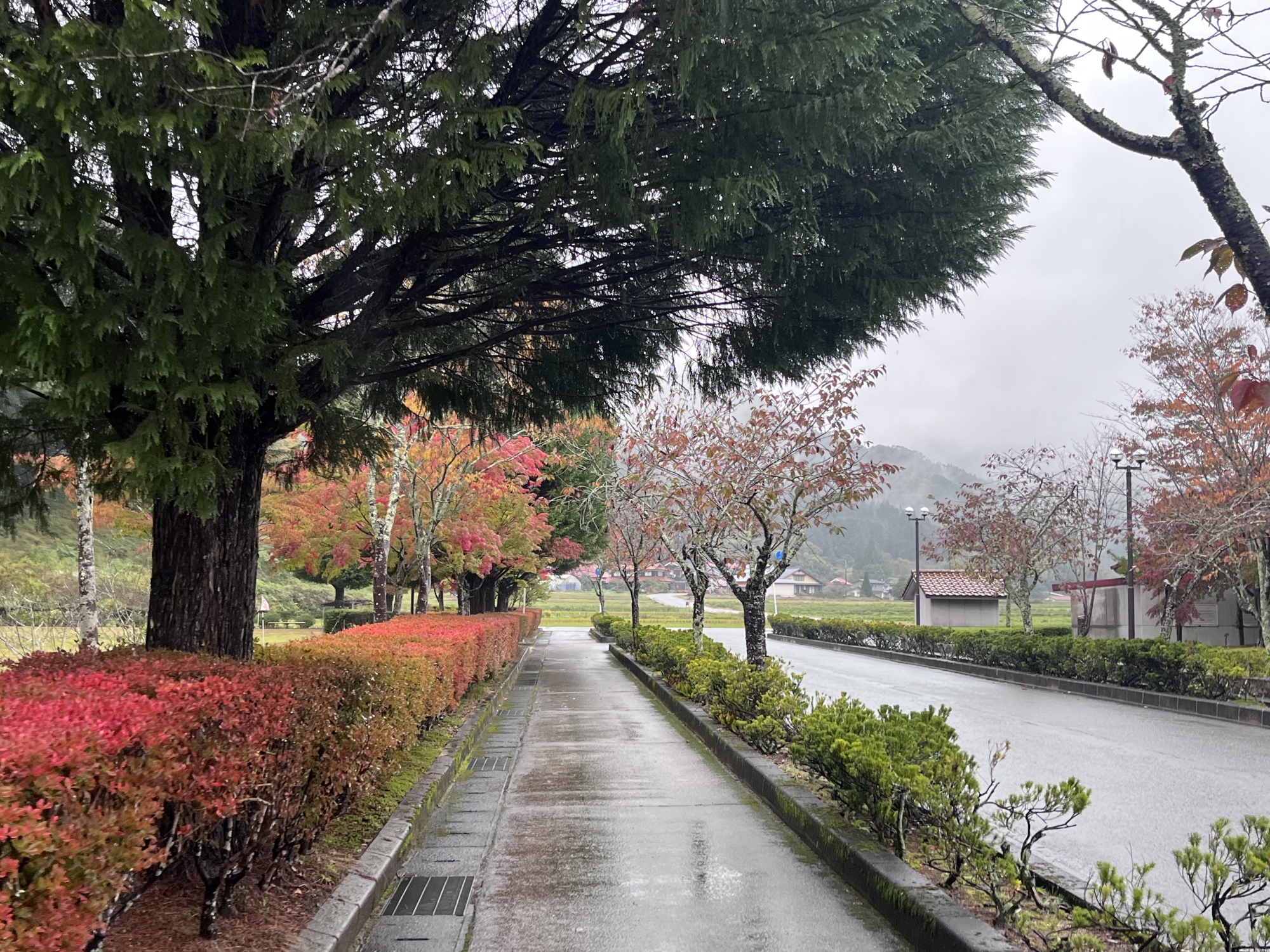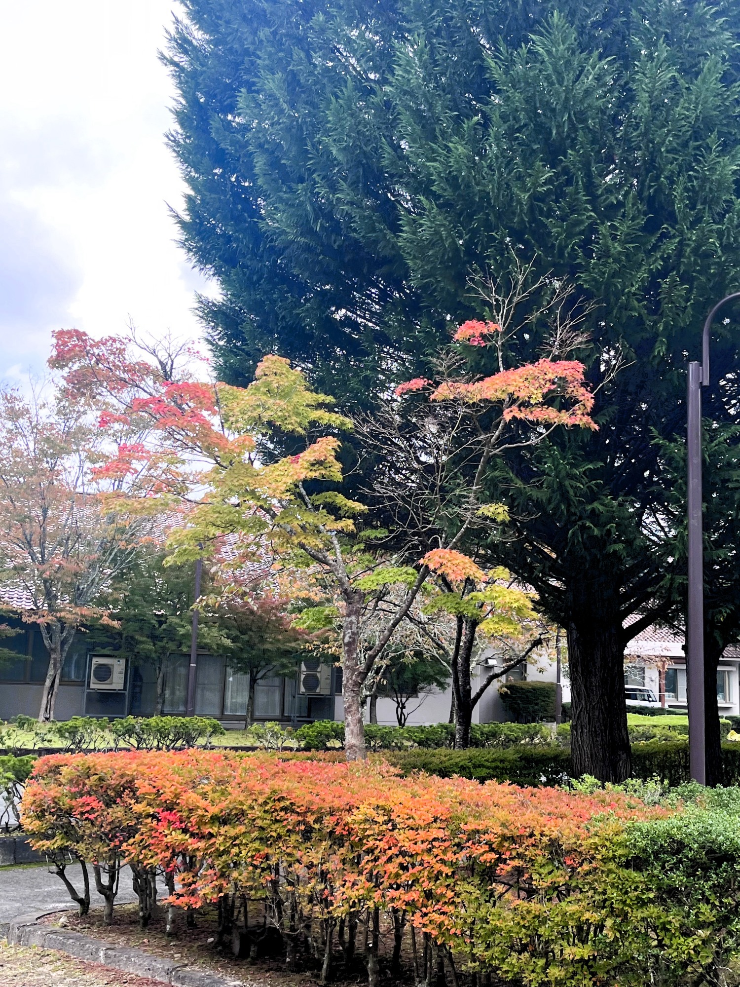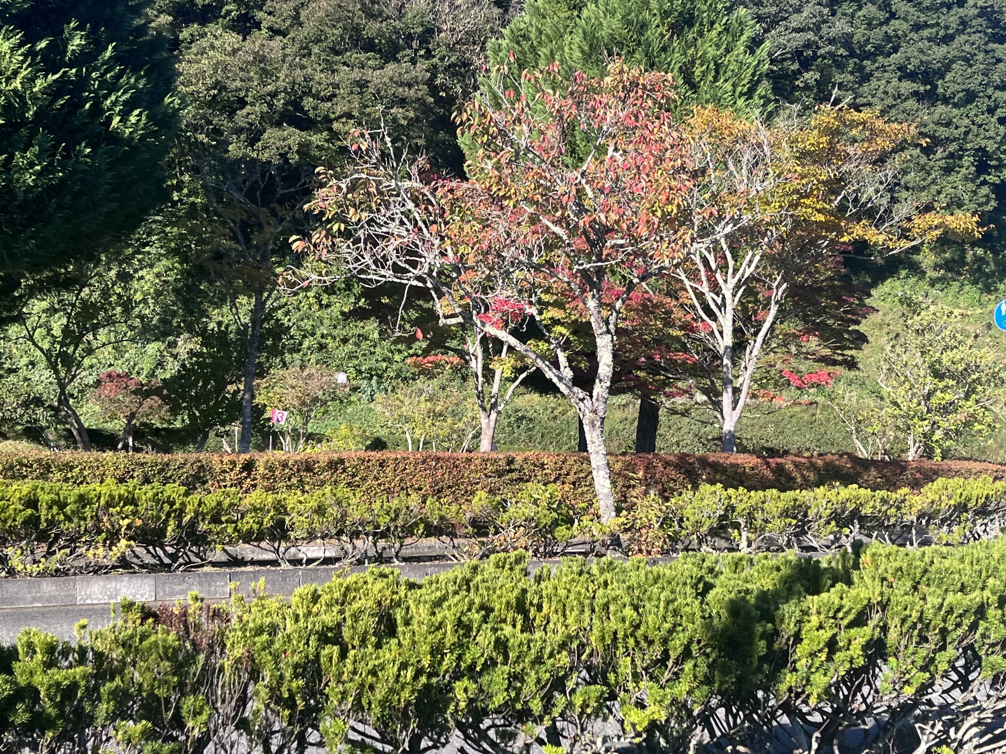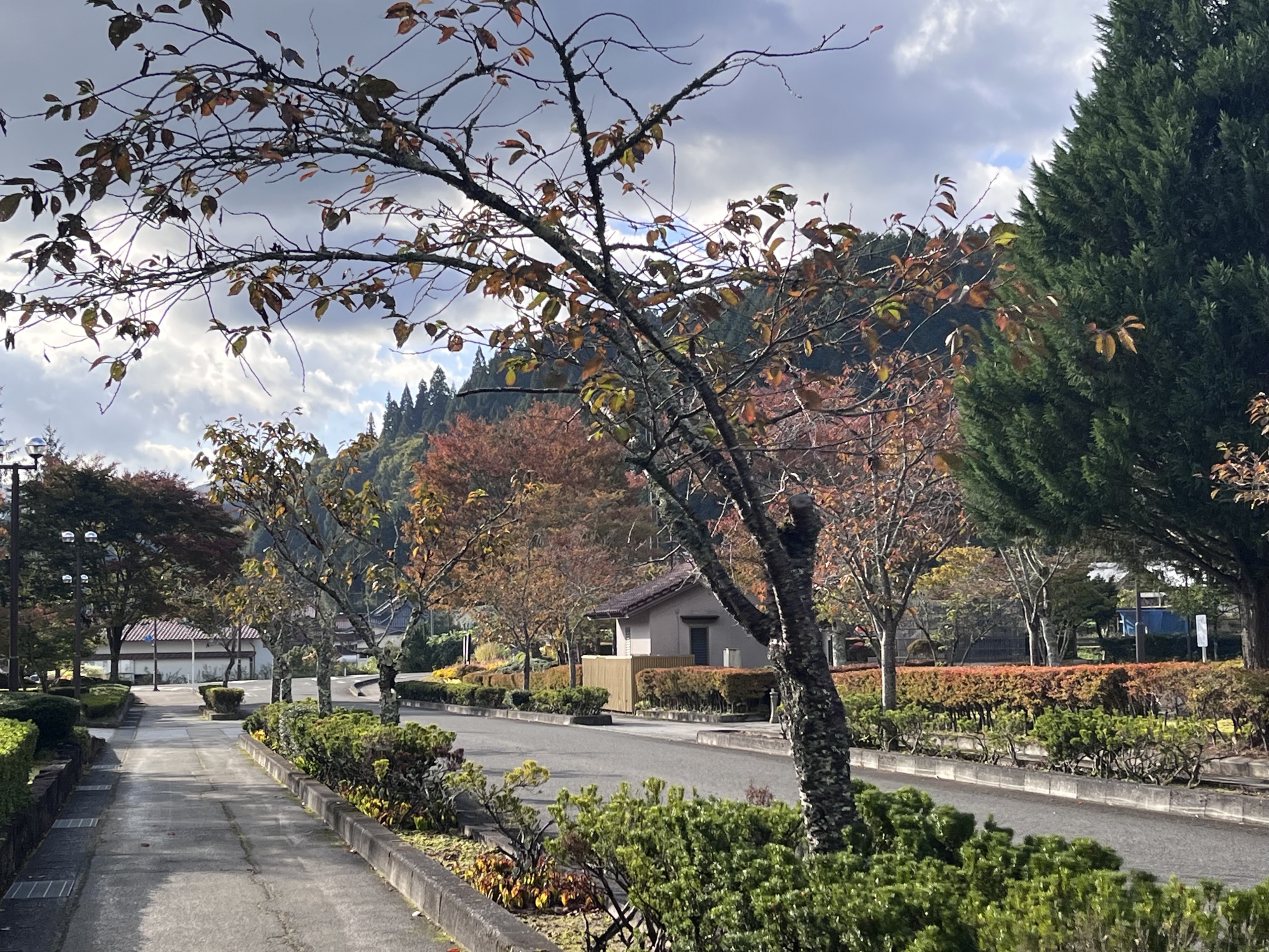 朝は青空……ふれあい公園も紅葉のコントラストが良い感じ.