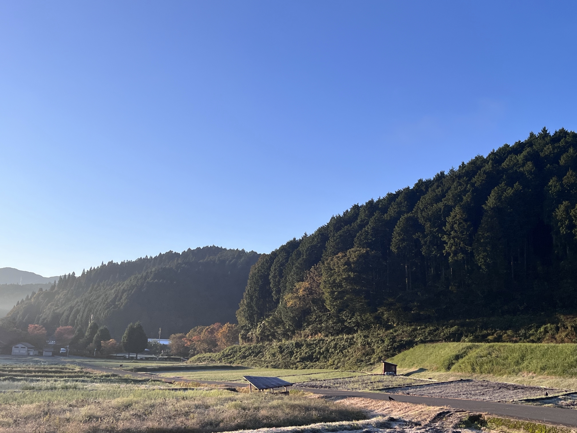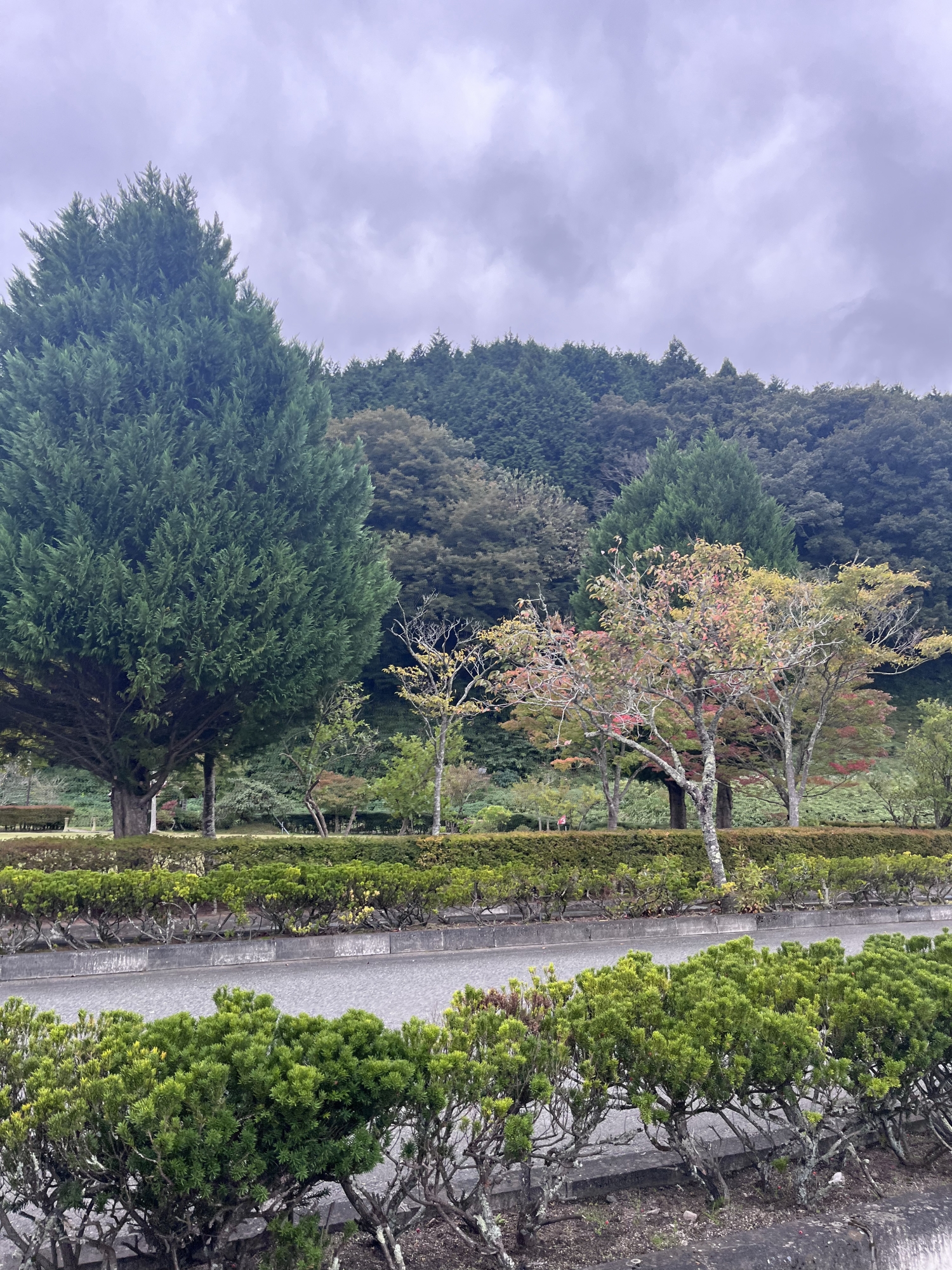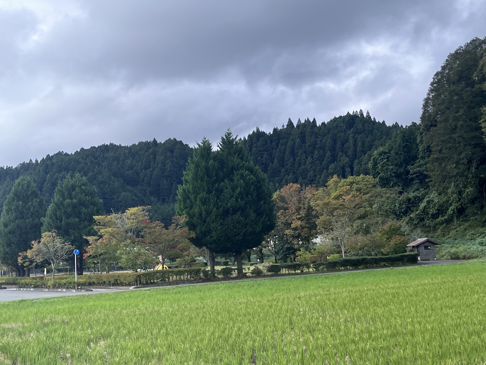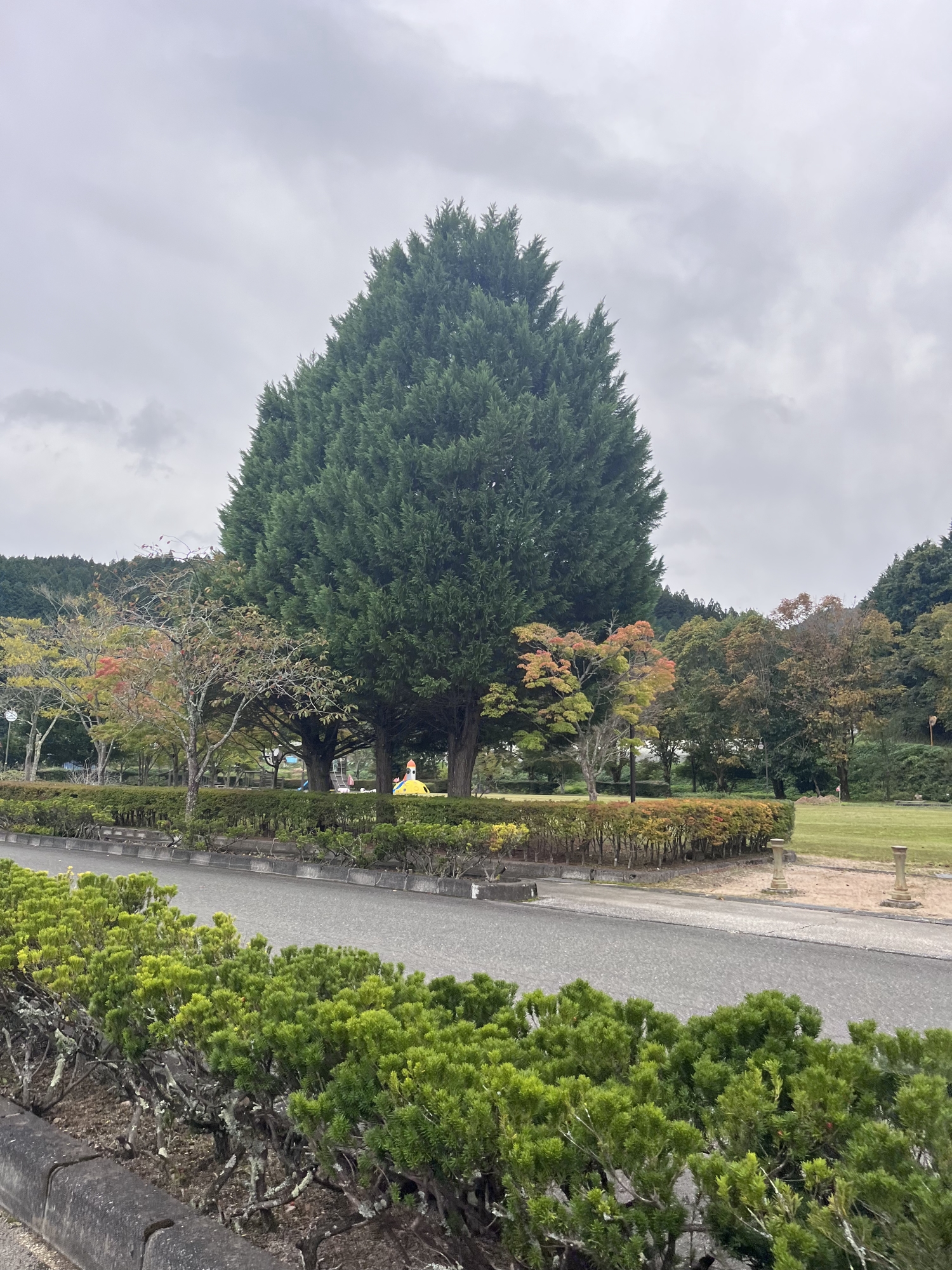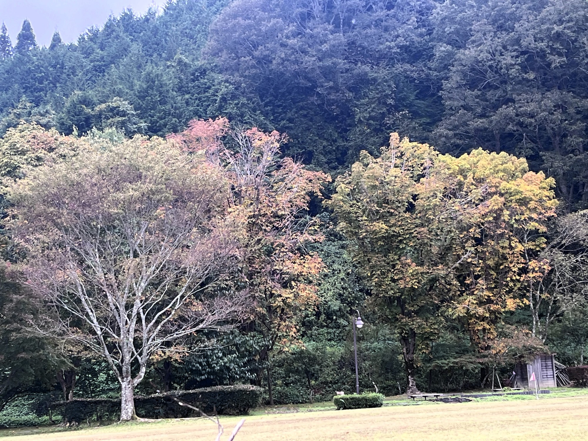 朝は青空……ふれあい公園も紅葉のコントラストが良い感じ.