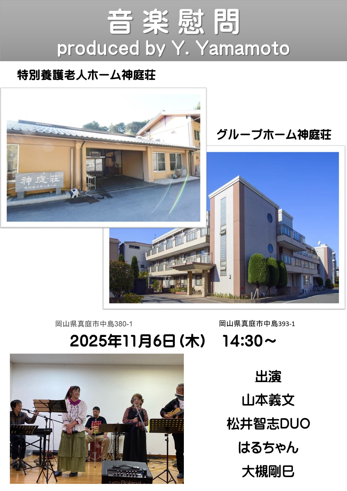 | 11/1:CokieJarでZUZUs | 11/2:大国屋マルシェ~Lu Ca & UGK | 11/3:吉備プラザマルシェ~Lu Ca & UGK | 11/6:神庭荘で慰問楽団に参加 |