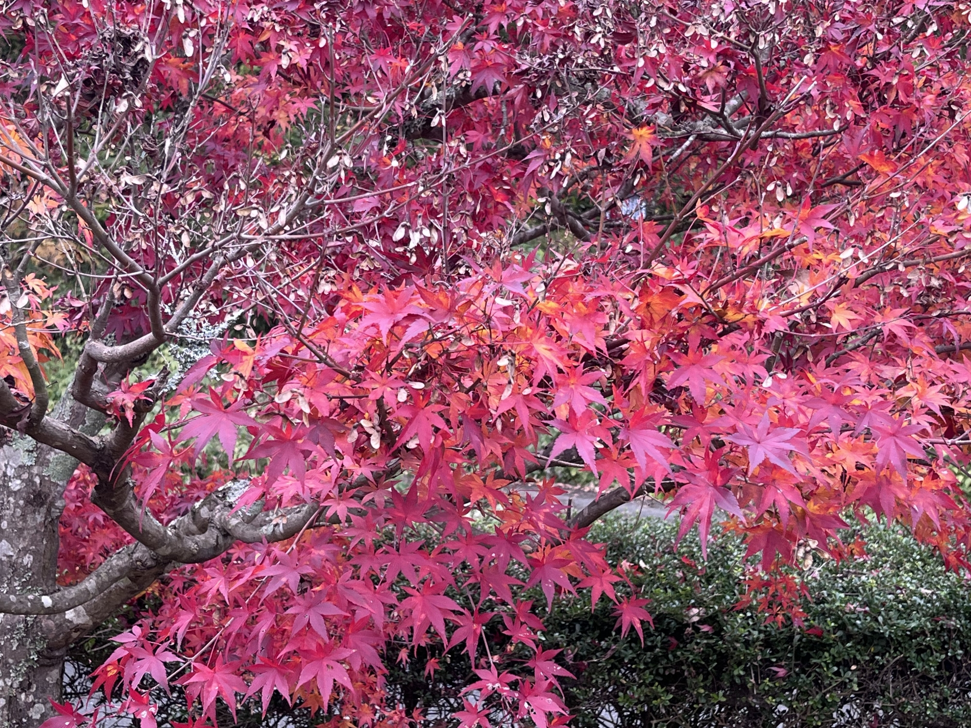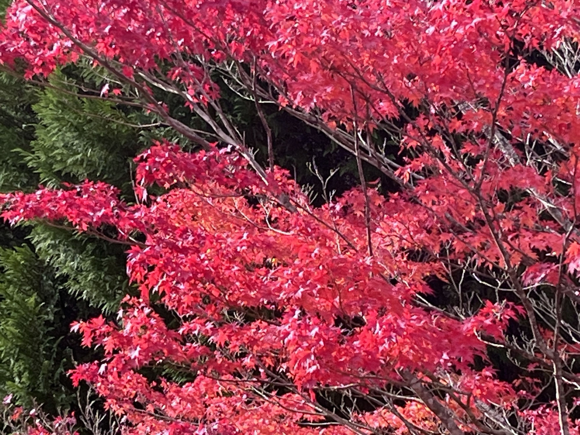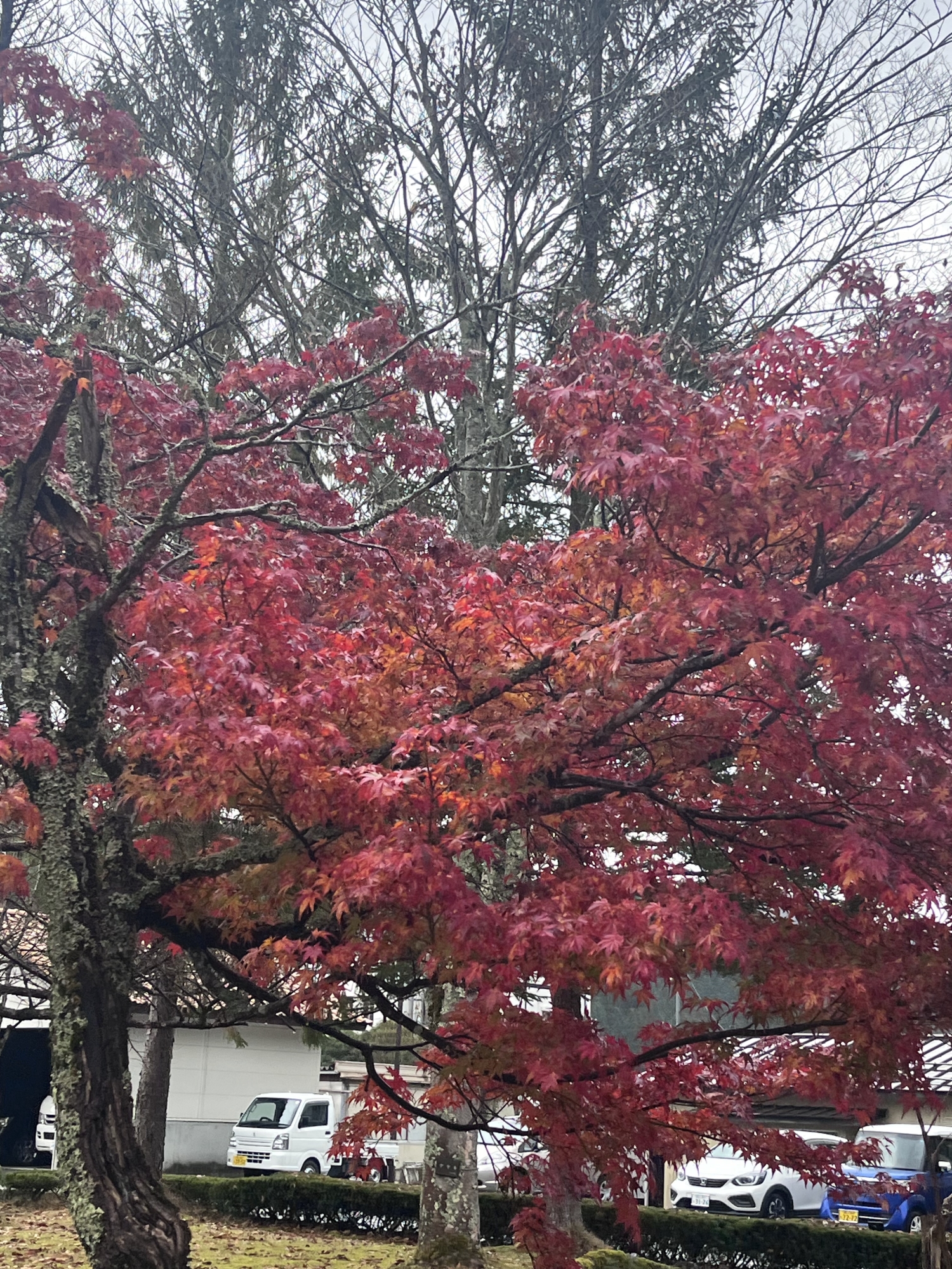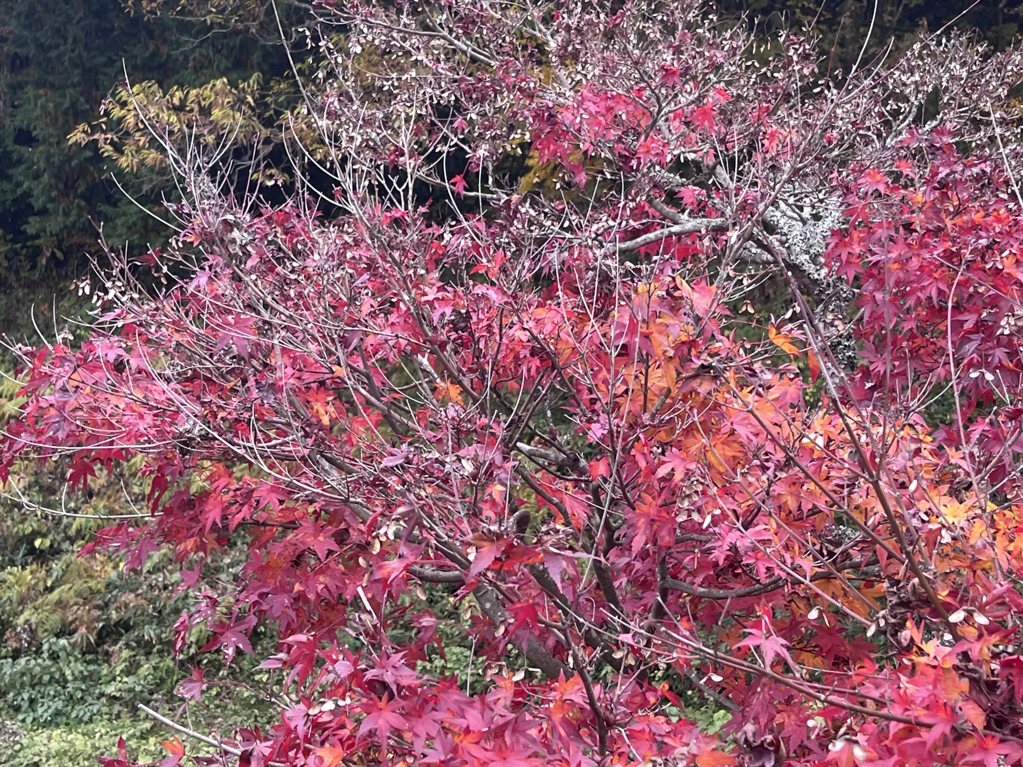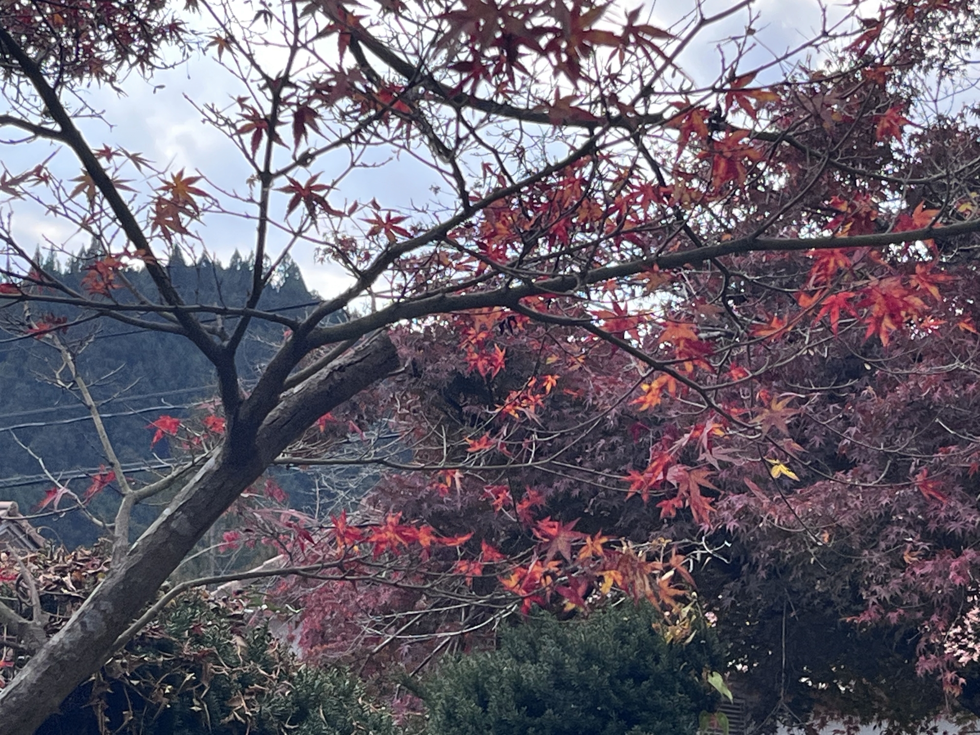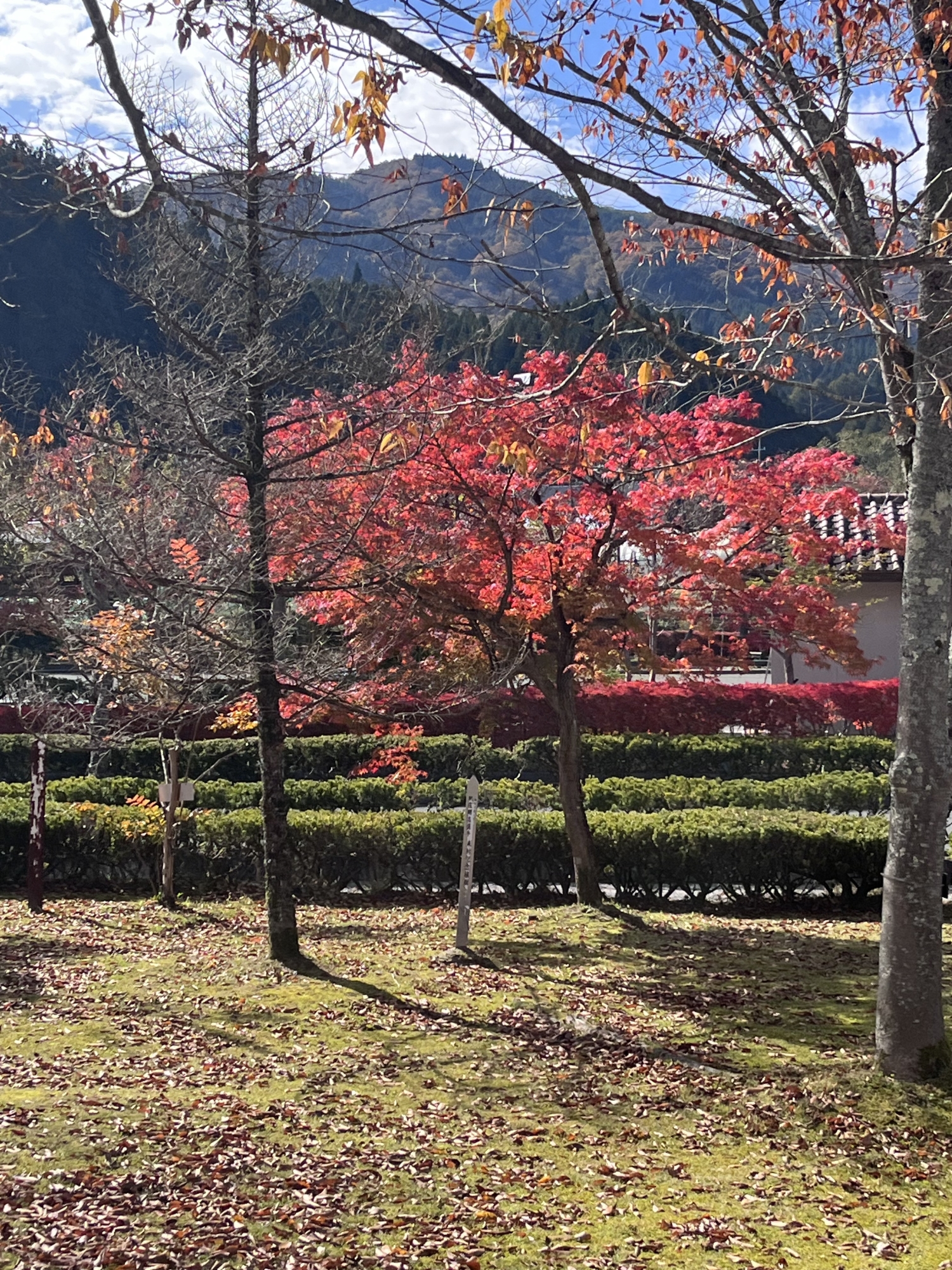 さて、昼から……診療所横もかなり散っていて……歴史民俗資料館の横で、ドウダンツツジと紅葉.