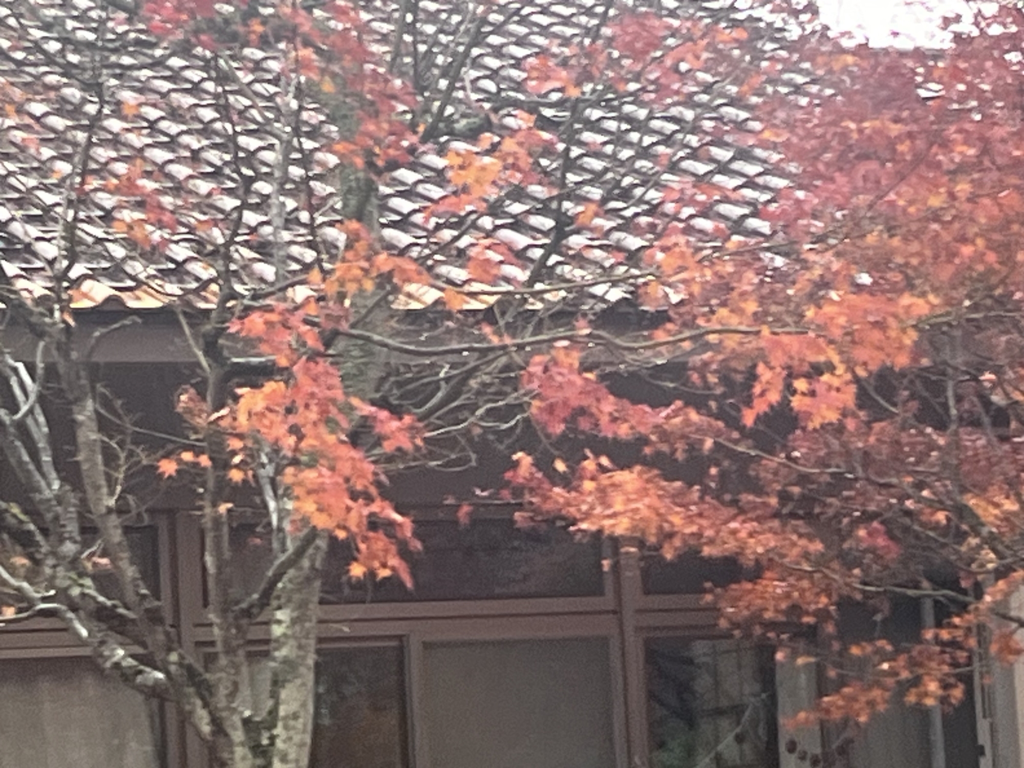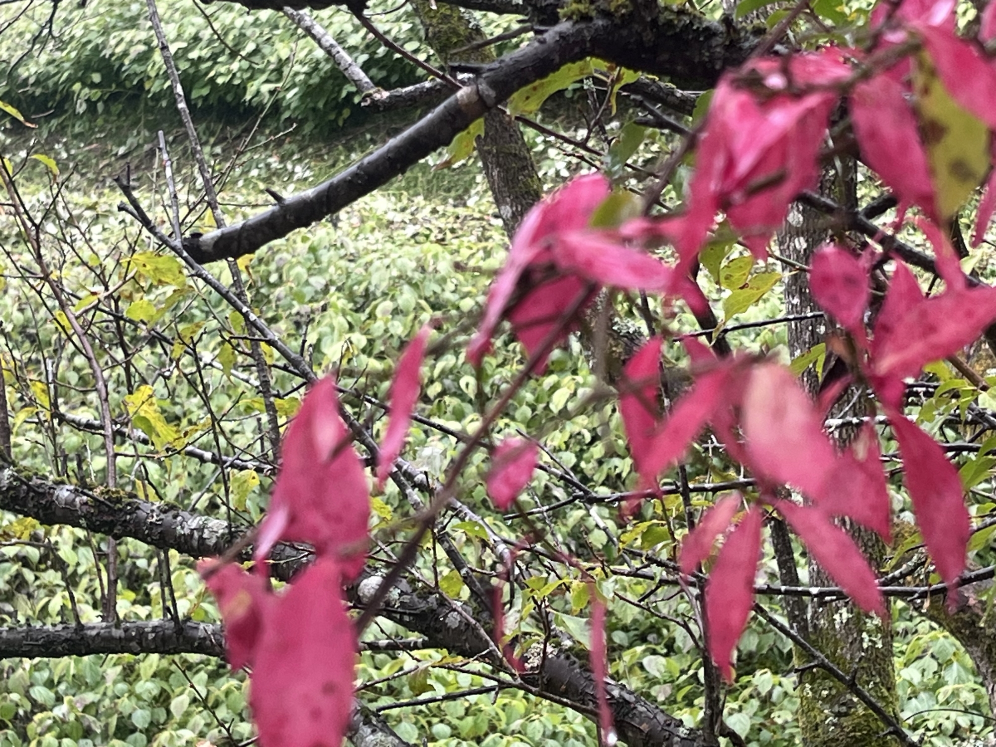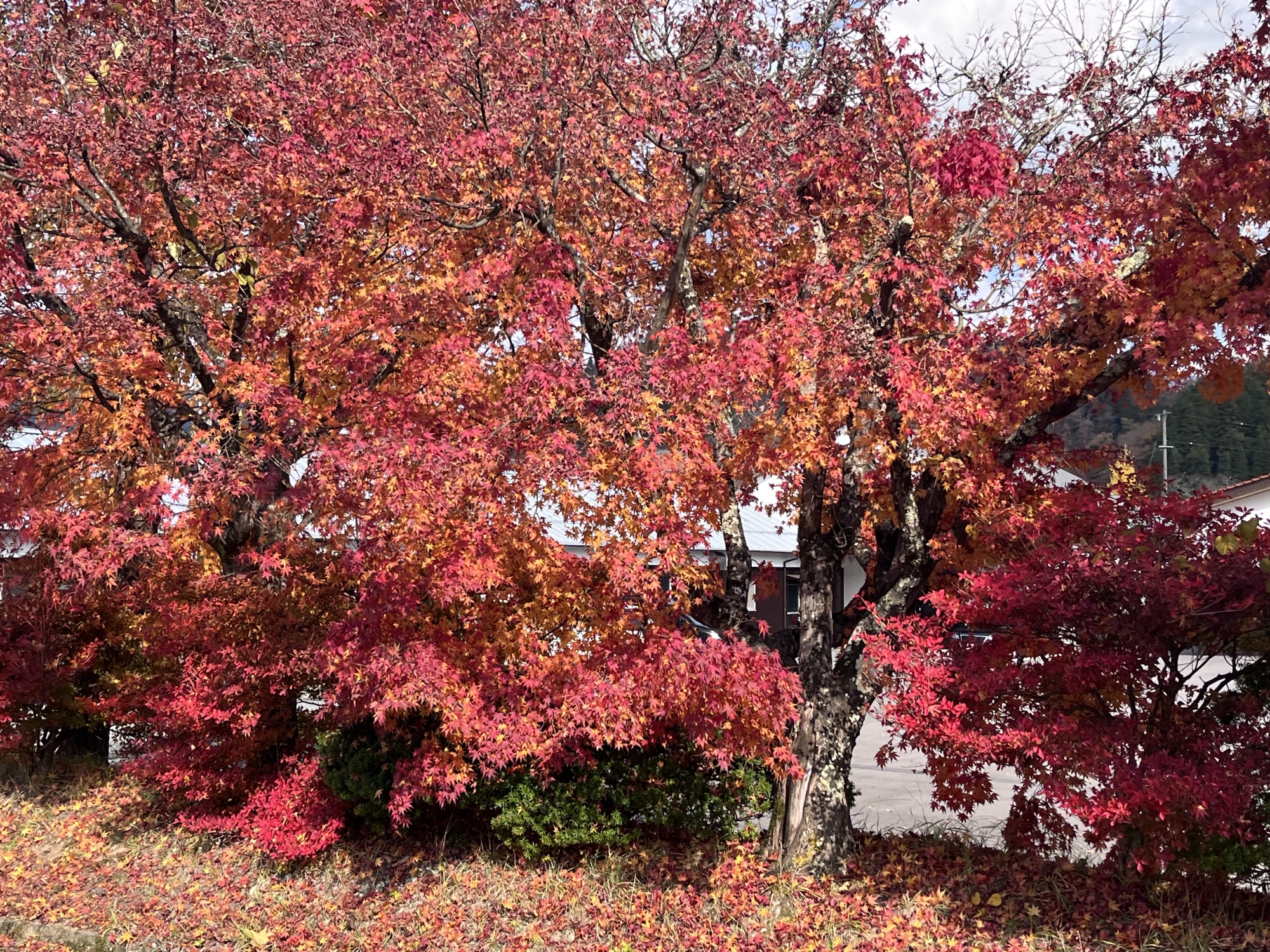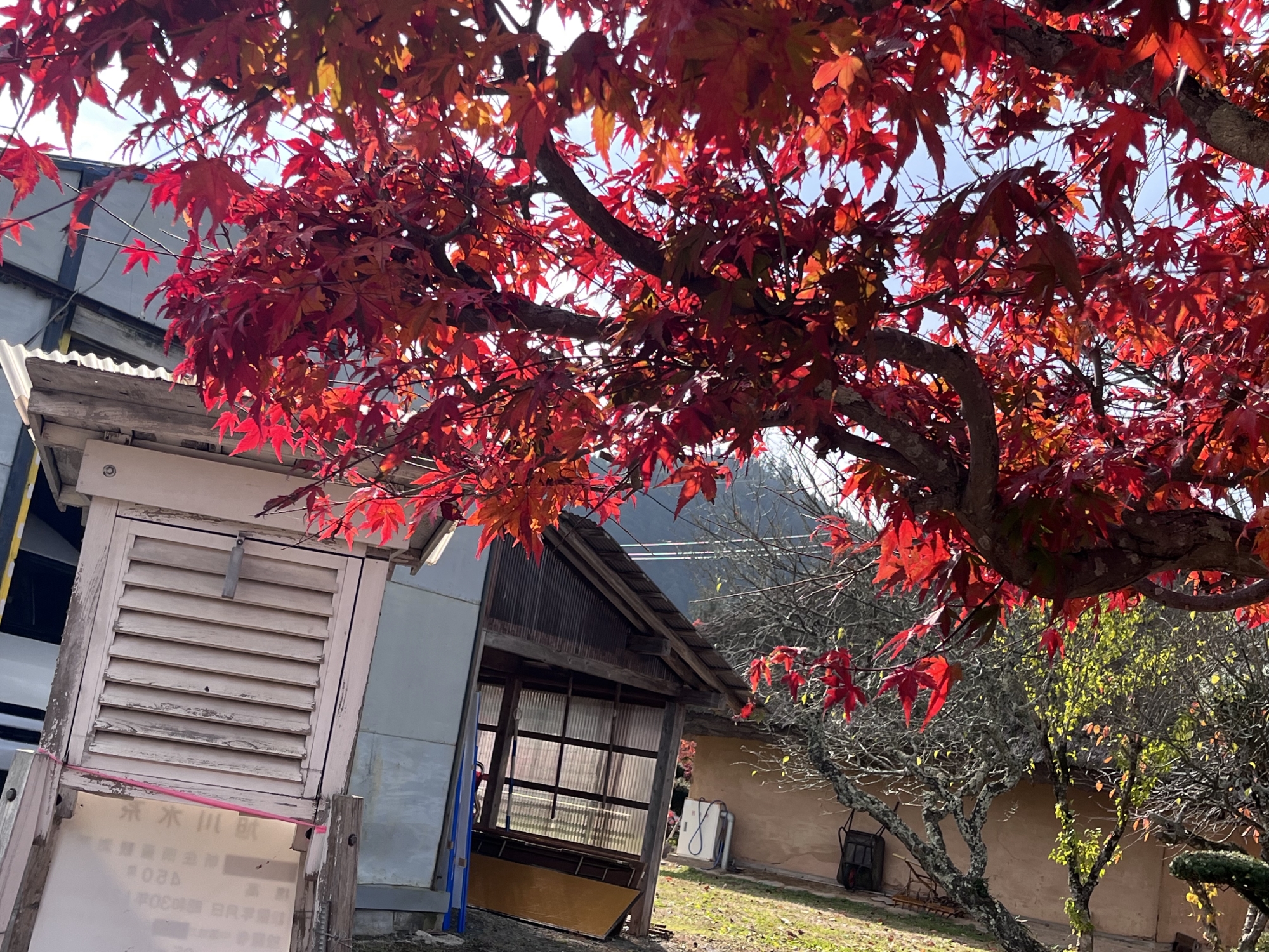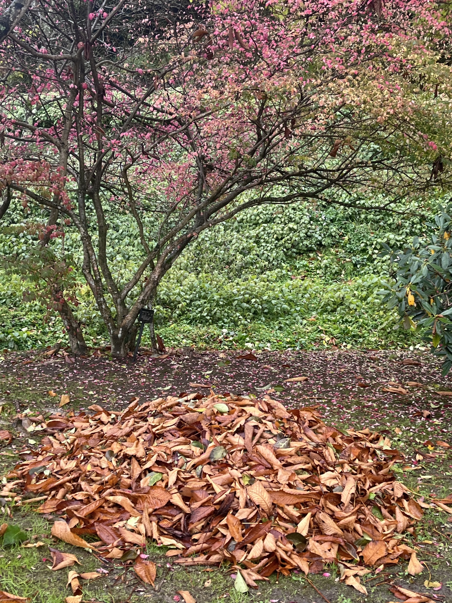 さて、昼から……診療所横もかなり散っていて……歴史民俗資料館の横で、ドウダンツツジと紅葉.