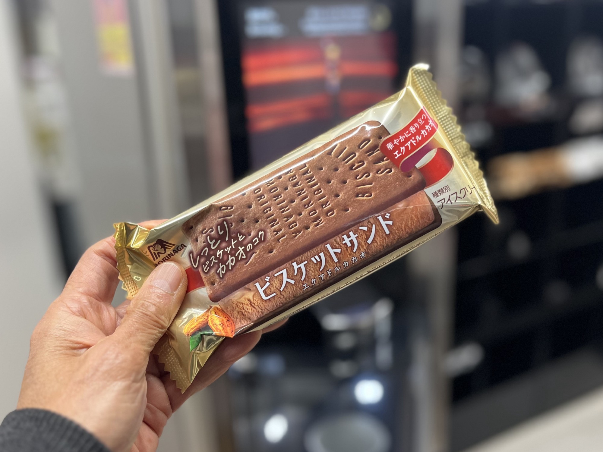 途中のセブンで……カカオ味のビスケットサンド、旨い.