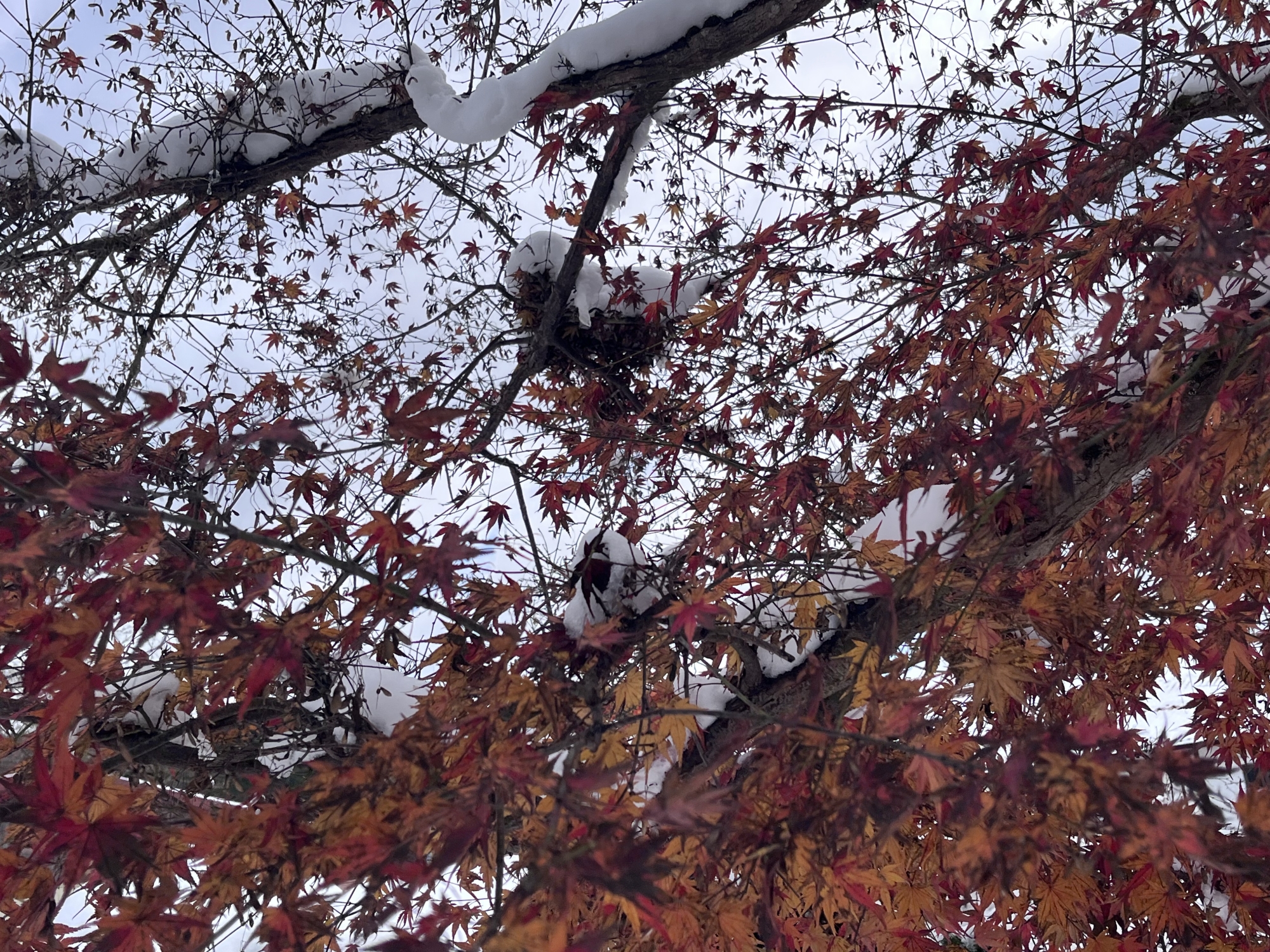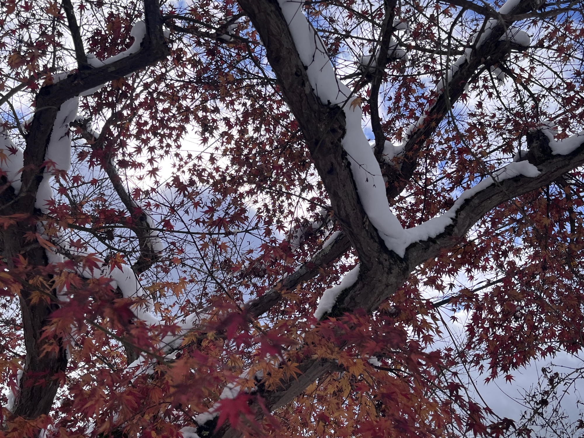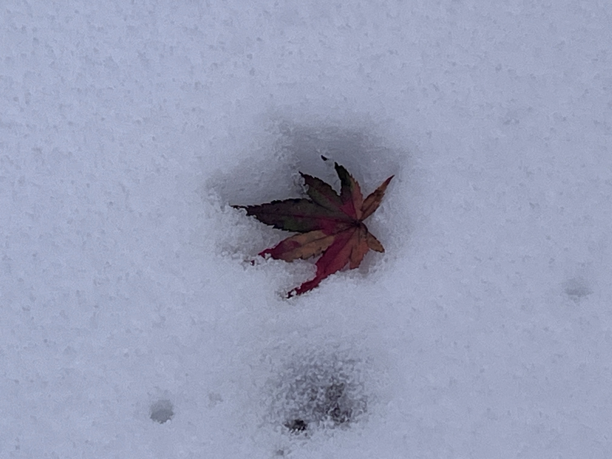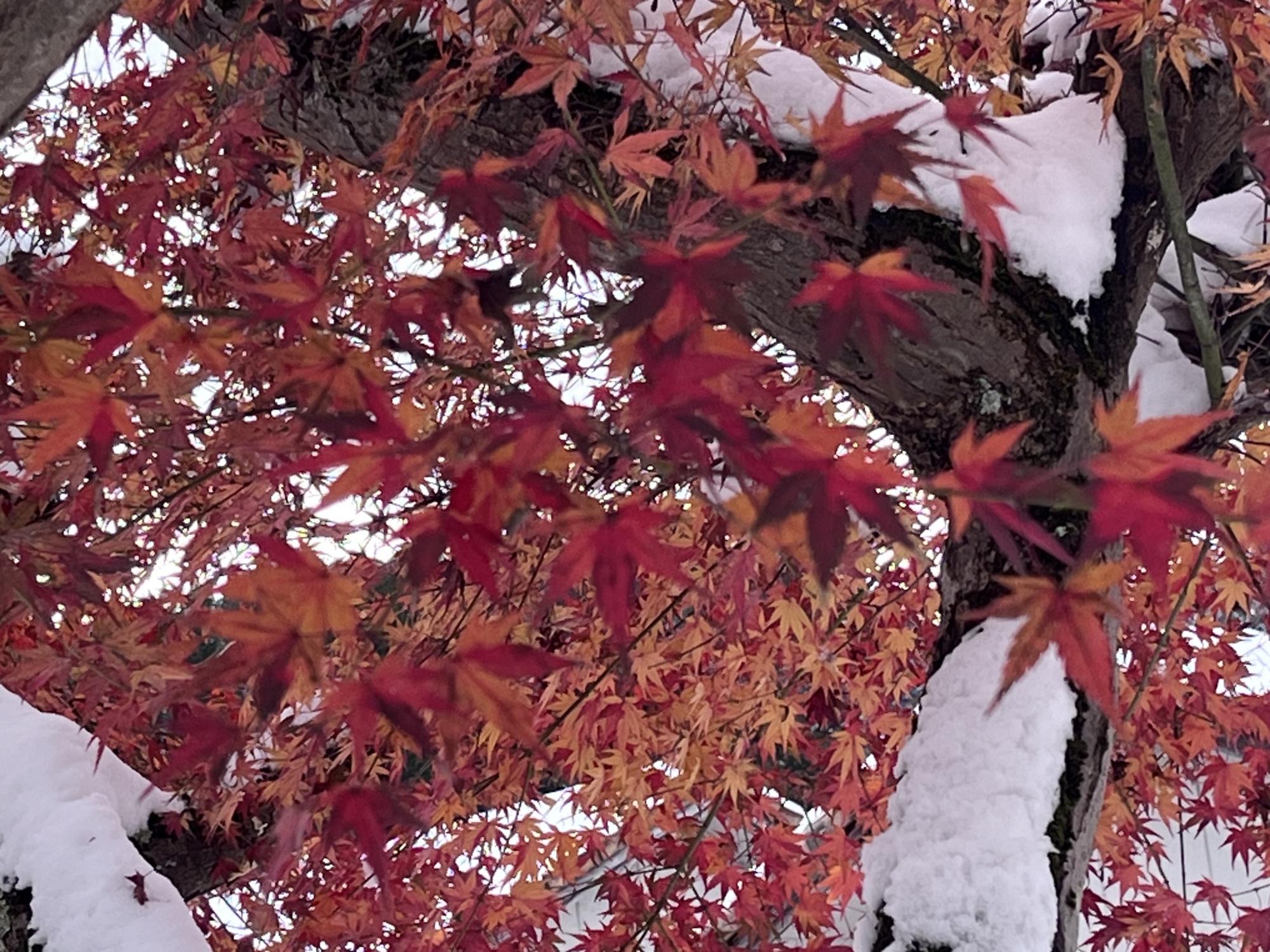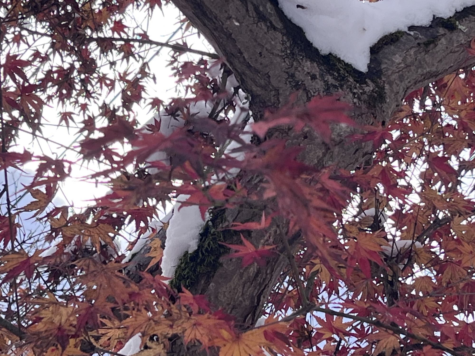 さて、昼は郵便局へ……名残りの紅葉にも雪が積もっていました.