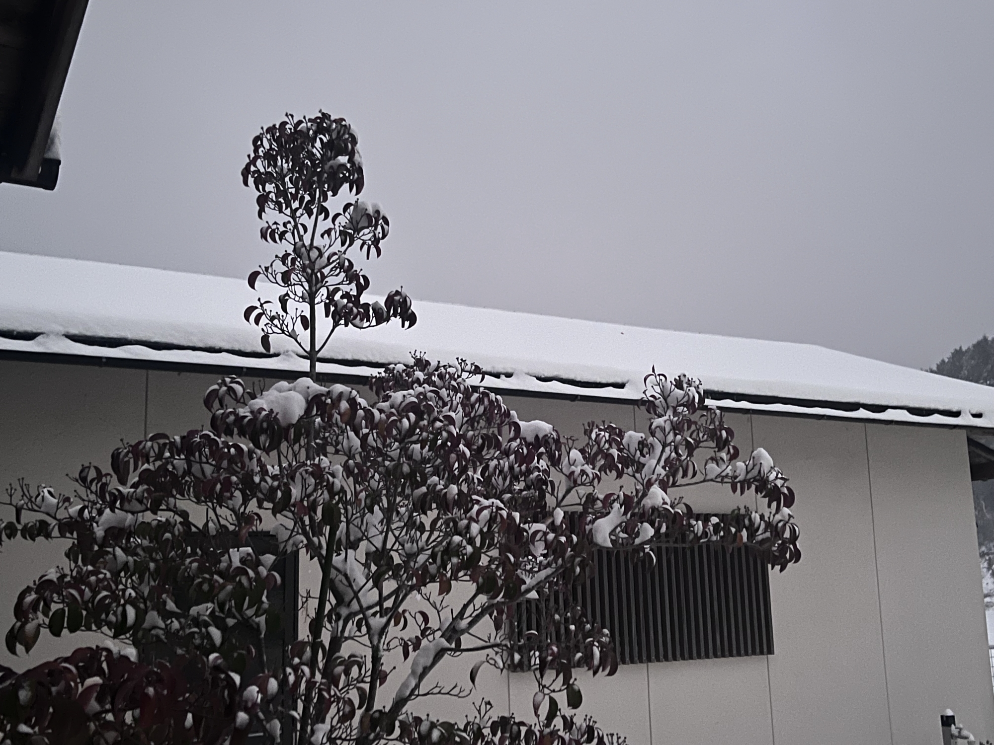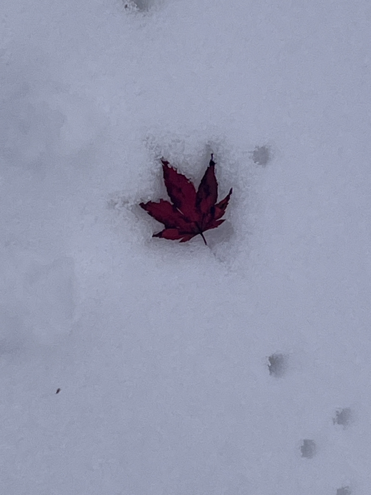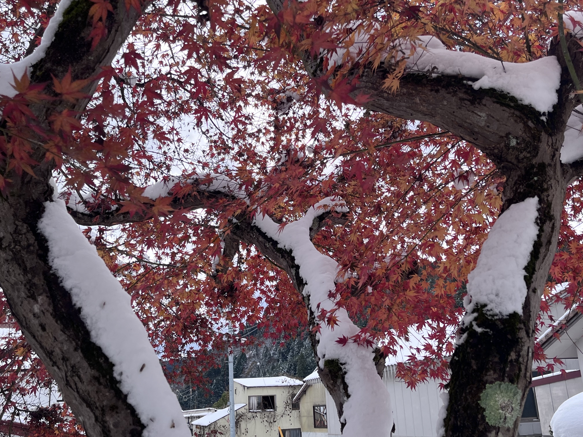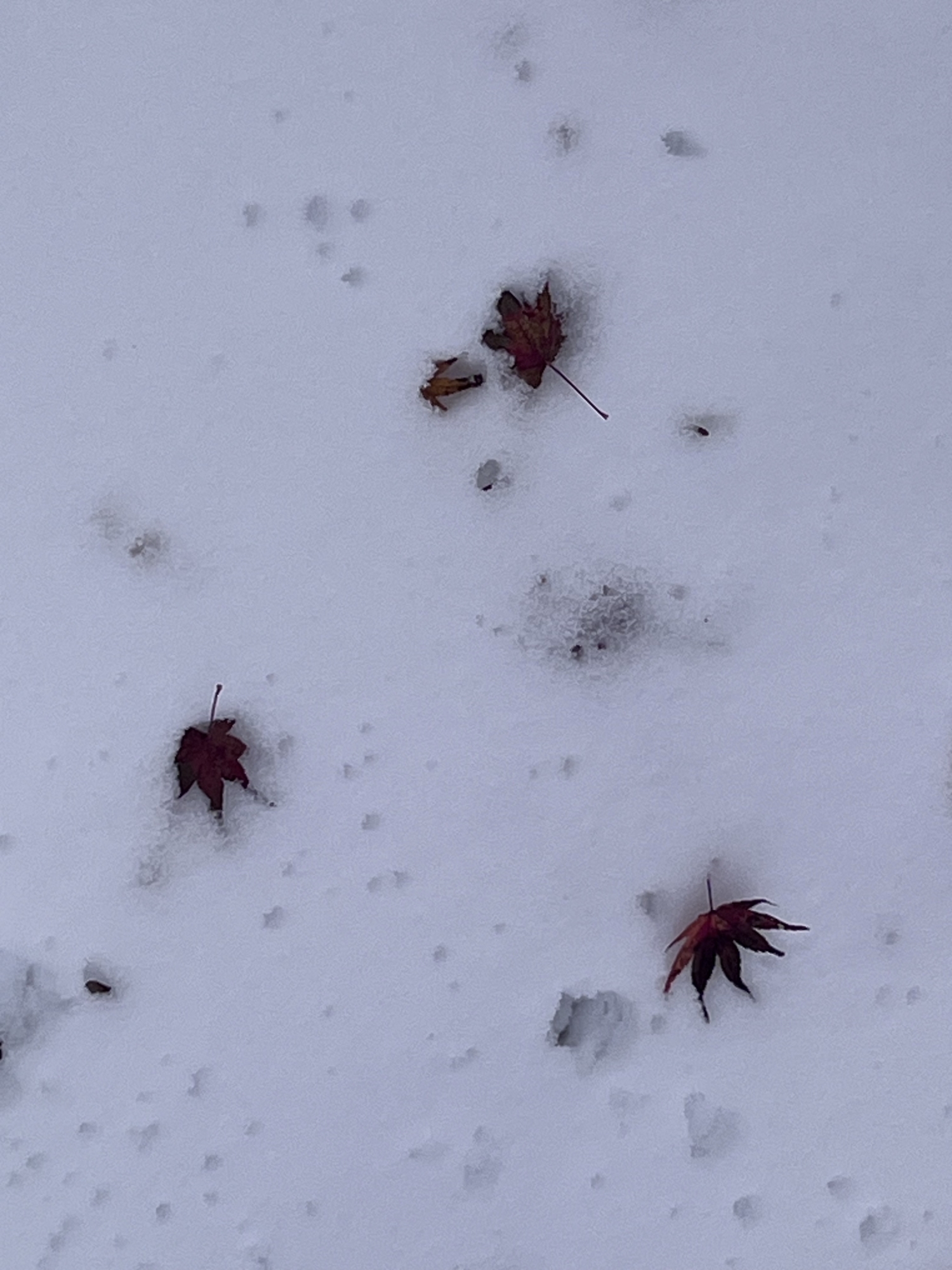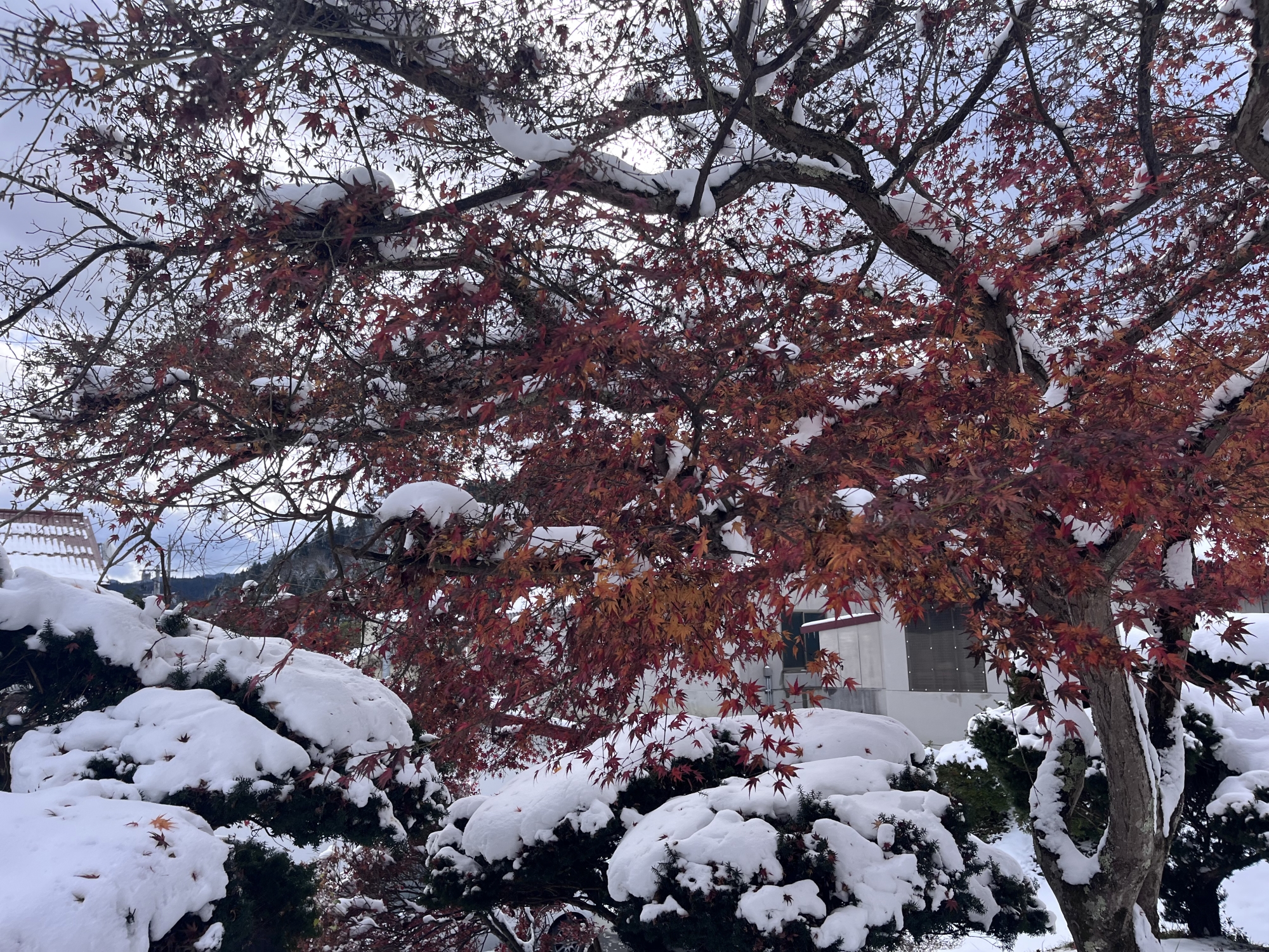 さて、昼は郵便局へ……名残りの紅葉にも雪が積もっていました.