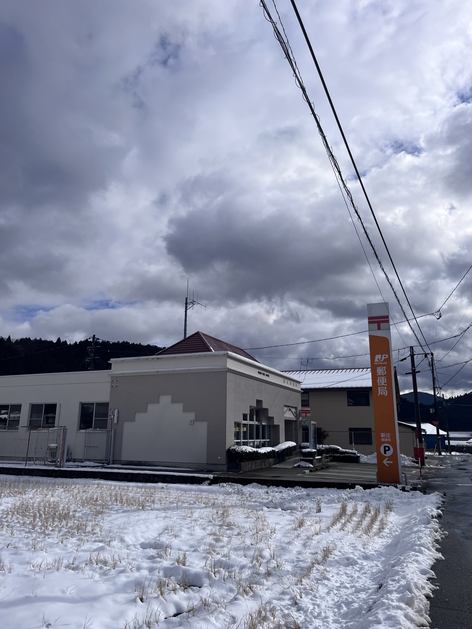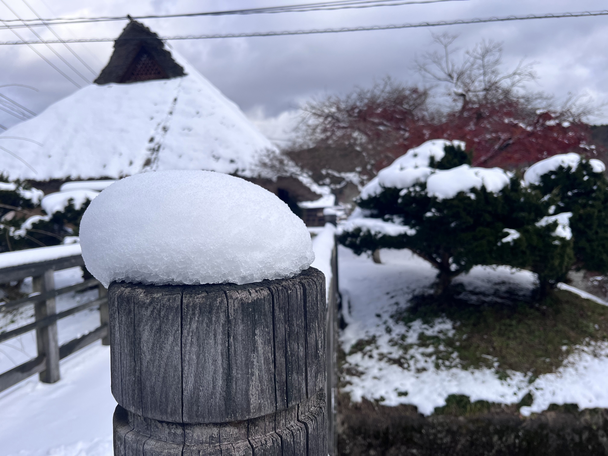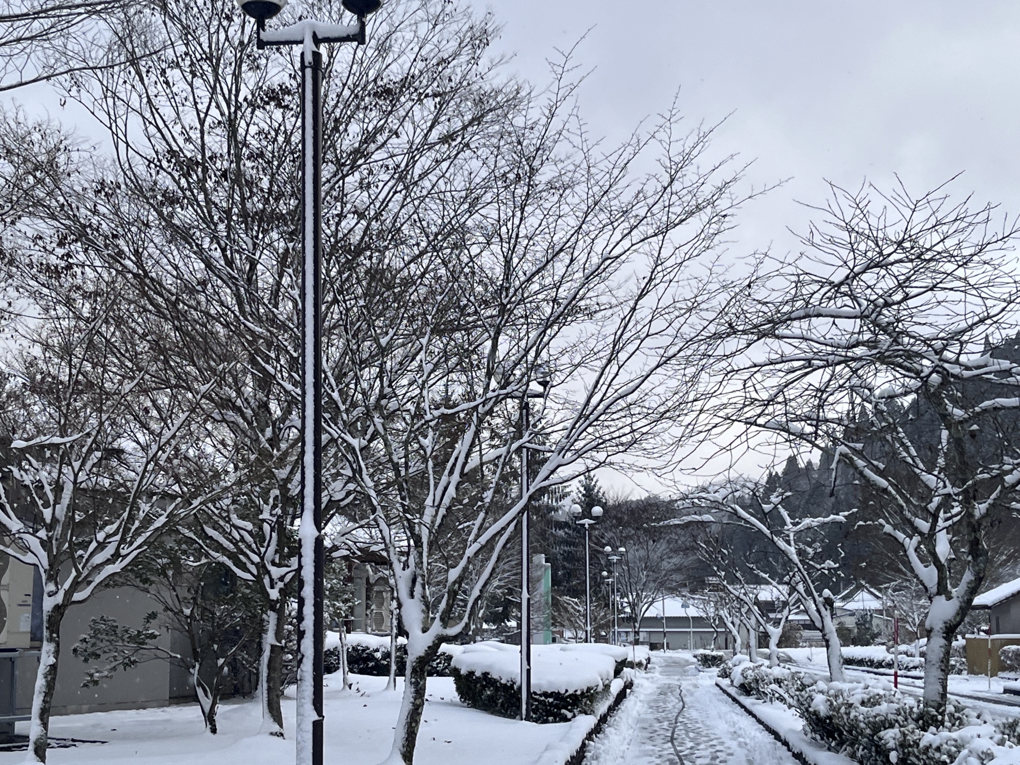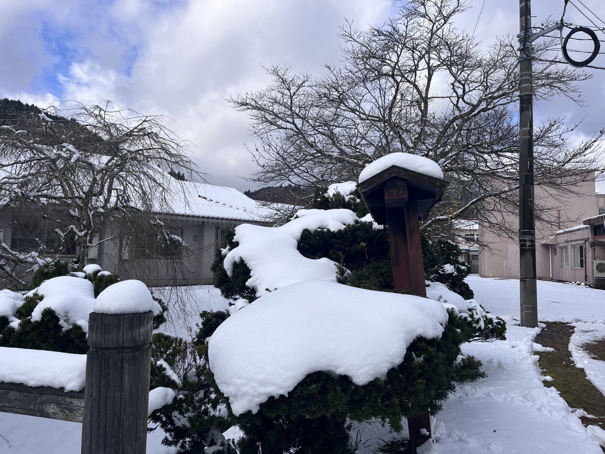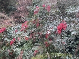 さて、昼は郵便局へ……名残りの紅葉にも雪が積もっていました.