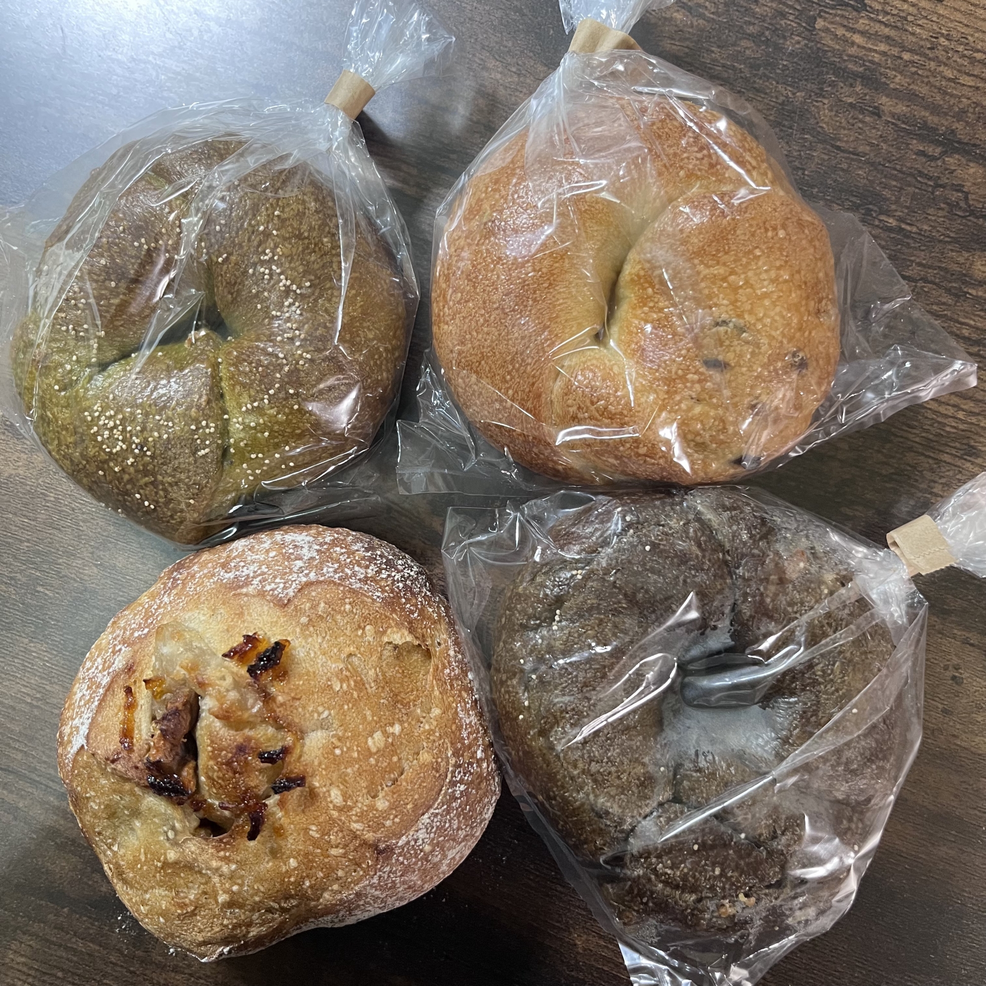 カンパーニュとかの大きいのも売り切れていました.土曜に倉敷へのお土産は……まずは、ベーグルなど.