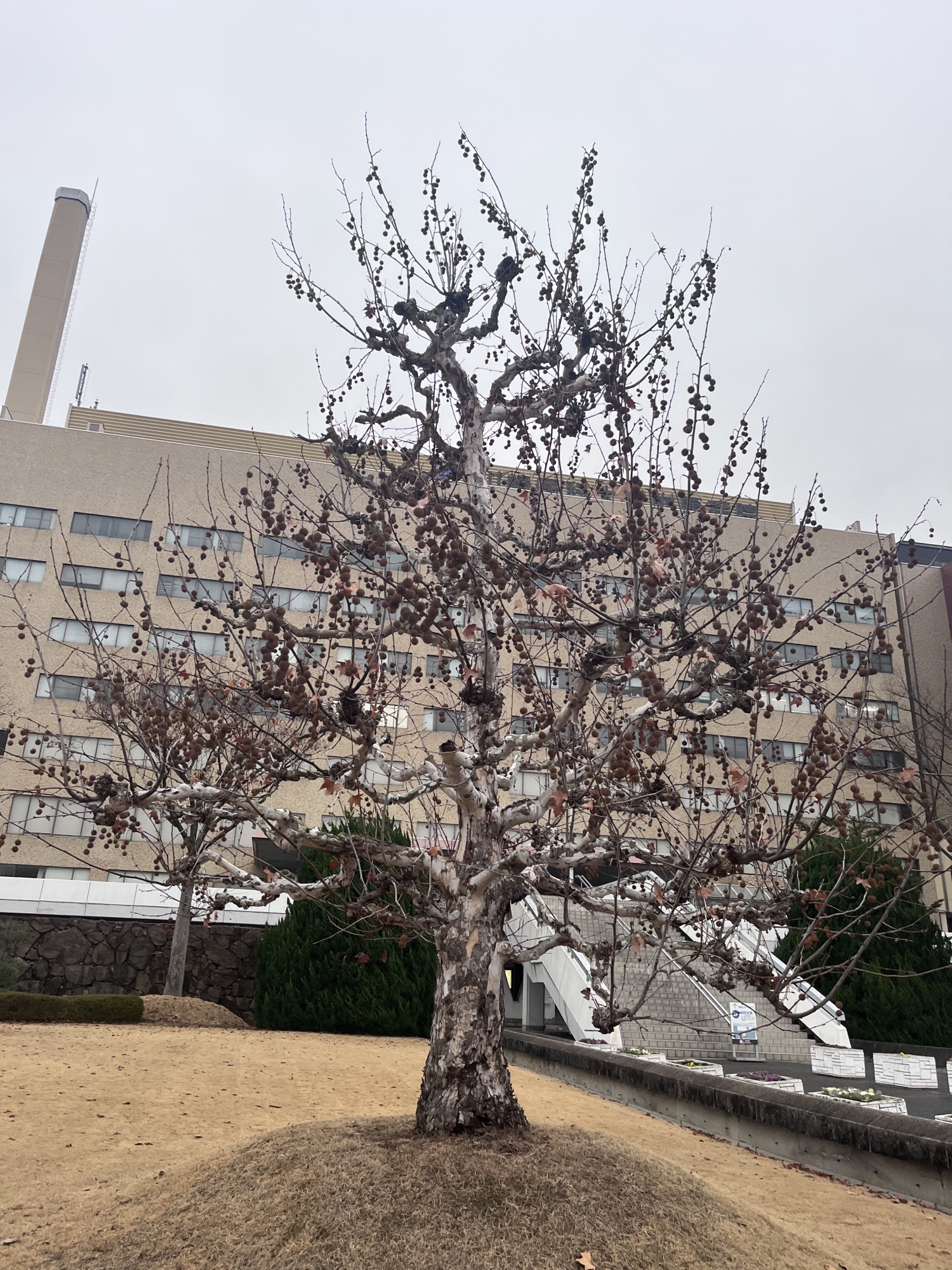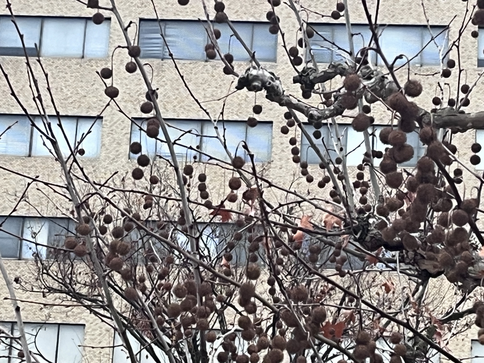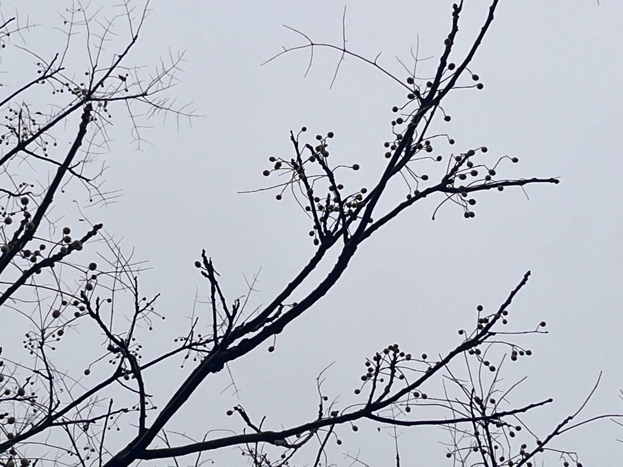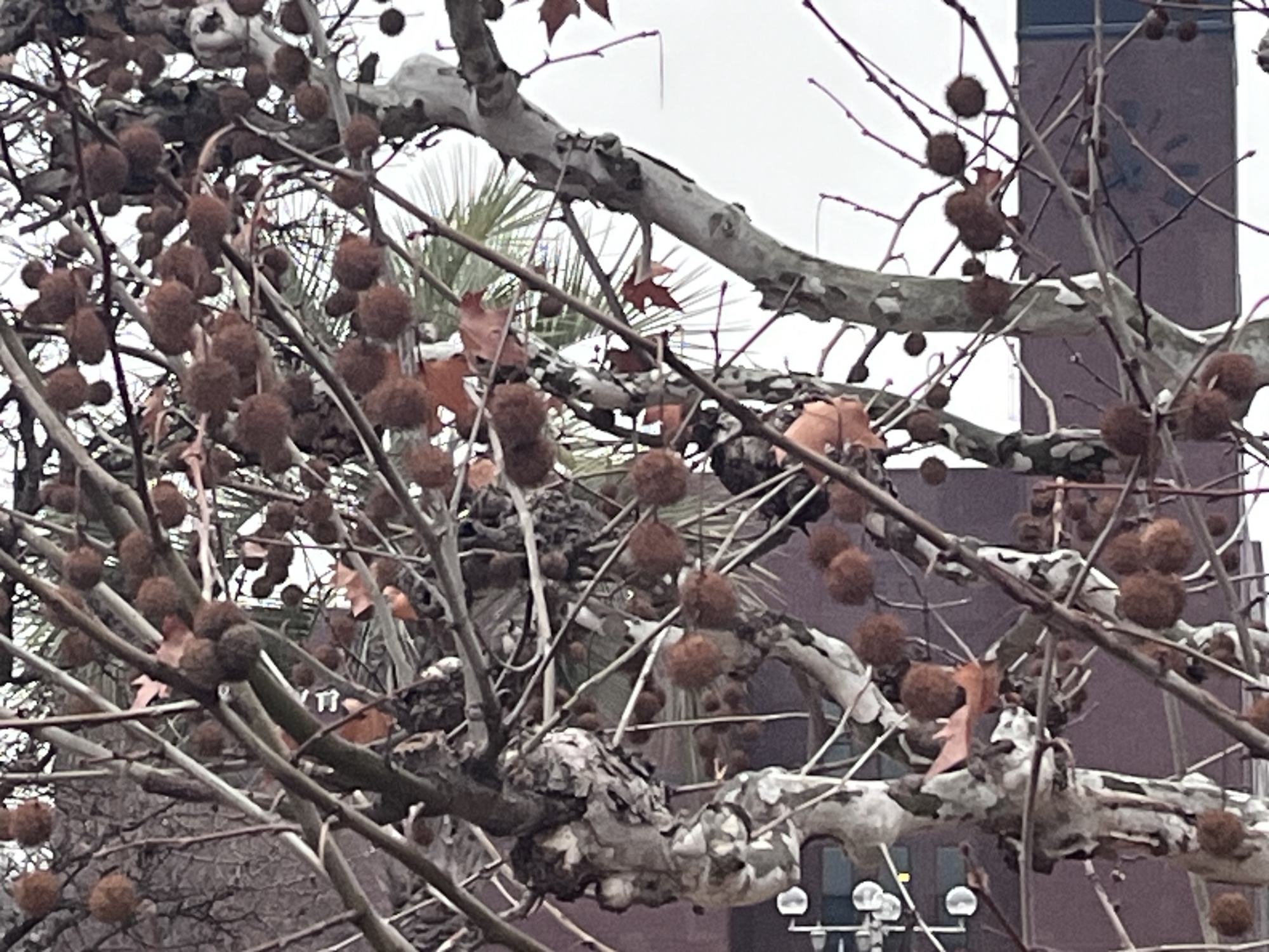 ヒポクラテスの木(プラタナス)は……東側は実だけ、西は、枯葉だけ.