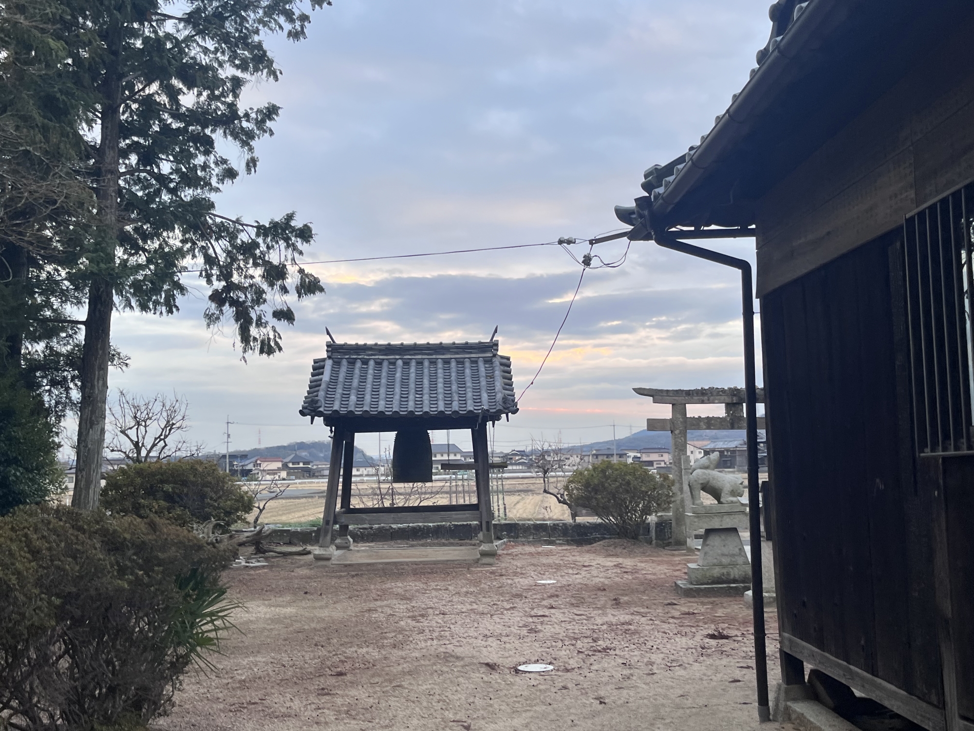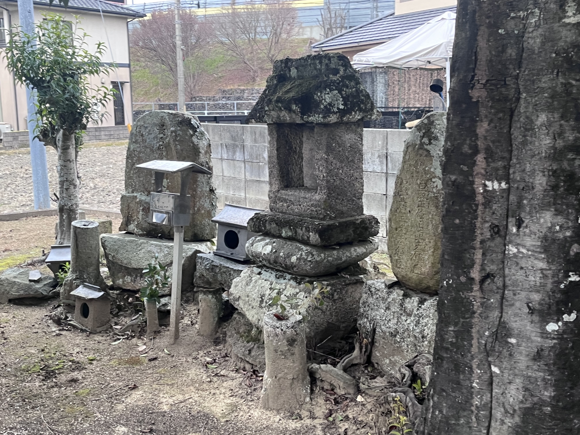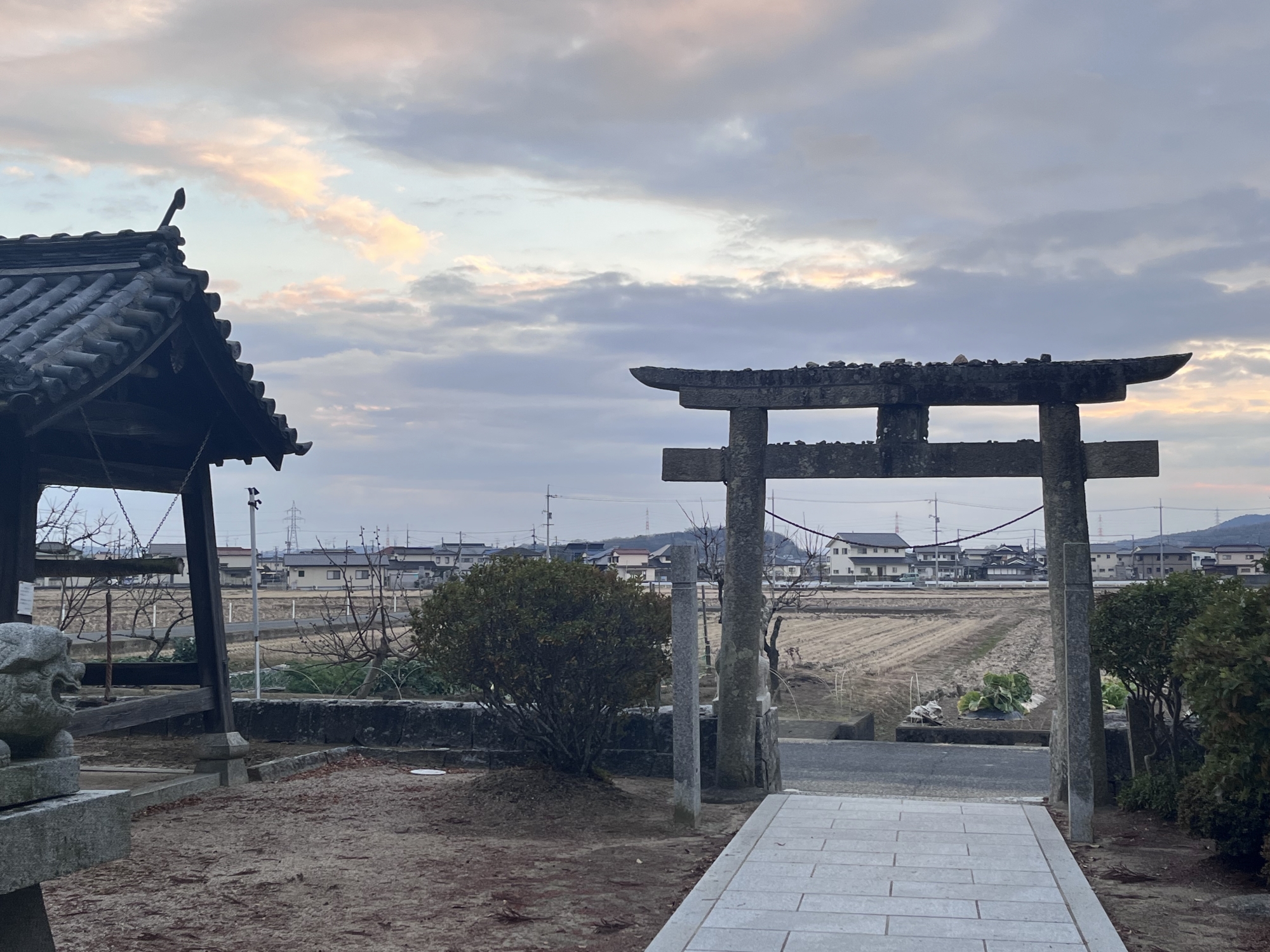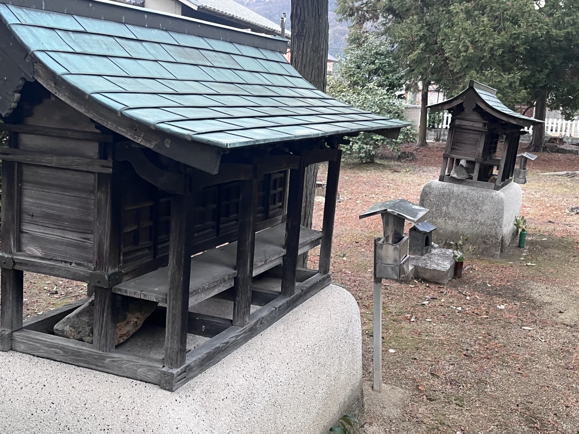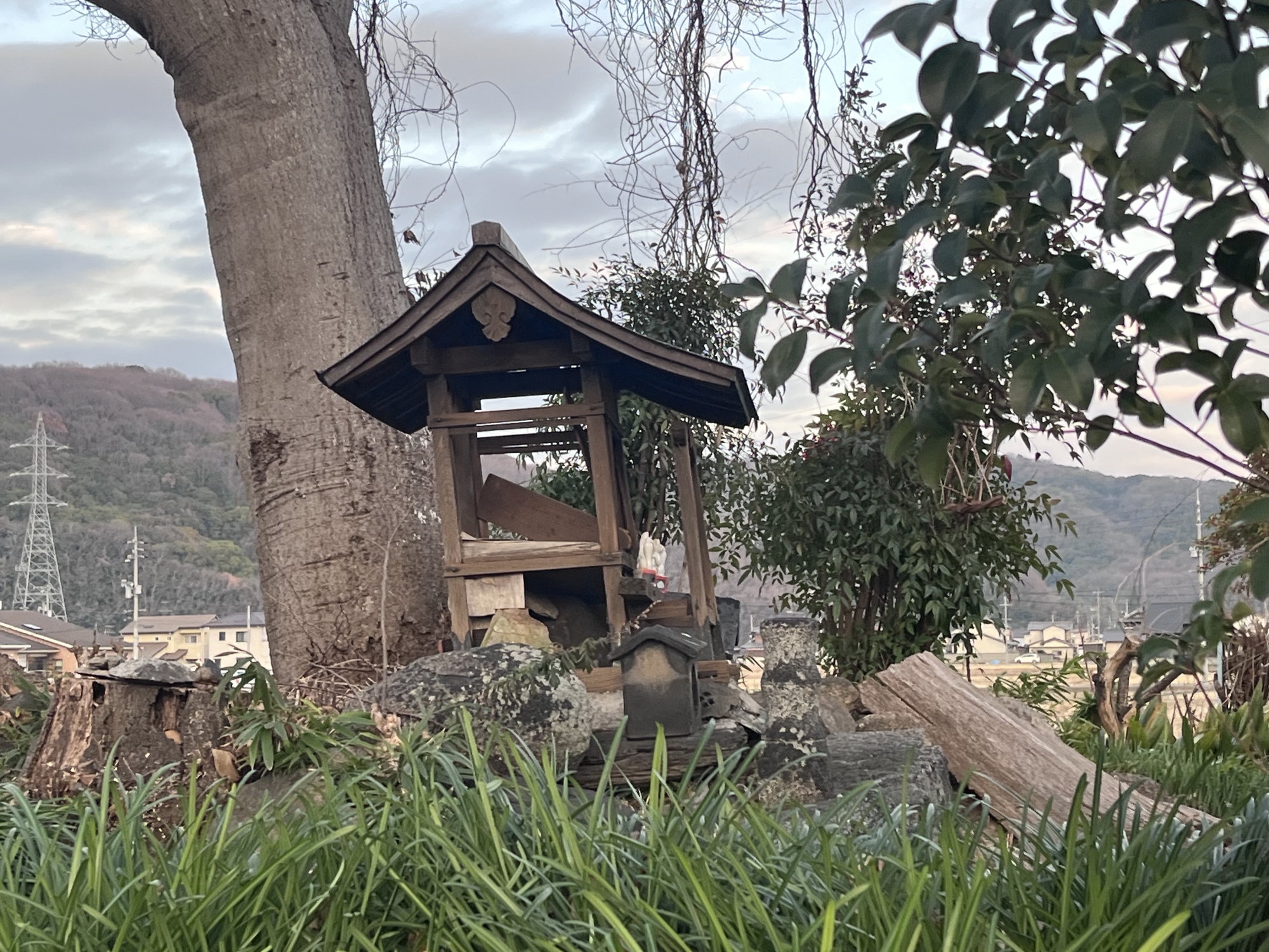 近くの住居の裏手に祠……そして、遠くに加茂神社.