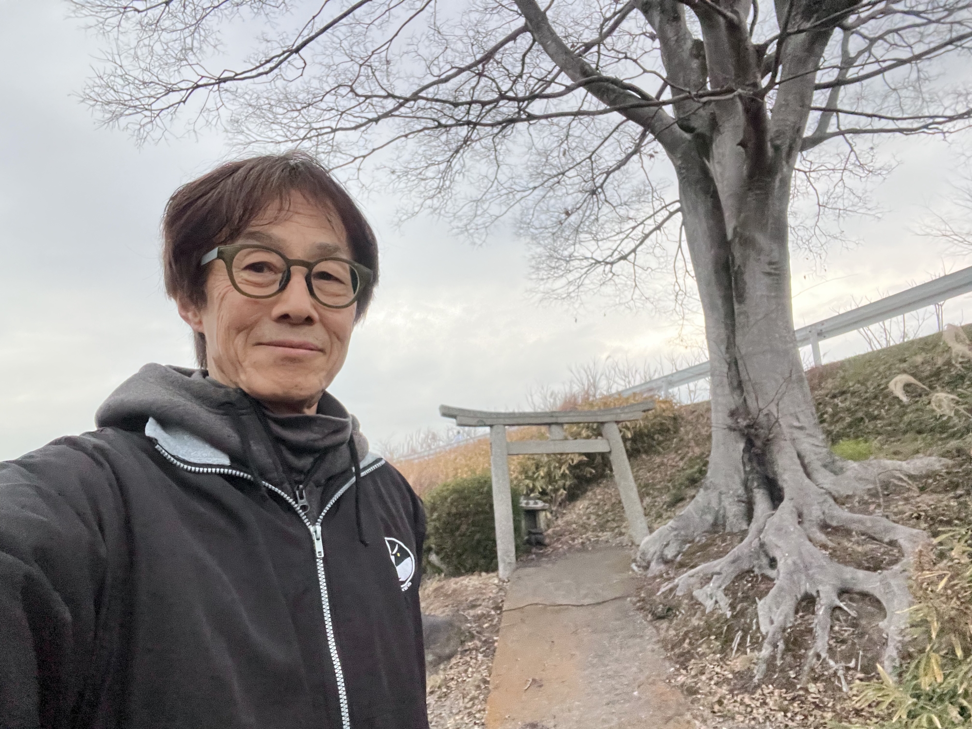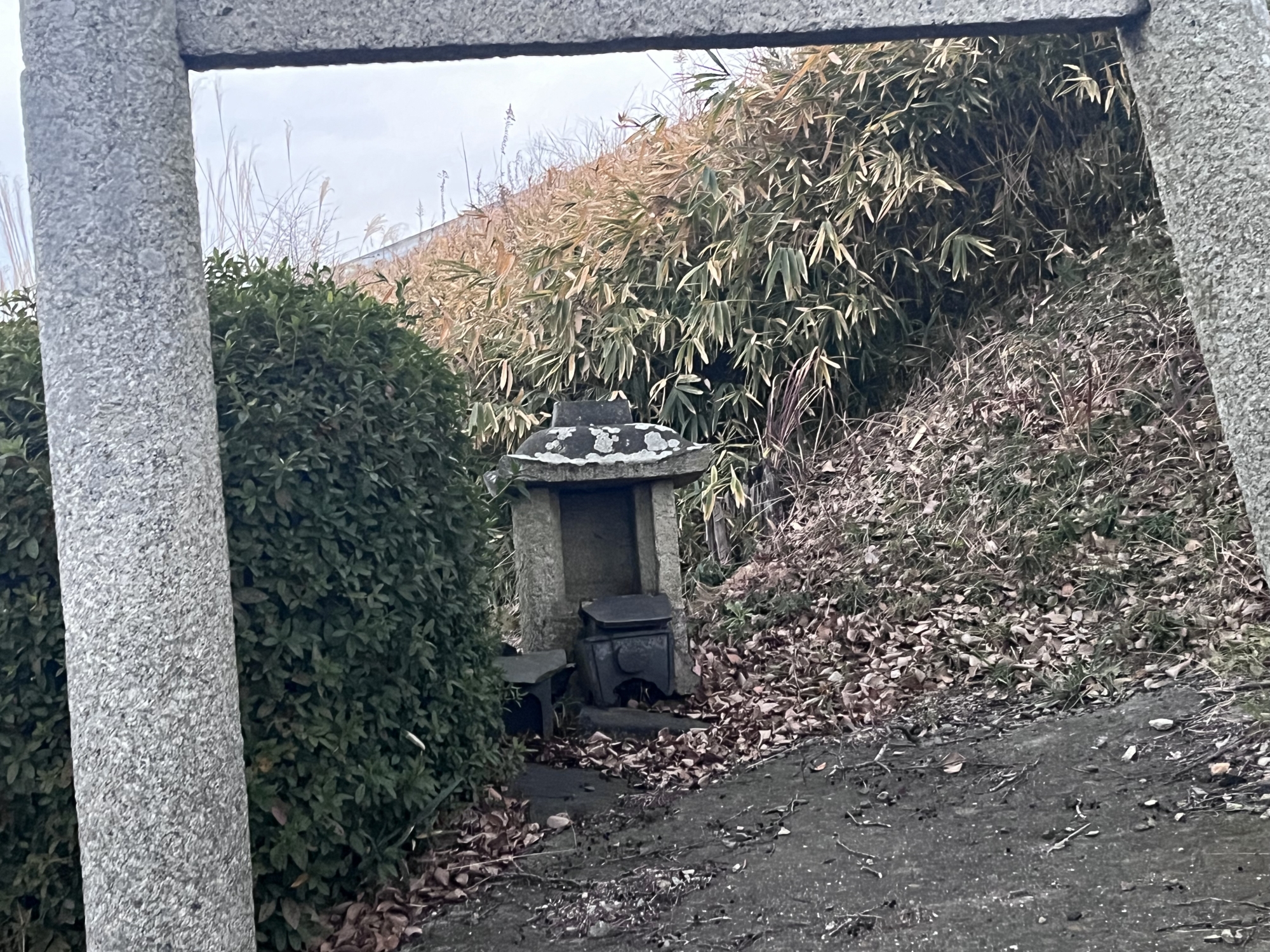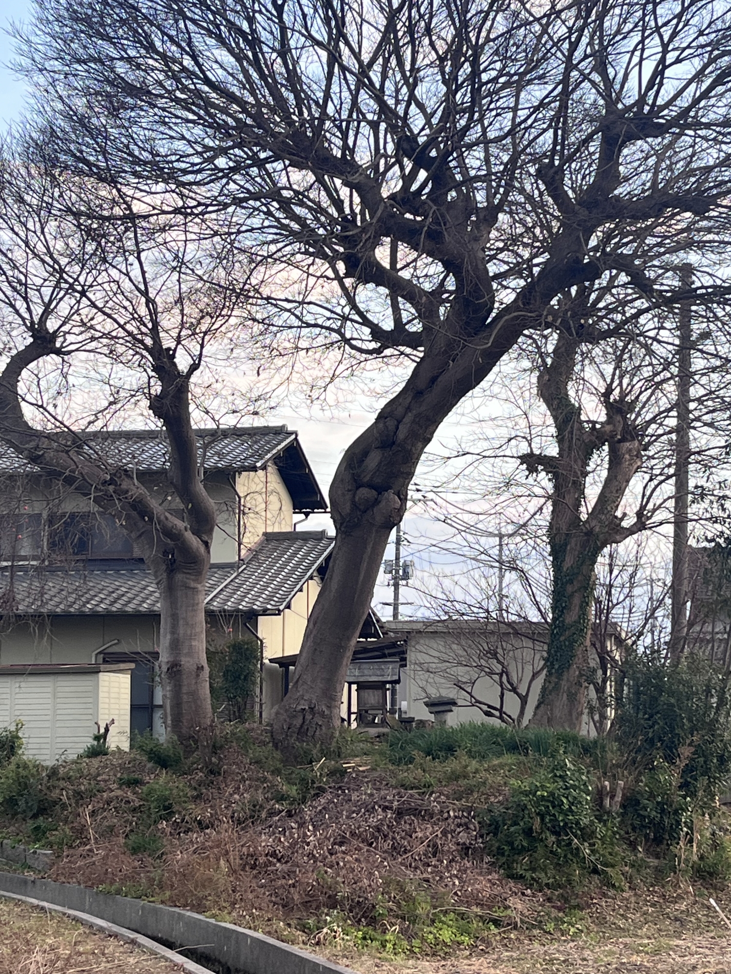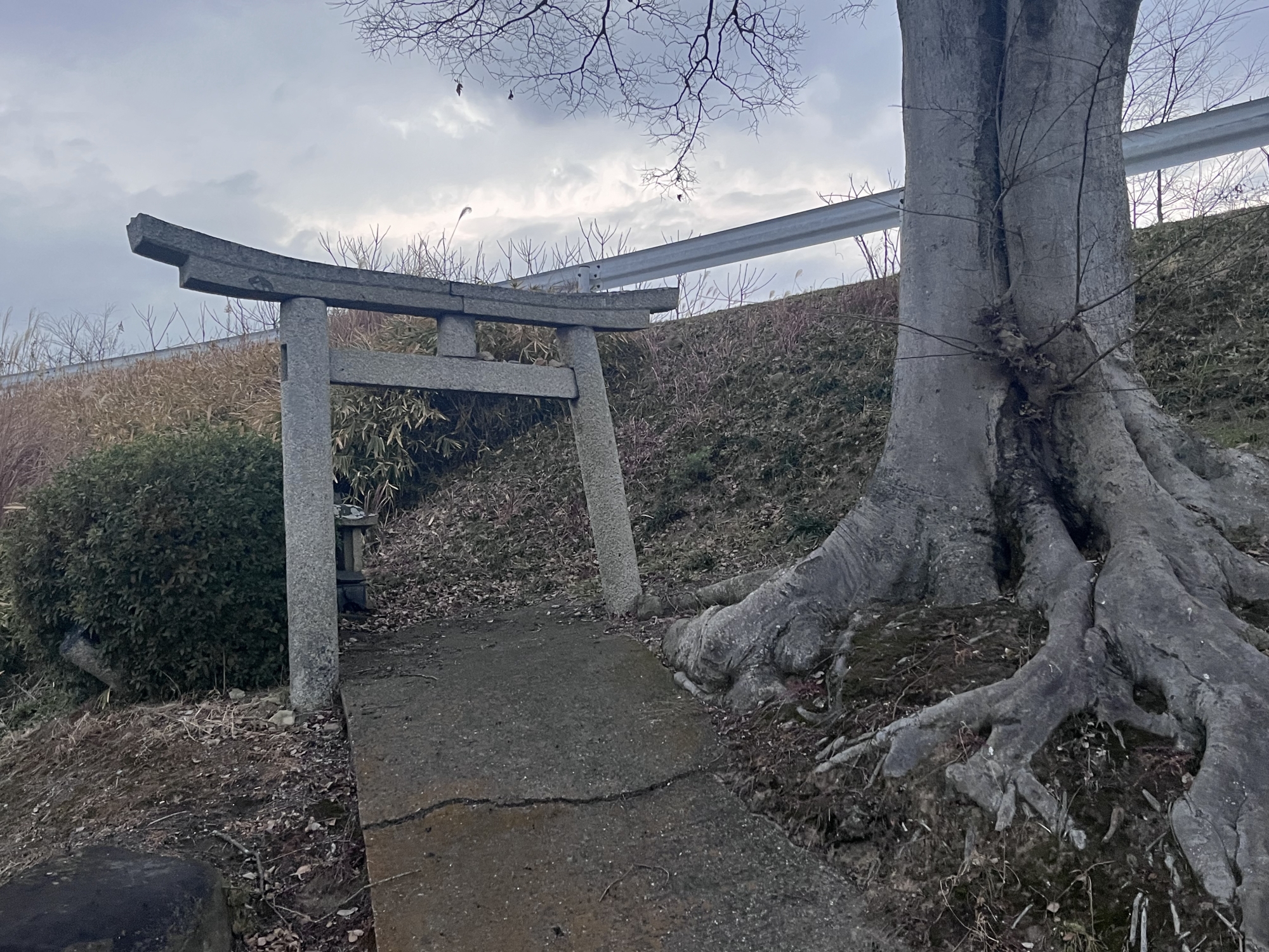 そうそう、ここの土手沿いの大きな木の下に鳥居と祠.