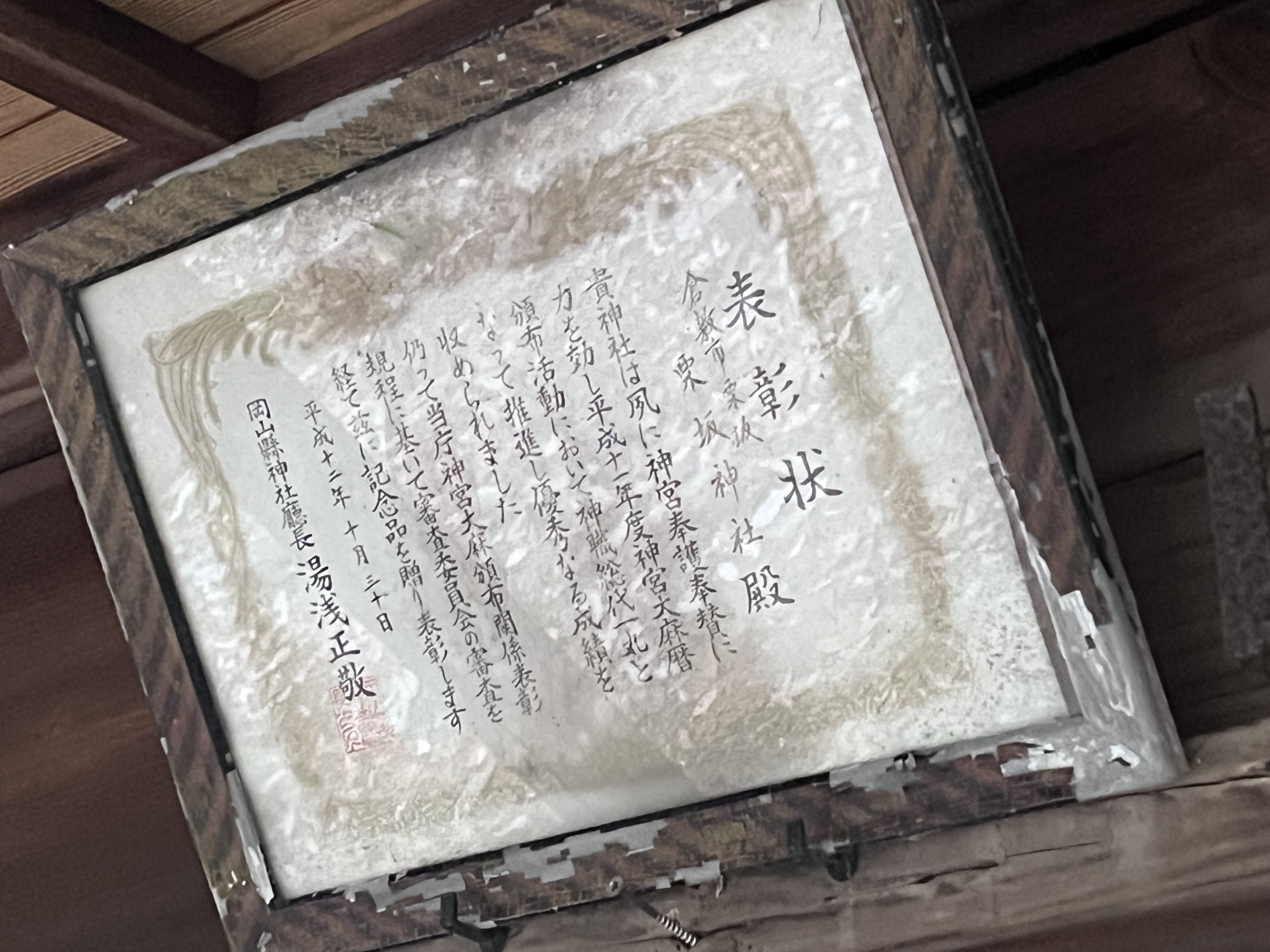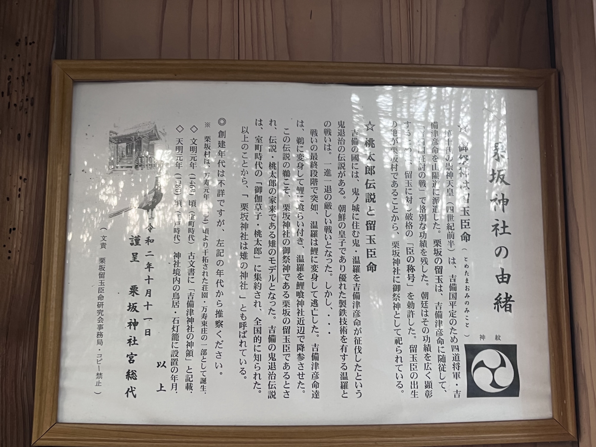 【当社の創建年代は不詳であるが、御祭神の留玉臣命(トメタマオミノミコト)は大吉備津彦命が吉備の国を征討の時随従した神である。】