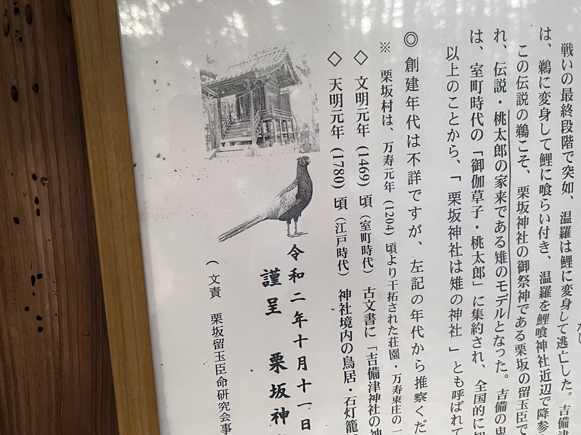 桃太郎伝説の犬・猿・雉は、それぞれモデルの人物が居るとのこと.雉は‥‥【雉:留玉臣(とめたまおみ)、別名・栗坂の留玉、庄村の住人。雉の留玉臣は百里も飛ぶ事が出来る術師であったと伝わります。子孫は現在の鳥飼家や鳥越家とされています。】