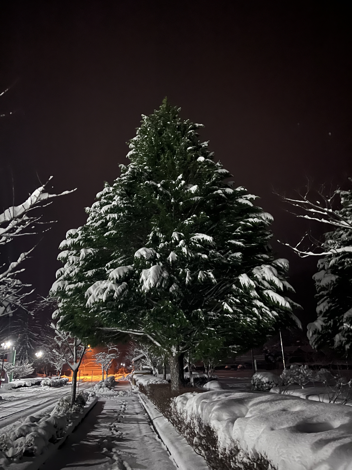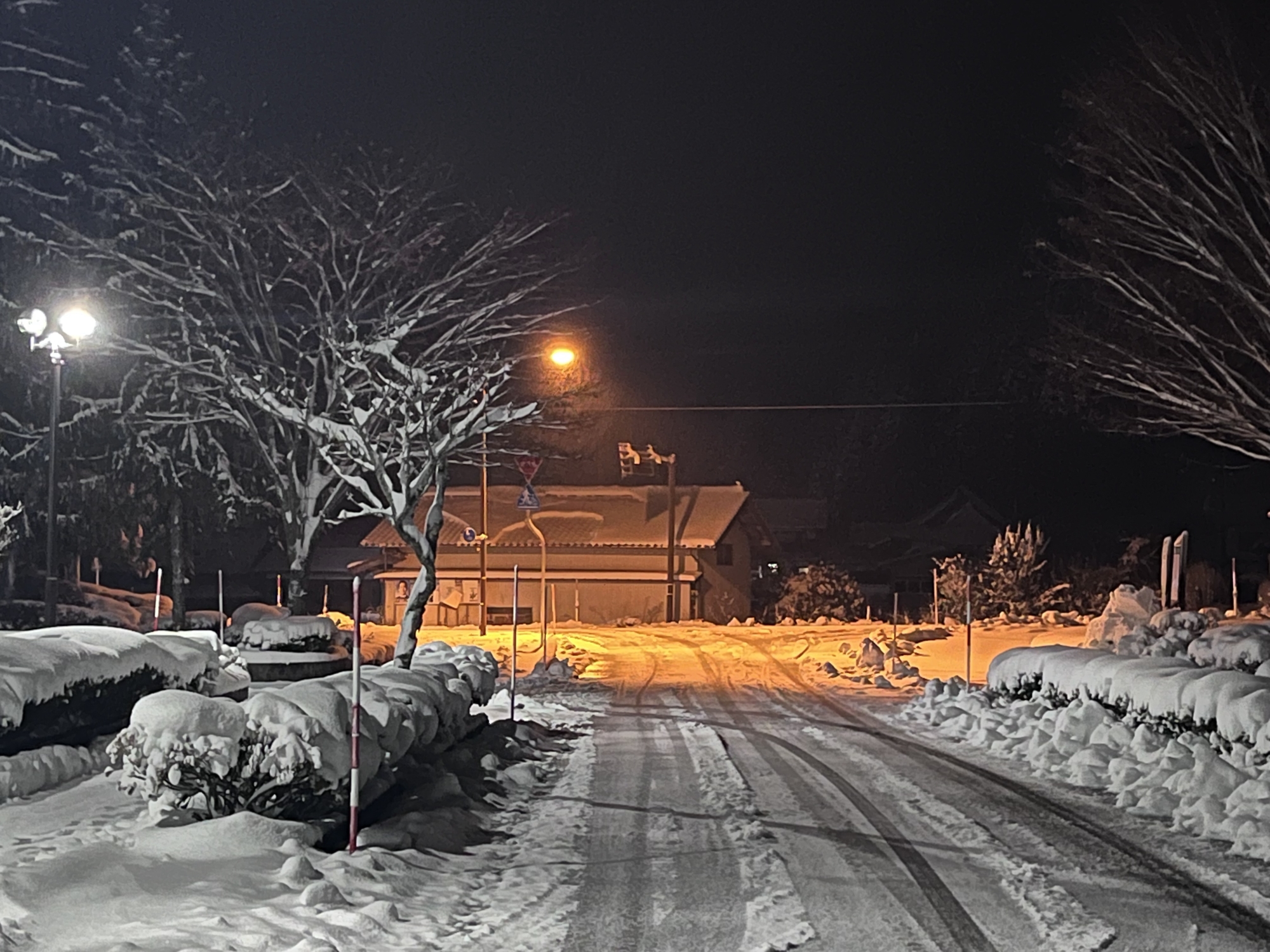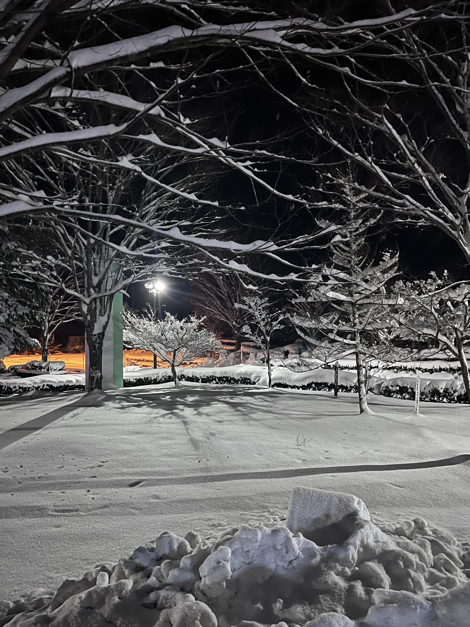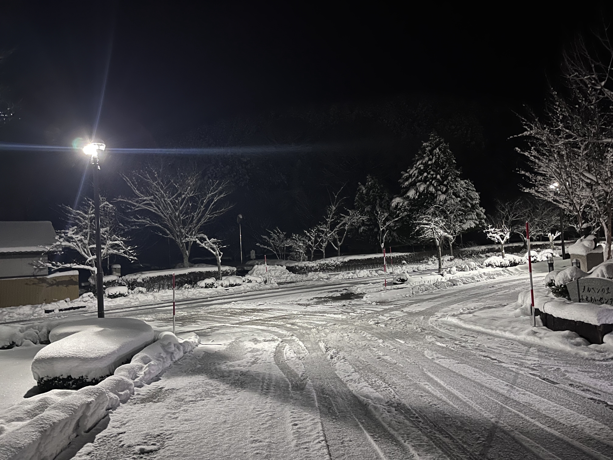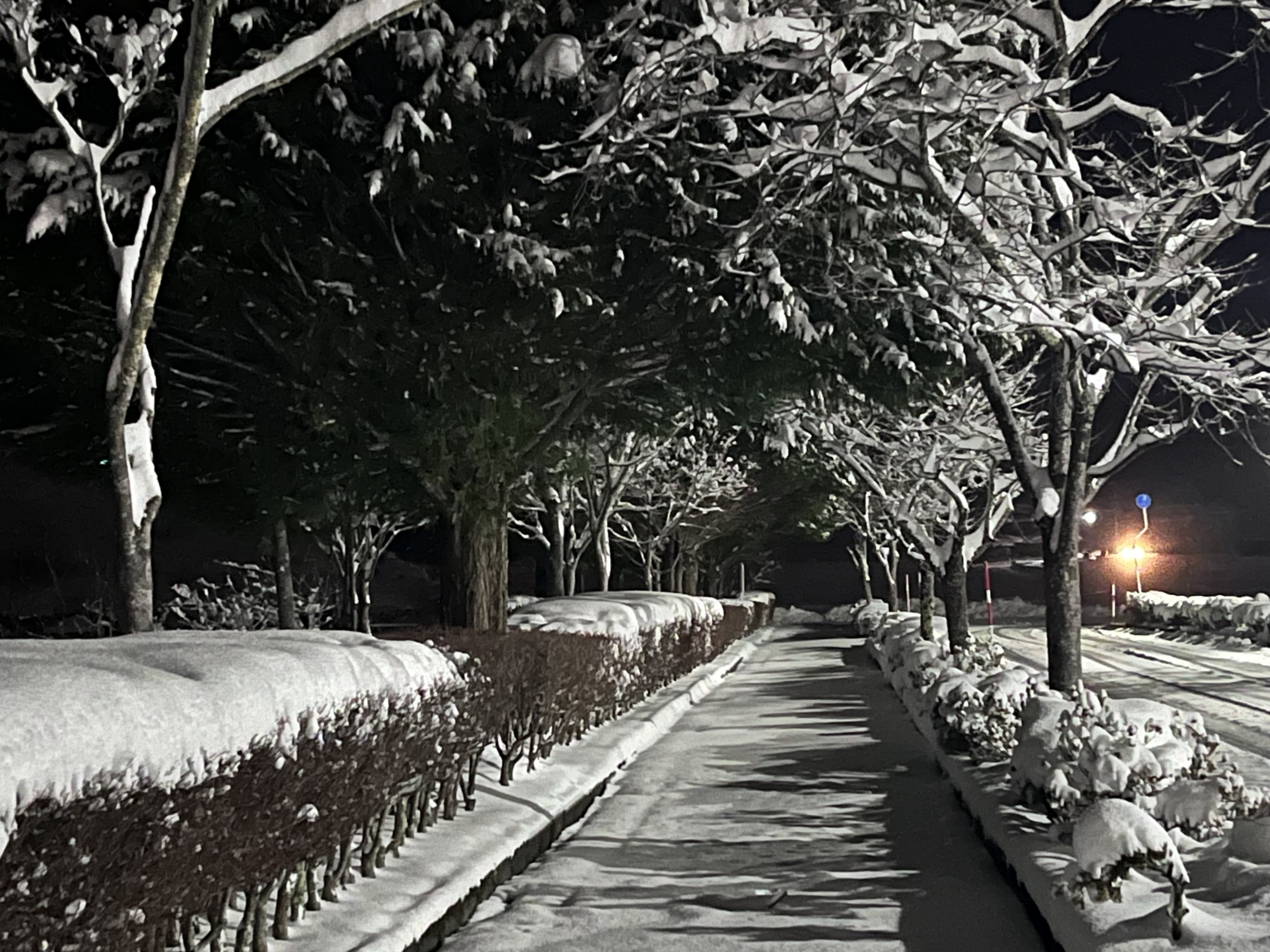 で、夜……振りも落ち着いてきて……街灯に雪乃ふれあい公園や並木道が美しい.