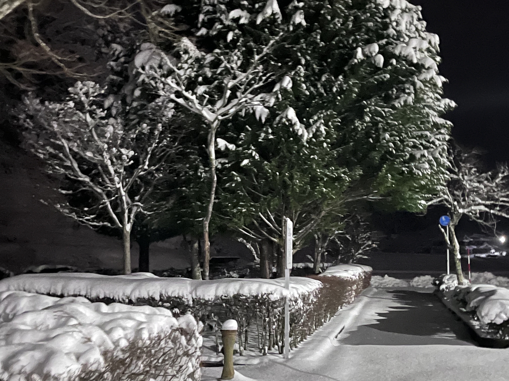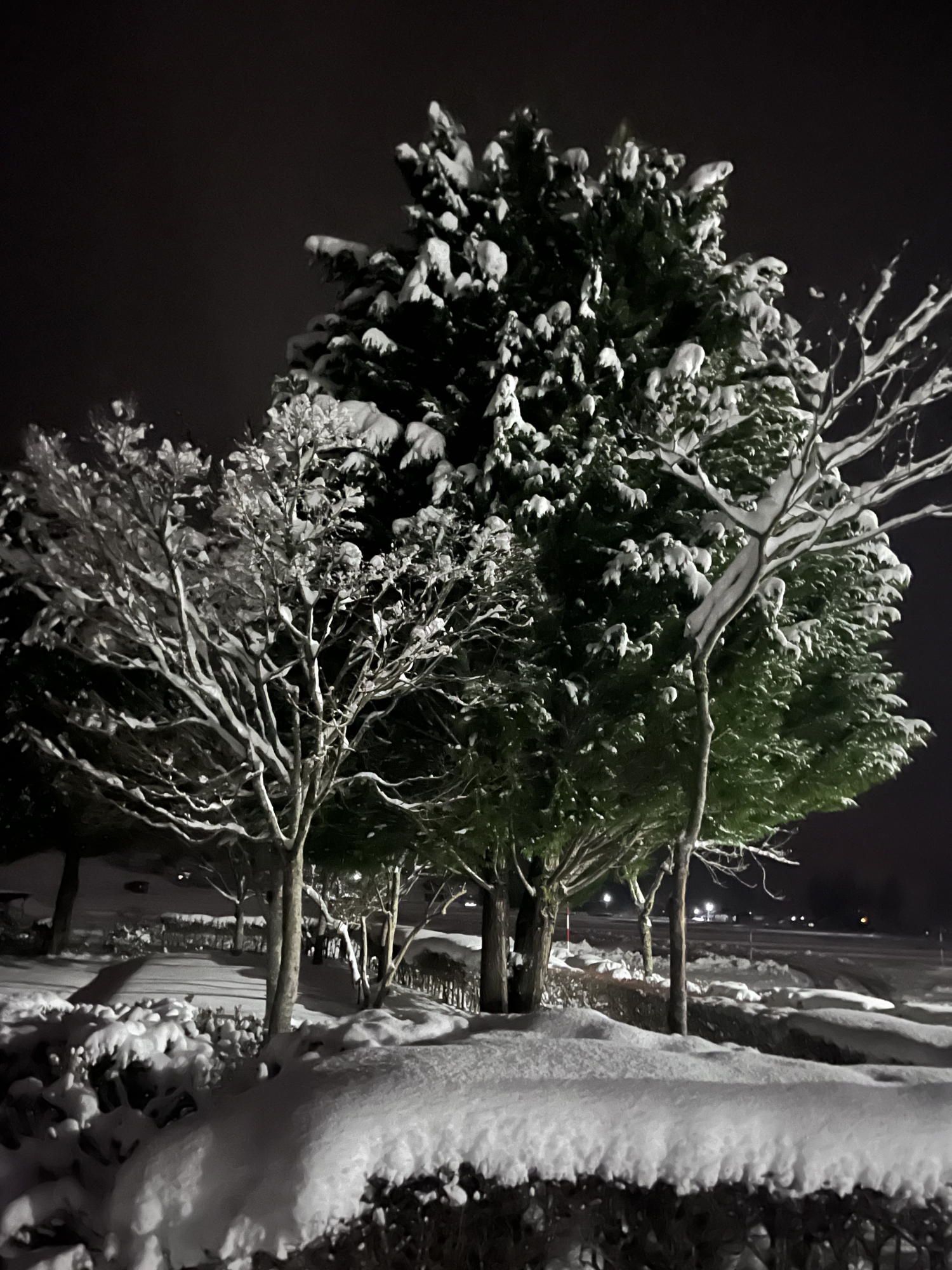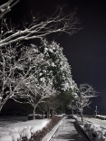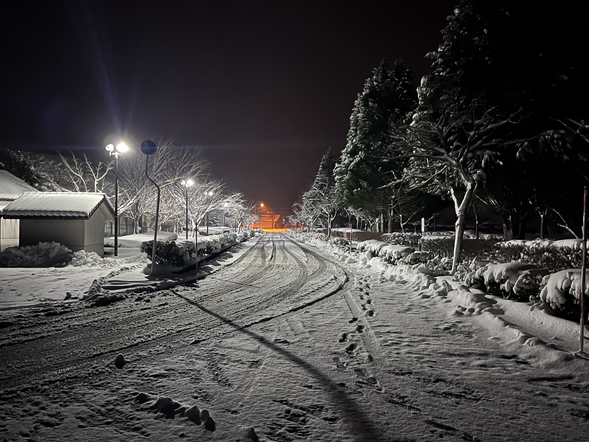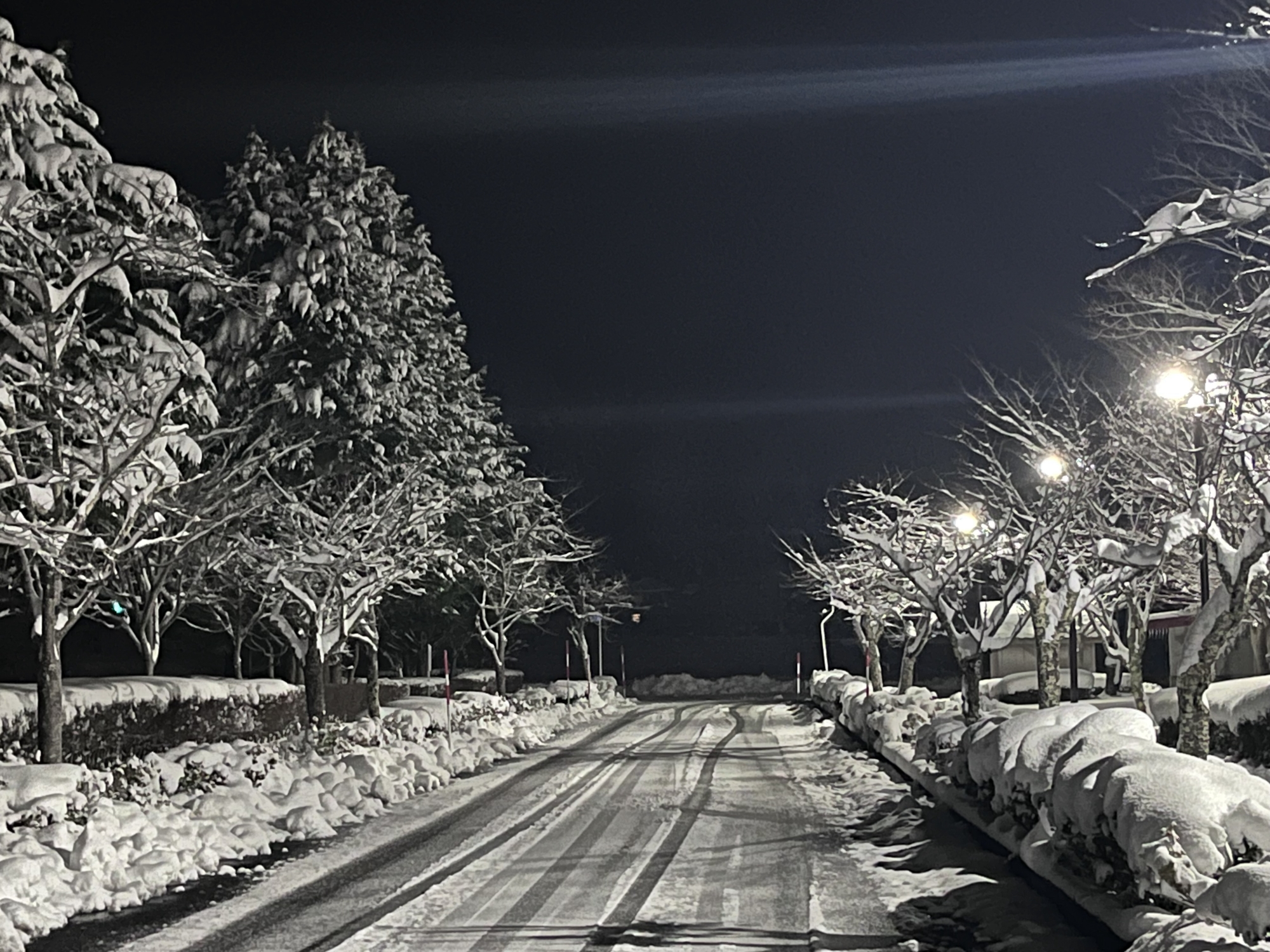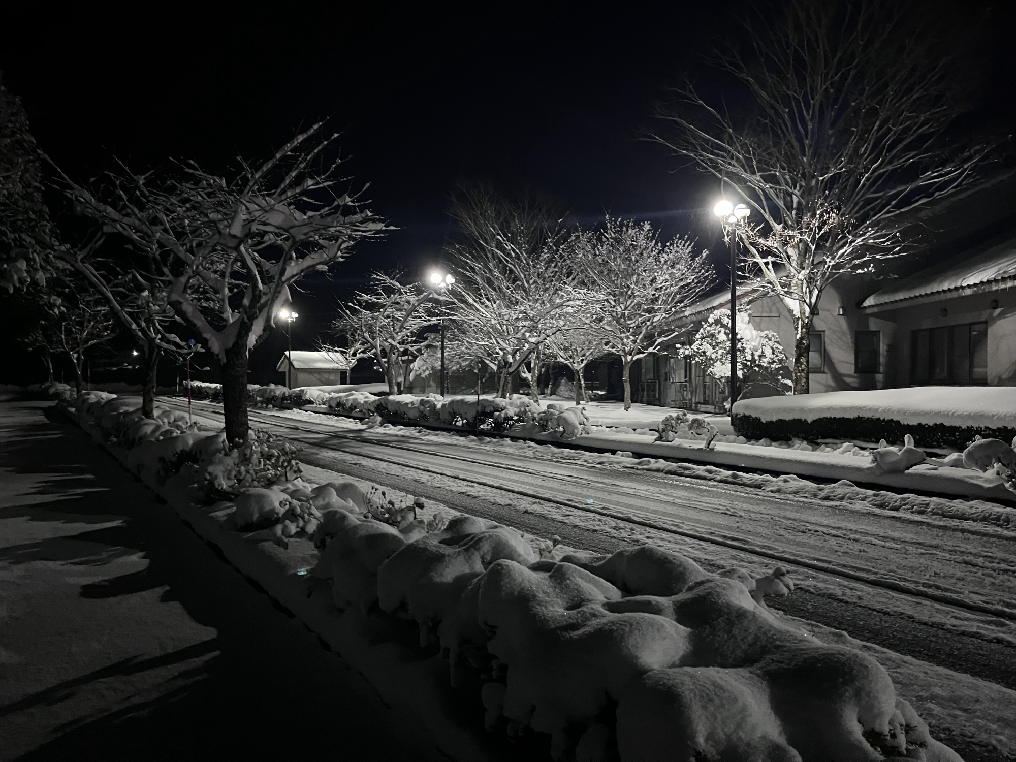 で、夜……振りも落ち着いてきて……街灯に雪乃ふれあい公園や並木道が美しい.