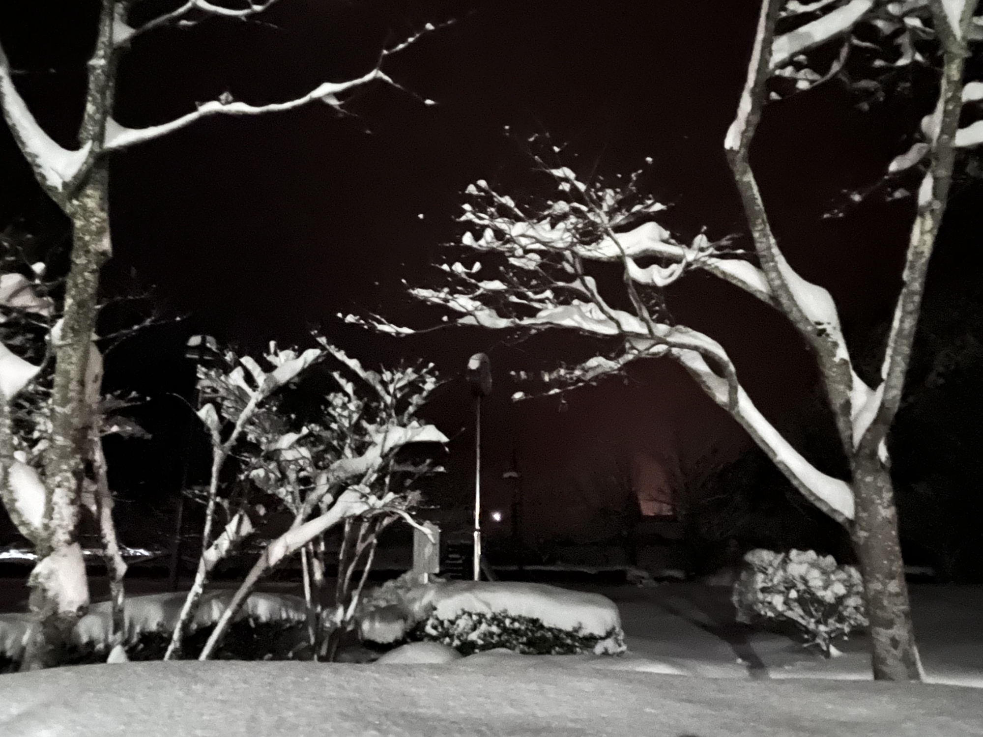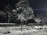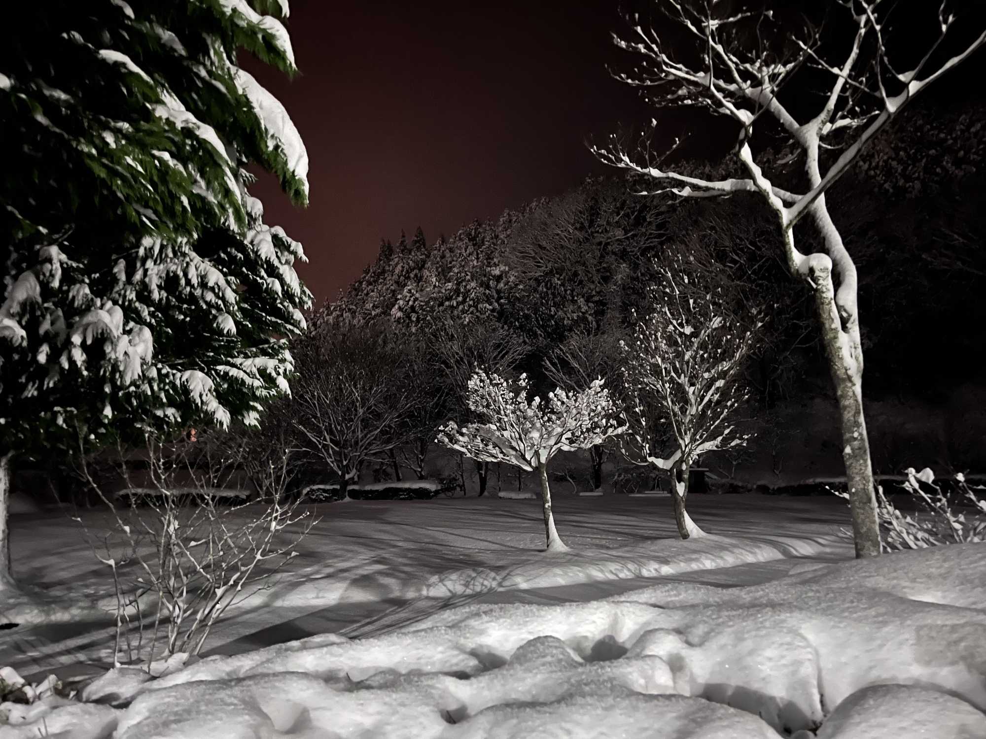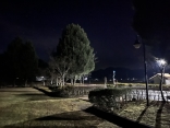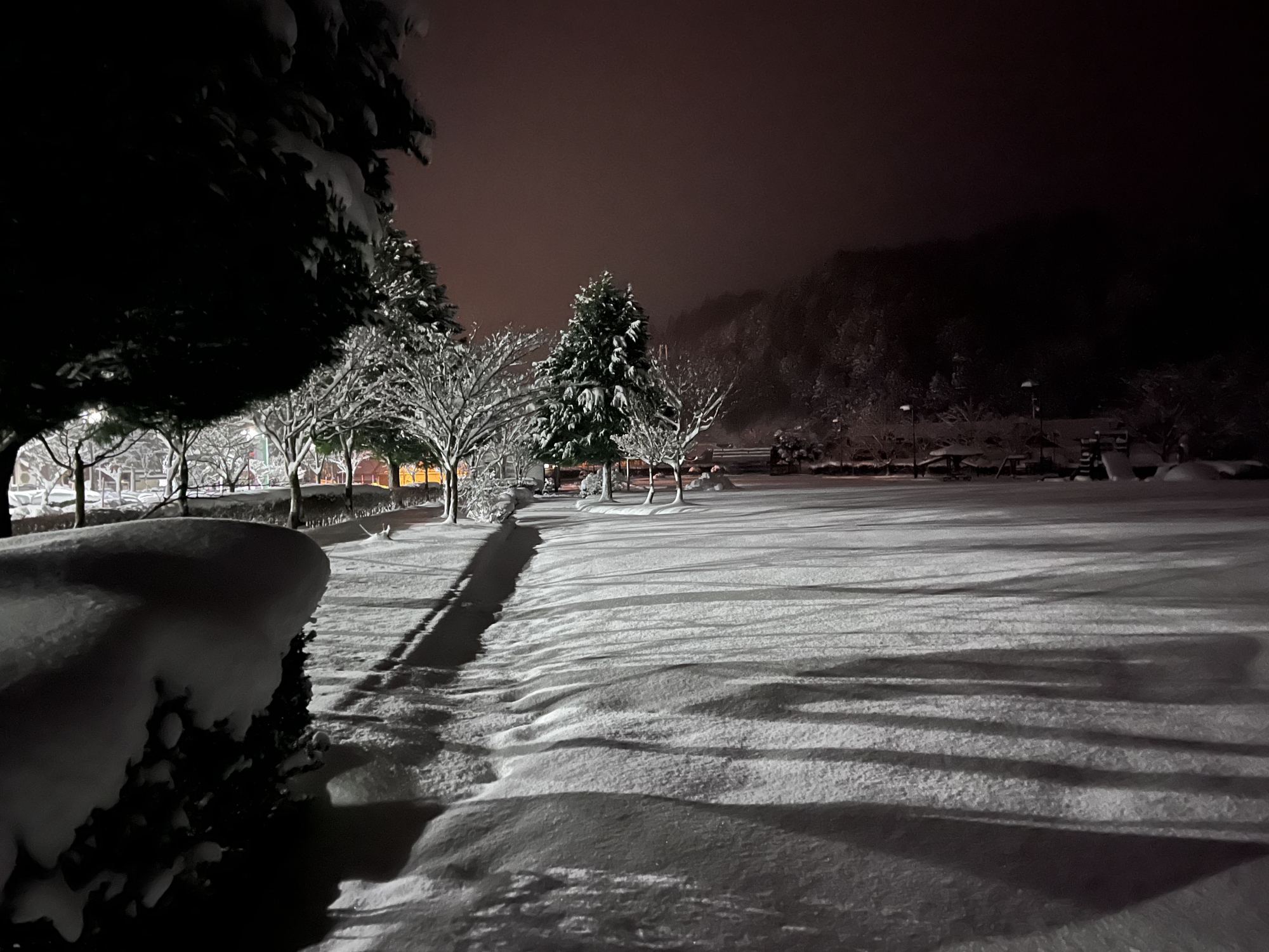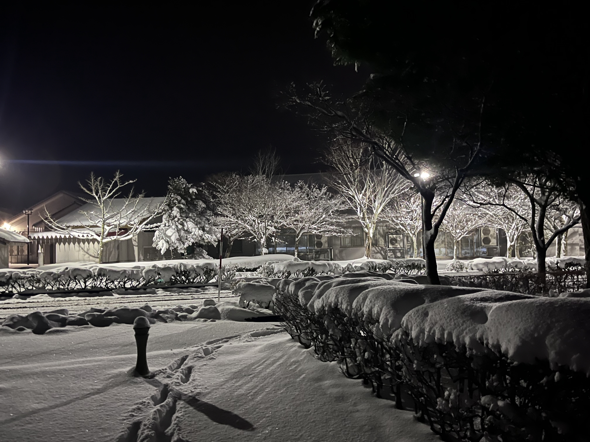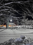 で、夜……振りも落ち着いてきて……街灯に雪乃ふれあい公園や並木道が美しい.