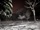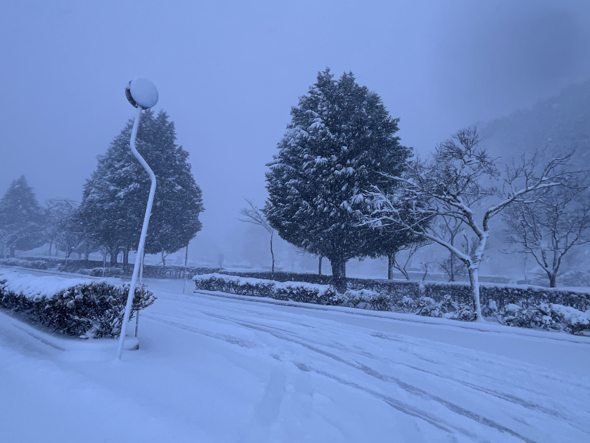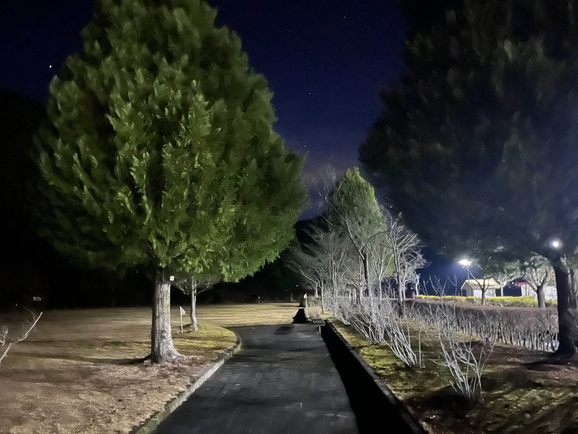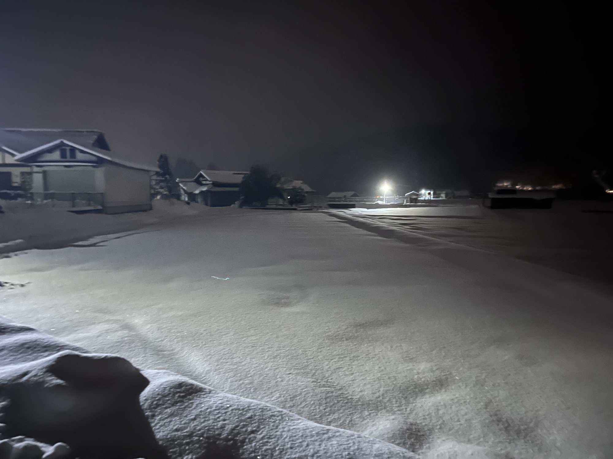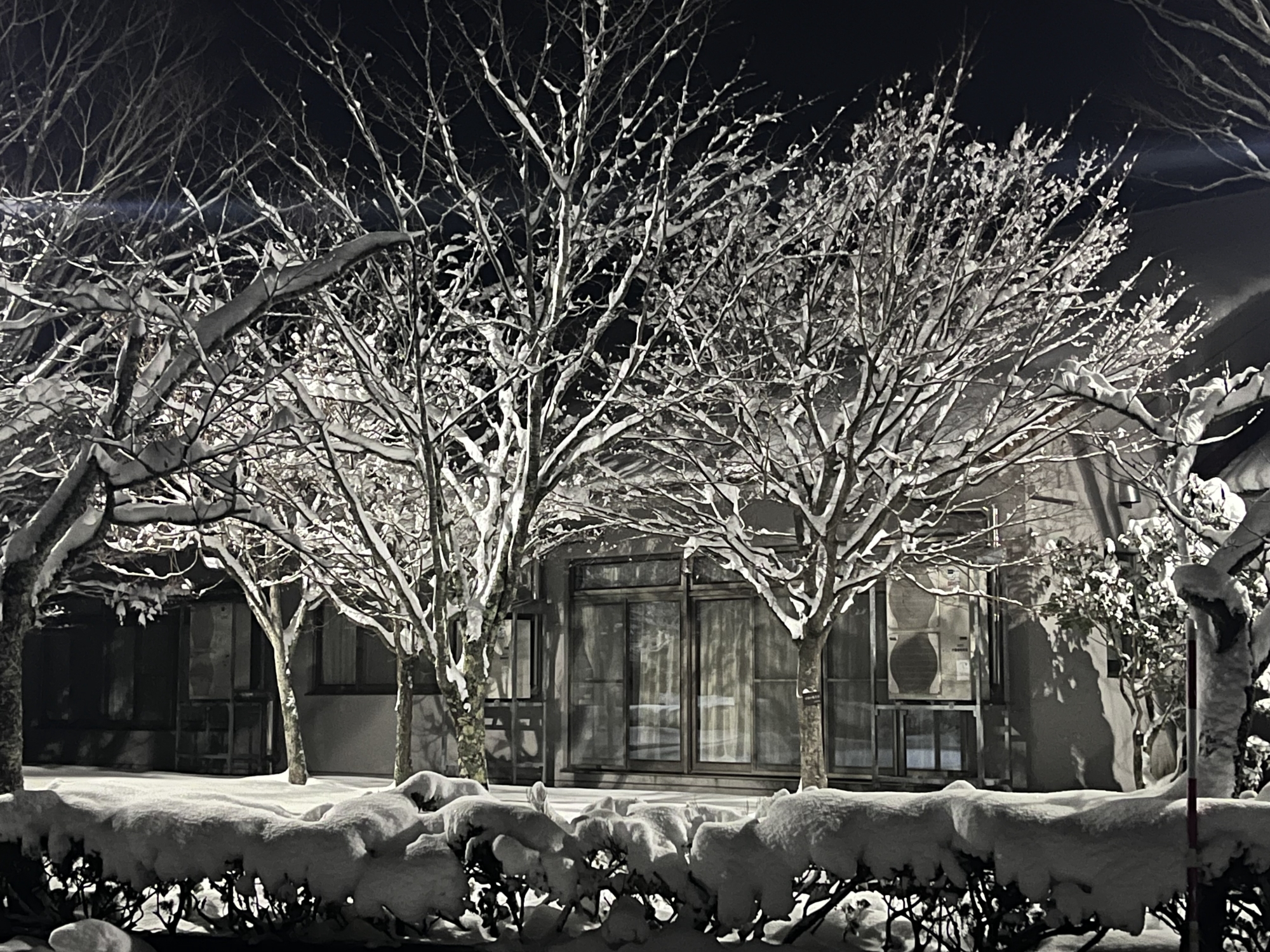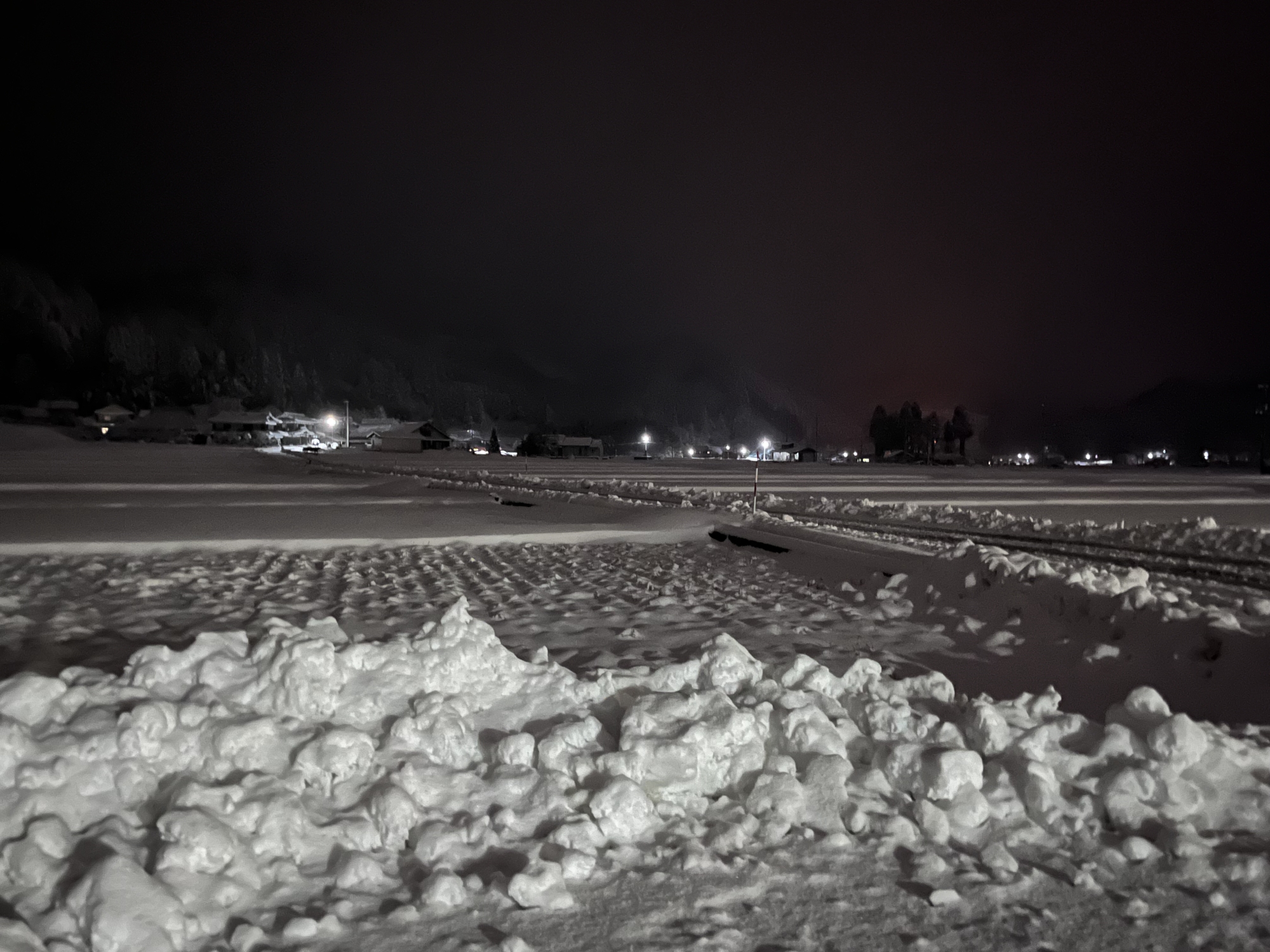 で、夜……振りも落ち着いてきて……街灯に雪乃ふれあい公園や並木道が美しい.