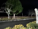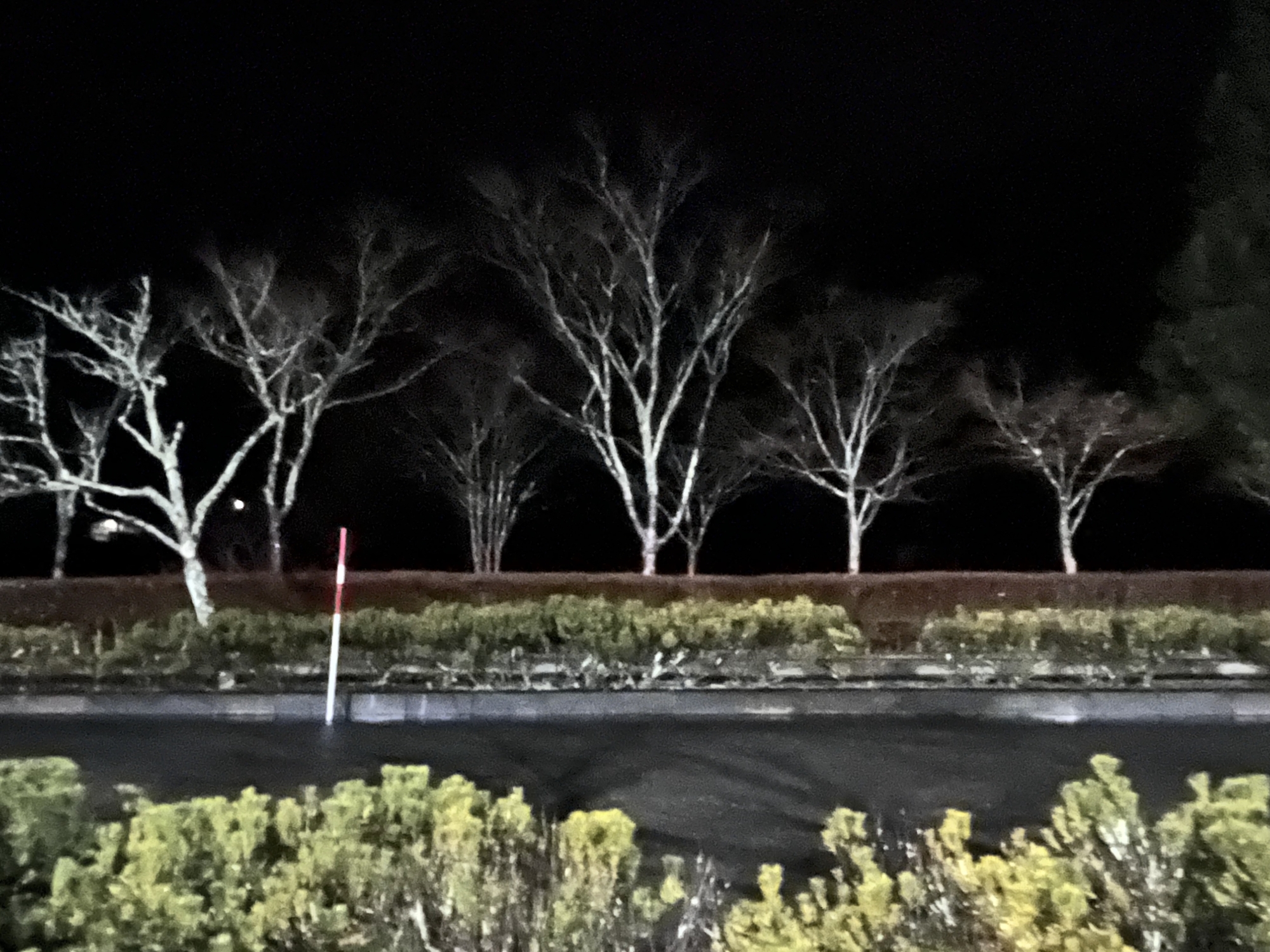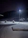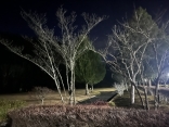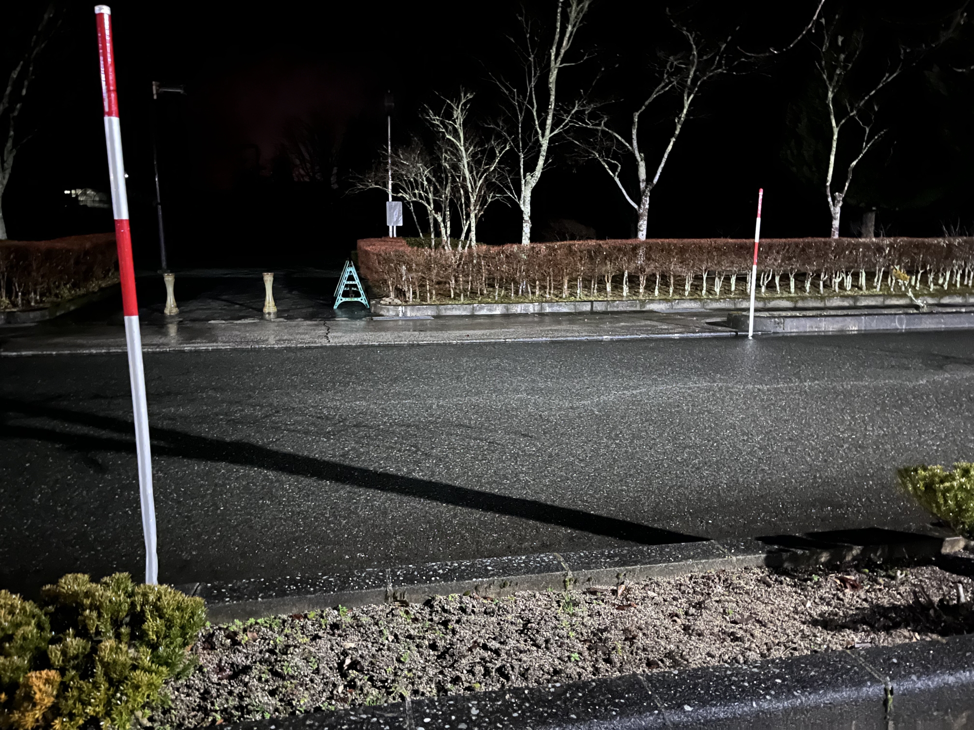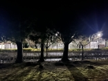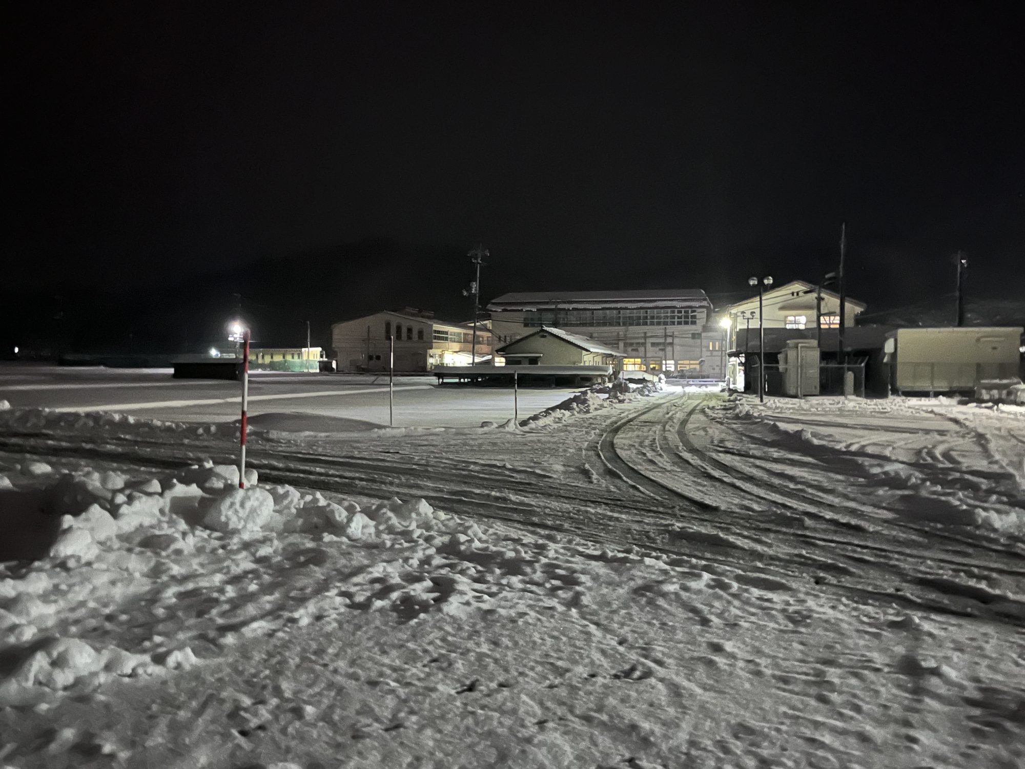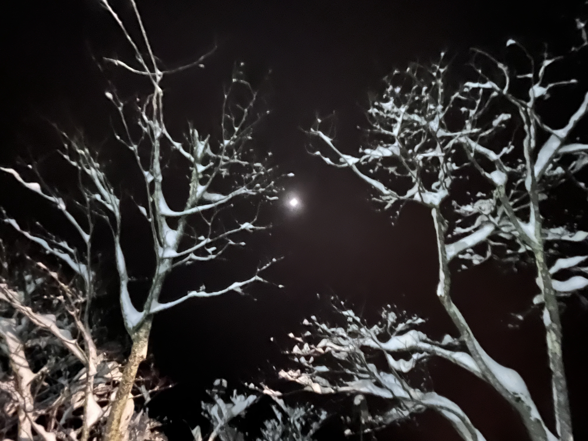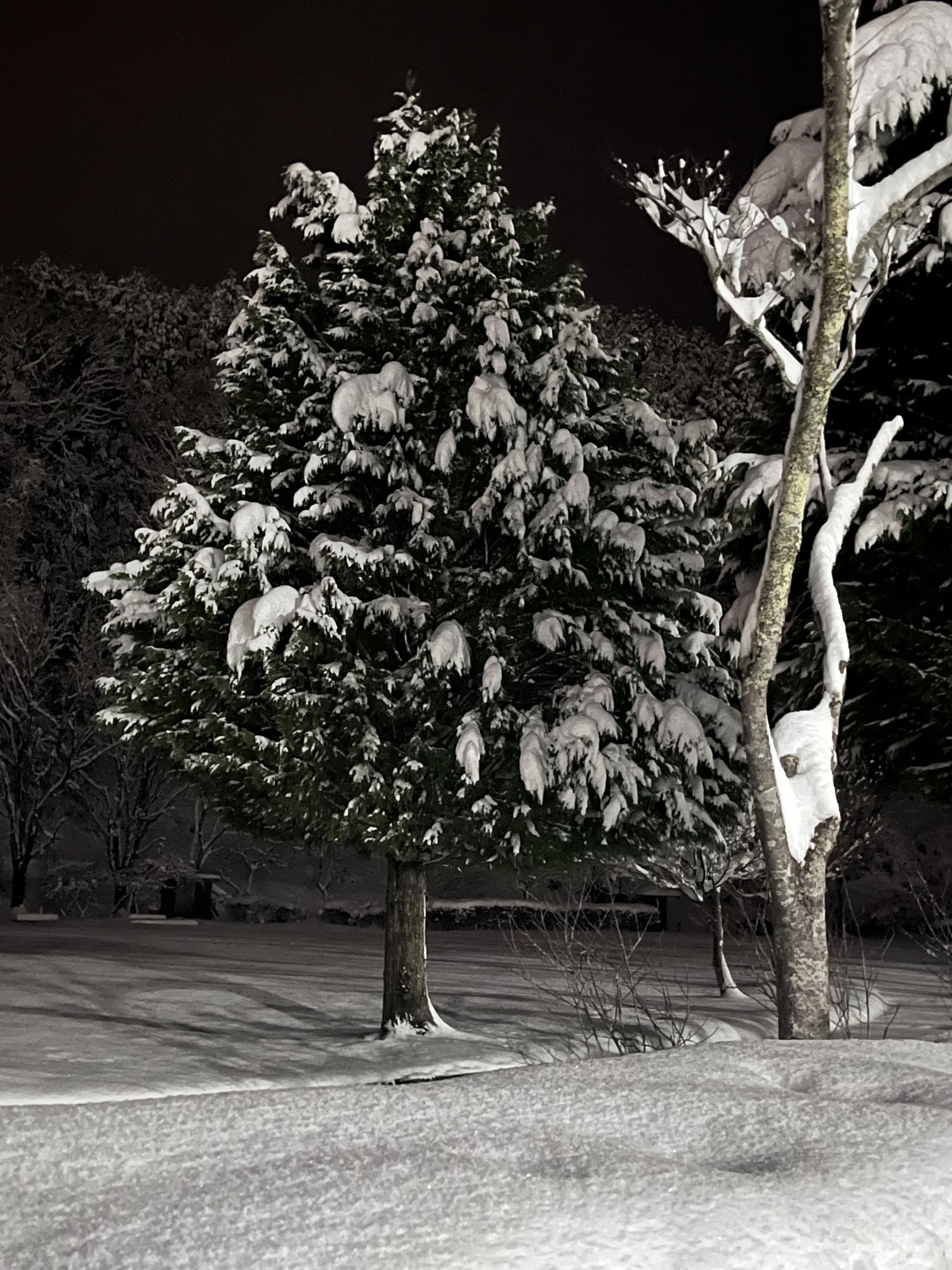 で、夜……振りも落ち着いてきて……街灯に雪乃ふれあい公園や並木道が美しい.