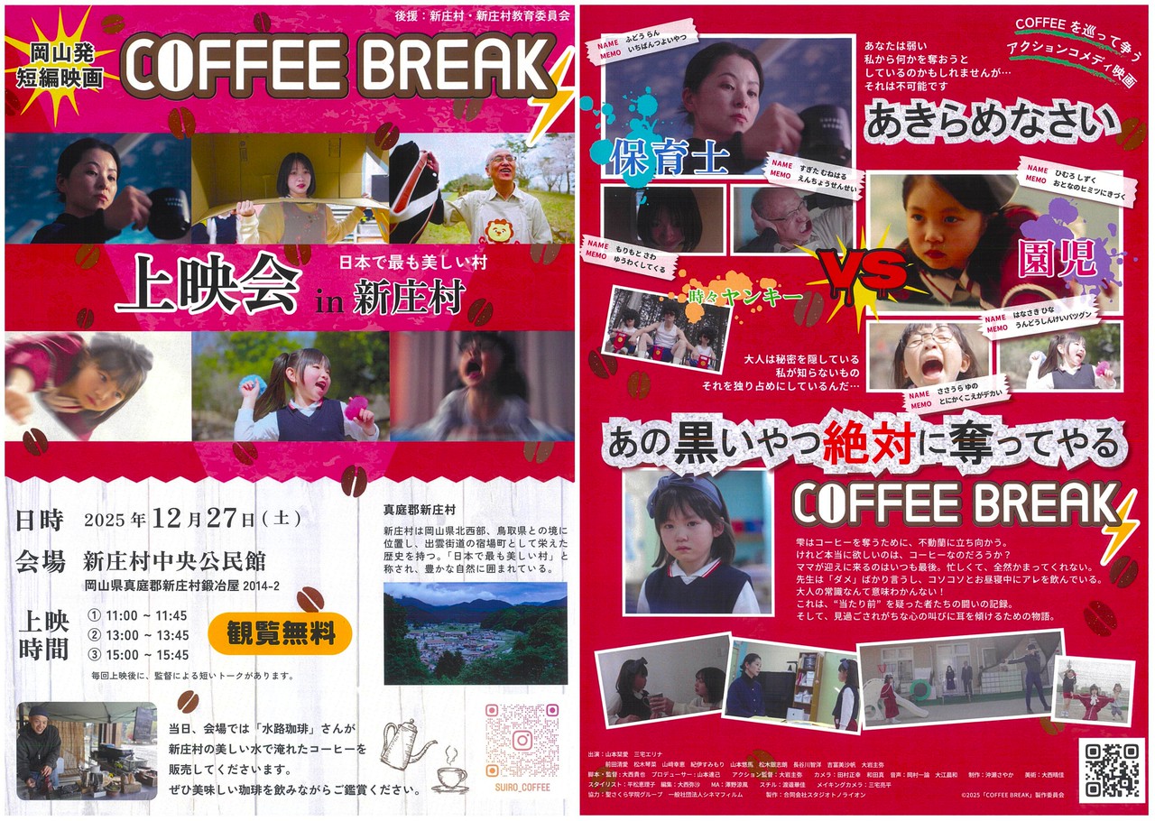 大西貴也監督作品「COFFEE BREAK」の新庄村での上映会に参加してきました.第一作の「まほろば」も観てます(何年前だろう?)、第二作「イワモト、余命一ヶ月」にも出演しました.第四作「ミネルヴァの梟」にもメインで出演させてもらって、かつ、1月3日までYouTubeで放映中.ドキュメンタリー「村ぞ、生けり。」は、新庄村を撮ってくれましたが、嬉しく橋渡しが出来たかなって、喜んでいます.今回は、アクション作品.リズムがいいね.ノリノリで魅せて、カッコー良い映画になってますね.