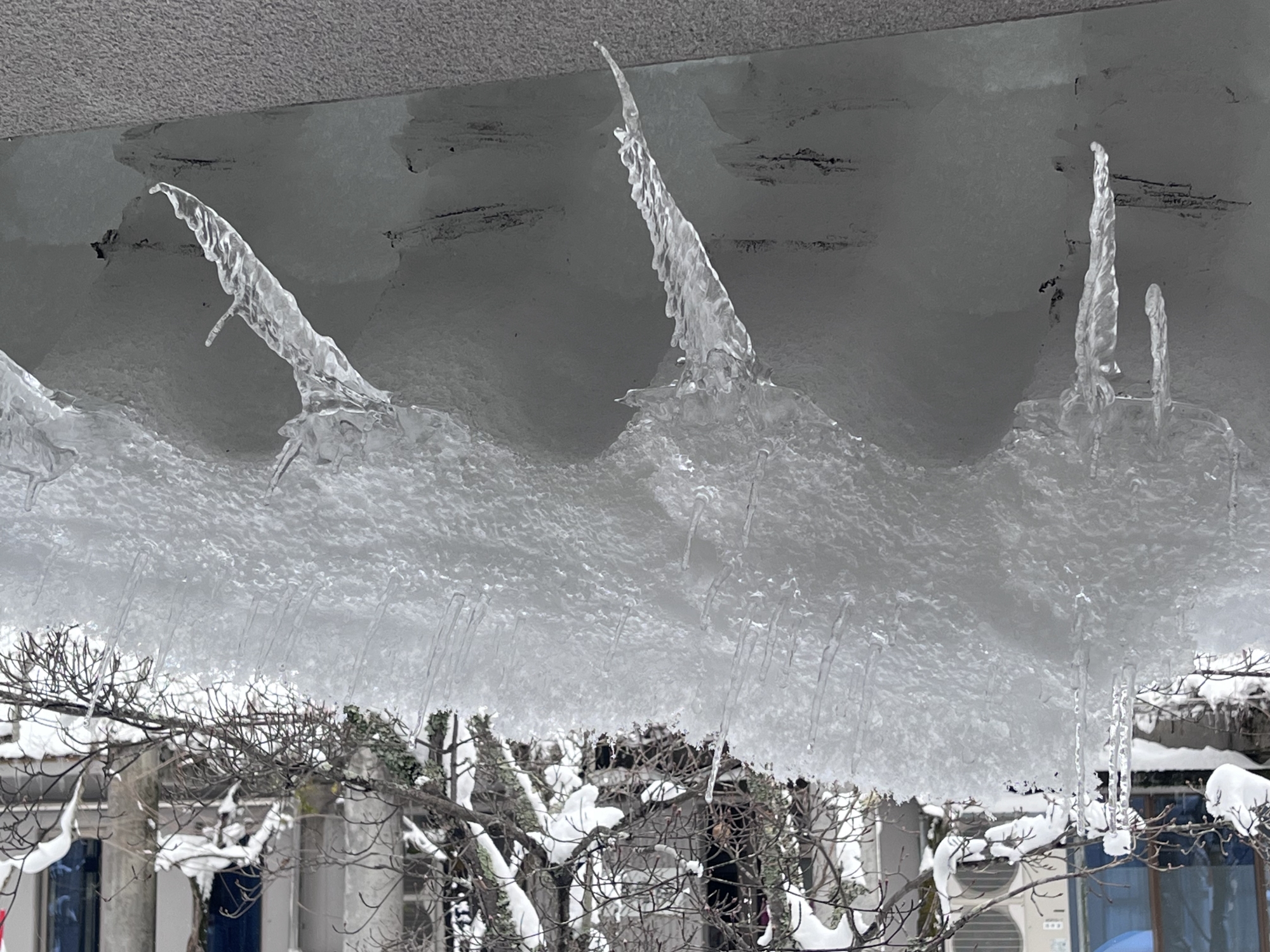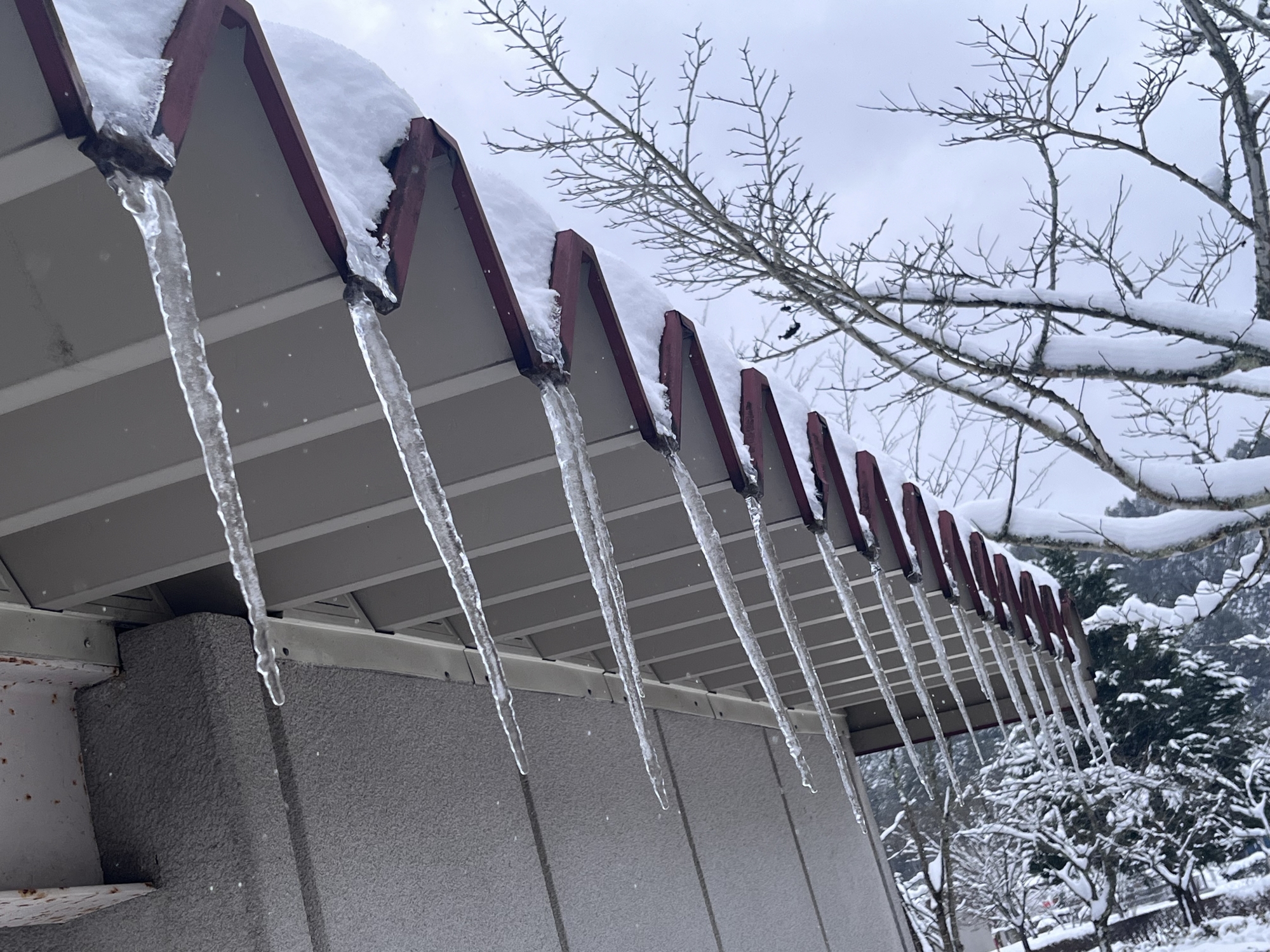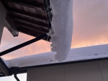 屋根の雪が落ちそうで、落ちない.