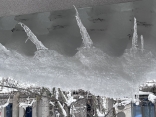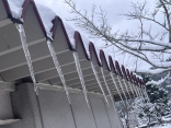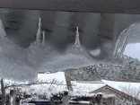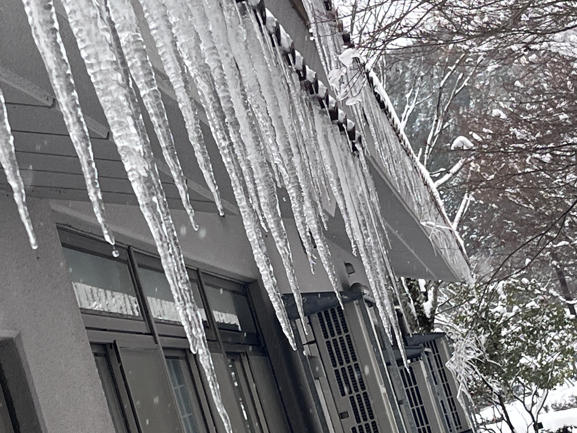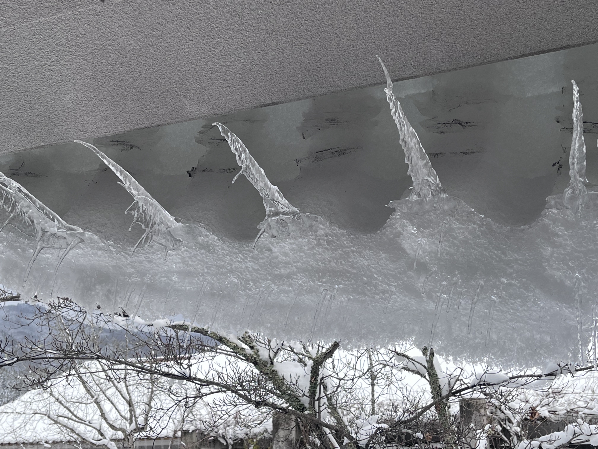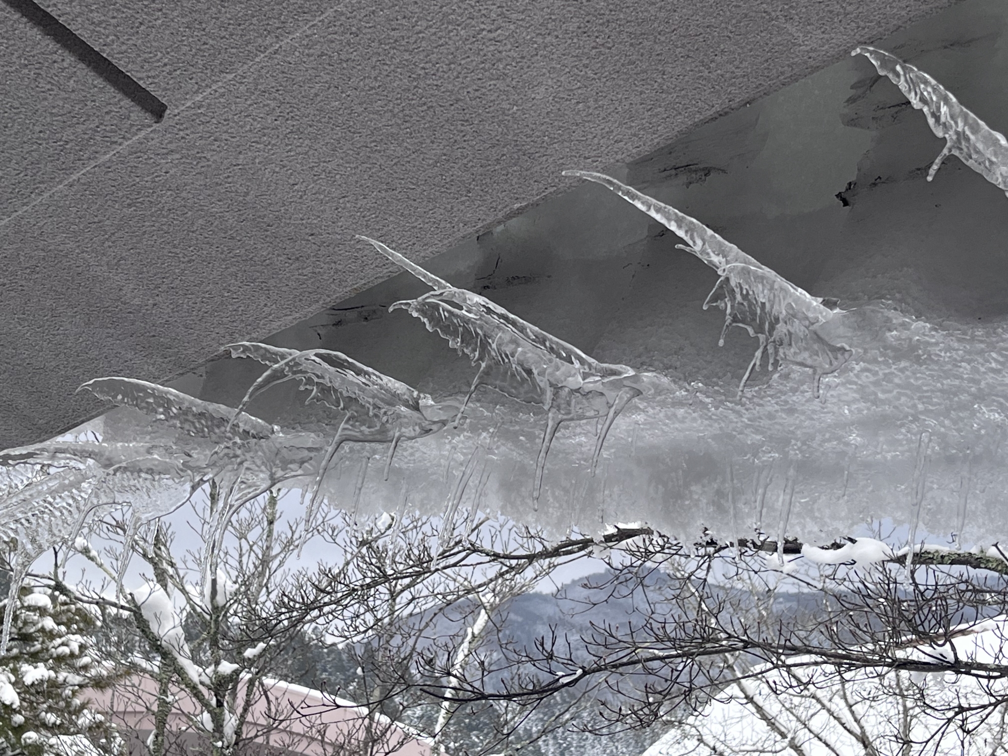 さて、再び診療所の部屋に戻ると、窓からの風景.屋根の雪が落ち切らずに窓側に回ってきてます.出来てた氷柱も一緒に曲がって、水平向きになってます.その氷柱から、新しい小さな氷柱が出来ていたりして、不思議な造形.