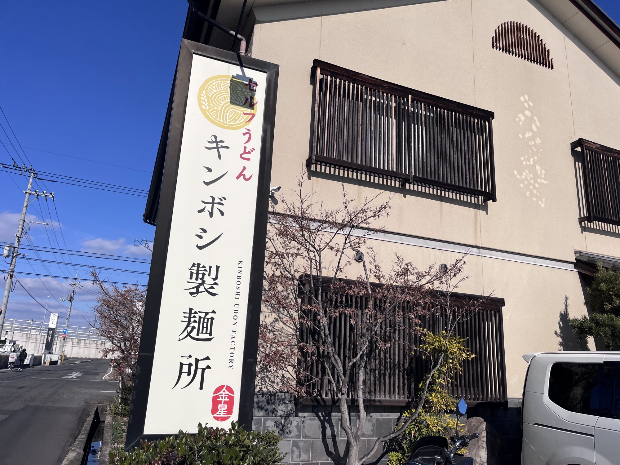 倉敷→岡山で実はSAGAWAさんに寄りに行く途中で、お昼ご飯は、キンボシ製麺所!! 人気のうどん屋さん.