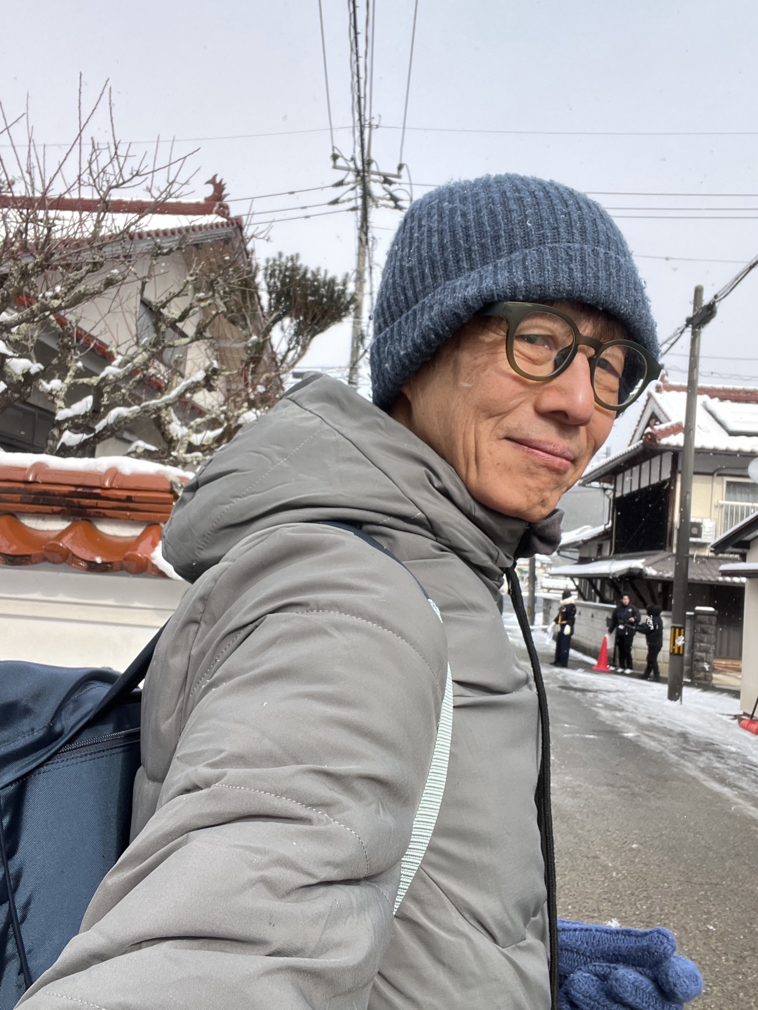 加えて、滑りやすい路面なので……一応、往診カバンを背負って、テープその他をカバンに入れて.