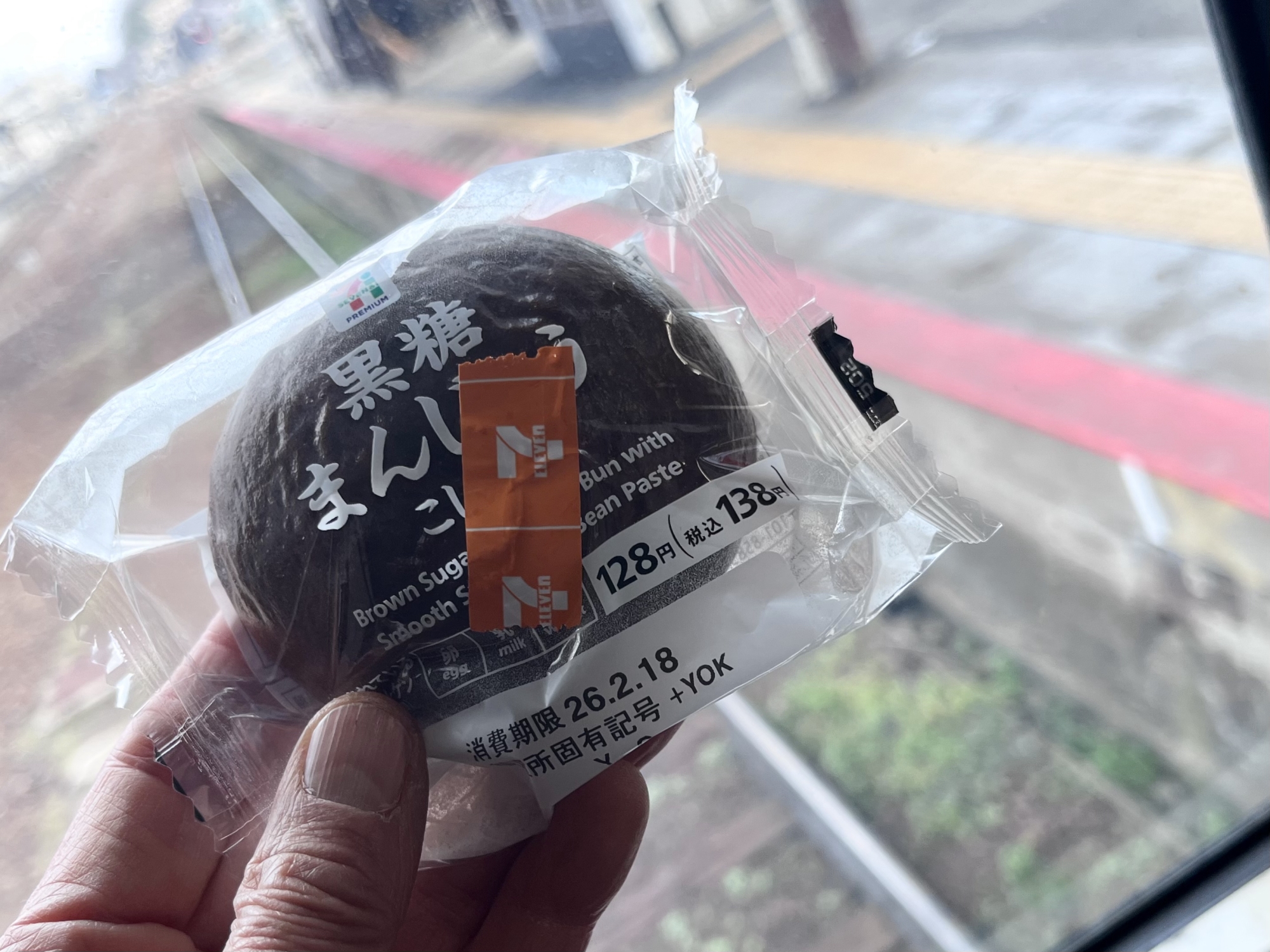 所で、到着後津山散策の間、飲み食いなしだったので、駅のセブンで黒糖饅頭と珈琲を・
