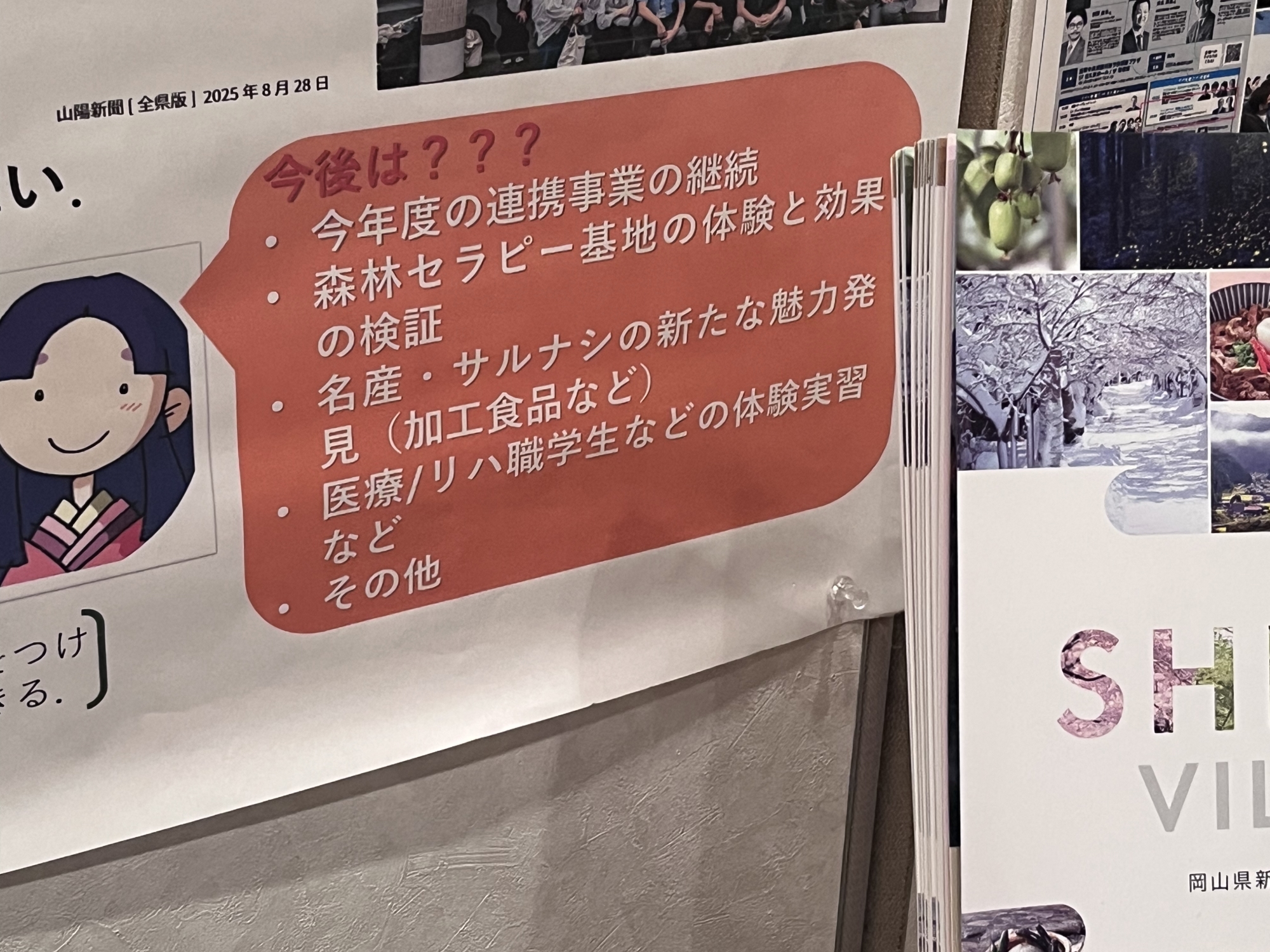 また、今後の方針、更には、共同研究シーズとして、①連携事業の継続、②森林セラピー基地の体験と効果の検証〜心身に及ぼす影響について( ⅰ ガイド(森の案内人)の有無による違い、ⅱ ブラインドウォーク時の気配体験の五感への検証、ⅲ ポジティブ「山びこ」体験の効果)、③名産・サルナシの新たな魅力発見(加工食品など)、④医療/リハ職学生などの体験実習や地域体験、を、提示させて頂きました.