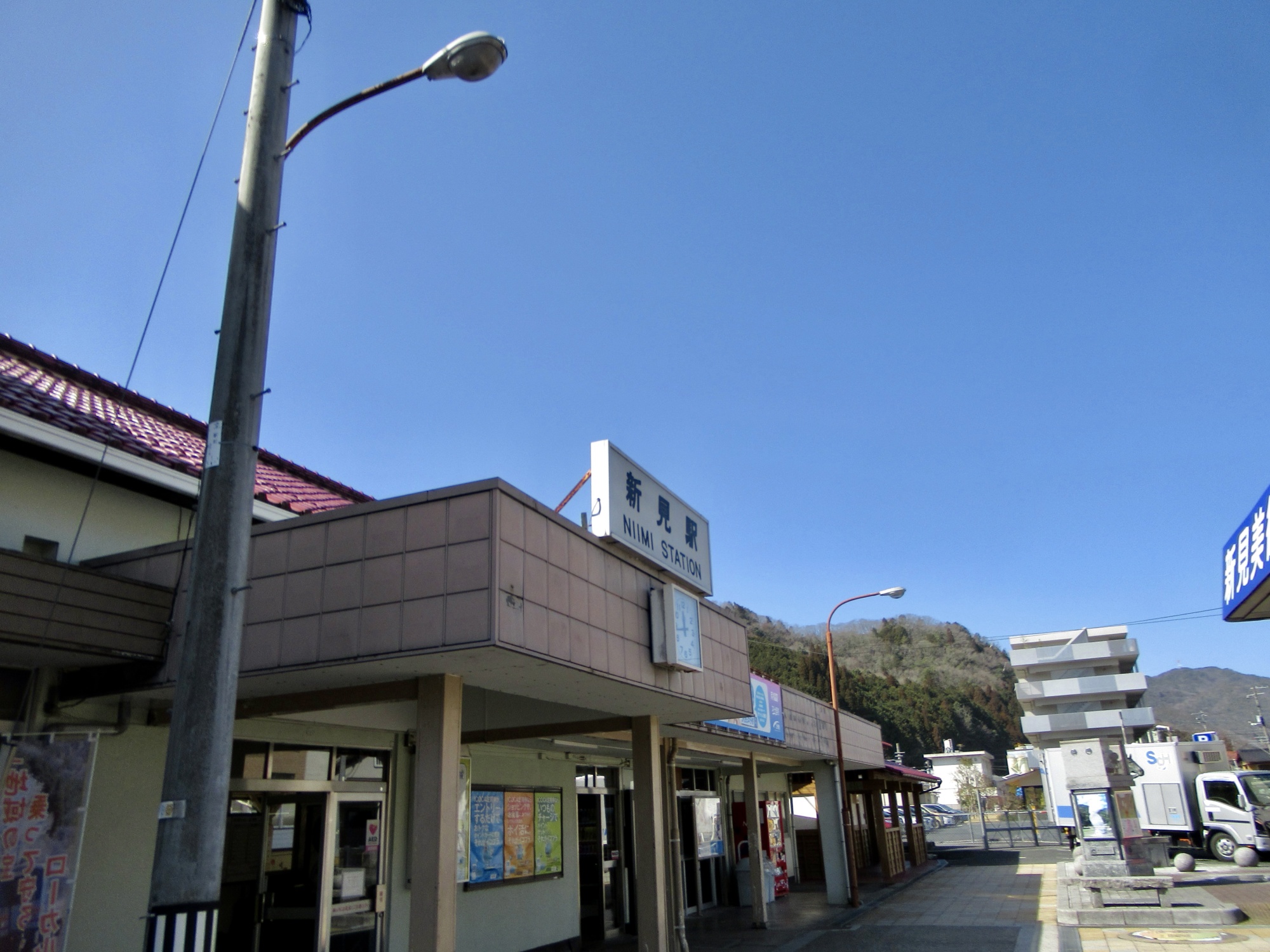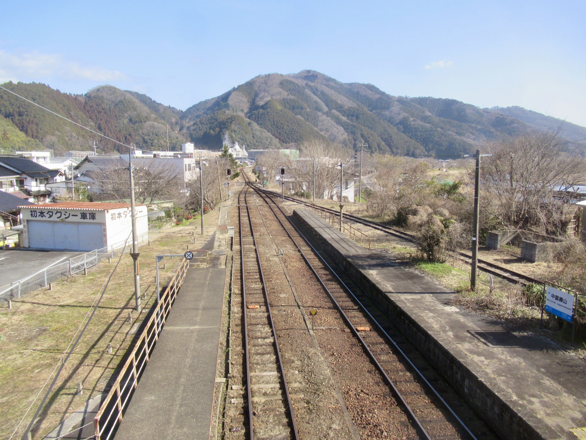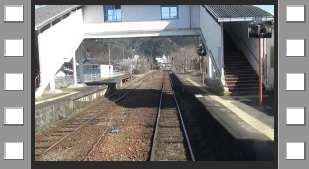 さて、中国勝山駅から下りの新見行,中国勝山→月田→富原→刑部→丹治部→岩山→新見です.
